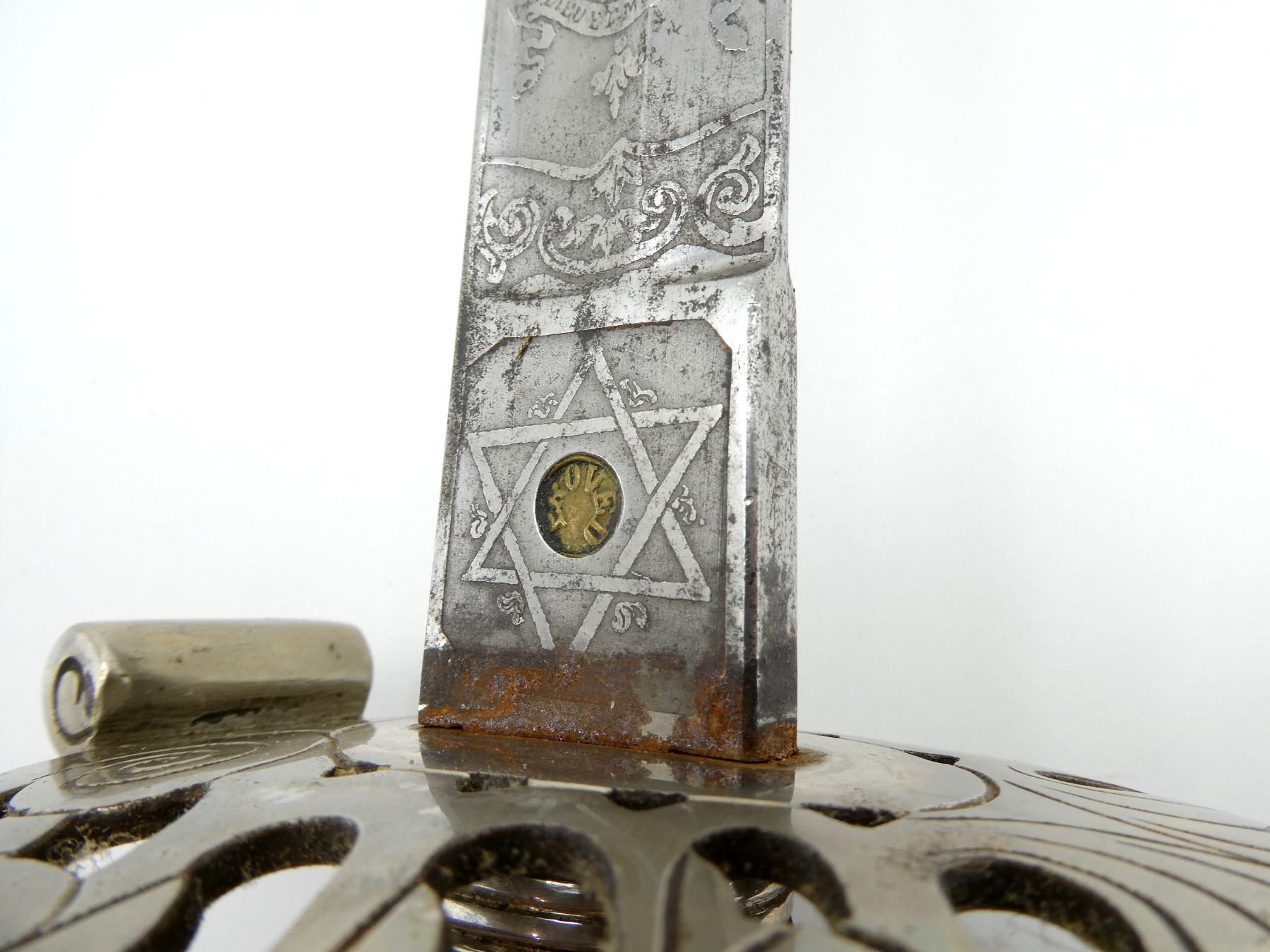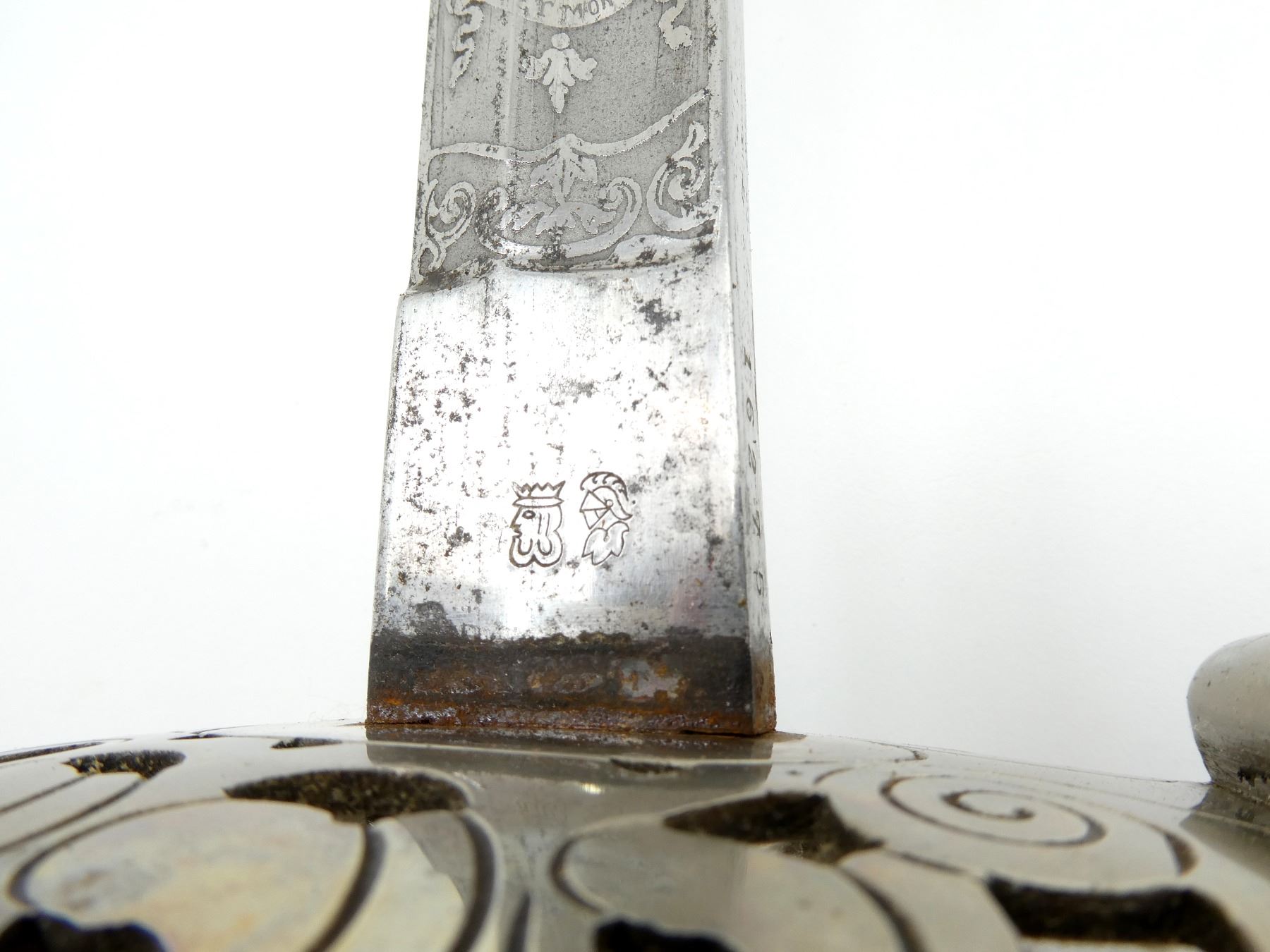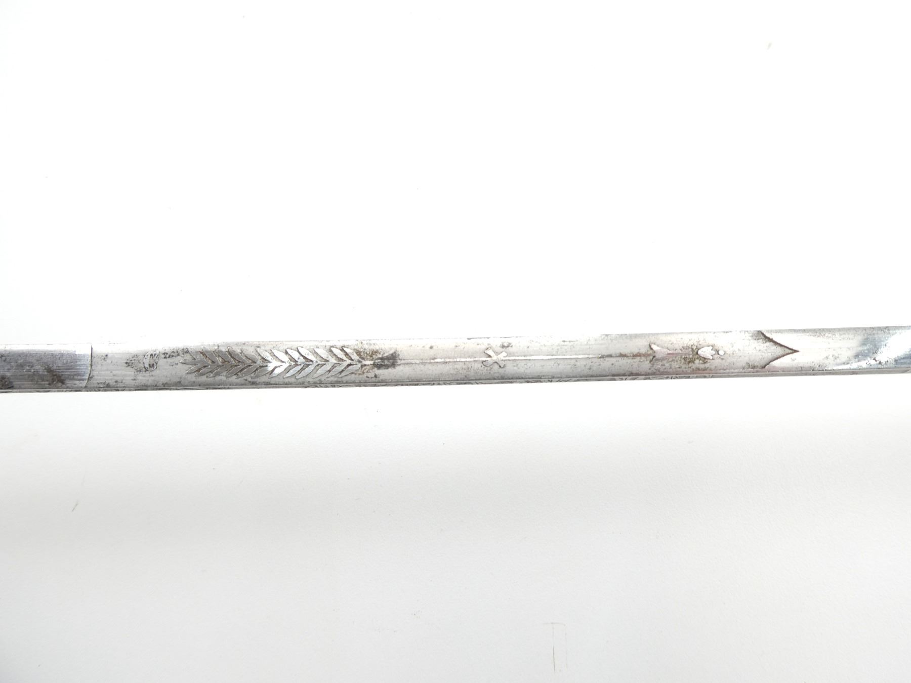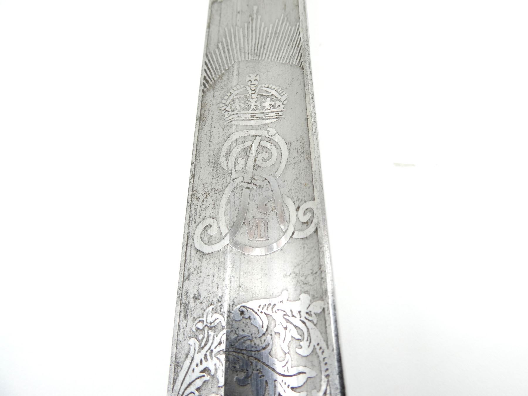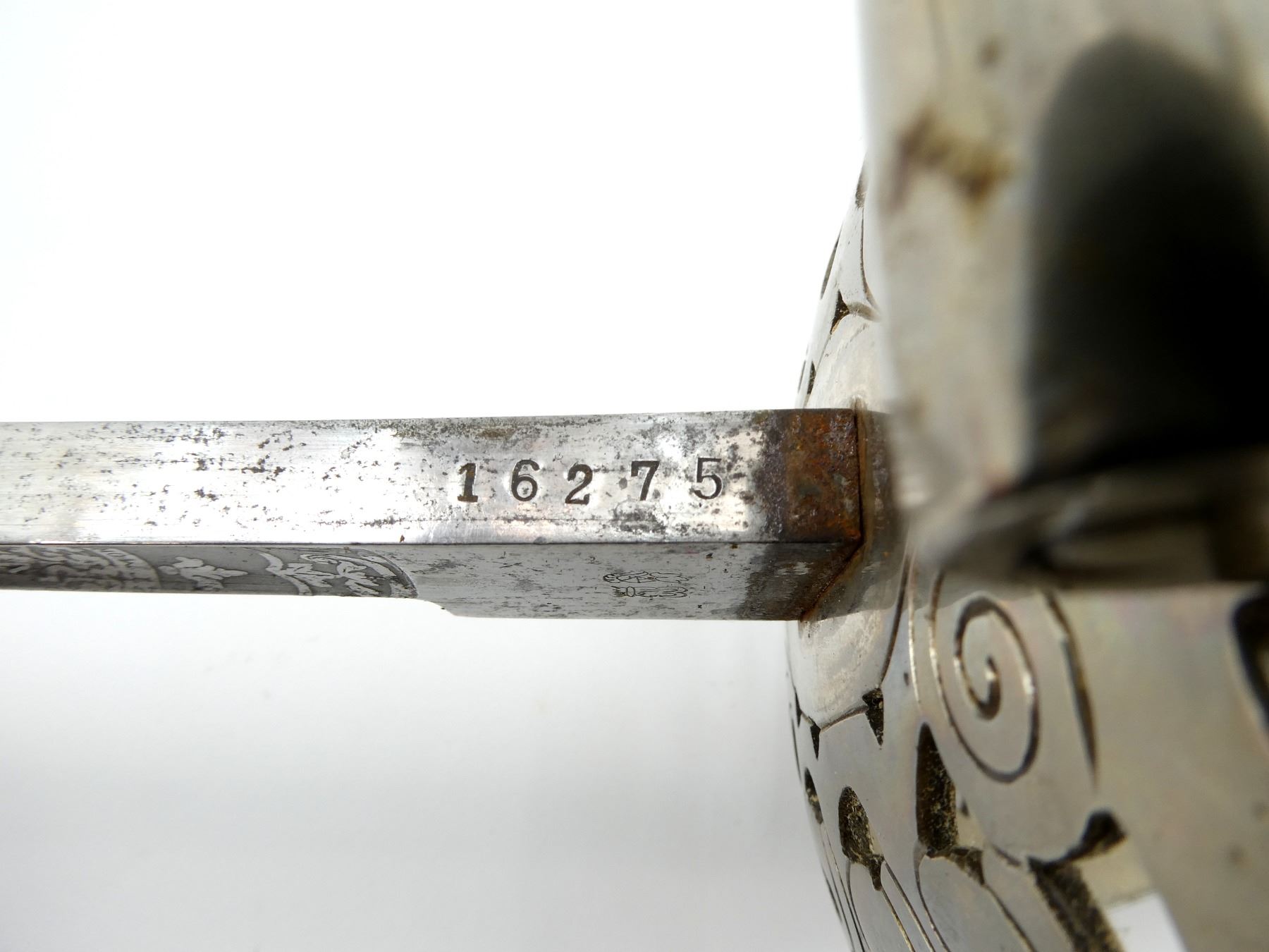 (1) STRAIGHT PARTIALLY FULLERED SINGLE-EDGED BLADE, RICASSO MARKED WITH KING'S HEAD / KNIGHT'S HEAD MAKER'S MARK (WEYERBURG KIRSCHBAUM & CO.), BLADE ACID ETCHED: KING'S CROWN OVER "ERVII" (EDWARD VII) CYPHER OVER BRITISH COAT OF ARMS WITH KING'S CROWN, VARIOUS DECORATIVE FLORAL ACID ETCHINGS, OTHER-SIDE RICASSO ACID ETCHED WITH STAR SHAPE WITH "PROVED" EMBLEM IN CENTER, BLADE ACID ETCHED: KING'S CROWN OVER "ERVII" (EDWARD VII) CYPHER OVER BRITISH COAT OF ARMS WITH KING'S CROWN, VARIOUS DECORATIVE FLORAL ACID ETCHINGS, BLADE SPINE MARKED: "16275"WITH ACID ETCHED "C" AND ARROW DESIGN, DECORATIVE HANDGUARD / HILT, NO VISIBLE MARKINGS, LEATHER & WIRE WRAPPED GRIP, METAL POMMEL, NO VISIBLE MARKINGS, WOODEN LEATHER WRAPPED SCABBARD WITH STEEL THROAT, THROAT END IS LOOSE / BROKEN, LEATHER NEAR THROAT IS TORN, WOOD UNDERNEATH LEATHER IS CRACKED / BROKEN IN PLACES, NO VISIBLE MARKINGS ON SCABBARD, SHOWS AGE / WEAR / TEAR, BLADE APPROX. 35.5" & OVERALL LENGTH APPROX. 41". SEE PHOTOS.