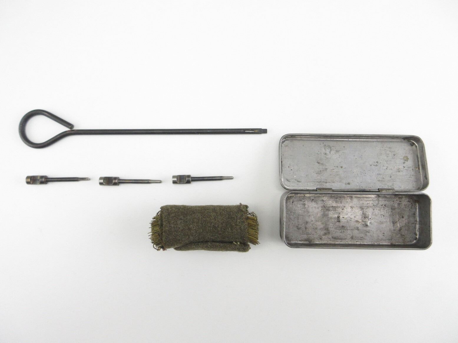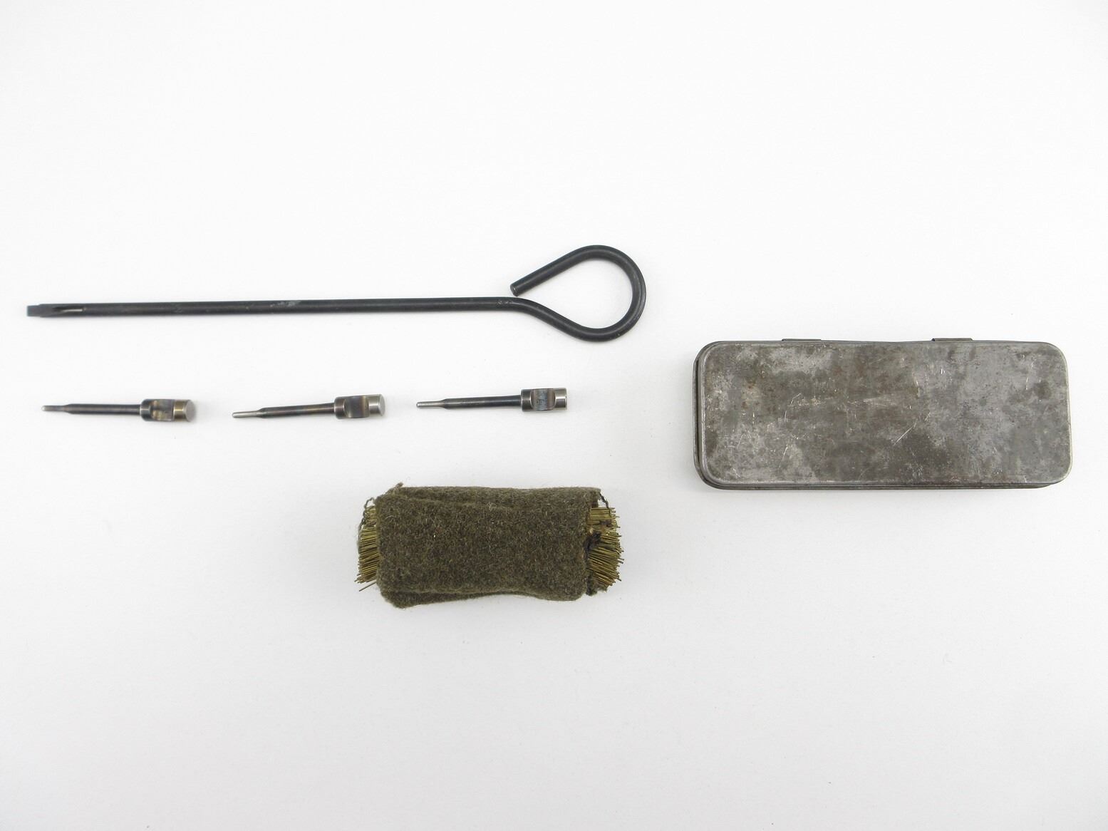 BRITISH / CANADIAN INGLIS / BREN LMG PARTS LOT. LOT INCLUDES; (3) BREN FIRING PINS, (1) SPARE PARTS TIN, (1) INGLIS HI-POWER CLEANING ROD, MARKED: " M ", WITH VARIOUS SMALL BRASS WIRES. SEE PHOTOS.