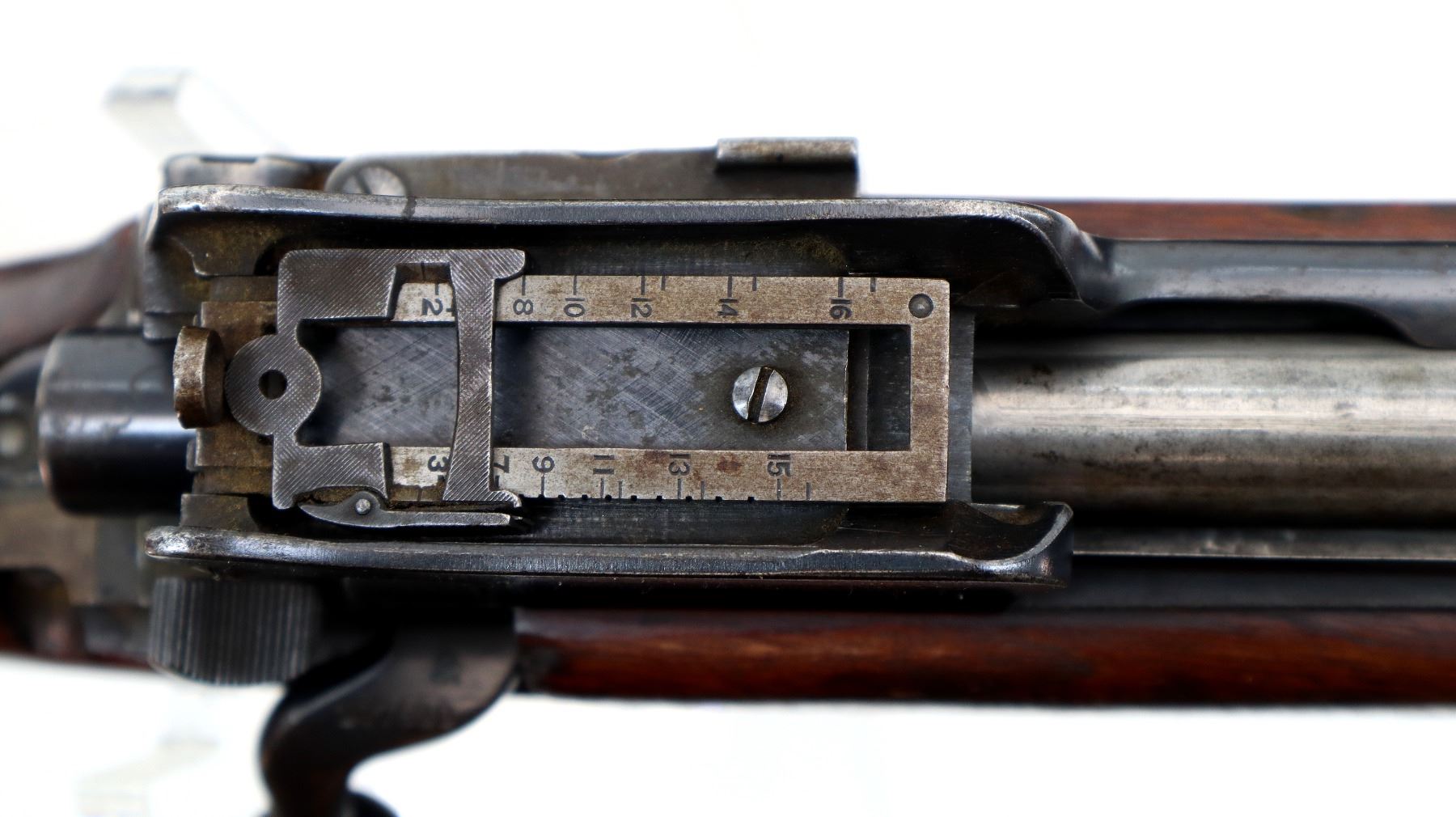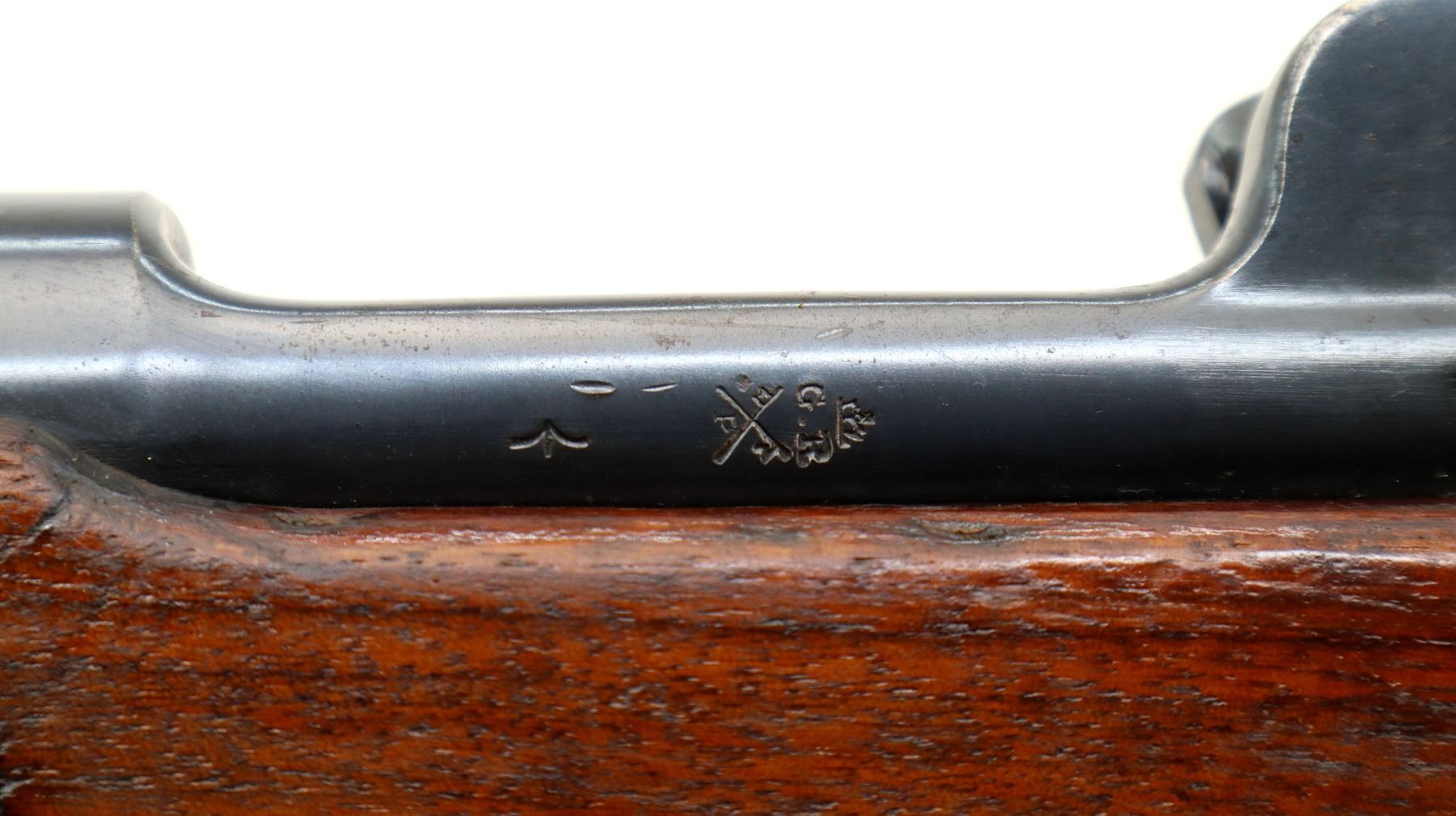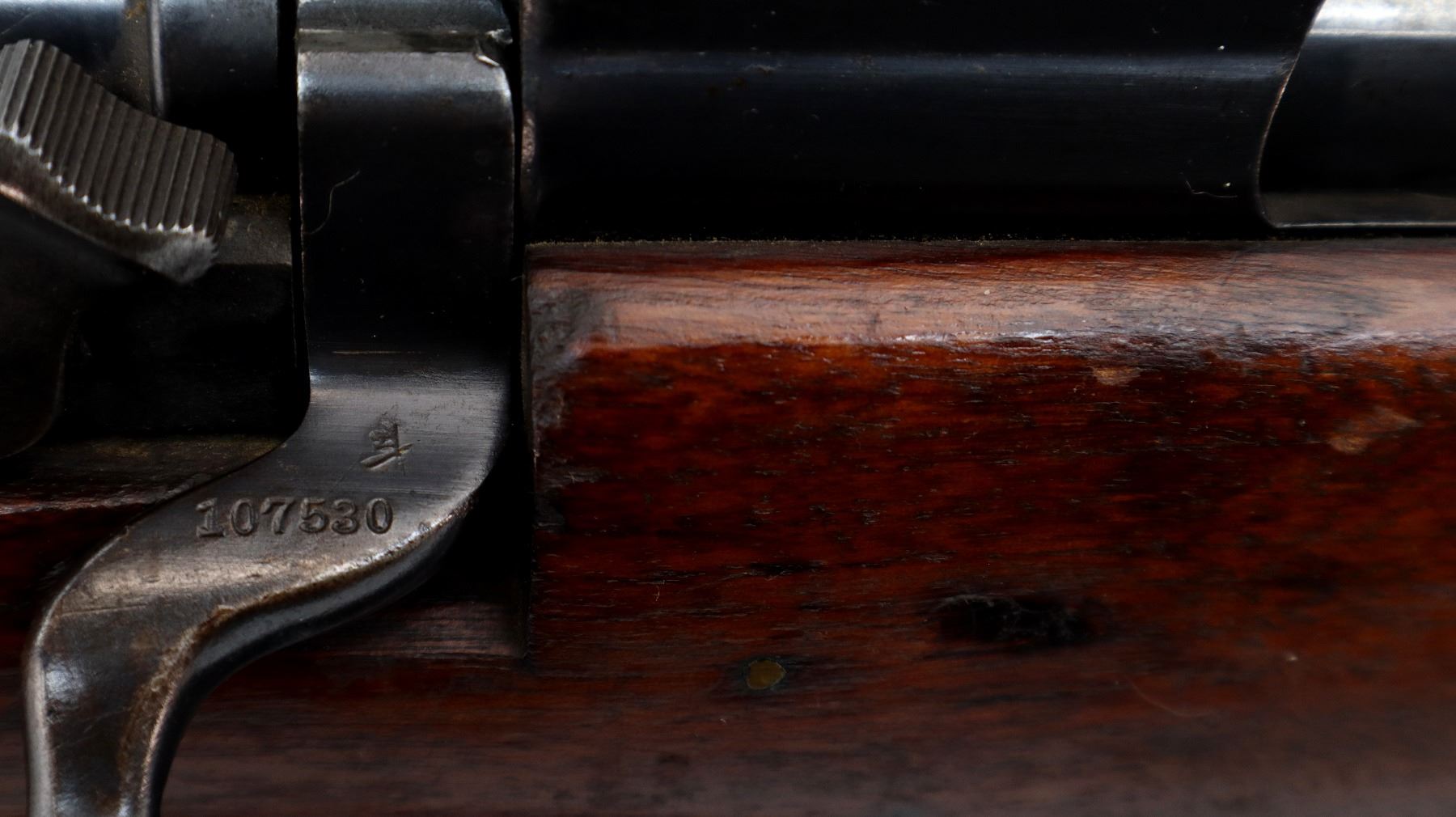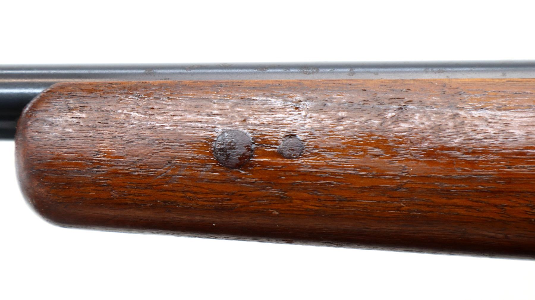 Main Description: Manufactured by Winchester, bolt and rear sight match. Blade front sight, ears removed, adjustable rear peep sight with ears, blued finish. One piece sporterized wood stock, finger grooved forearm, pistol grip, smooth steel butt plate with trap, missing stock disk, rear sling swivel only.