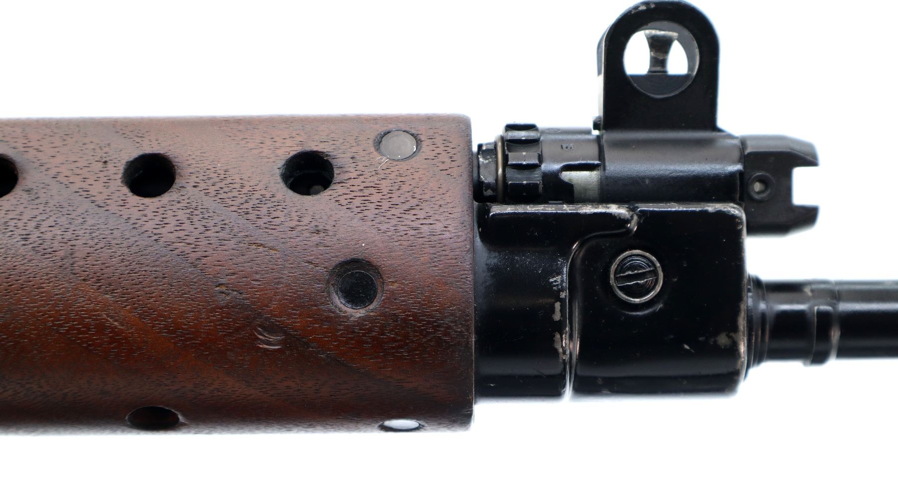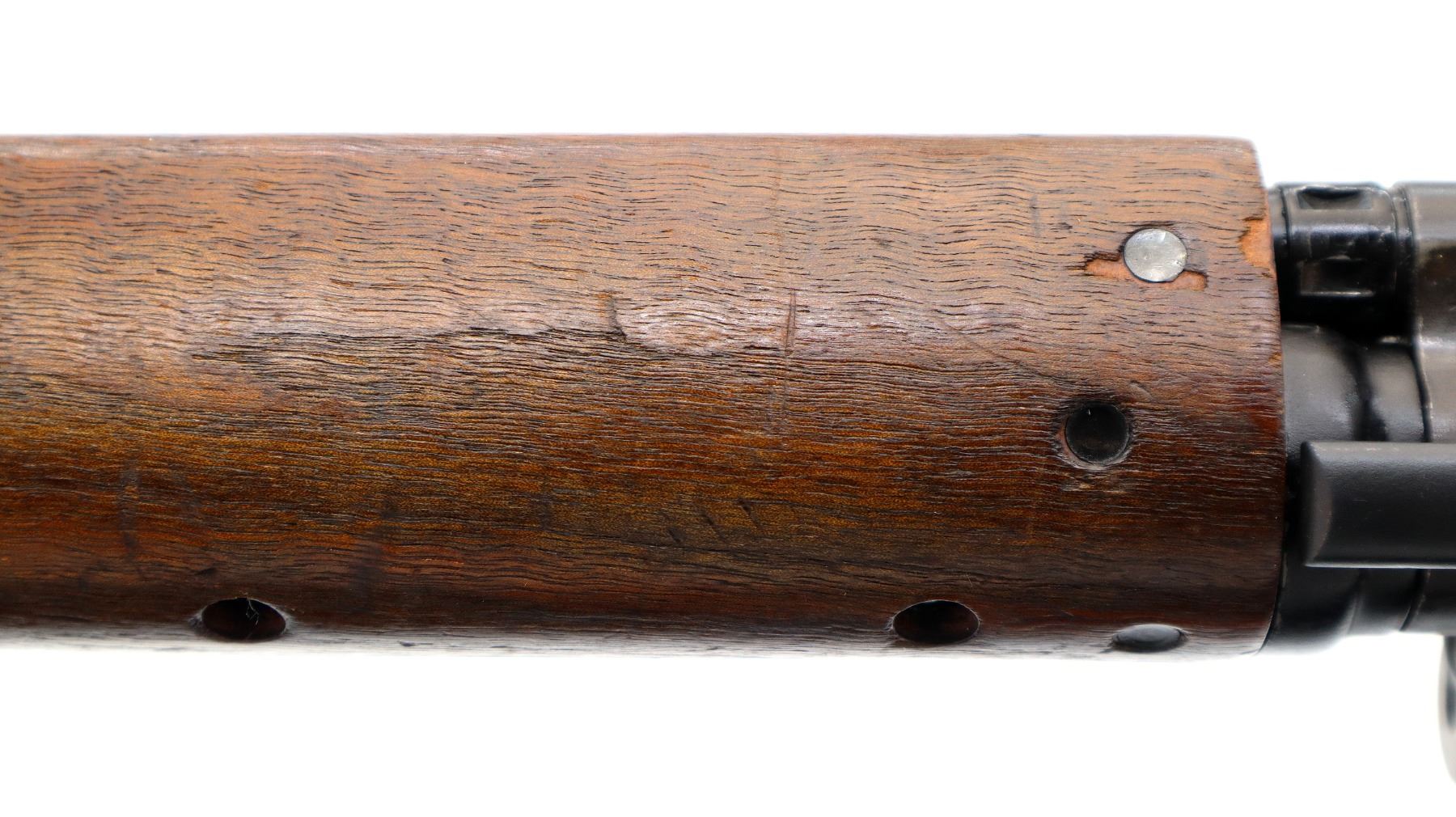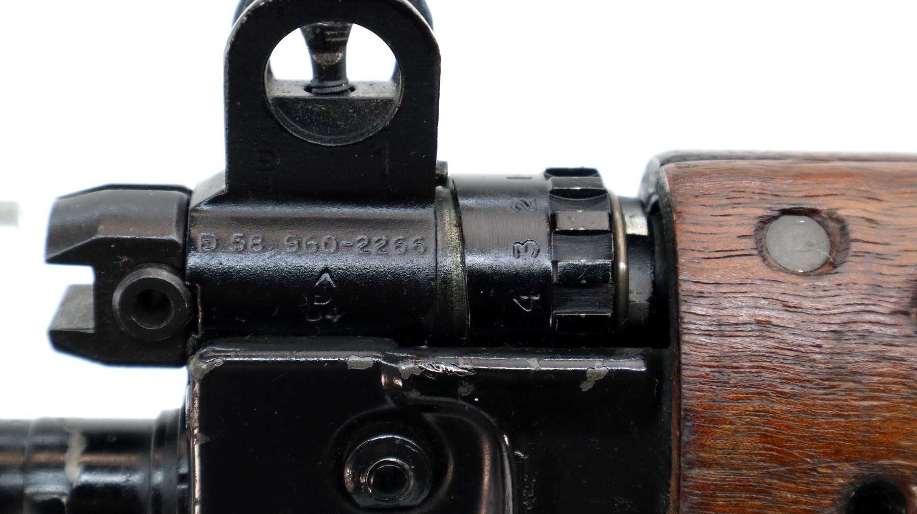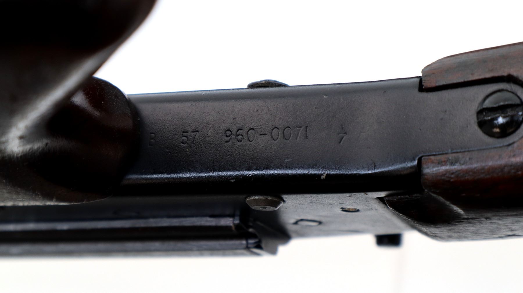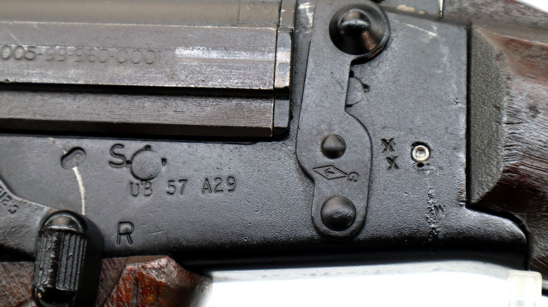Main Description: Canadian 12-5 Prohibited, PAL with 12-5 Class Required. If you don’t have this class of license and would like this item deactivated, it can be done for an additional fee of $250.00. Manufactured by Enfield 1957, numbers mismatched. Blade front sight with ears and ramp, adjustable folding rear peep sight, black painted metal finish, shortened barrel with attached folding break, left side cocking handle. Four piece full military wood stocks, ventilated handguards, pistol grip, smooth alloy butt plate with trap, rear sling swivel only.
