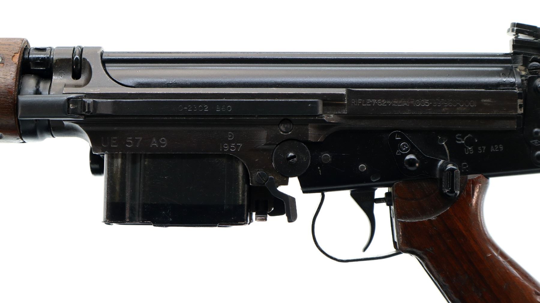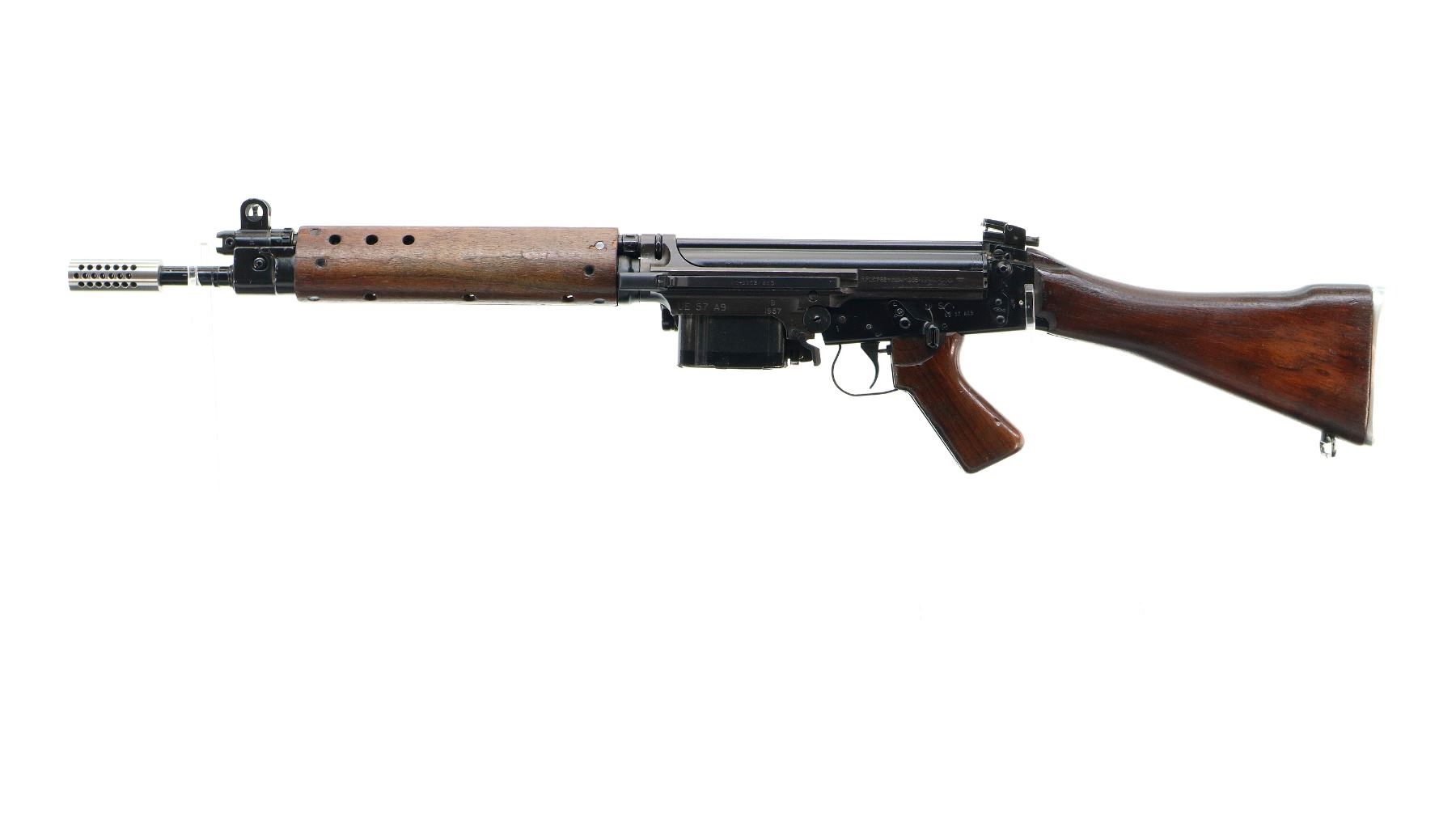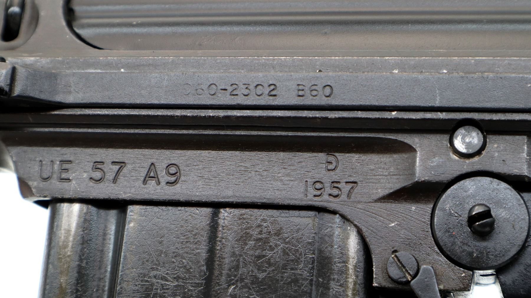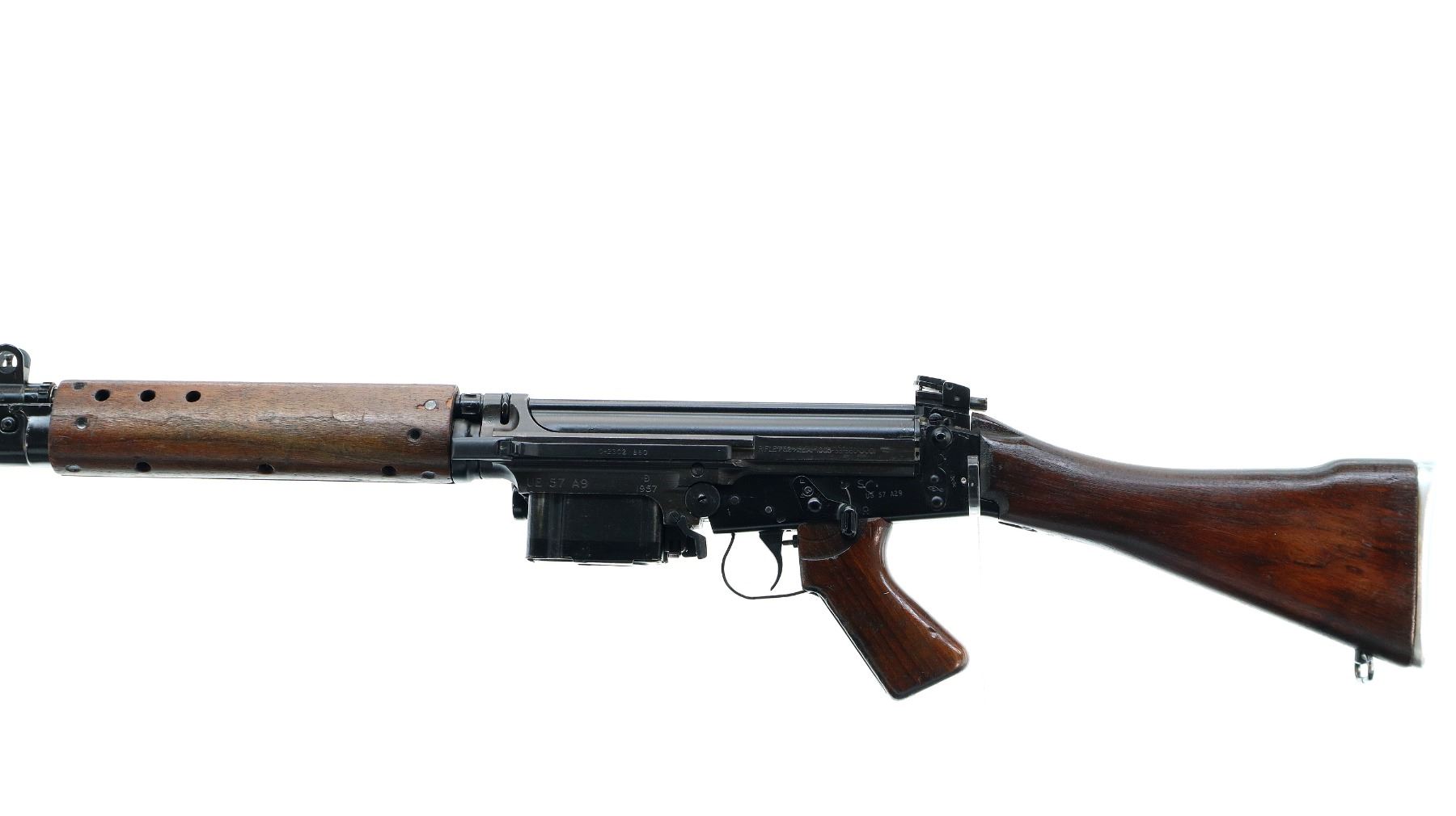 Main Description: Canadian 12-5 Prohibited, PAL with 12-5 Class Required. If you don’t have this class of license and would like this item deactivated, it can be done for an additional fee of $250.00. Manufactured by Enfield 1957, numbers mismatched. Blade front sight with ears and ramp, adjustable folding rear peep sight, black painted metal finish, shortened barrel with attached folding break, left side cocking handle. Four piece full military wood stocks, ventilated handguards, pistol grip, smooth alloy butt plate with trap, rear sling swivel only.