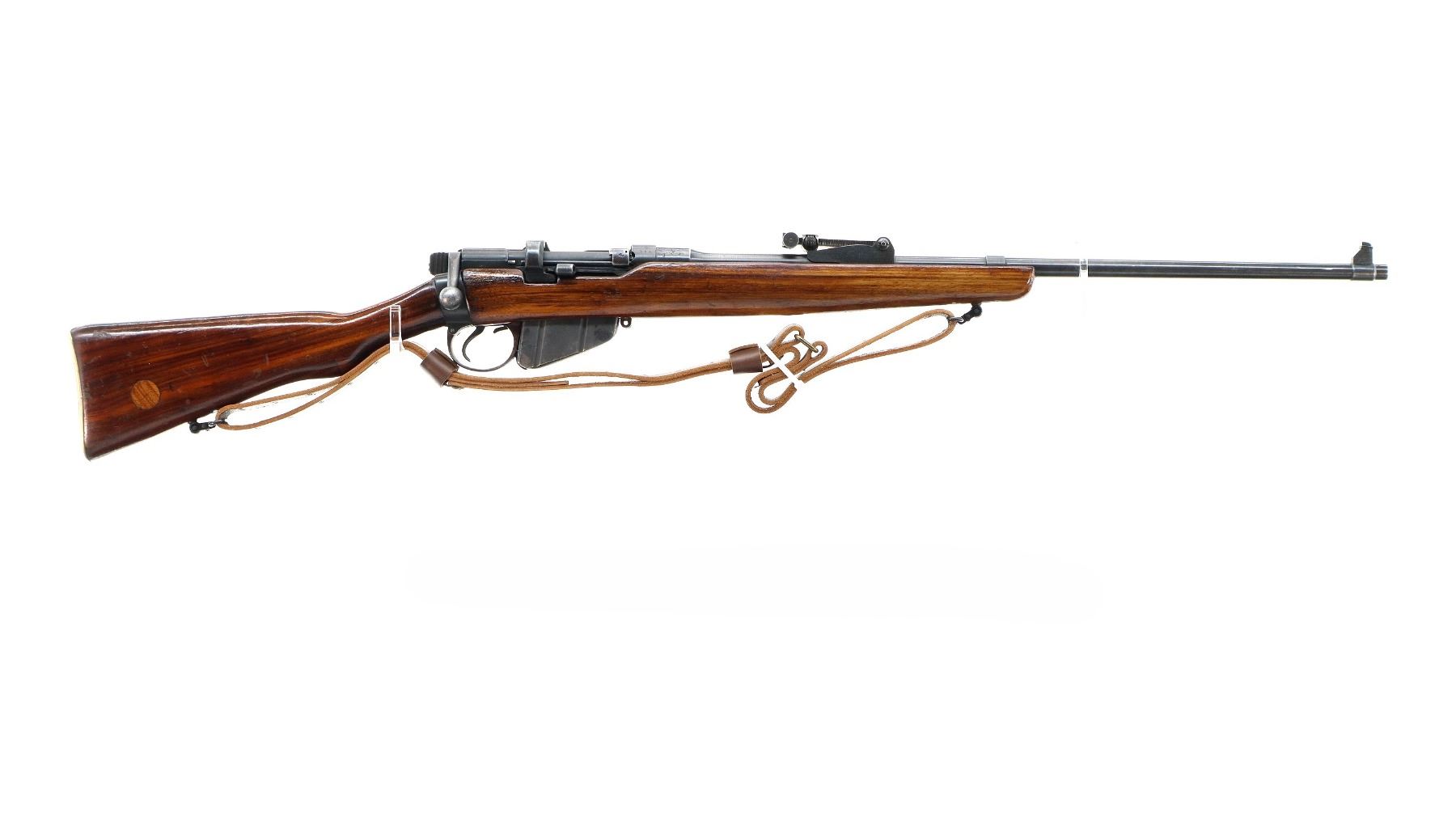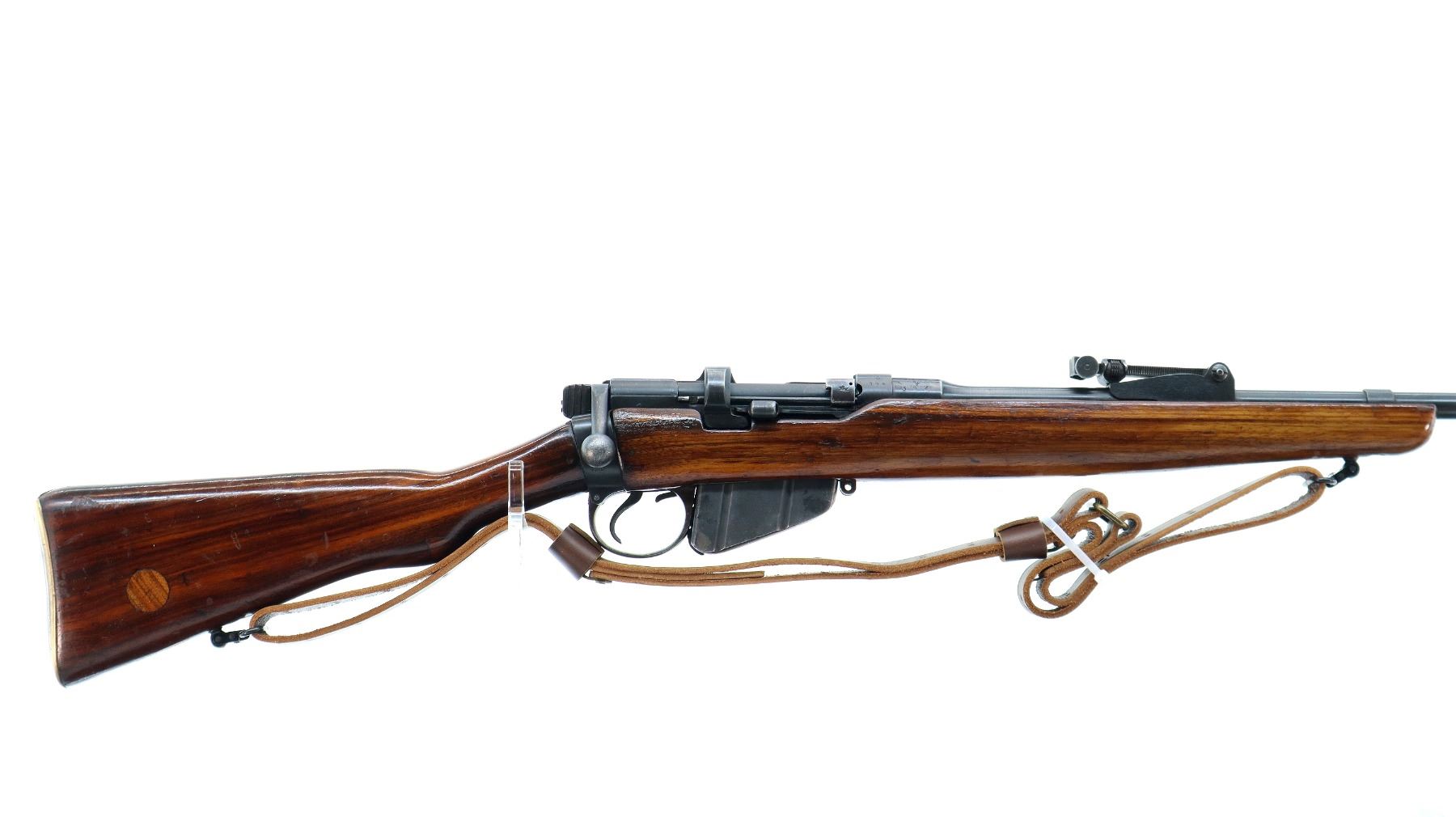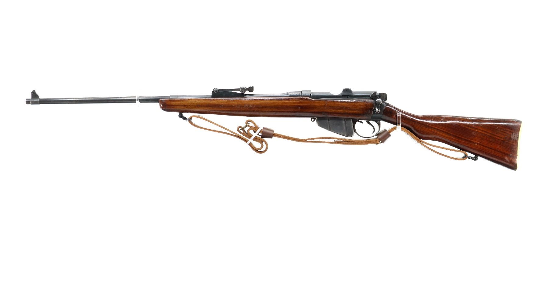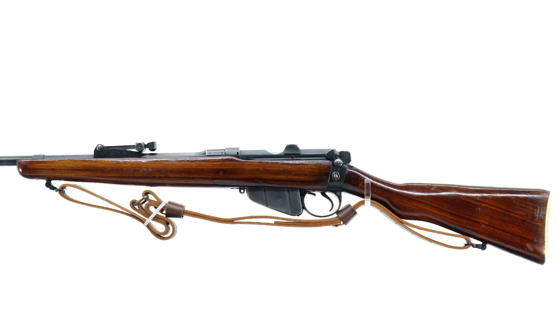 Main Description: Manufactured by BSA Co 1915, bolt mismatched. Blade front sight with ramp, adjustable u notched rear sight, blued finish, retains magazine cut off. Two piece sporterized wood stocks, pistol grip, smooth brass butt plate with trap, wood stock disk, sling swivels with brown leather sling.