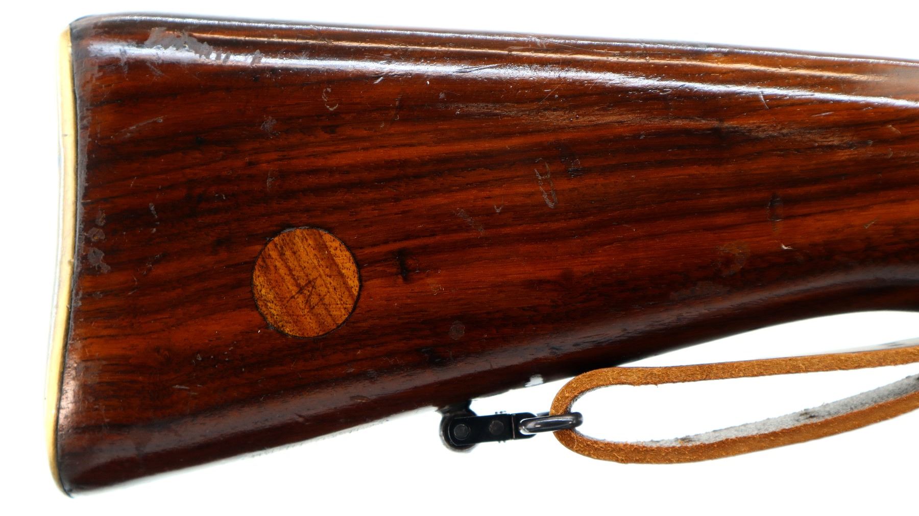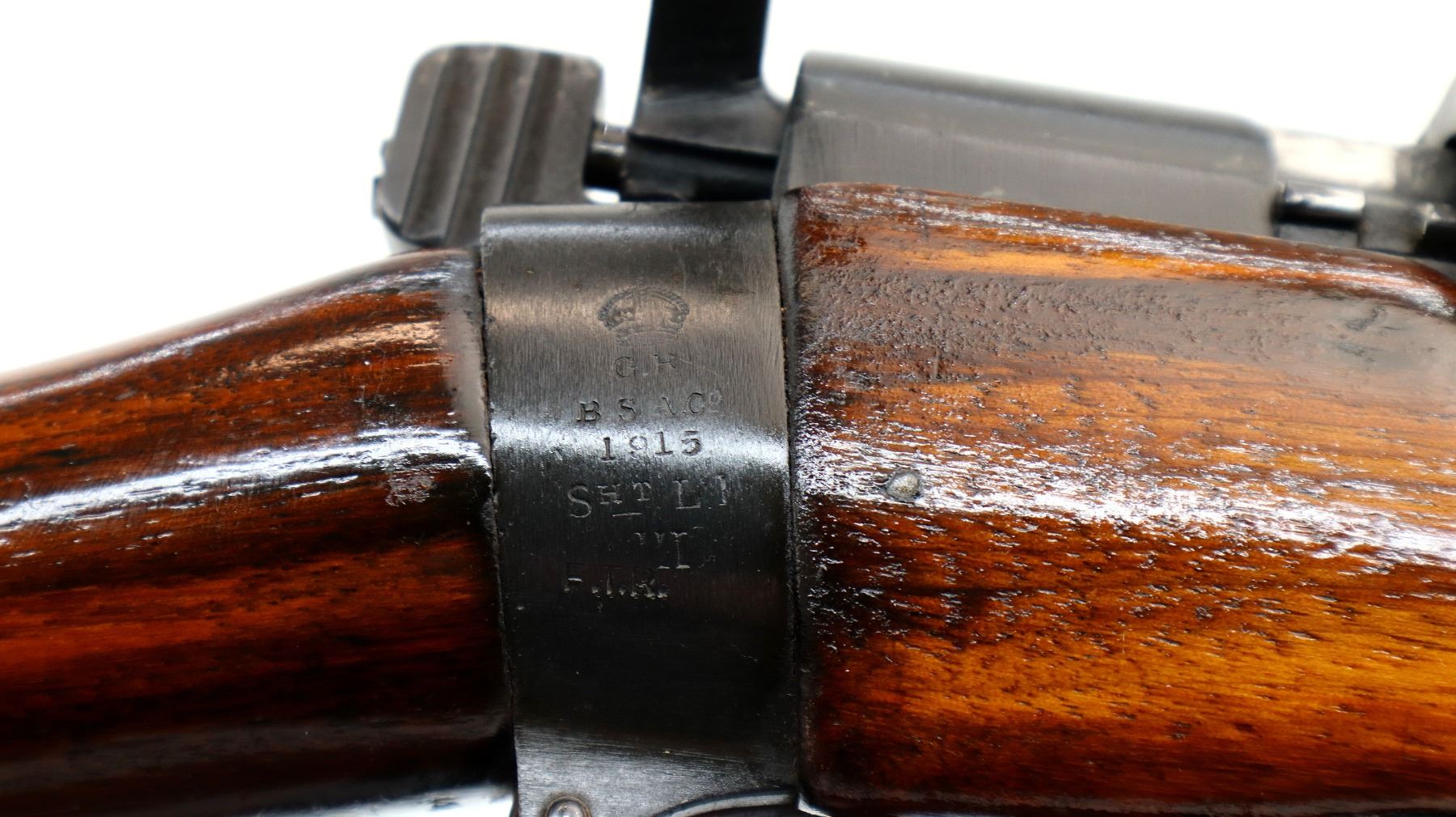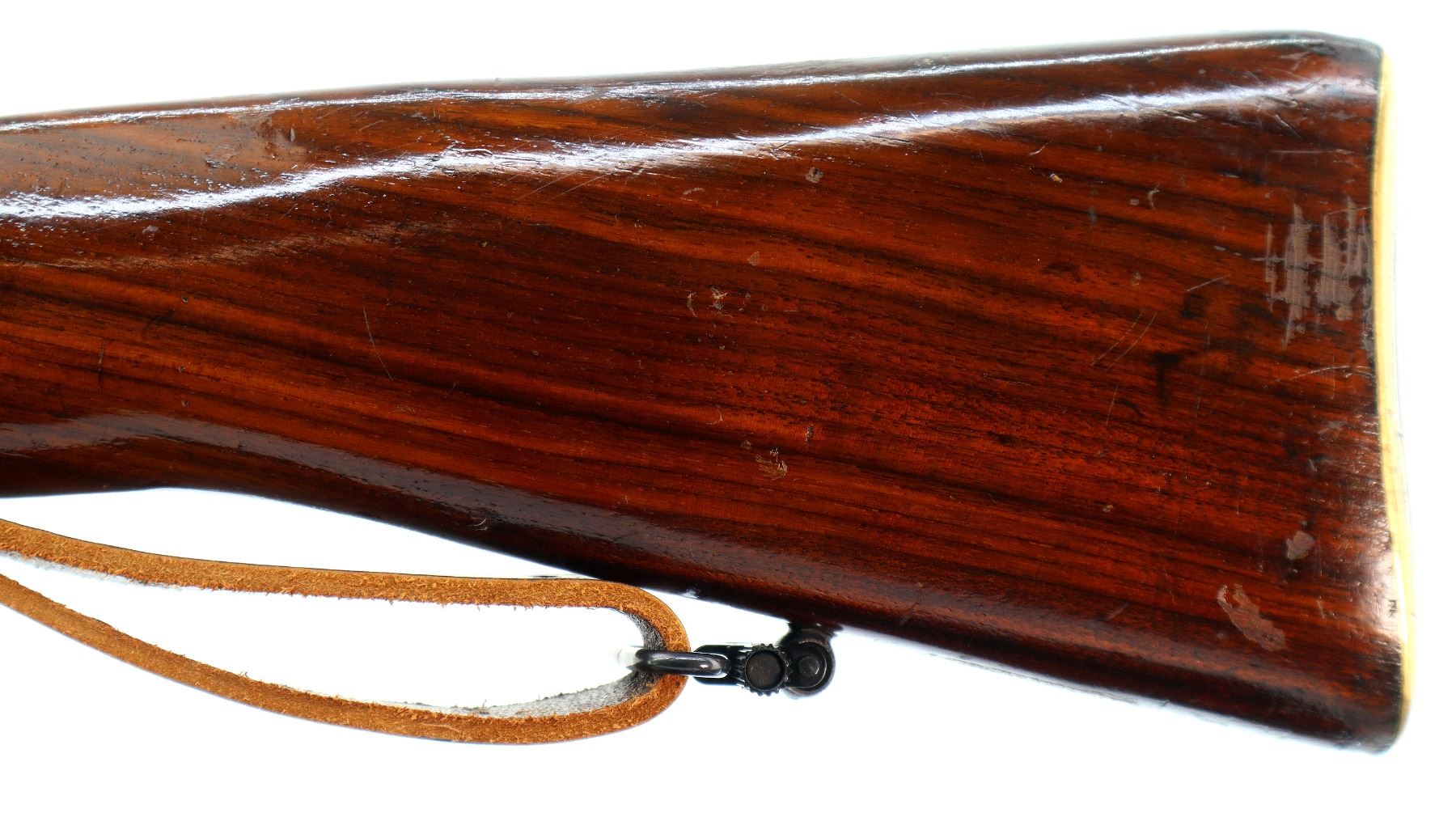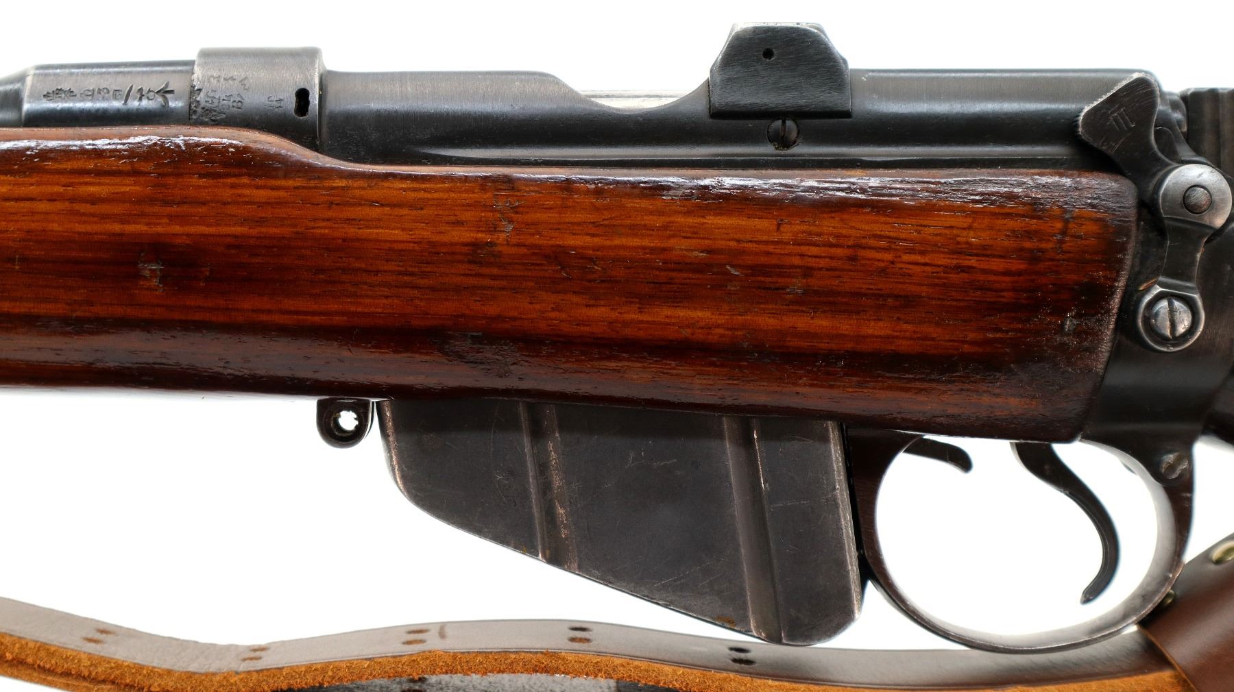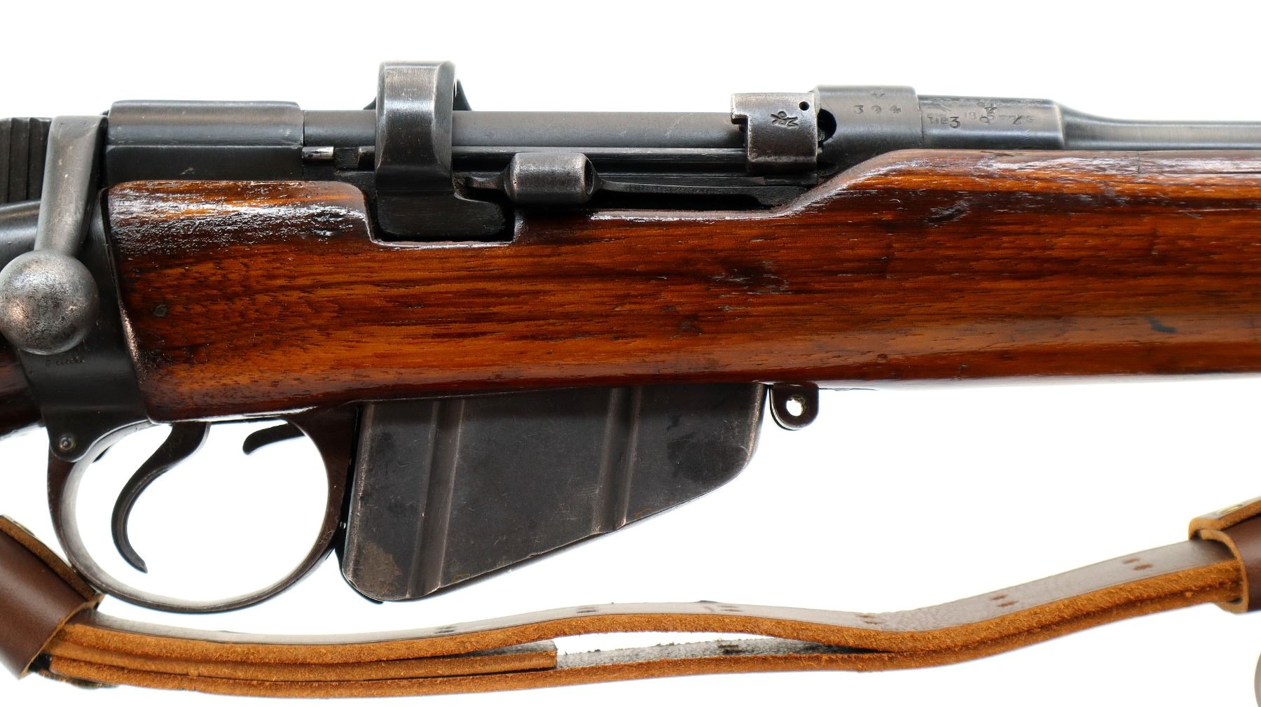 Main Description: Manufactured by BSA Co 1915, bolt mismatched. Blade front sight with ramp, adjustable u notched rear sight, blued finish, retains magazine cut off. Two piece sporterized wood stocks, pistol grip, smooth brass butt plate with trap, wood stock disk, sling swivels with brown leather sling.