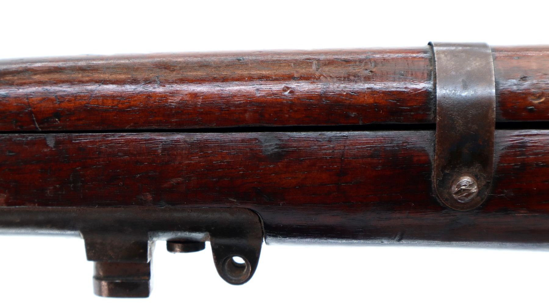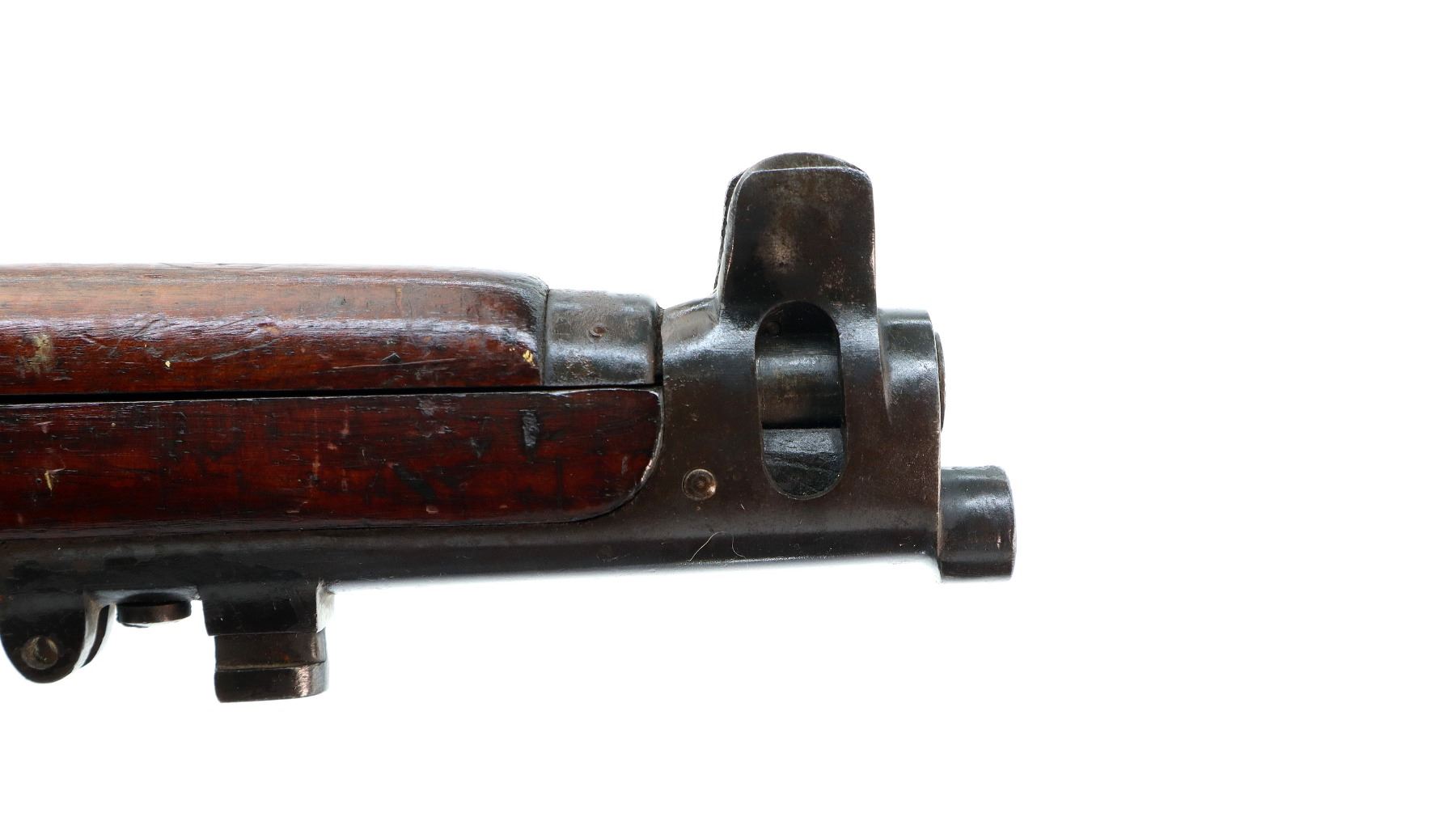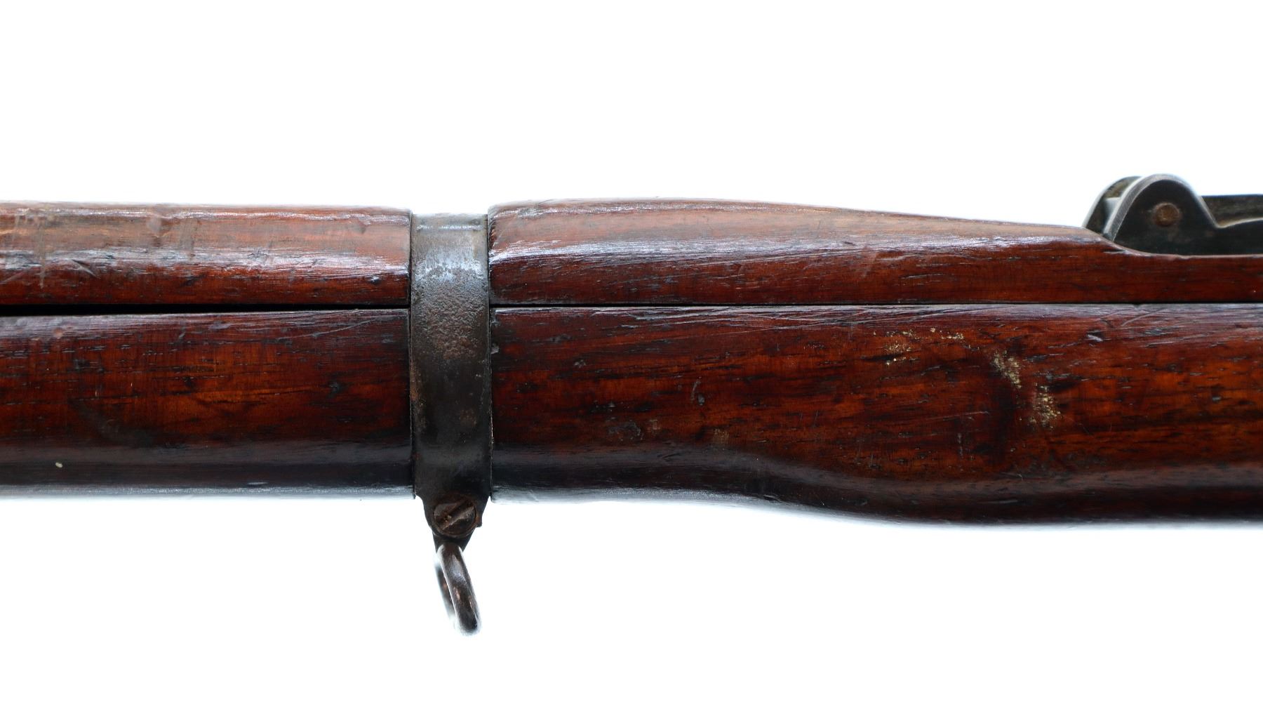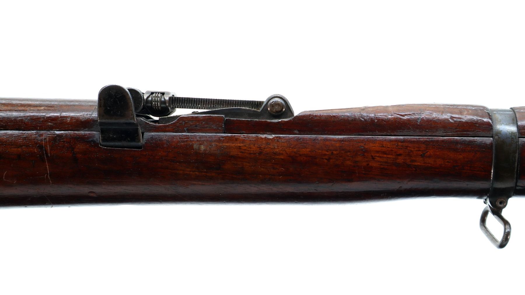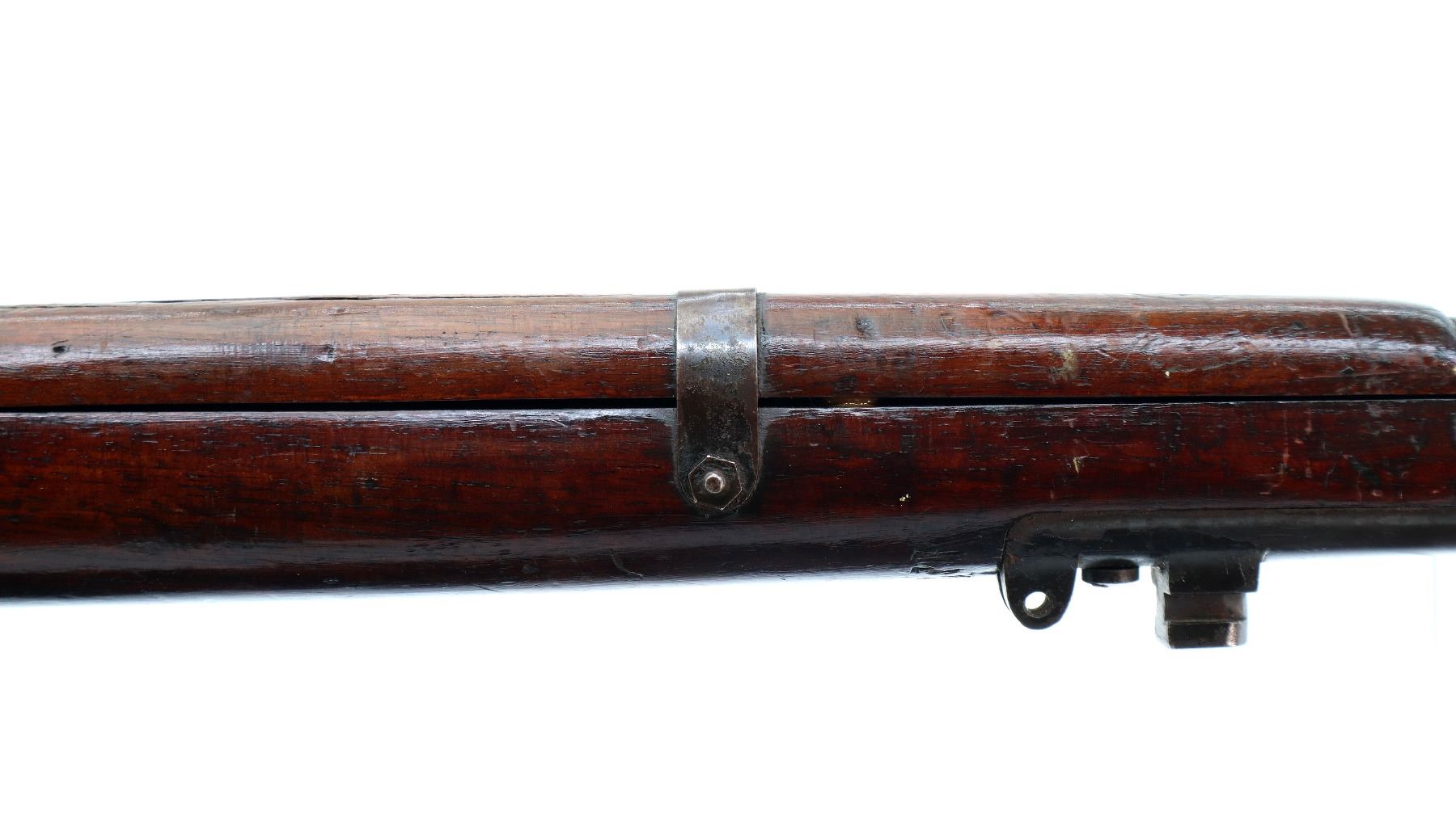 Main Description: Manufactured by BSA, bolt matches forearm does not. Blade front sight with ears and ramp, adjustable u notched rear sight with ears, blued finish, magazine cut off, bolt head catch spring is loose requires adjustment. Four piece full military wood stocks, front handguard is cracked with an additional steel band on top of it, rear of forearm has two accurizing screws, pistol grip, smooth brass butt plate with trap, steel stock disk, three sling swivels, bayonet lug, unnumbered nose cap.