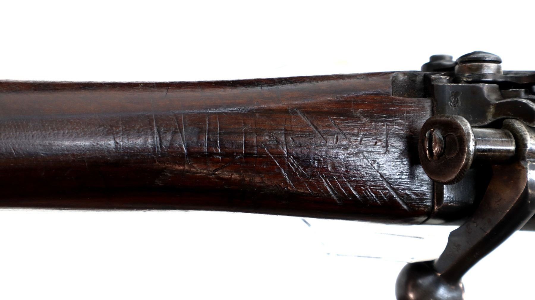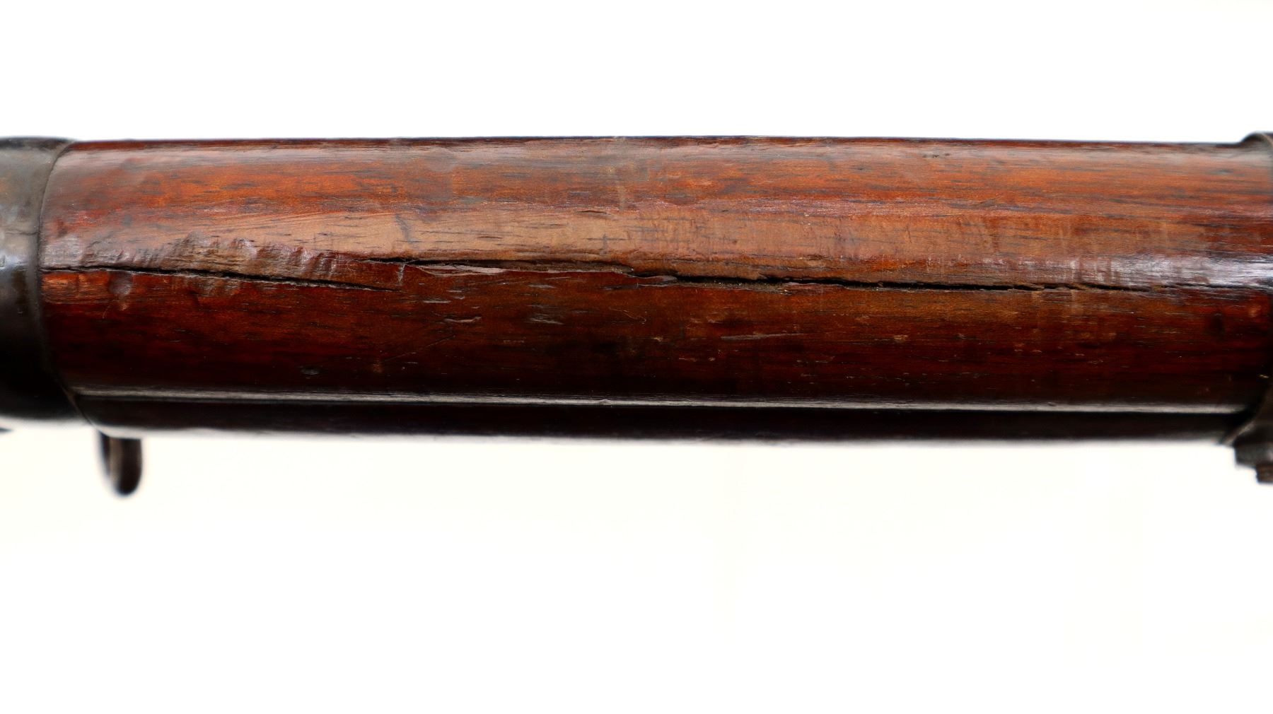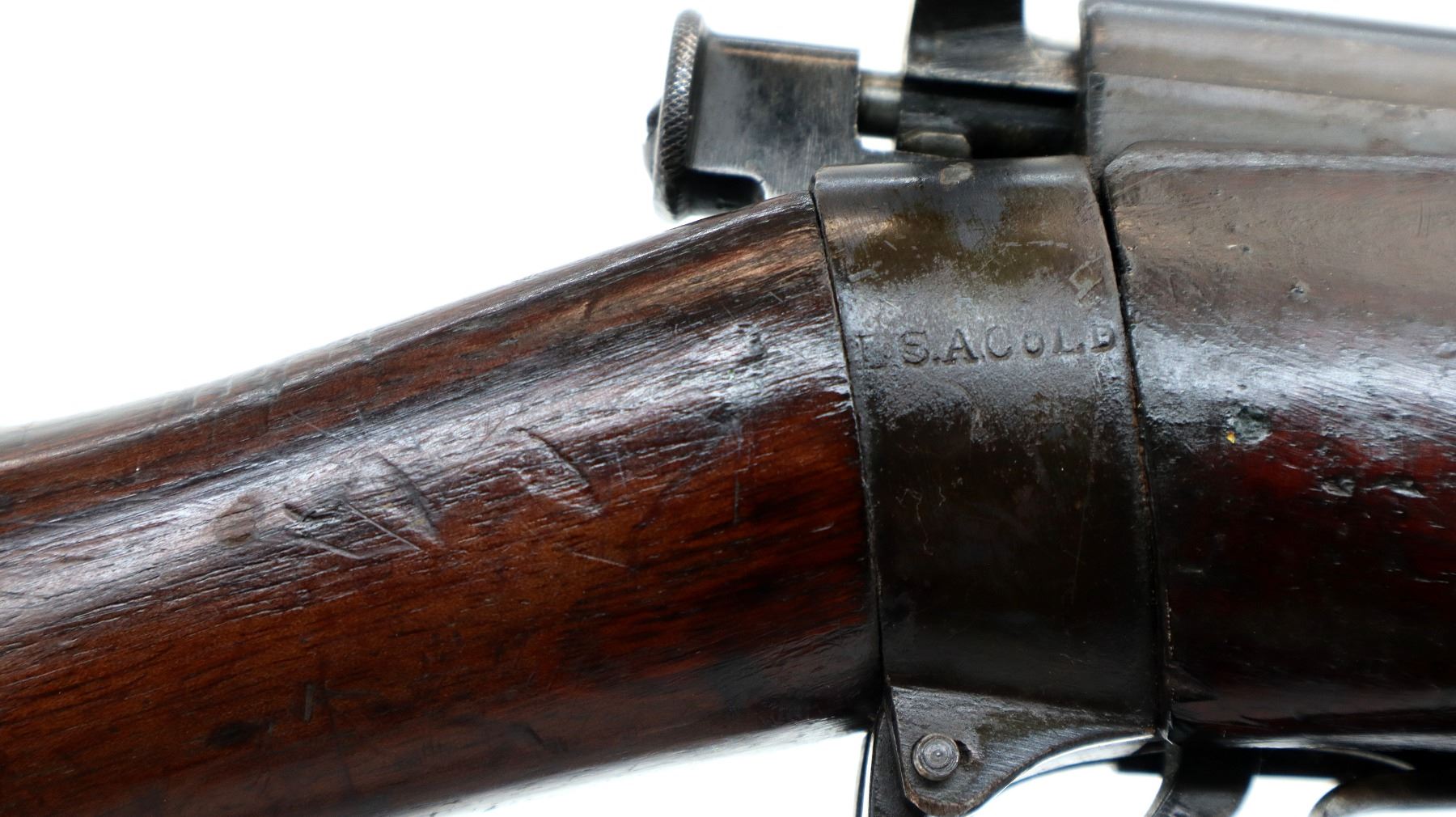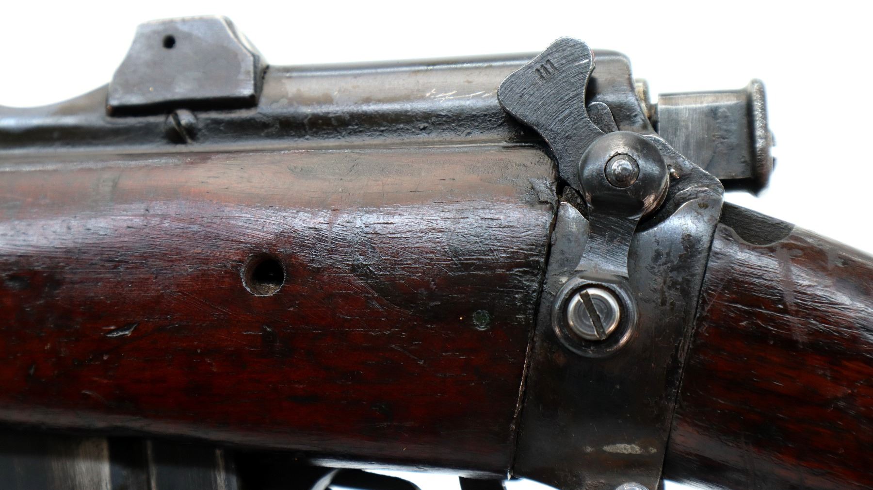Main Description: Manufactured by BSA, bolt matches forearm does not. Blade front sight with ears and ramp, adjustable u notched rear sight with ears, blued finish, magazine cut off, bolt head catch spring is loose requires adjustment. Four piece full military wood stocks, front handguard is cracked with an additional steel band on top of it, rear of forearm has two accurizing screws, pistol grip, smooth brass butt plate with trap, steel stock disk, three sling swivels, bayonet lug, unnumbered nose cap.