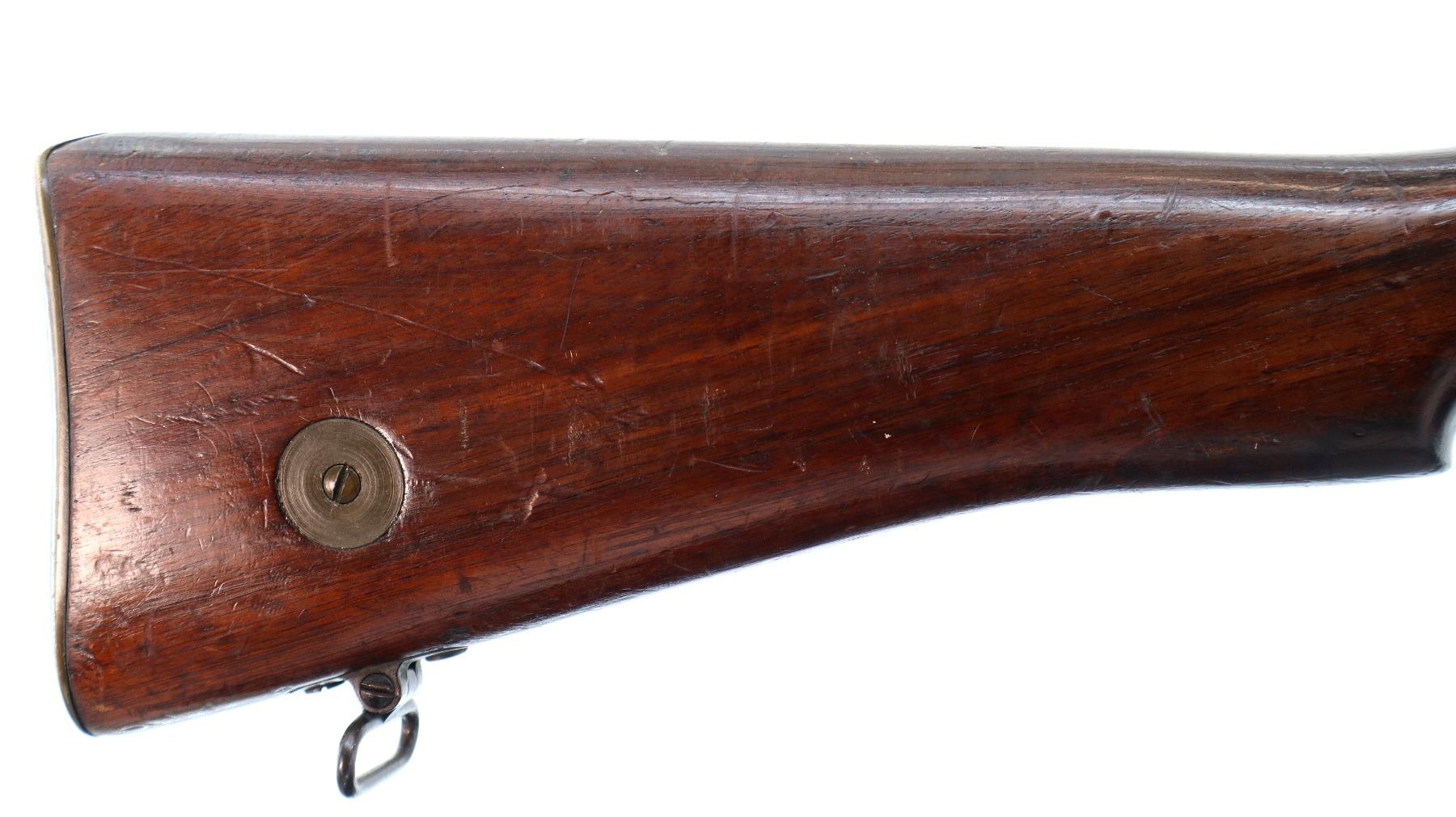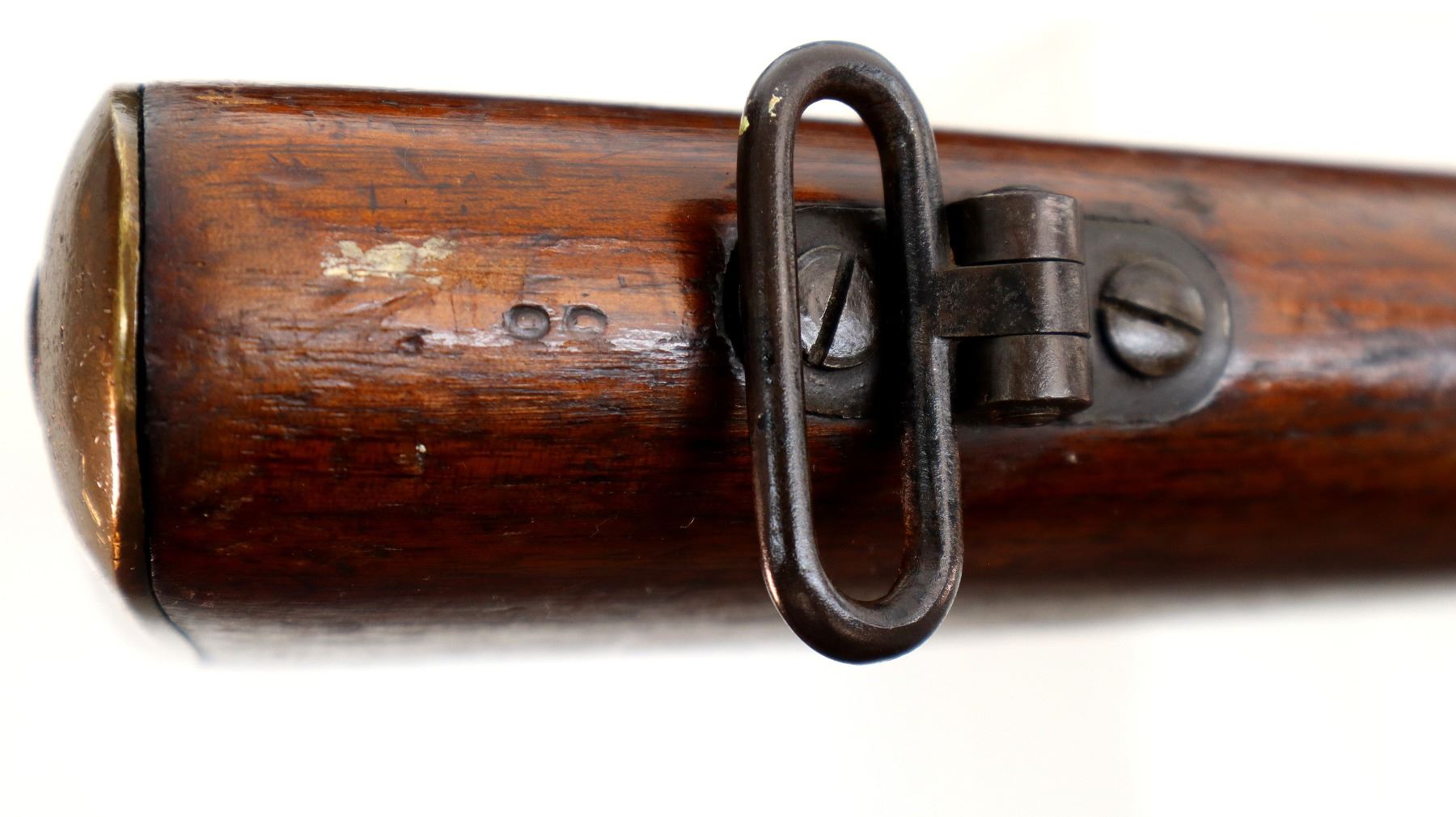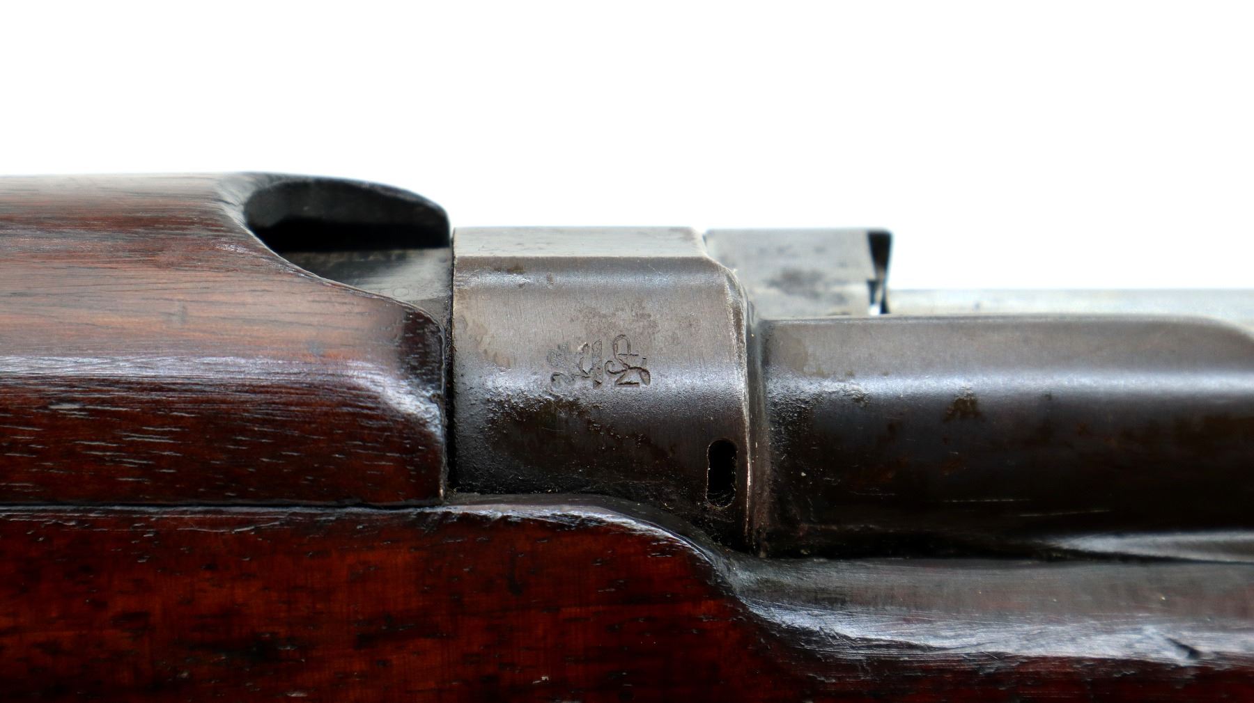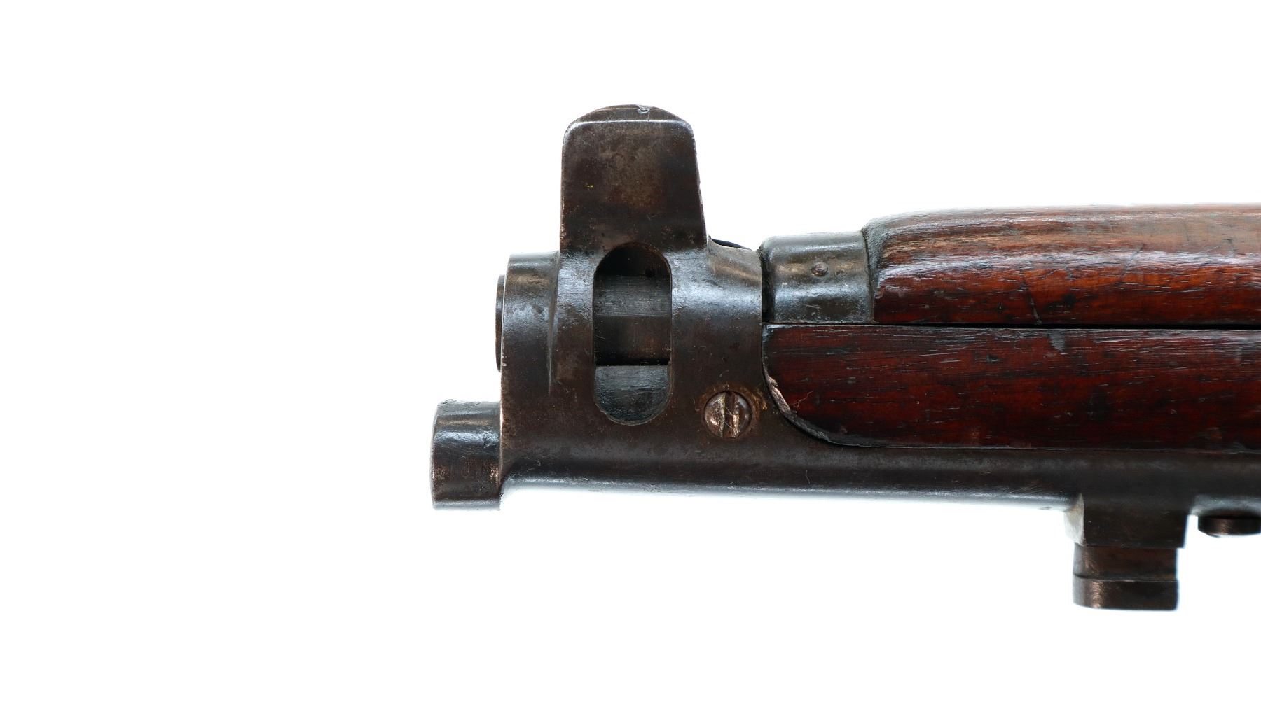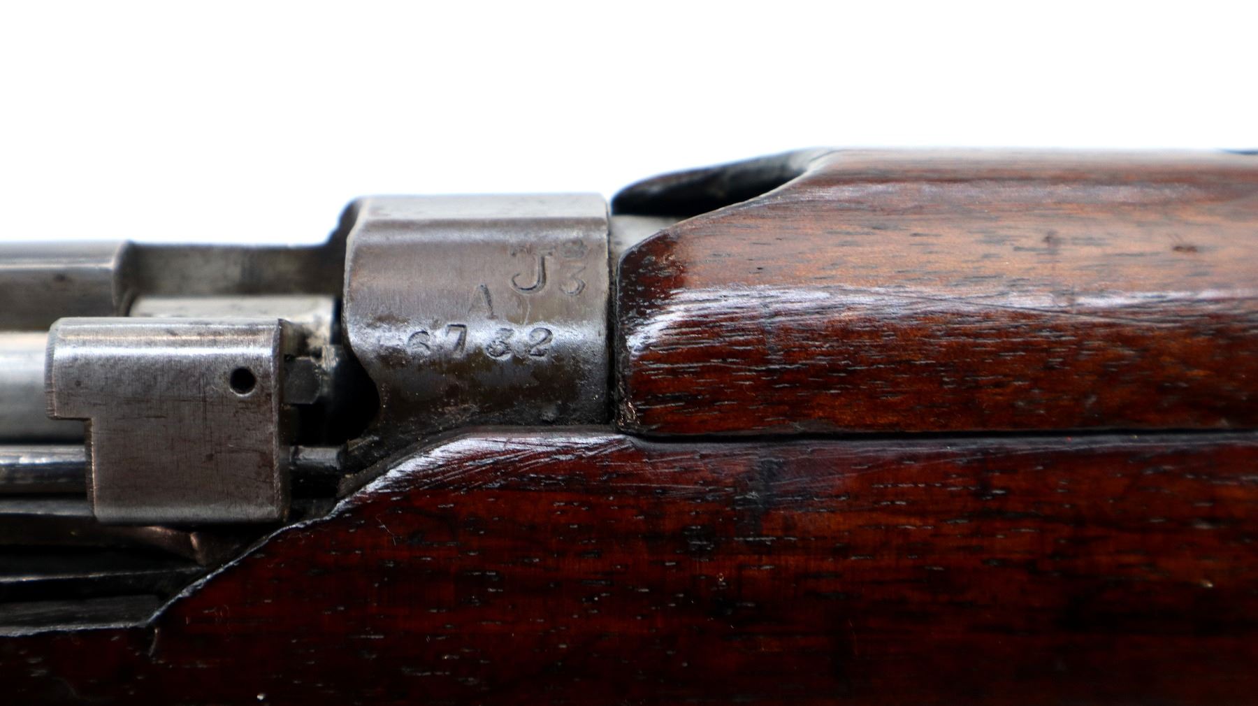 Main Description: Manufactured by BSA, bolt matches forearm does not. Blade front sight with ears and ramp, adjustable u notched rear sight with ears, blued finish, magazine cut off, bolt head catch spring is loose requires adjustment. Four piece full military wood stocks, front handguard is cracked with an additional steel band on top of it, rear of forearm has two accurizing screws, pistol grip, smooth brass butt plate with trap, steel stock disk, three sling swivels, bayonet lug, unnumbered nose cap.