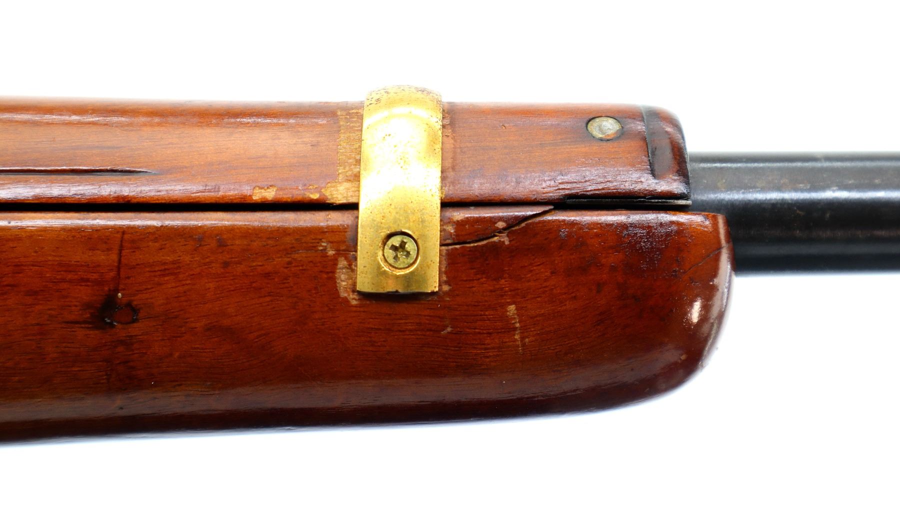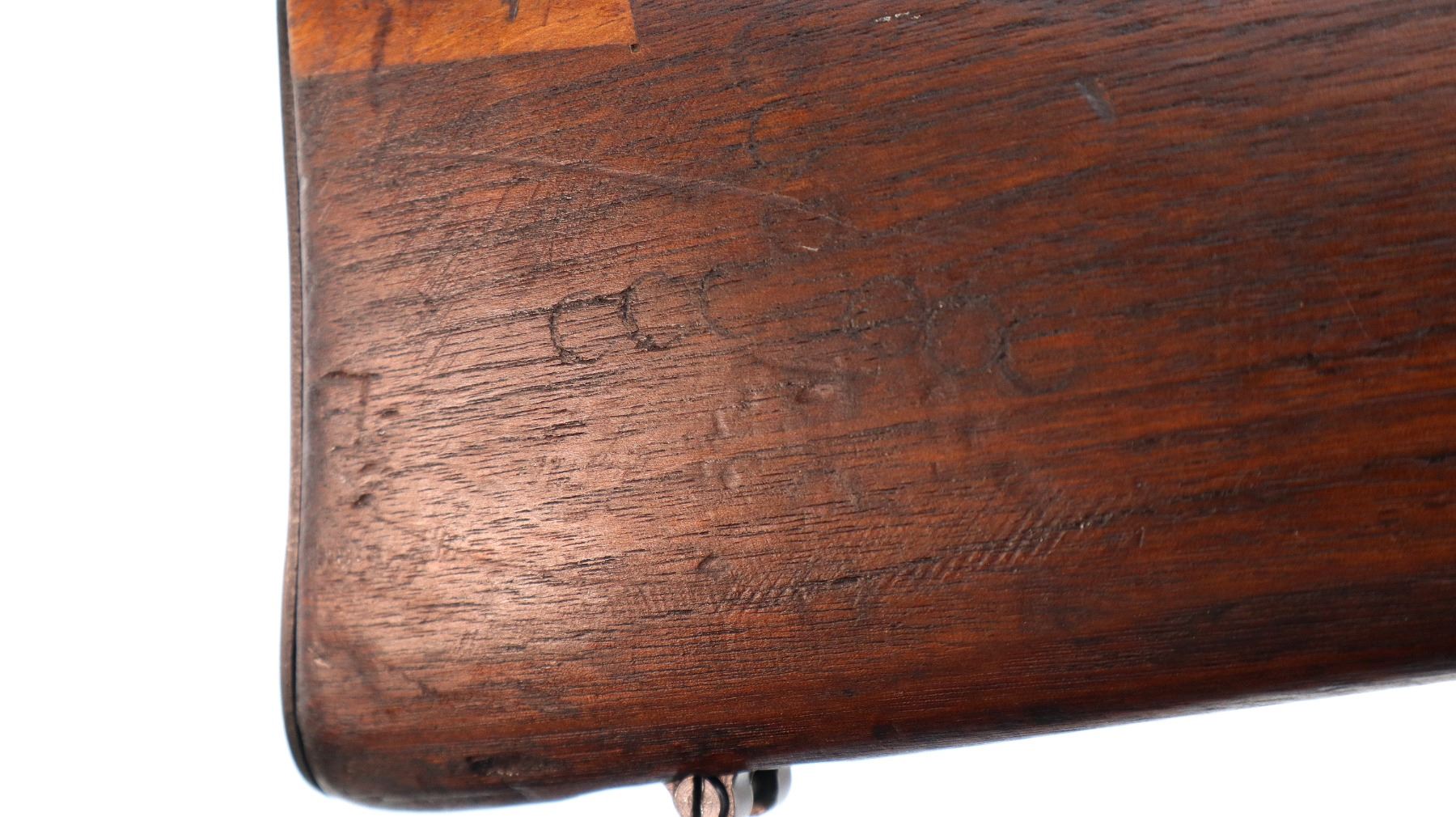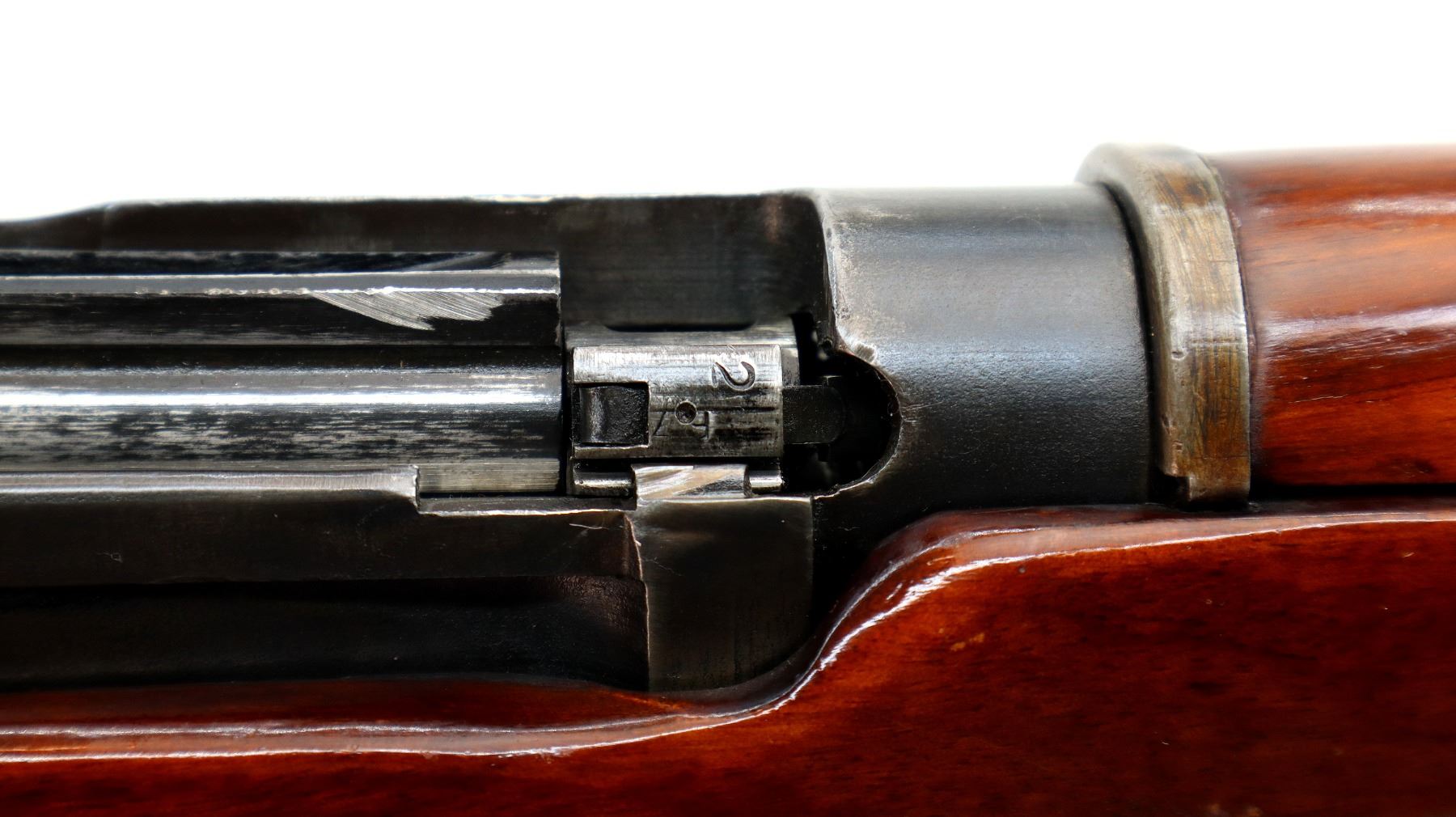 Main Description: Manufactured by Savage, bolt mismatched. Blade front sight with ramp, adjustable peep sight with second modified notch, blued finish. Three piece sporterized wood stocks, custom handguard band, pistol grip, smooth steel butt plate with trap, arsenal repair at heel, rear sling swivel base only.