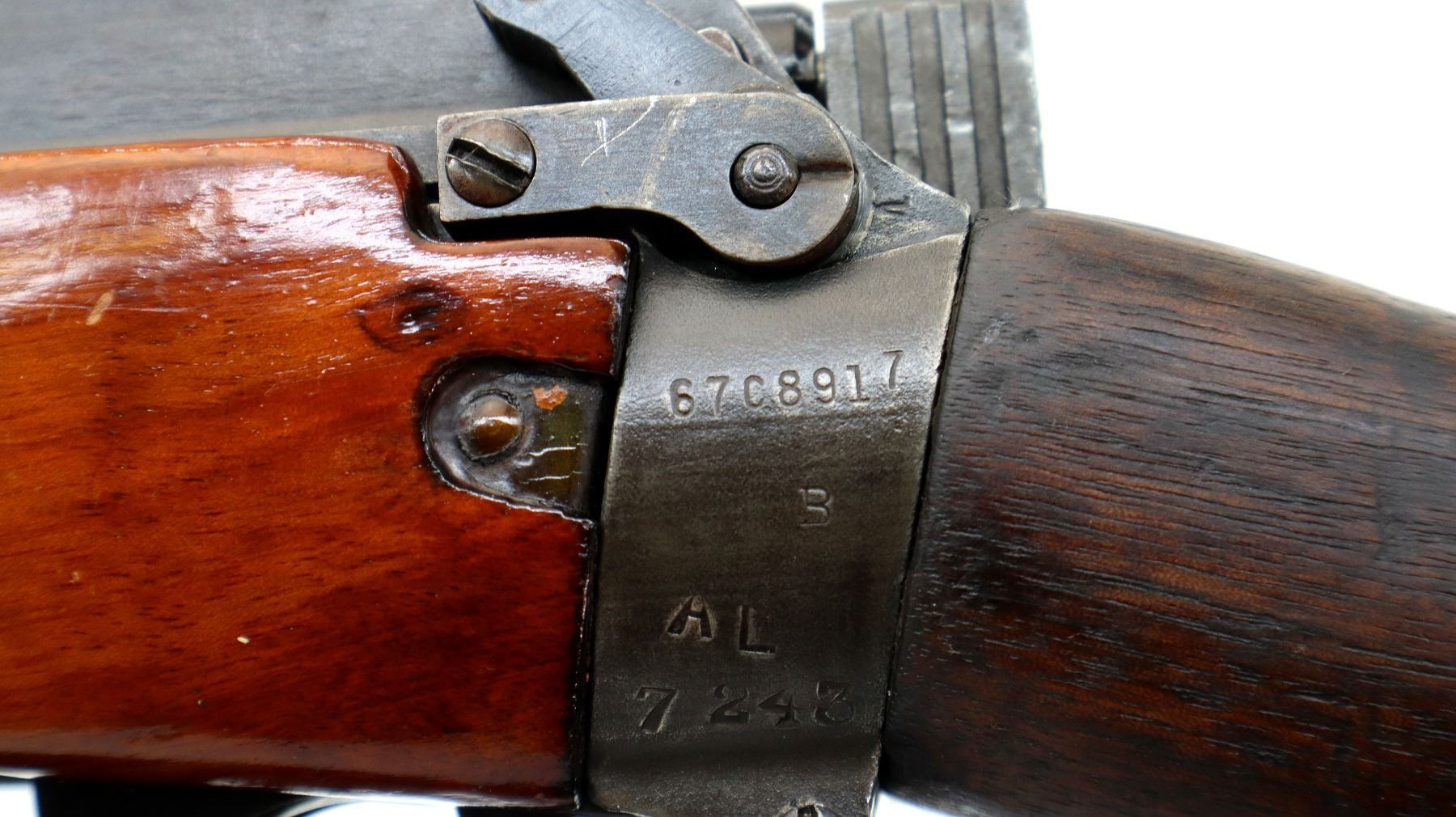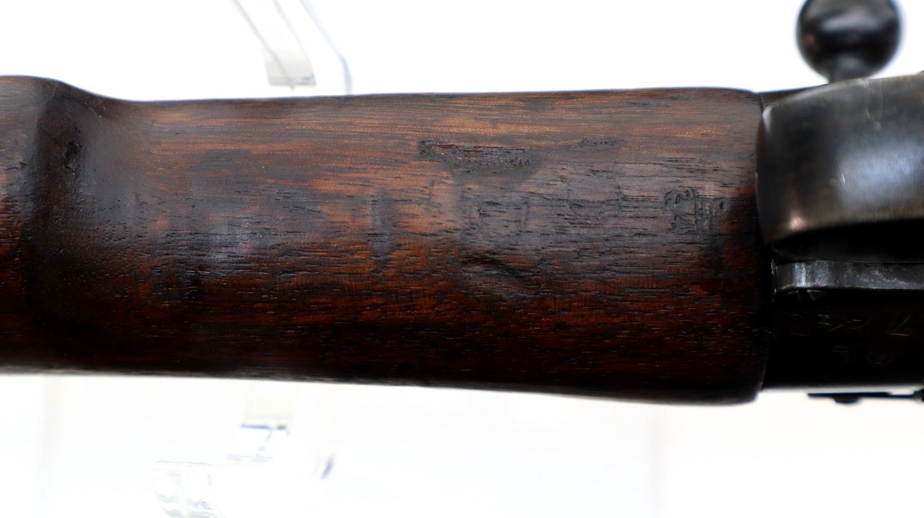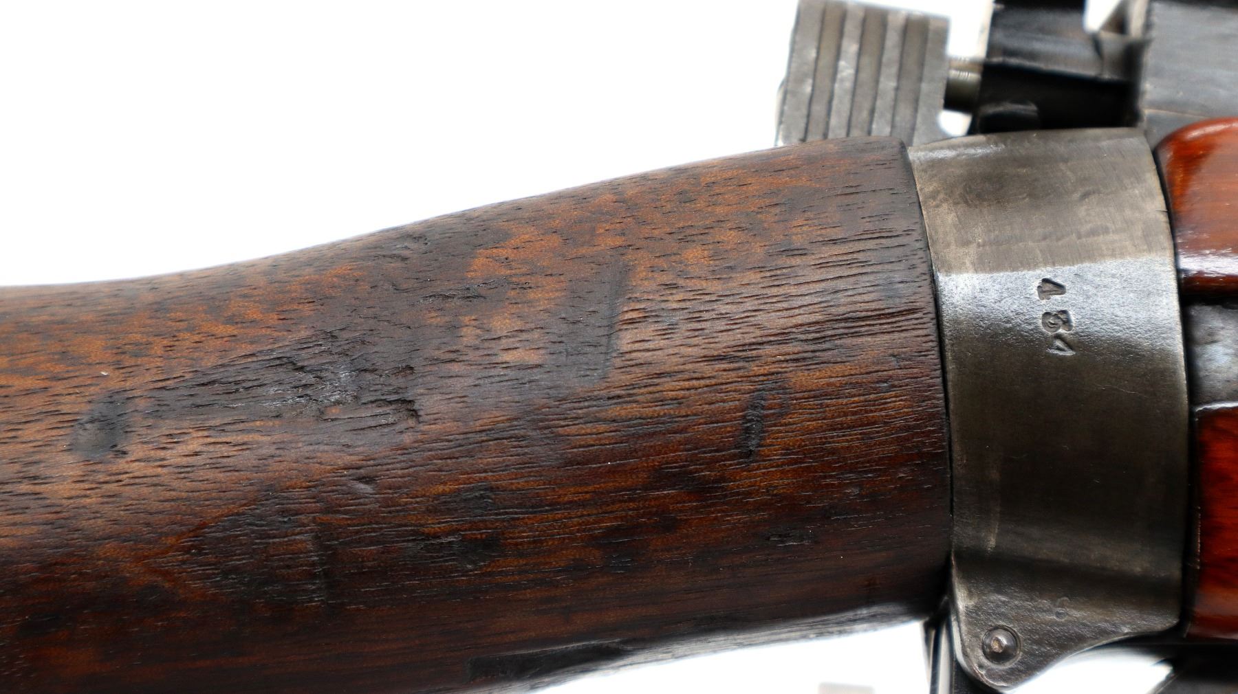Main Description: Manufactured by Savage, bolt mismatched. Blade front sight with ramp, adjustable peep sight with second modified notch, blued finish. Three piece sporterized wood stocks, custom handguard band, pistol grip, smooth steel butt plate with trap, arsenal repair at heel, rear sling swivel base only.