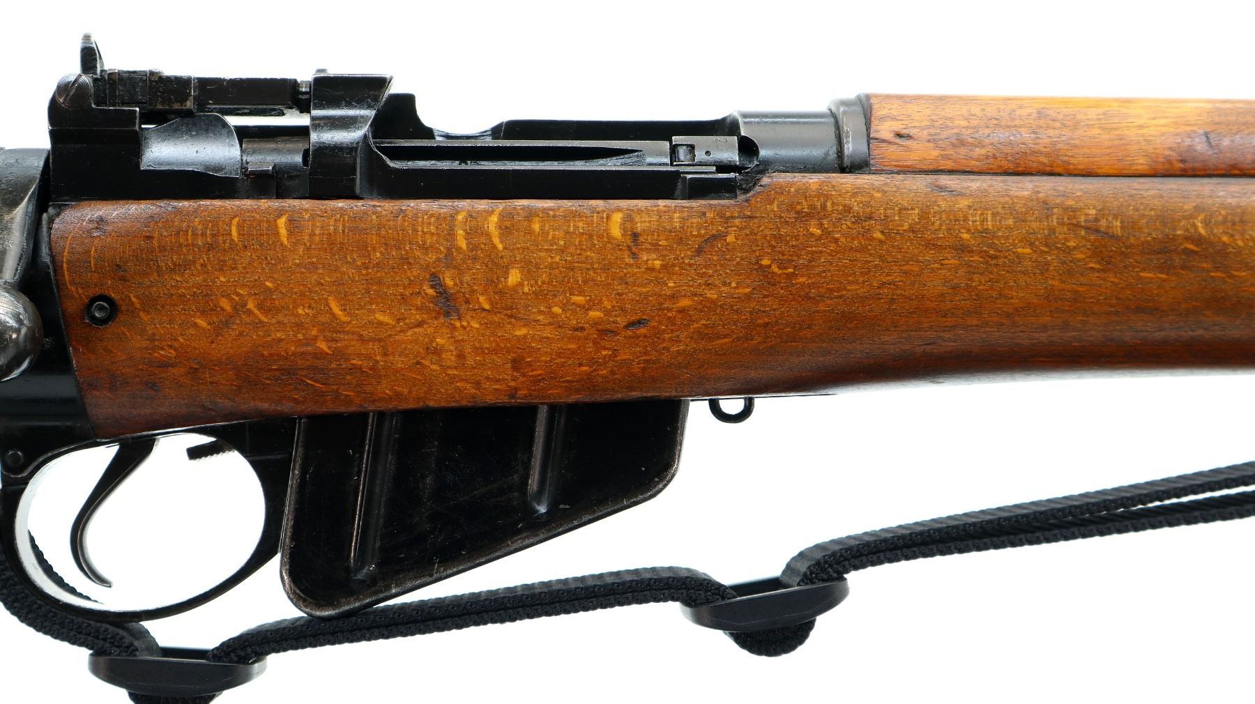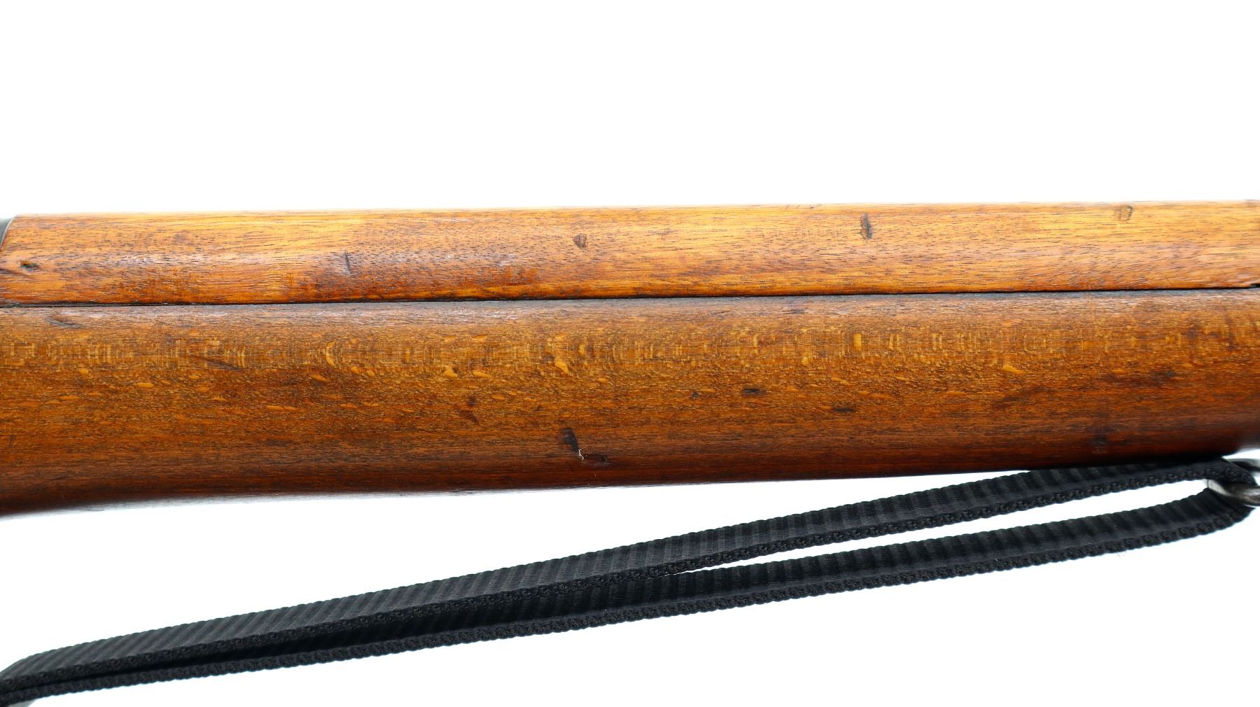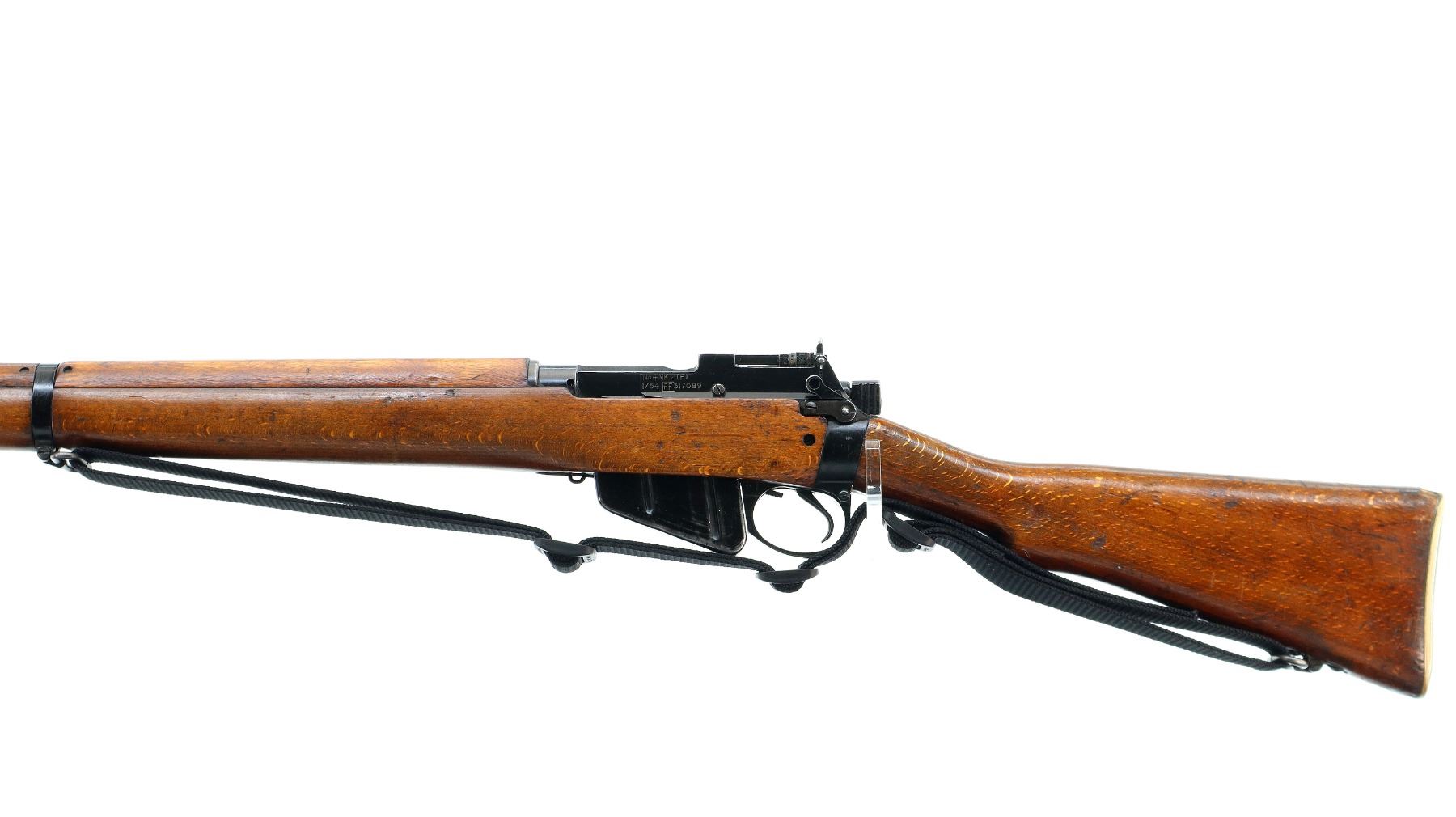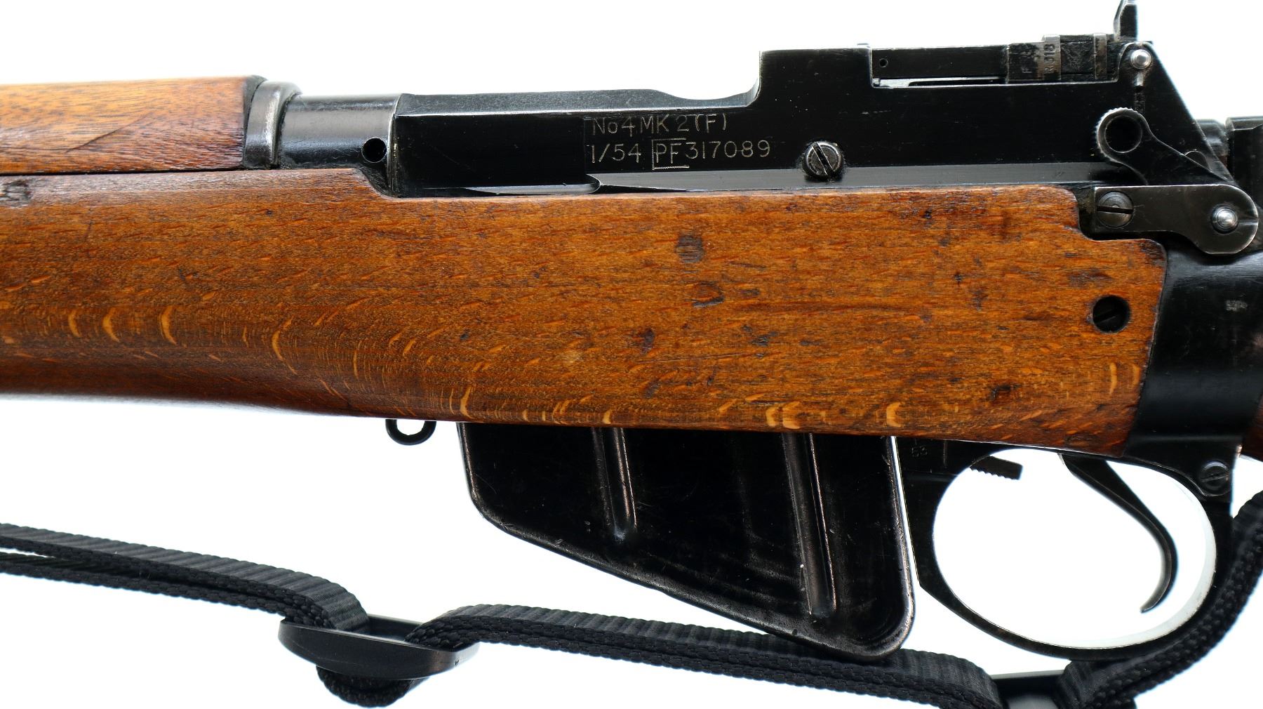 Main Description: Manufactured by Fazakerley 1/54, visible serial numbers match. Blade front sight with ears and ramp, adjustable milled rear peep sight, black painted metal finish. Four piece full military wood stocks, pistol grip, smooth brass butt plate with trap, sling swivels with black nylon sling, bayonet lugs.
