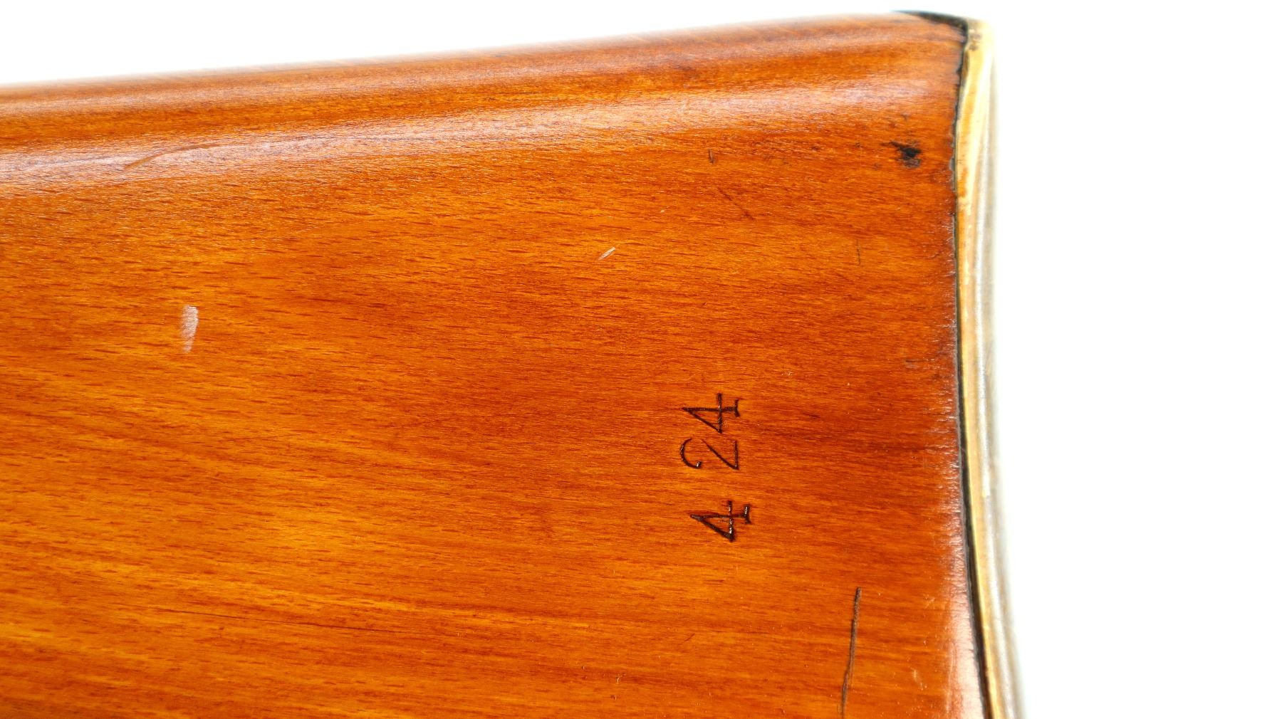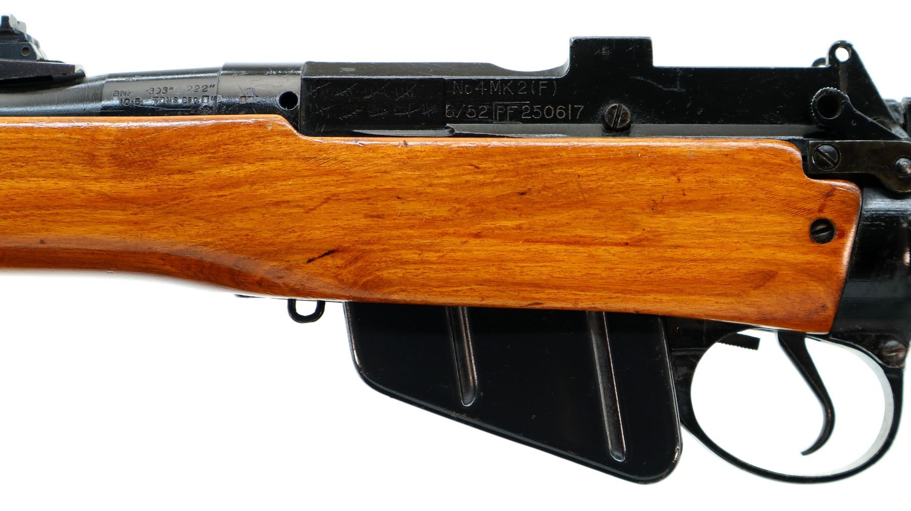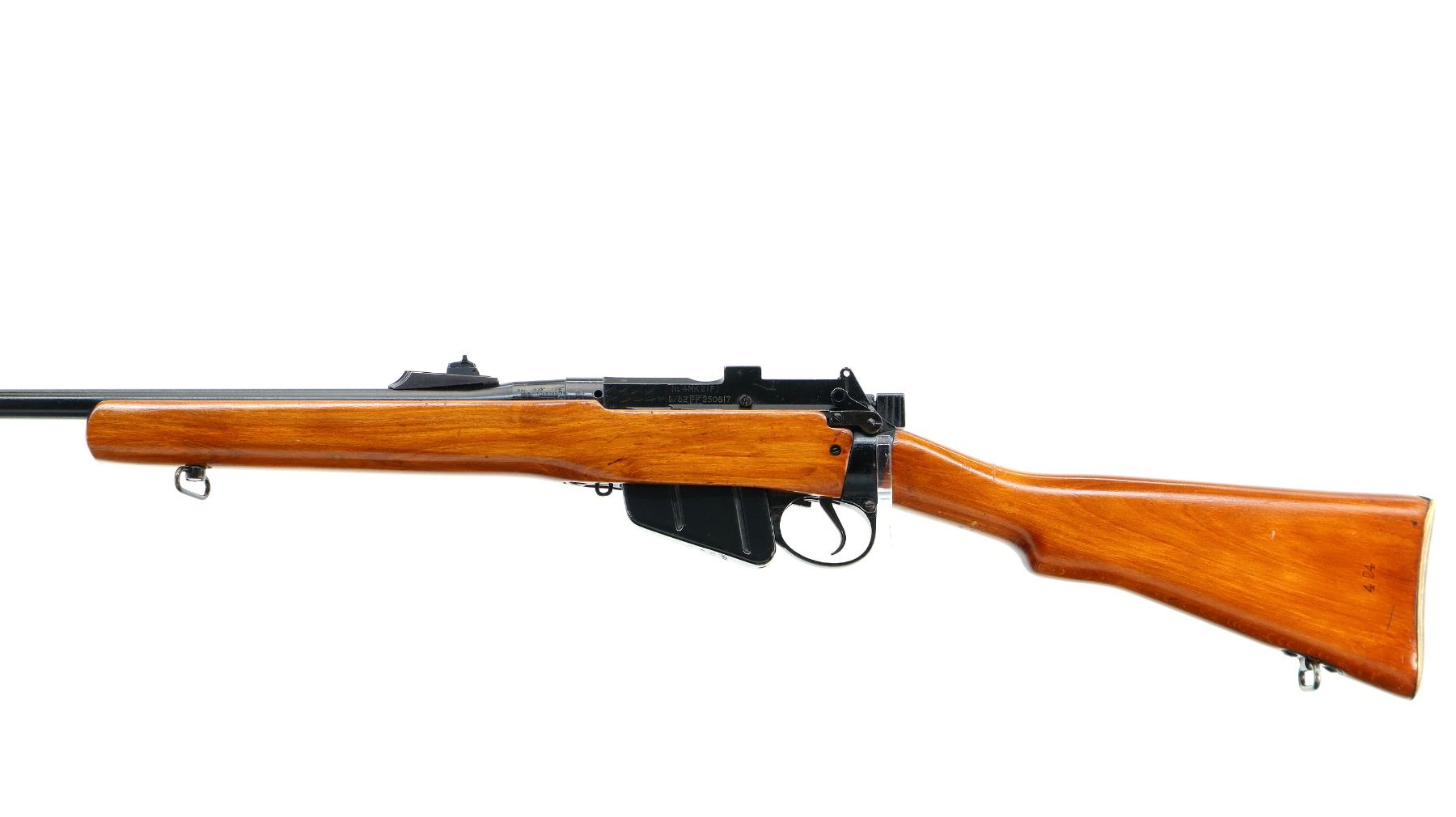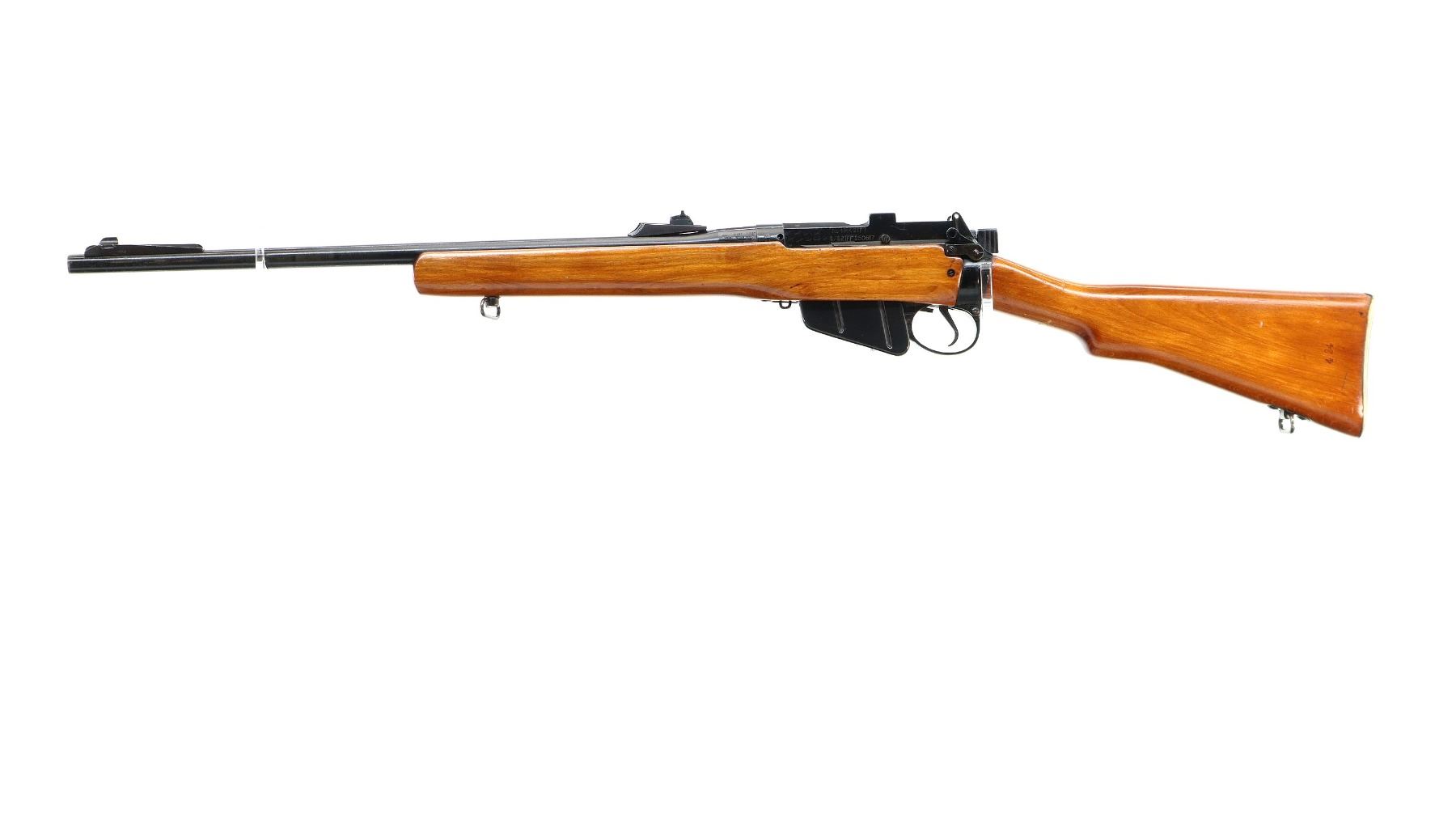 Main Description: Manufactured by Fazakerley 8/52, bolt matches. Blade front sight with ramp, adjustable u notched rear sight, black painted metal finish, left side of receiver has 45 hash marks etched into it. Two piece sporterized wood stocks, pistol grip, smooth brass butt plate with trap, sling swivels.