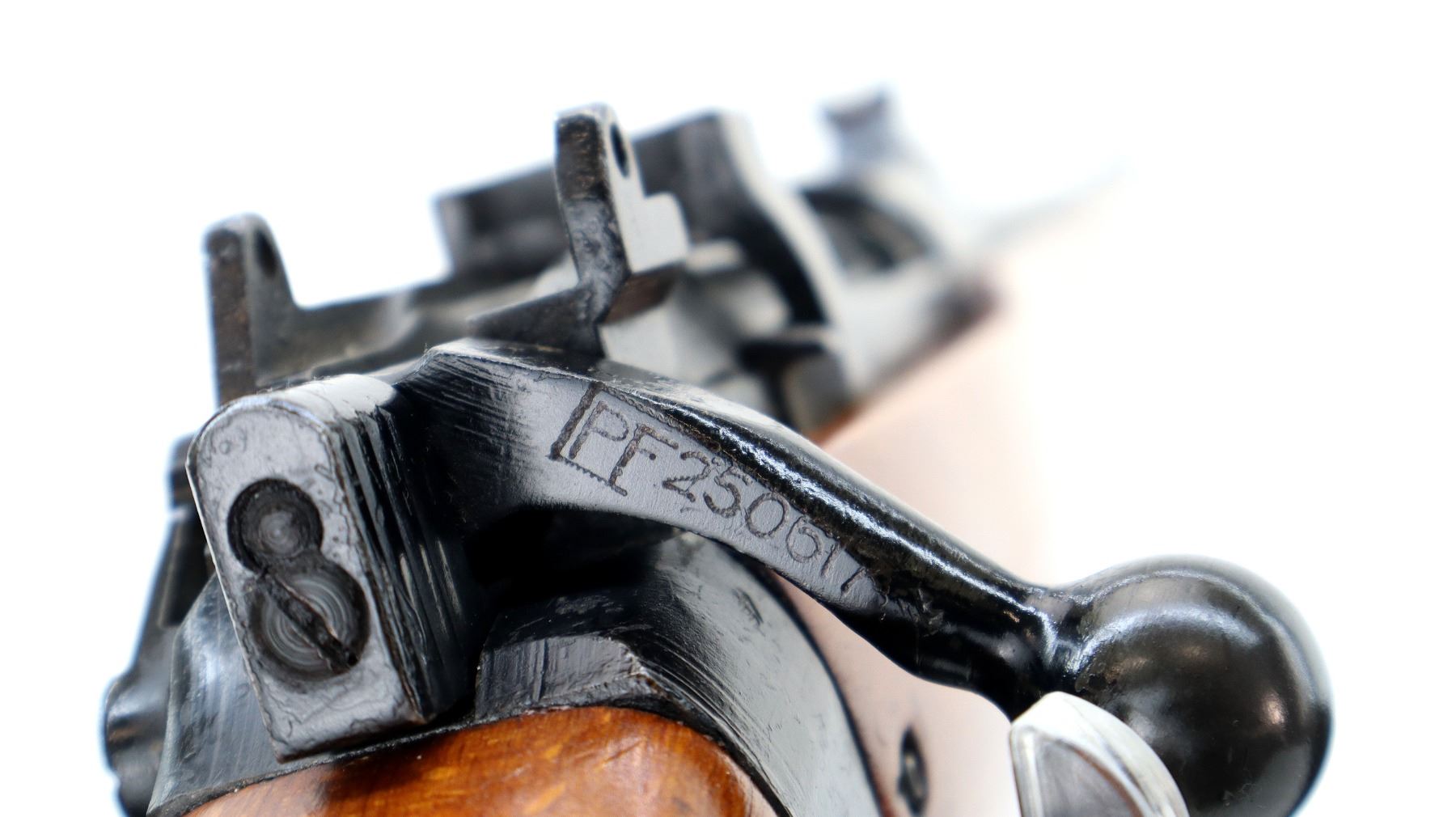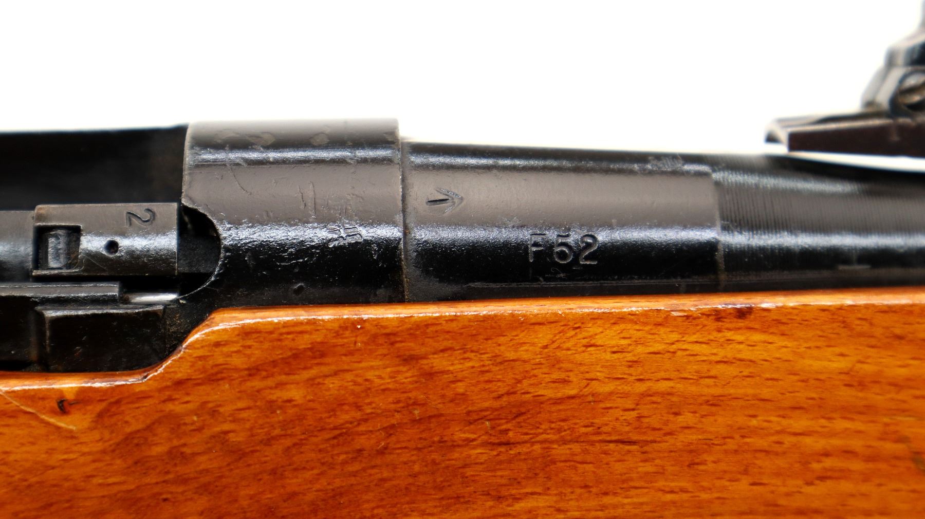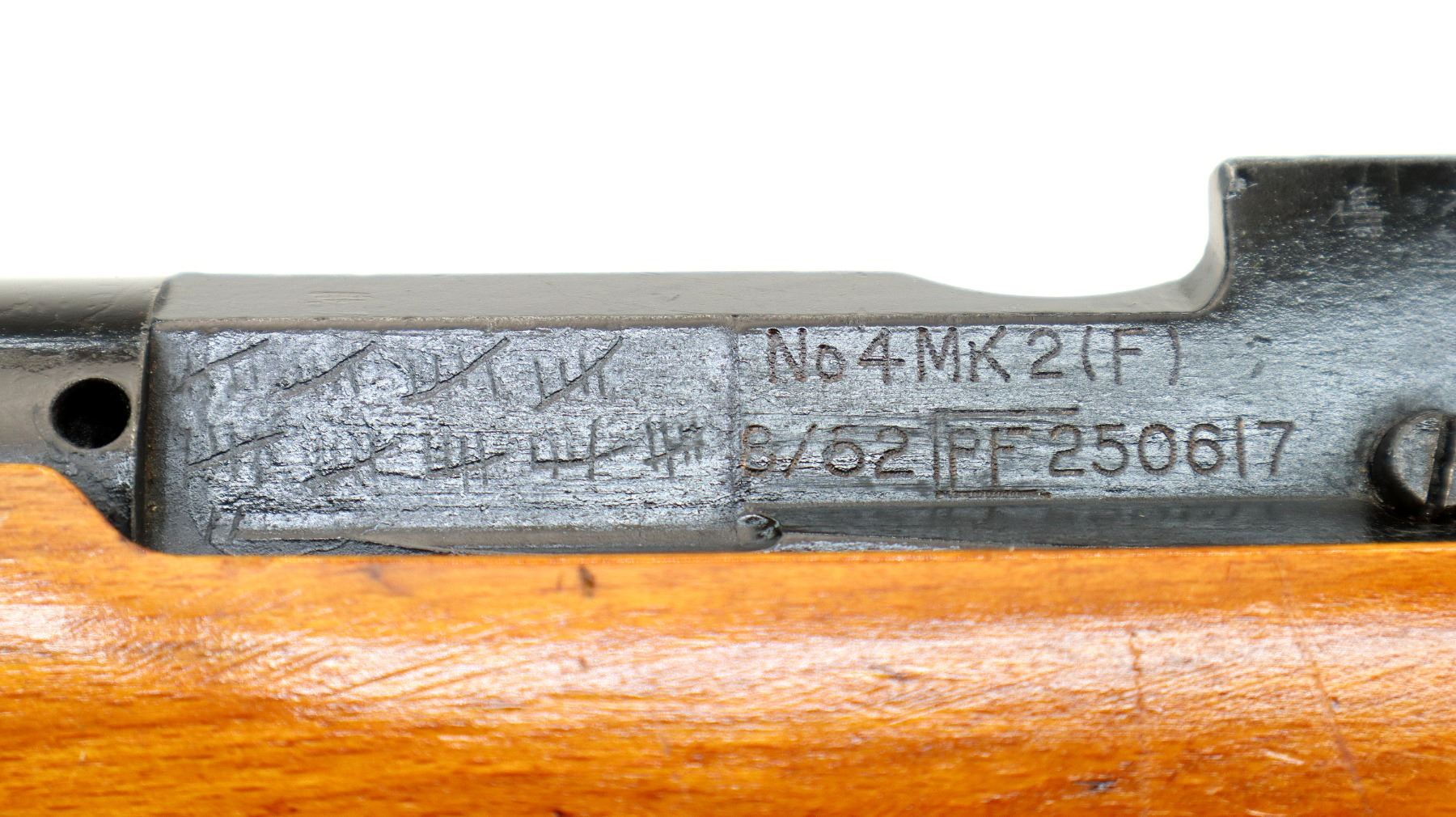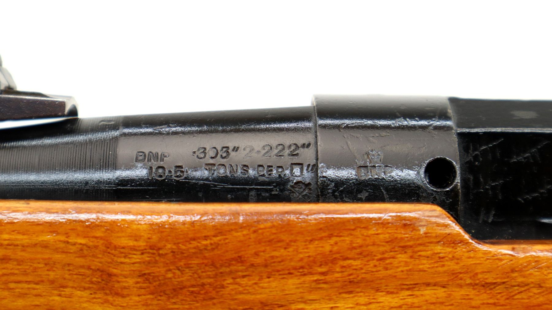 Main Description: Manufactured by Fazakerley 8/52, bolt matches. Blade front sight with ramp, adjustable u notched rear sight, black painted metal finish, left side of receiver has 45 hash marks etched into it. Two piece sporterized wood stocks, pistol grip, smooth brass butt plate with trap, sling swivels.
