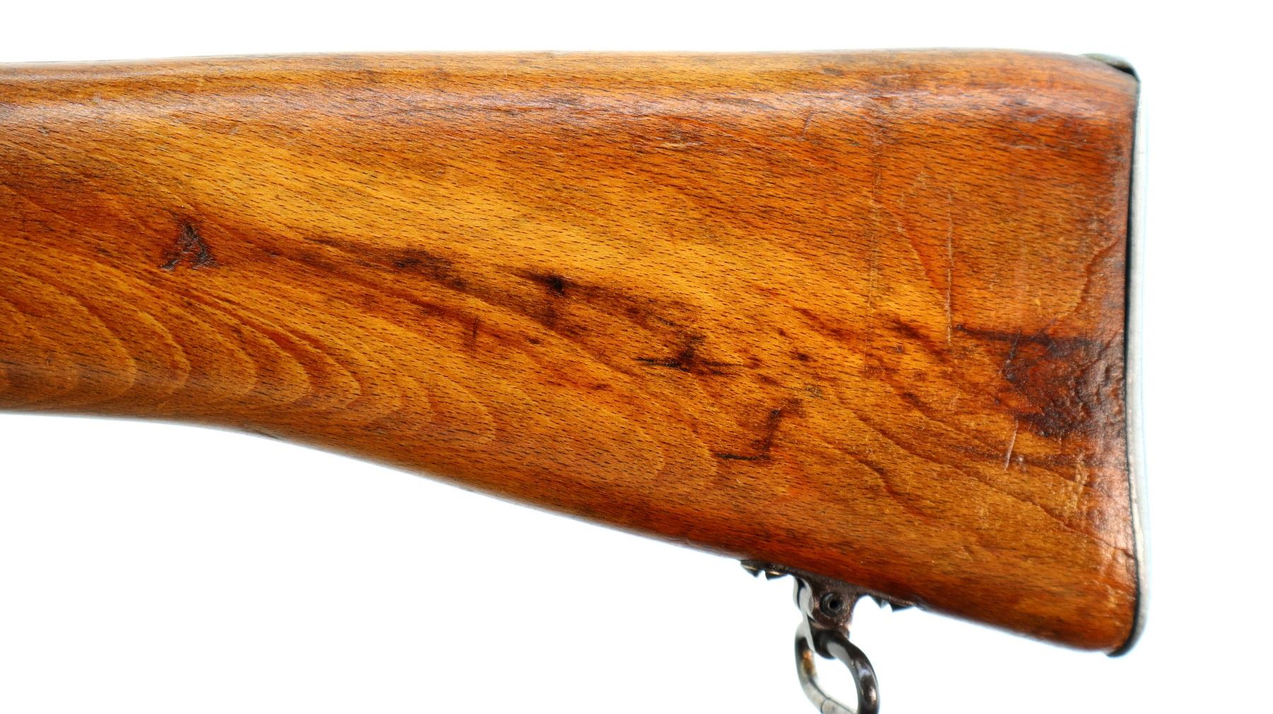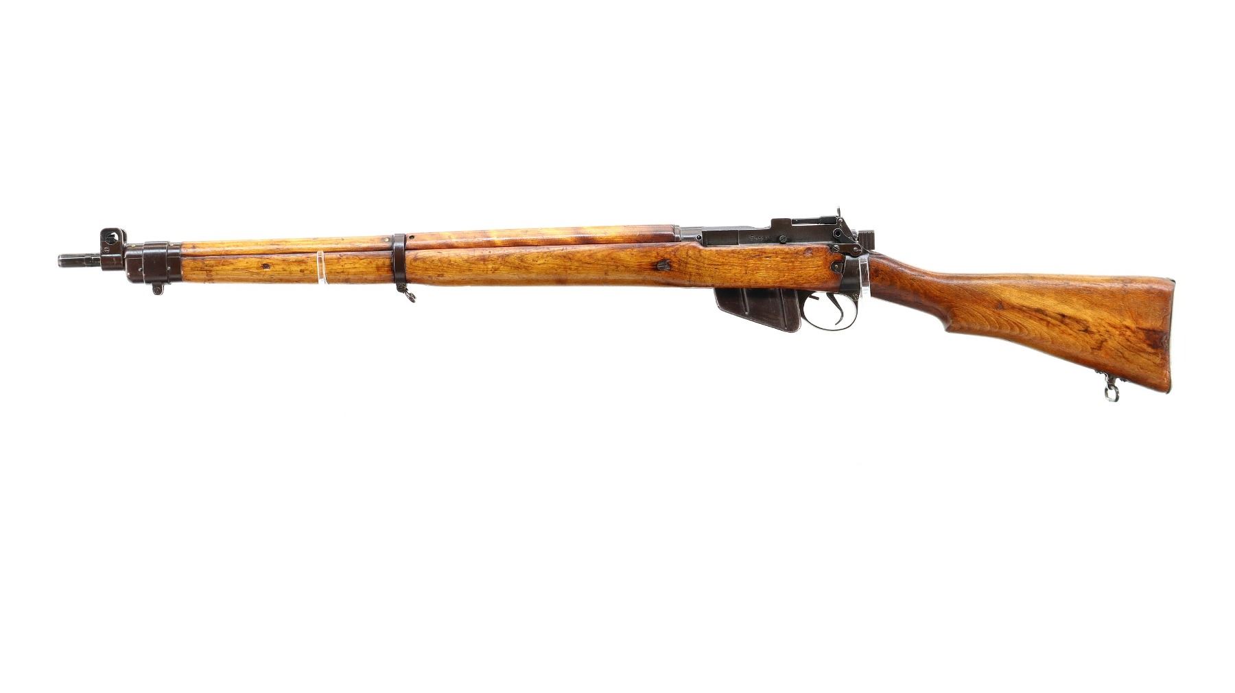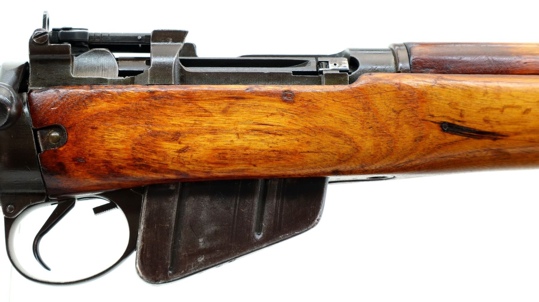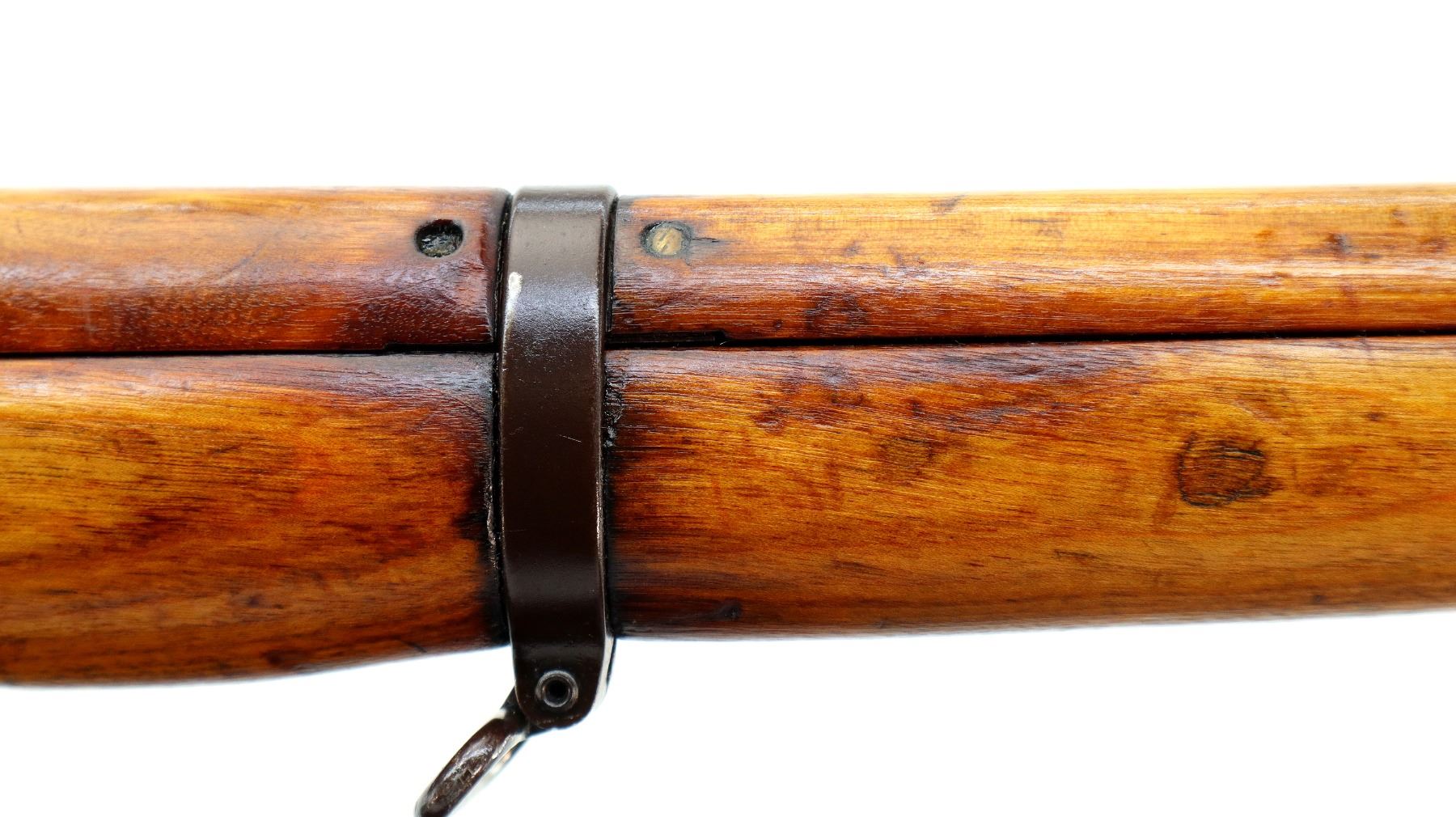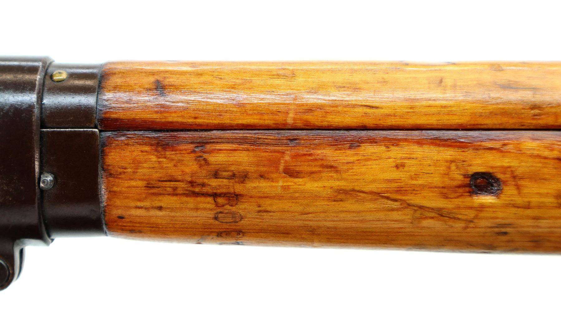 Main Description: Manufactured by Savage, bolt and forend match magazine does not. Blade front sight with ears and ramp, adjustable stamped rear peep sight, receiver marked US Property. Four piece full military wood stocks, forearm has Ishapore screw, pistol grip, smooth grey alloy butt plate with trap, sling swivels, bayonet lug.