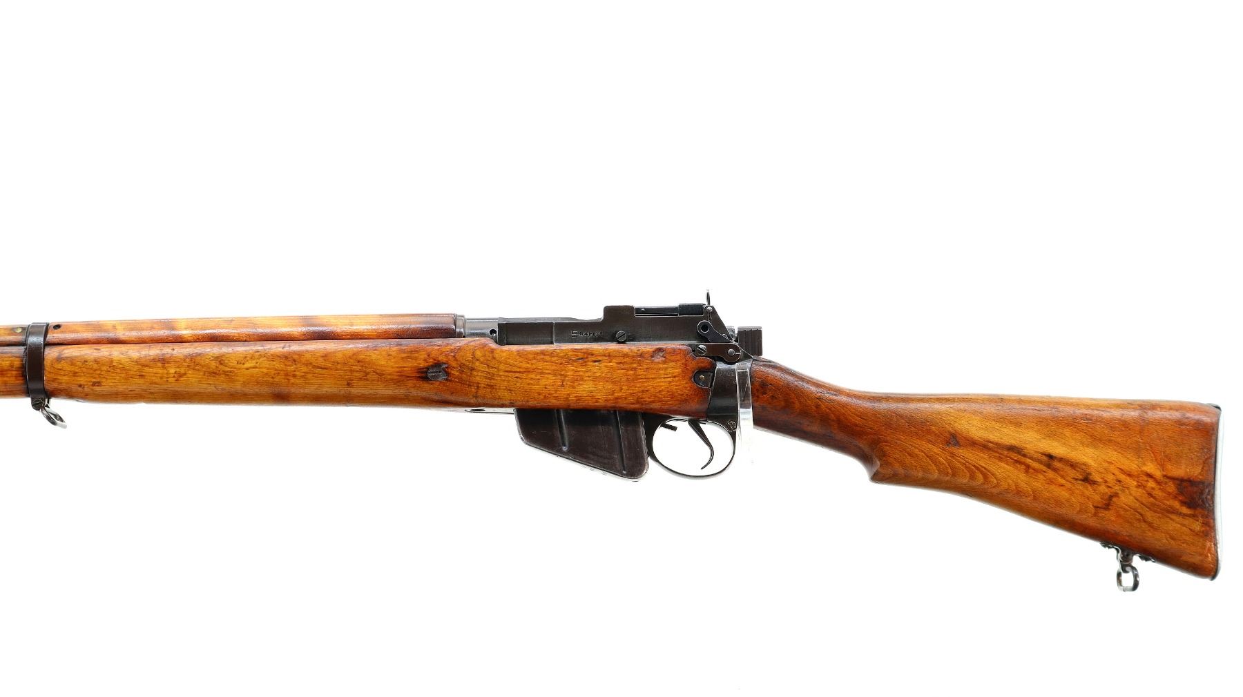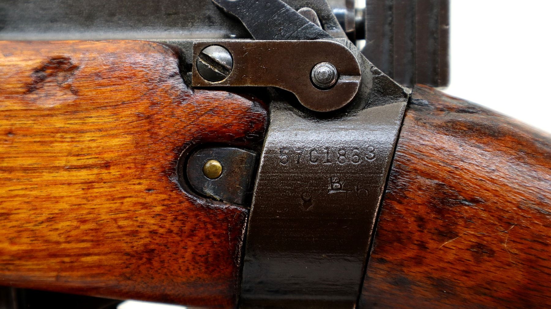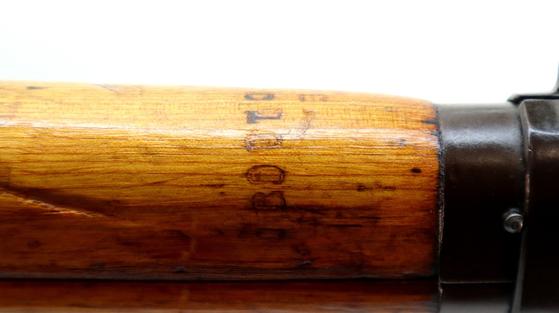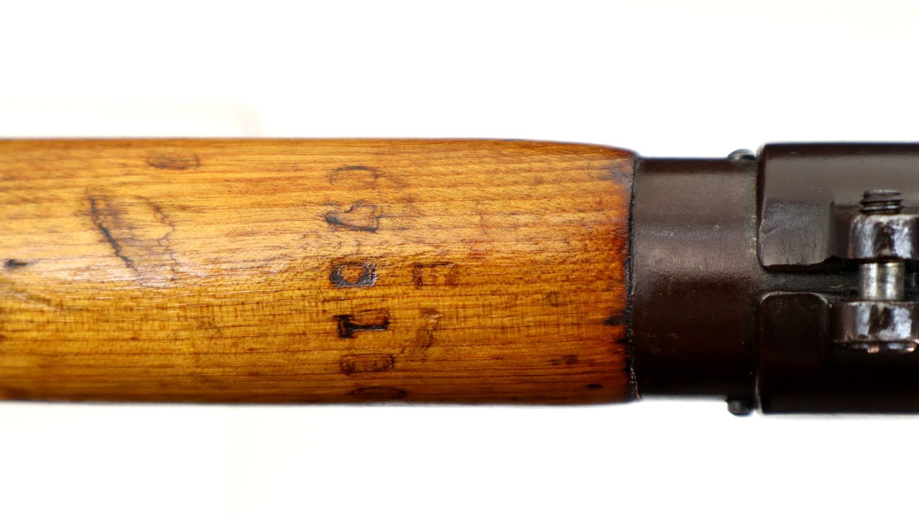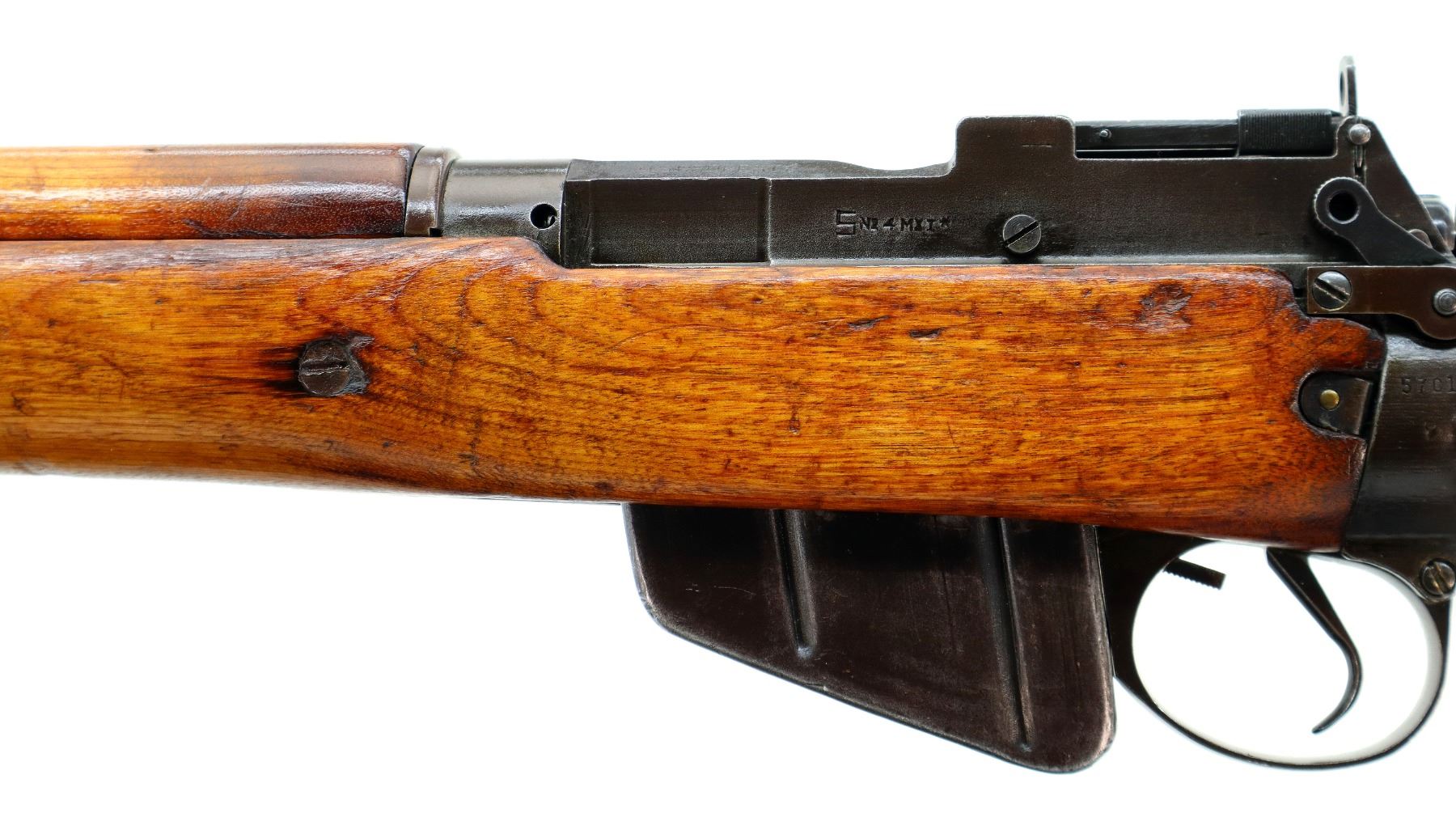 Main Description: Manufactured by Savage, bolt and forend match magazine does not. Blade front sight with ears and ramp, adjustable stamped rear peep sight, receiver marked US Property. Four piece full military wood stocks, forearm has Ishapore screw, pistol grip, smooth grey alloy butt plate with trap, sling swivels, bayonet lug.