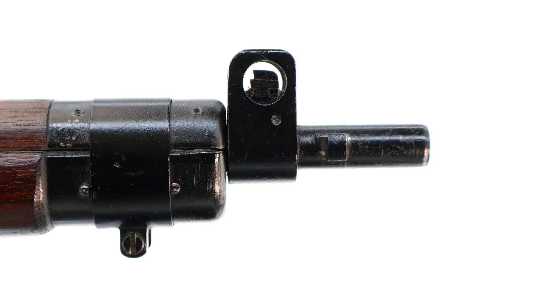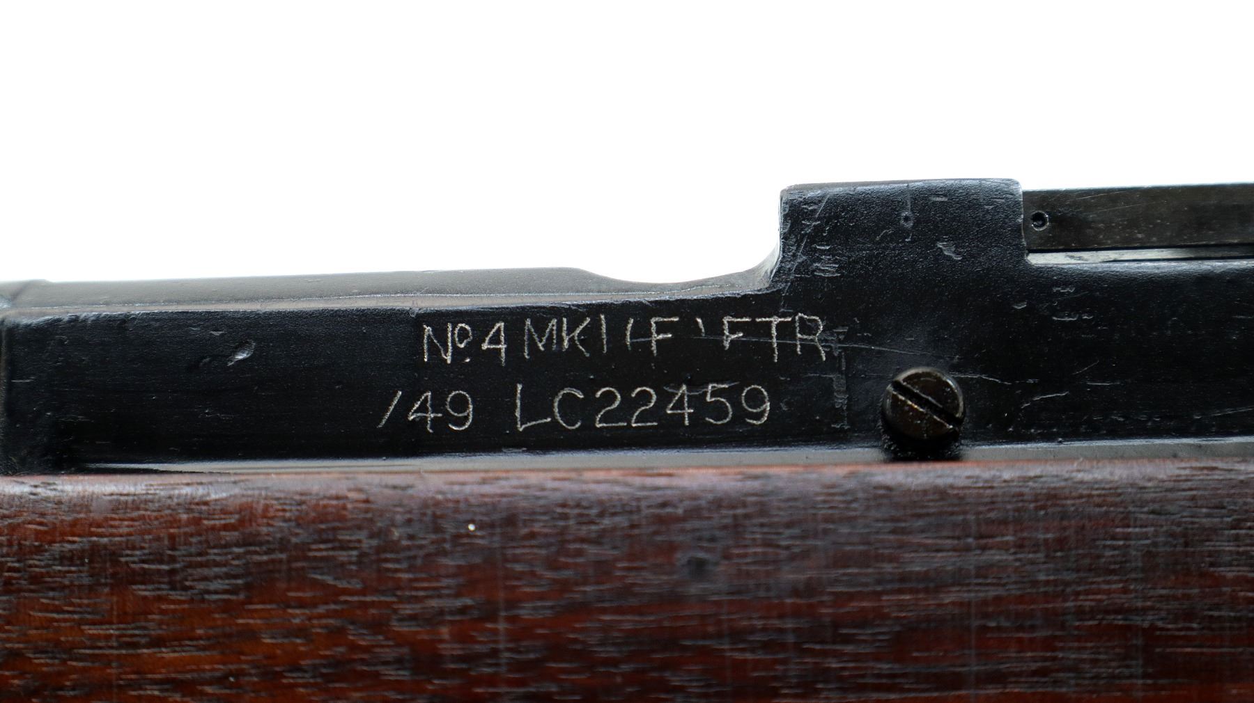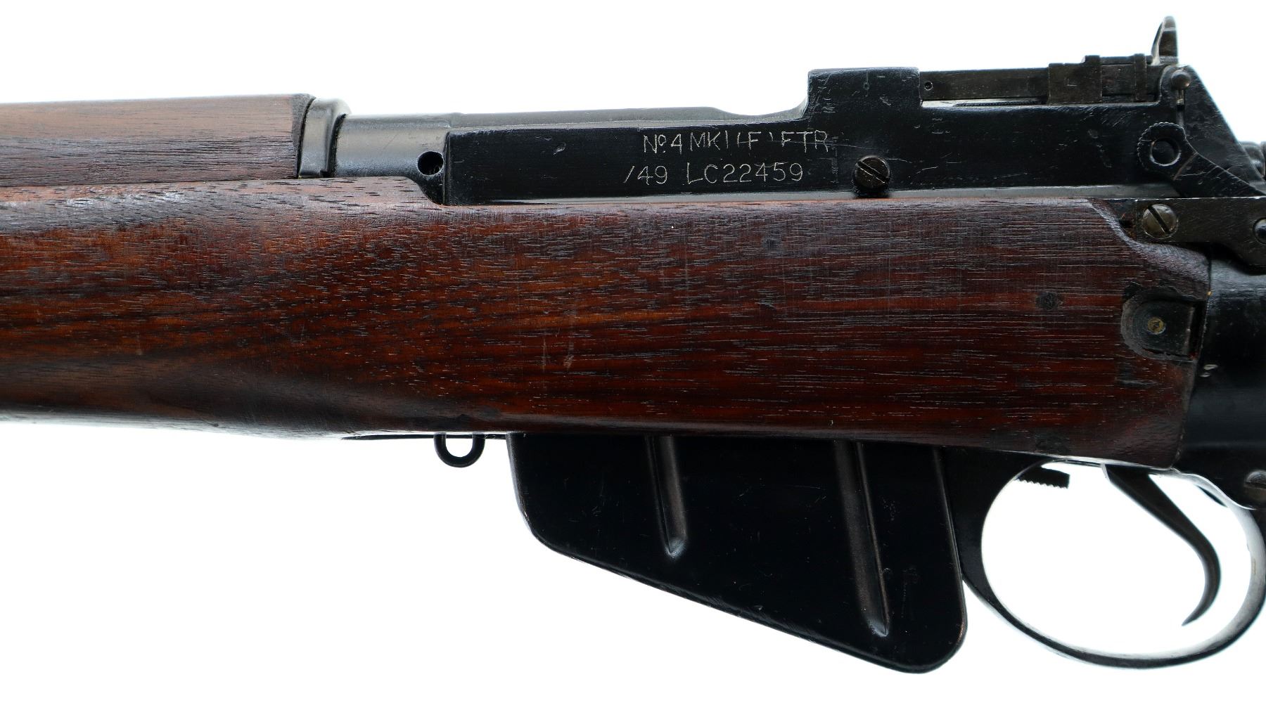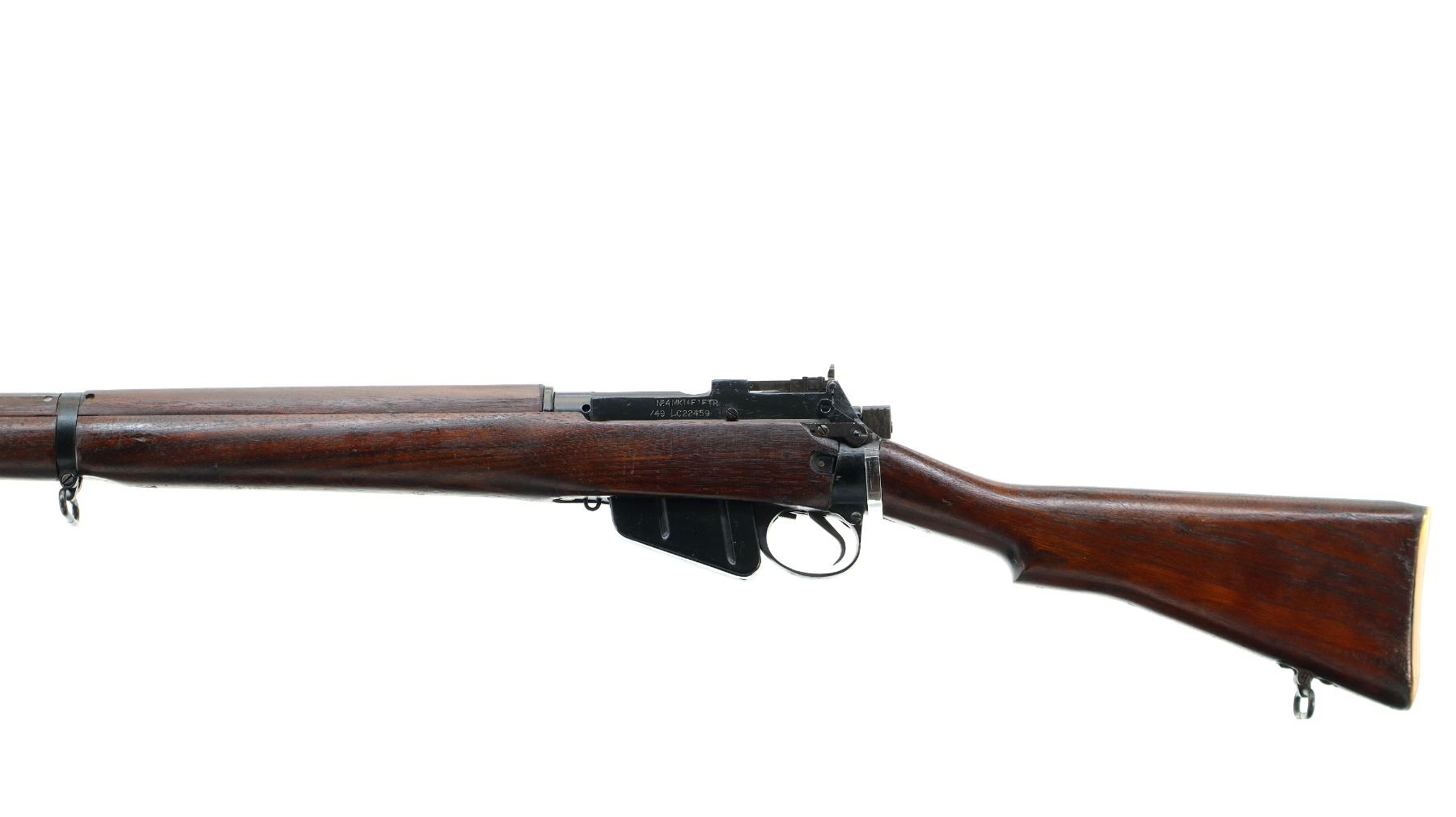 Main Description: Manufactured by Fazakerley 1949, visible numbers match. Blade front sight with ears and ramp, adjustable milled rear peep sight. Four piece full military wood stocks, pistol grip, smooth brass butt plate with trap, sling swivels, bayonet lugs.