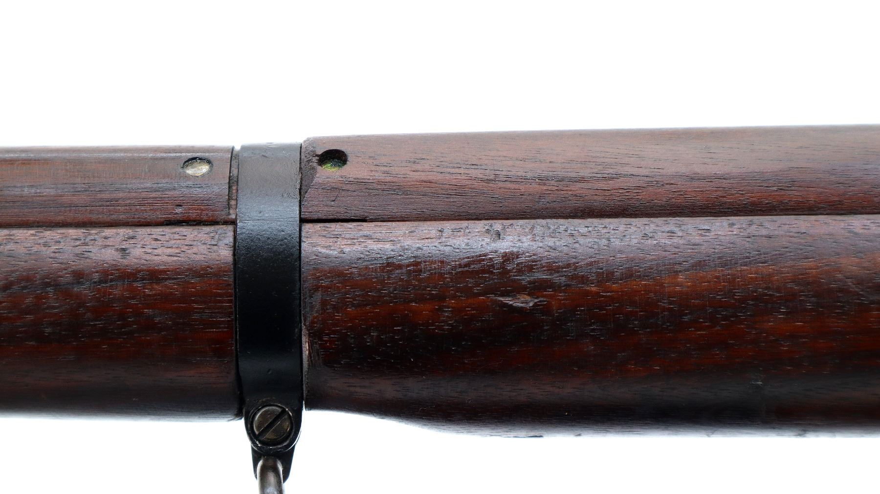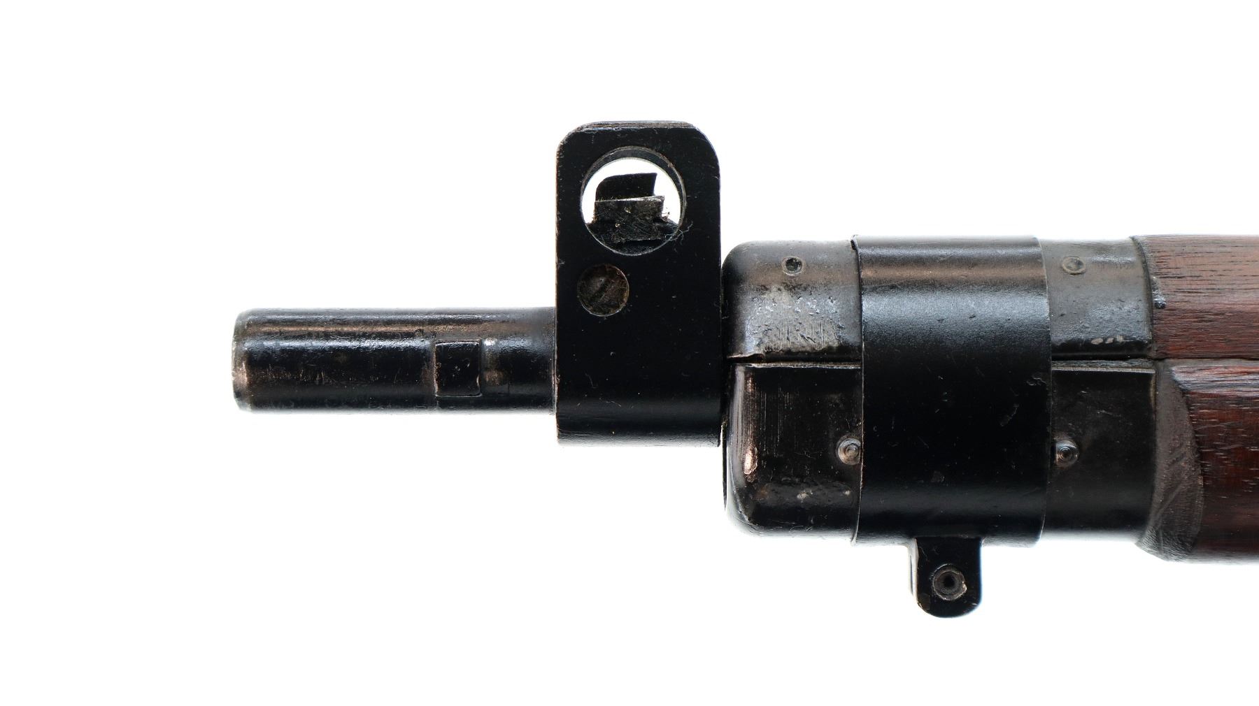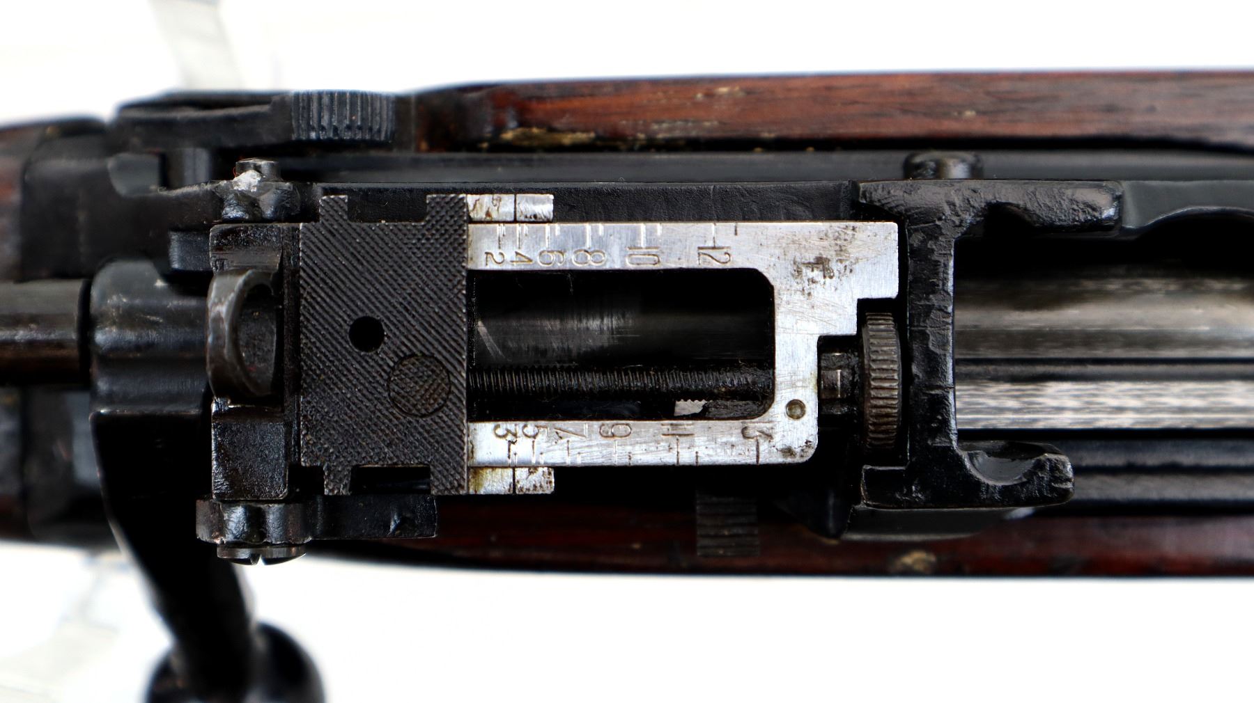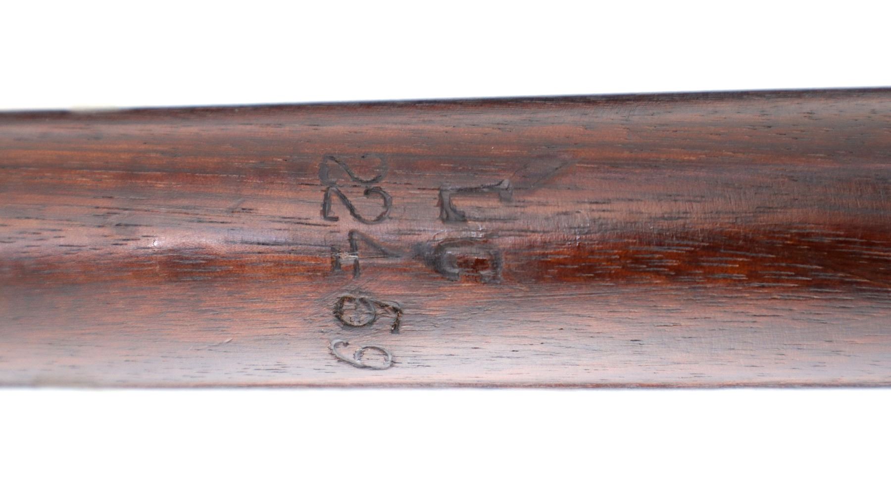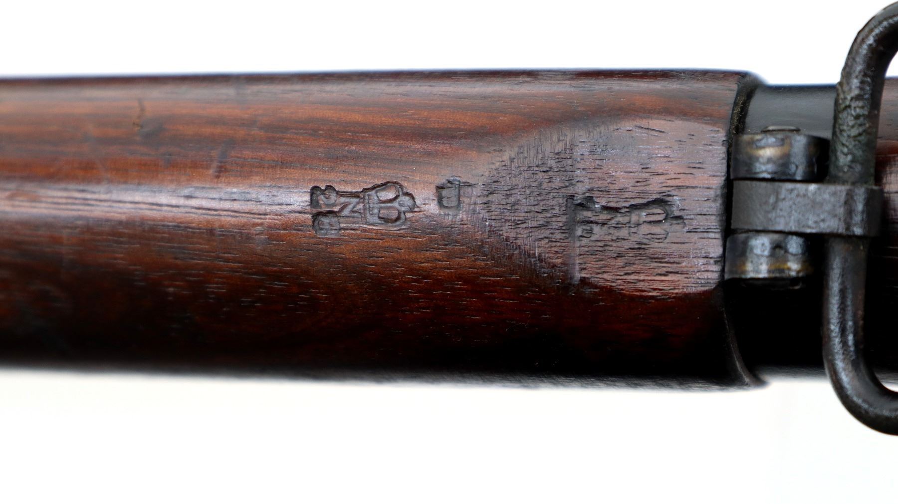 Main Description: Manufactured by Fazakerley 1949, visible numbers match. Blade front sight with ears and ramp, adjustable milled rear peep sight. Four piece full military wood stocks, pistol grip, smooth brass butt plate with trap, sling swivels, bayonet lugs.