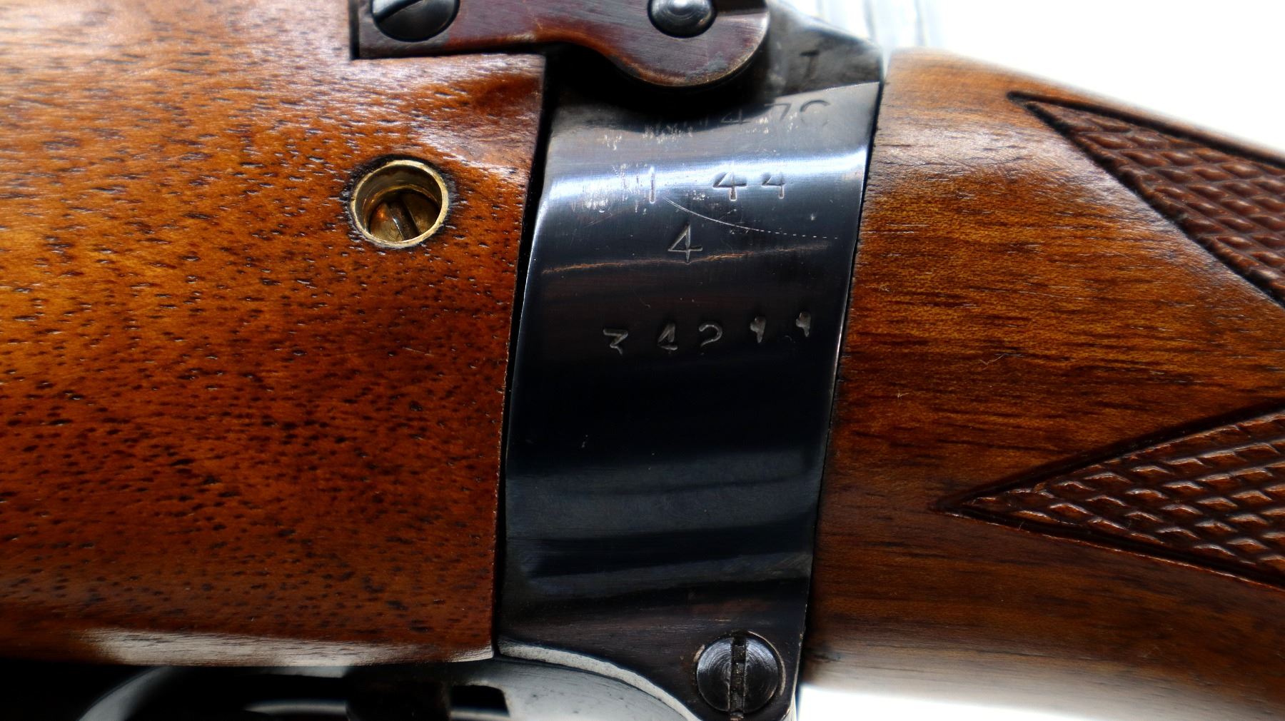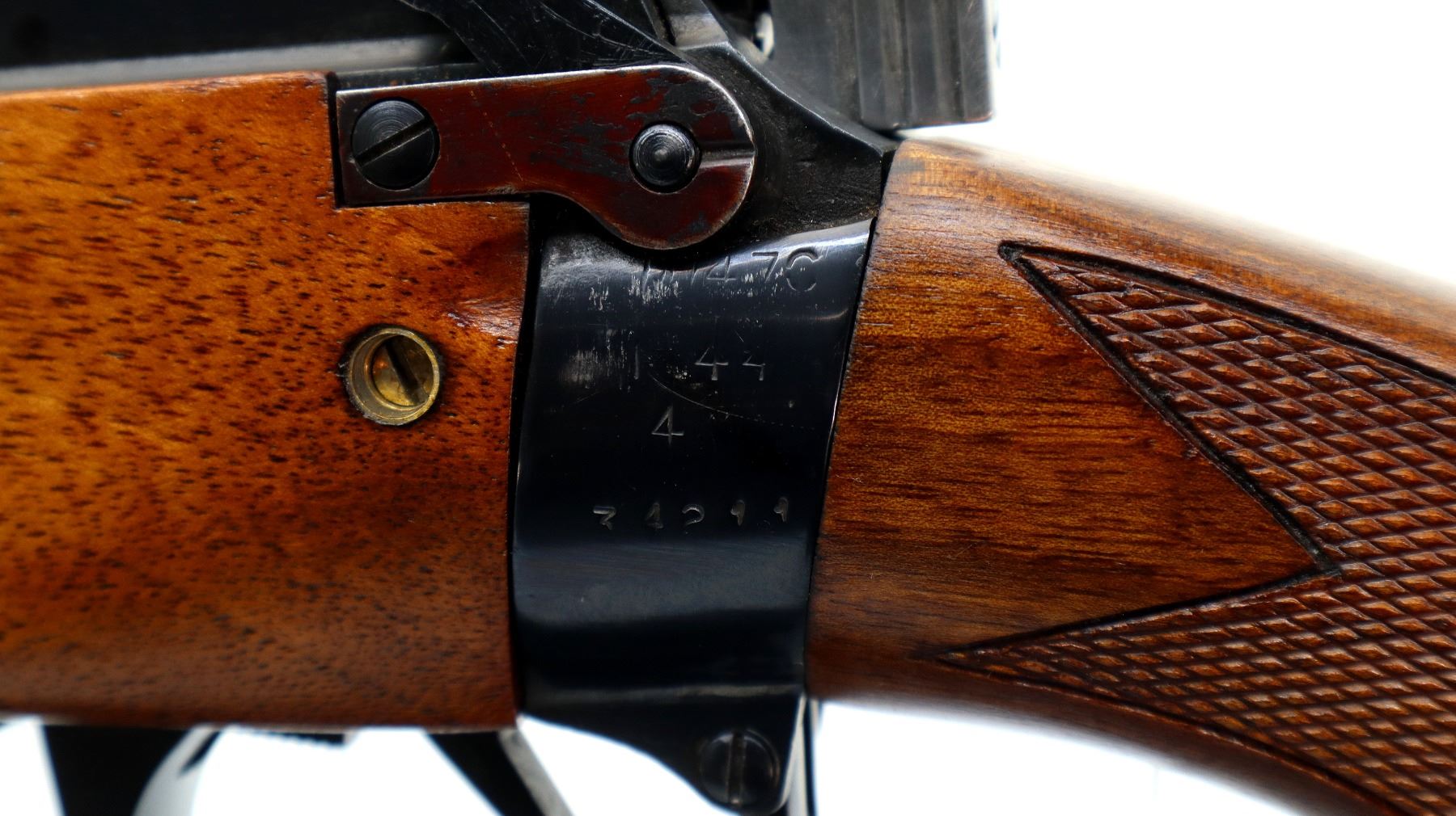 Main Description: Manufactured by M47C 1944, bolt unnumbered. Blade front sight with hood and ramp, adjustable milled rear peeps sight, metal has been polished and reblued, receiver ring drilled and tapped with plug screws installed. Two piece Monte Carlo wood stocks, checkered forearm, pistol grip, black polymer butt plate, cheek rest, grip cap, sling swivels.