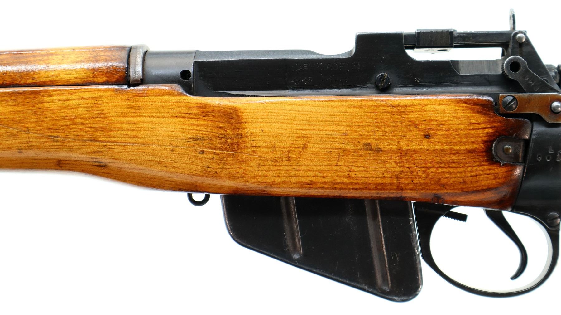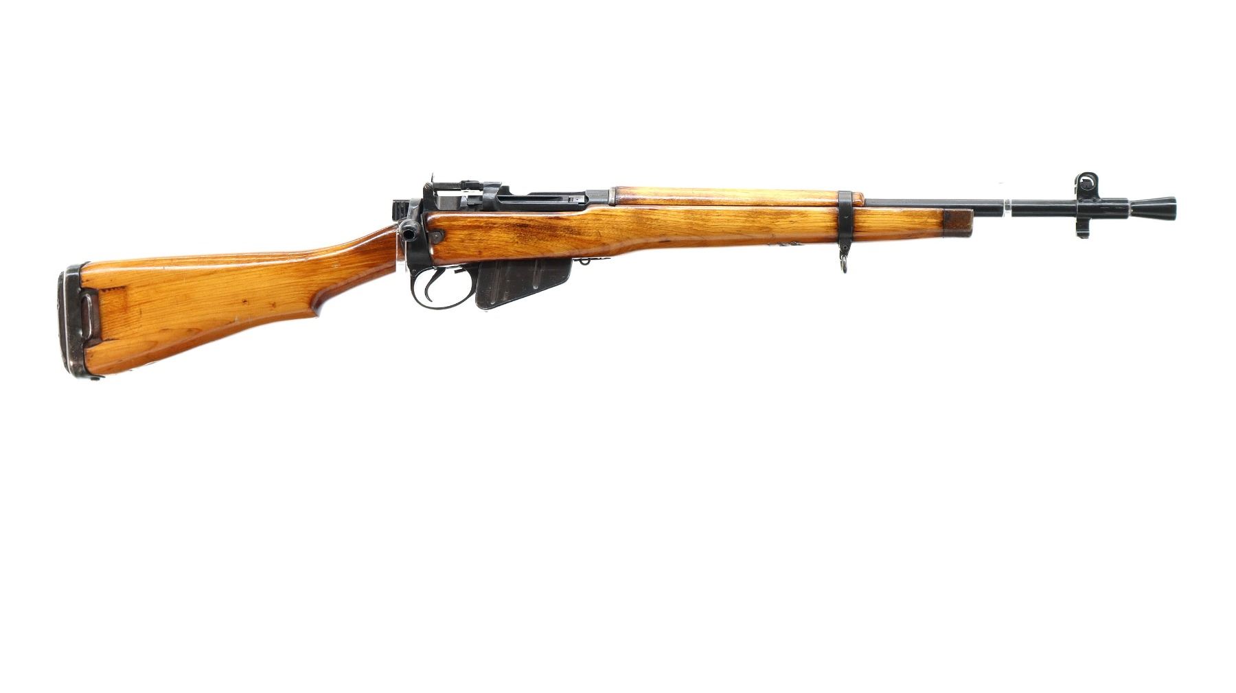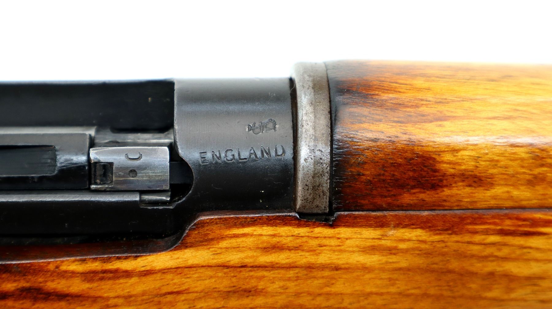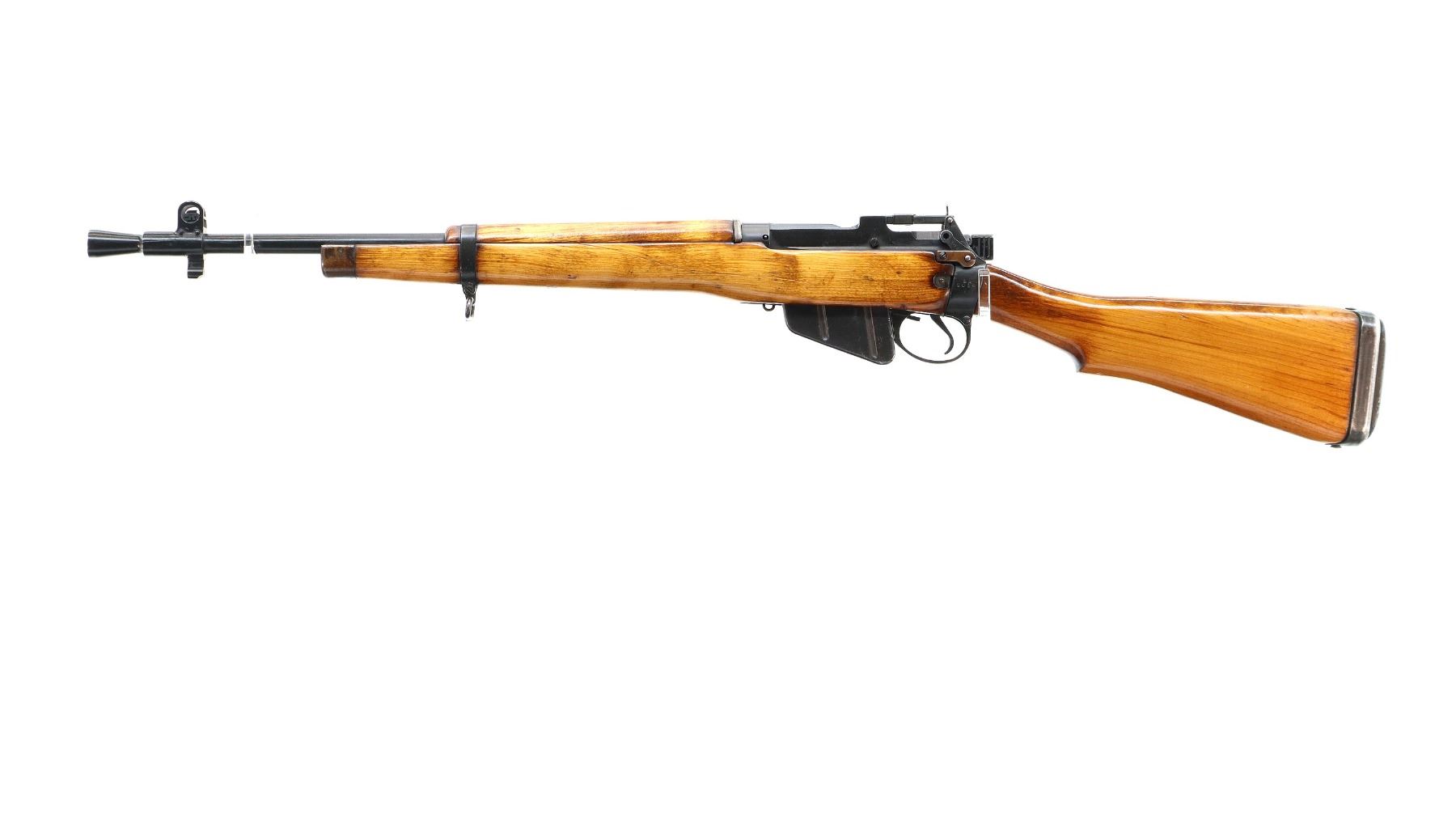 Main Description: Manufactured by Fazakerley 4/45, bolt unnumbered. Blade front sight with ears and ramp, adjustable stamped MK2 rear peep sight, black painted metal finish. Three piece full military wood stocks, pistol grip, black rubber recoil pad, sling swivels, flashider with integral bayonet lug.