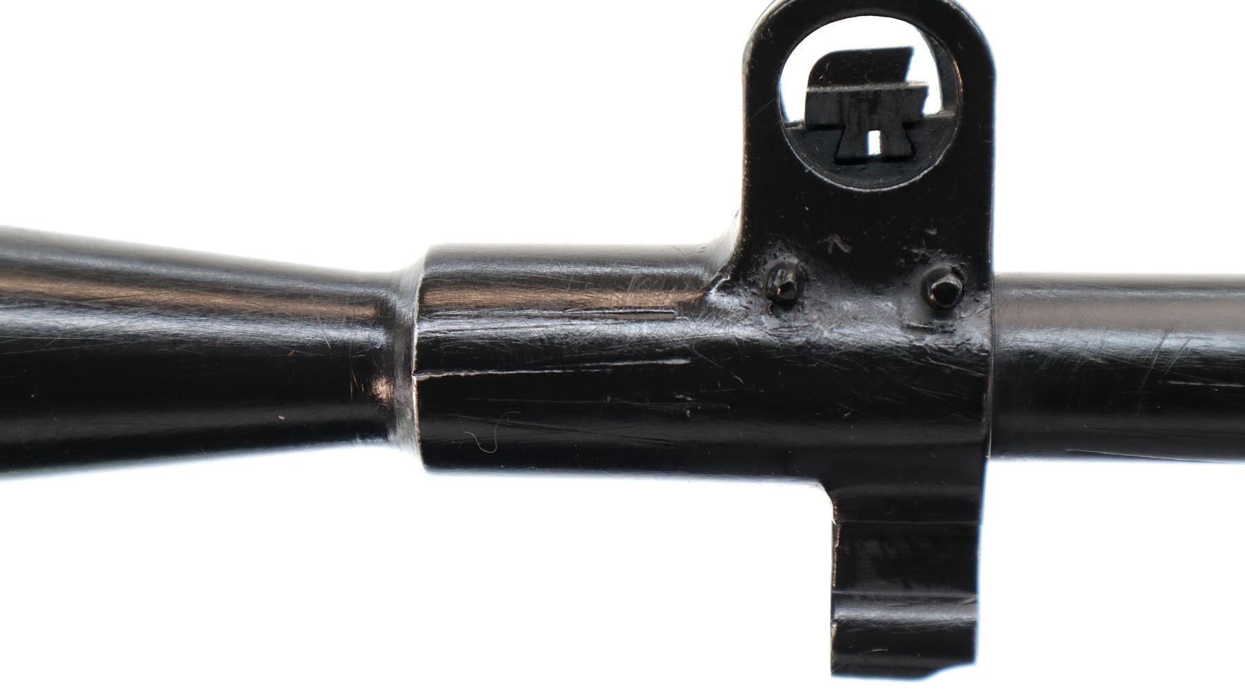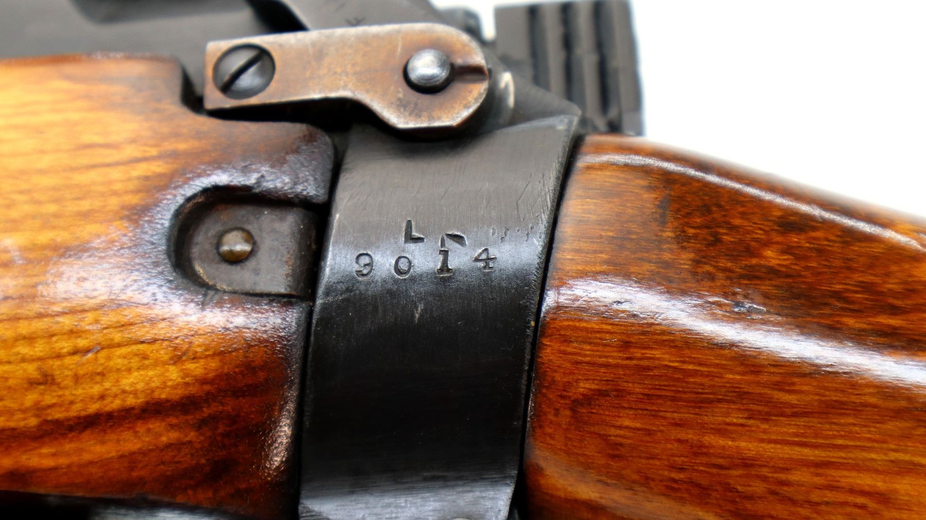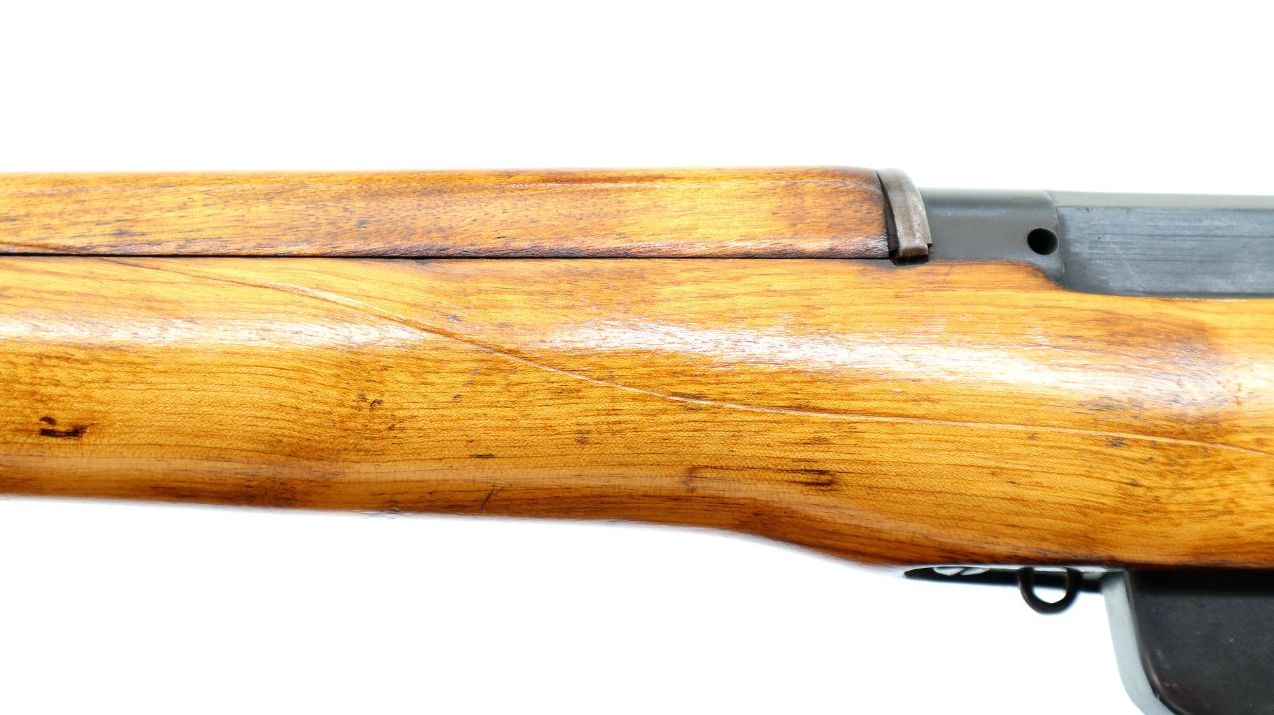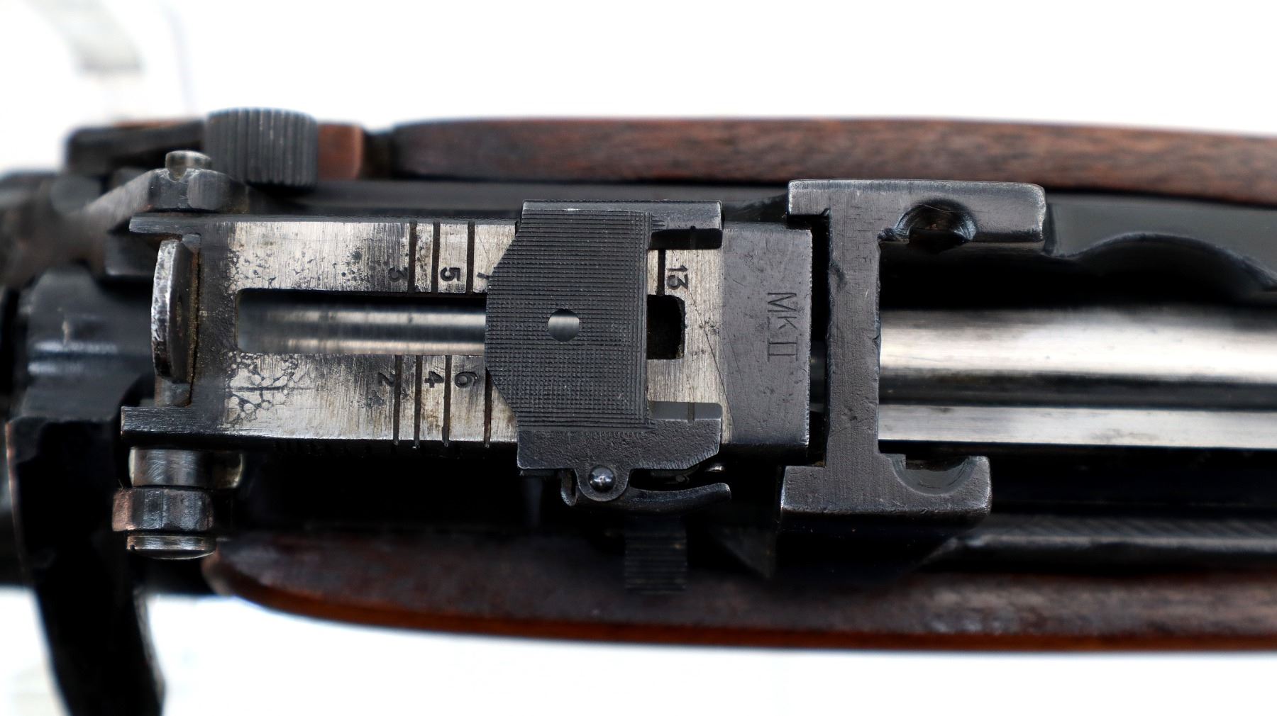 Main Description: Manufactured by Fazakerley 4/45, bolt unnumbered. Blade front sight with ears and ramp, adjustable stamped MK2 rear peep sight, black painted metal finish. Three piece full military wood stocks, pistol grip, black rubber recoil pad, sling swivels, flashider with integral bayonet lug.