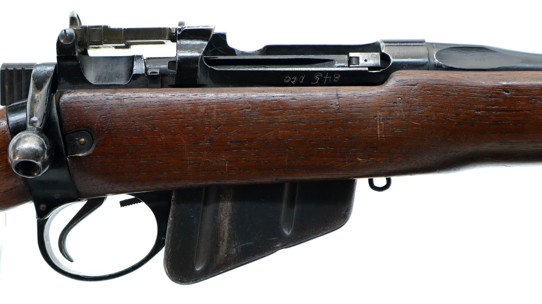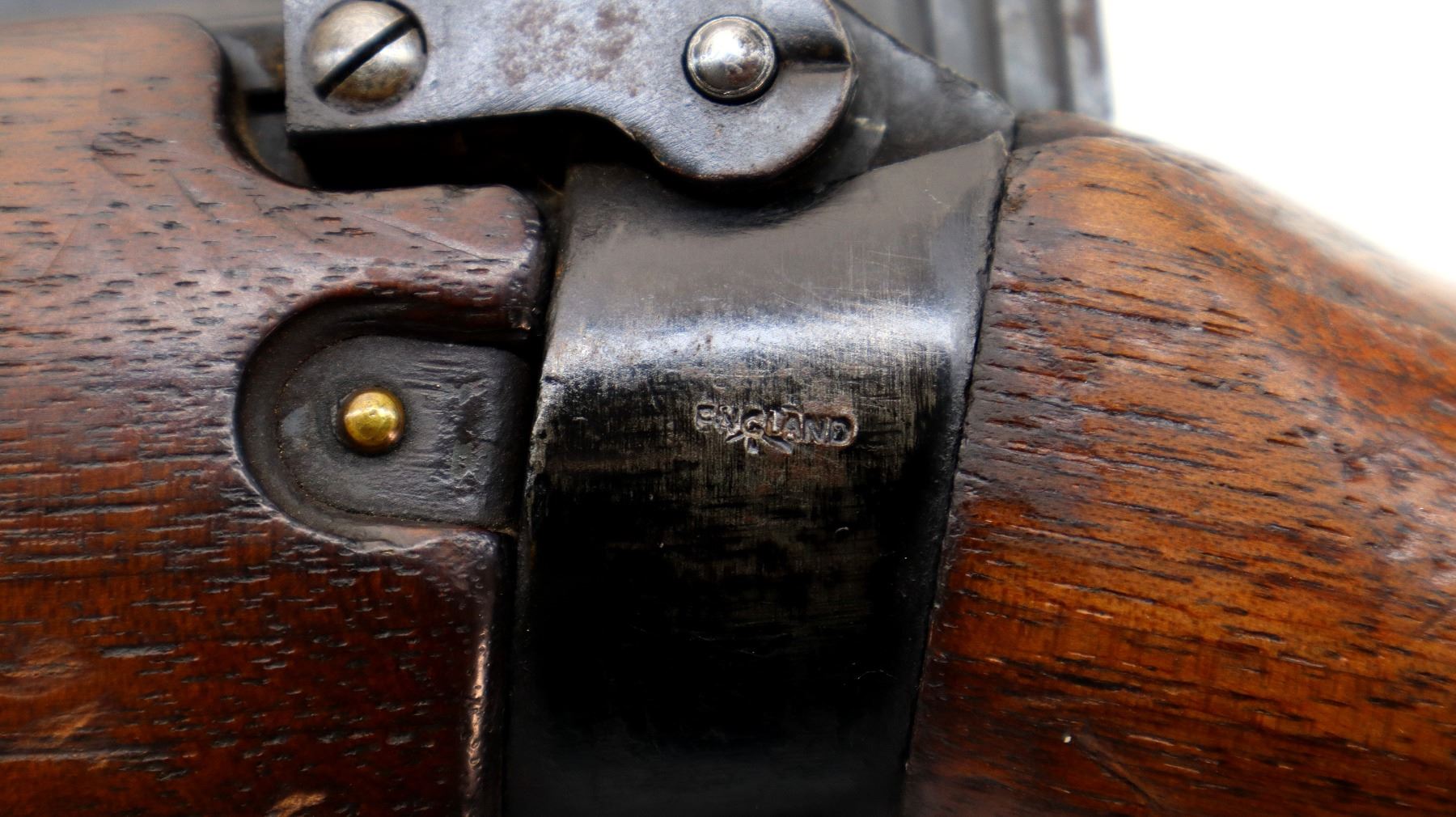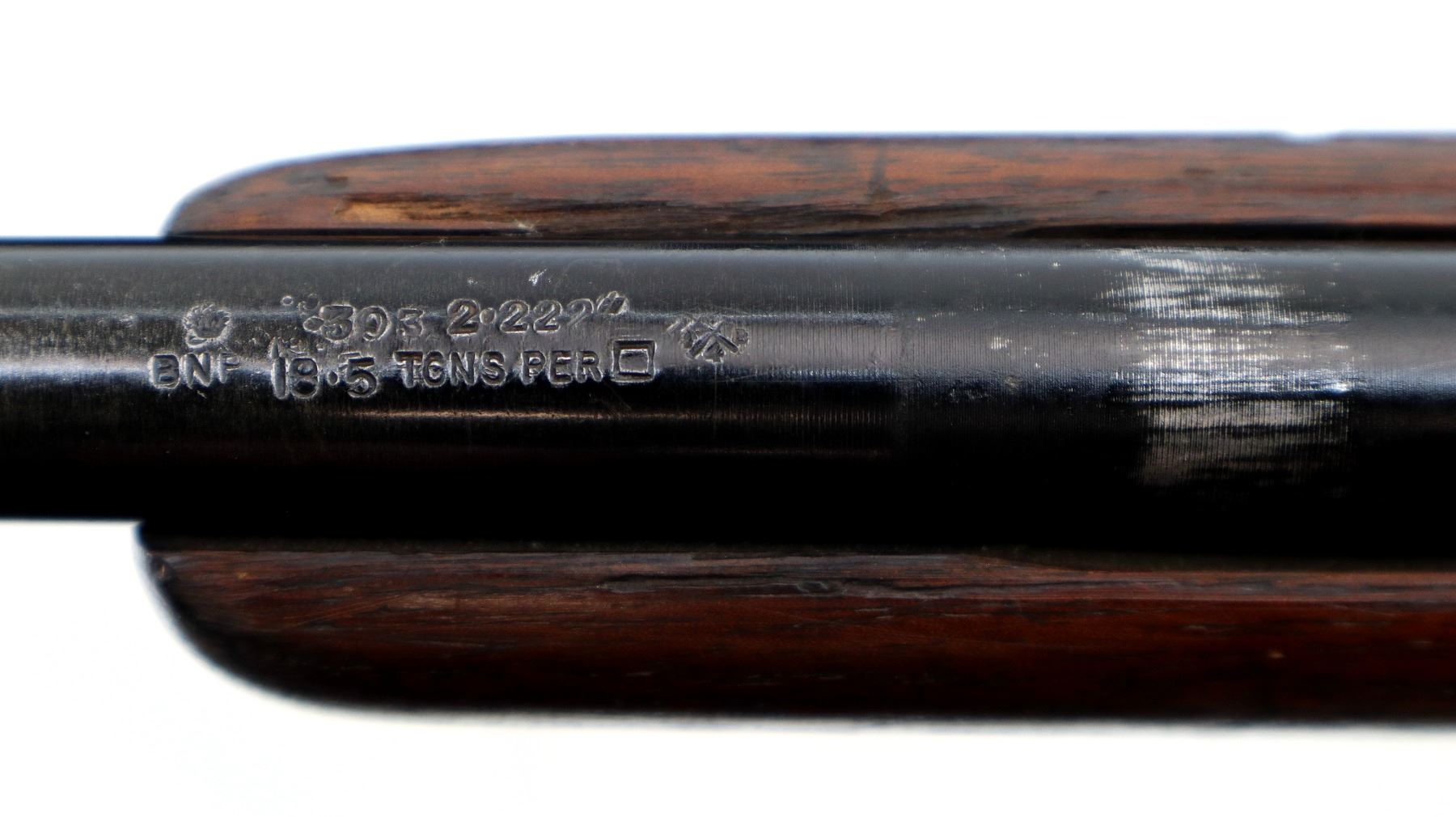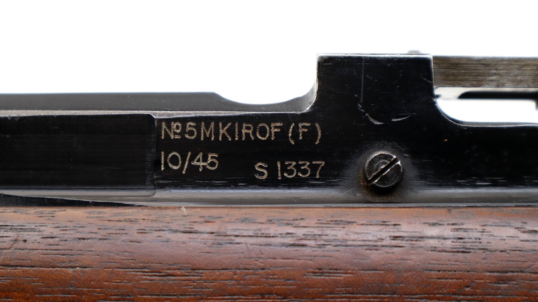 Main Description: Manufactured by Fazakerley 10/45, bolt matches magazine does not. Blade front sight with ears and ramp missing pins, adjustable milled 800 yrd rear peep sight, black painted metal finish. Two piece sporterized wood stocks, forend tip is cracked, modified pistol grip, black rubber recoil pad which is damaged, rear swivel removed mounting screw replaced, missing front swivel holes are present. Flashider and bayonet lug have been removed.