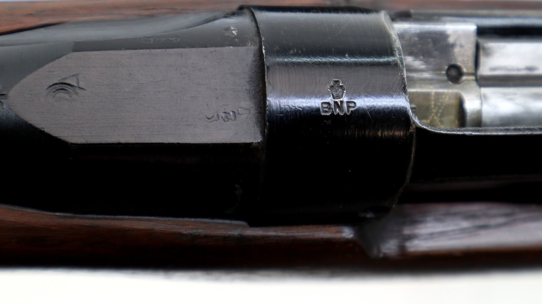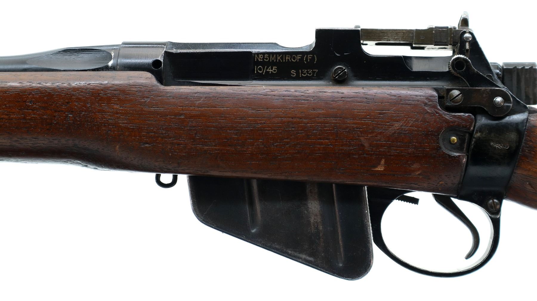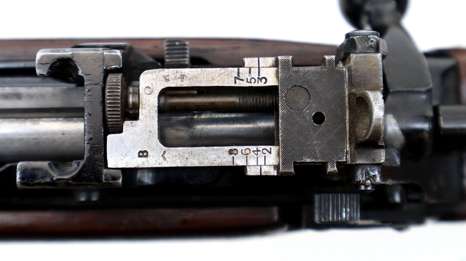 Main Description: Manufactured by Fazakerley 10/45, bolt matches magazine does not. Blade front sight with ears and ramp missing pins, adjustable milled 800 yrd rear peep sight, black painted metal finish. Two piece sporterized wood stocks, forend tip is cracked, modified pistol grip, black rubber recoil pad which is damaged, rear swivel removed mounting screw replaced, missing front swivel holes are present. Flashider and bayonet lug have been removed.