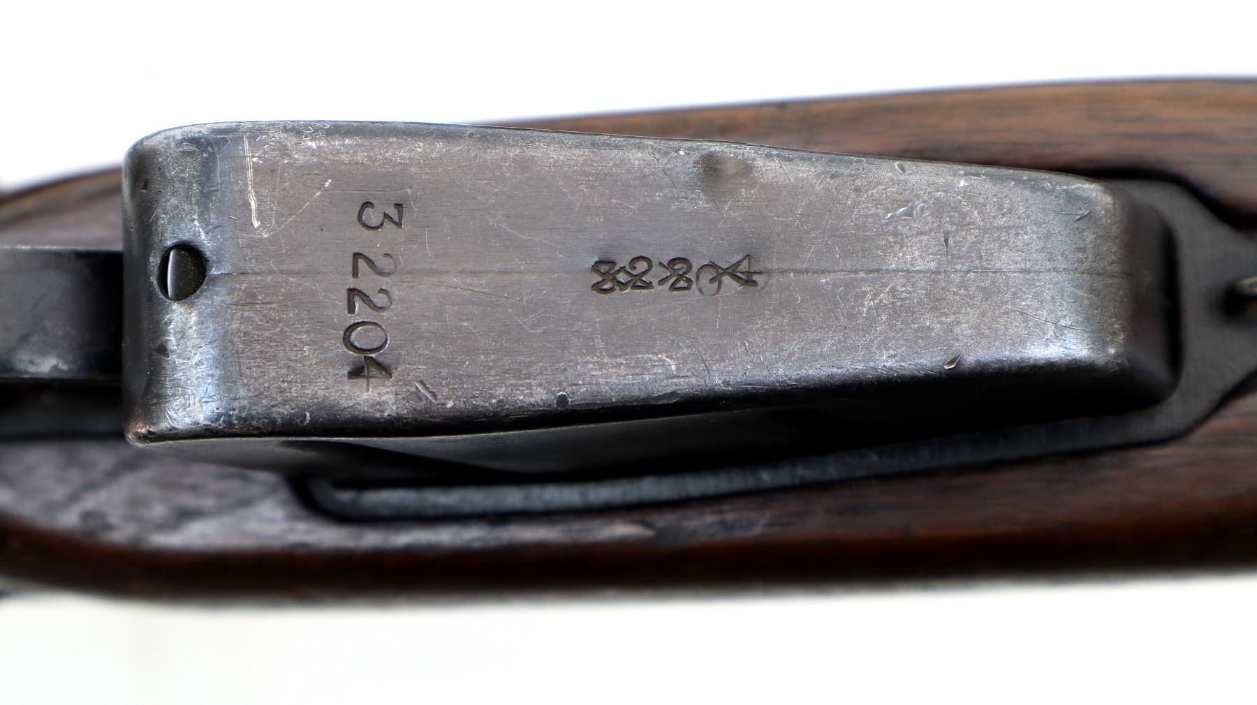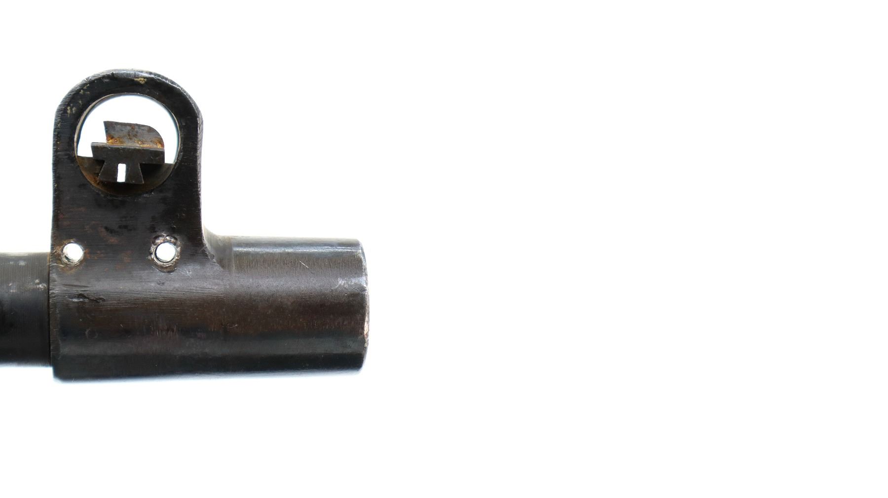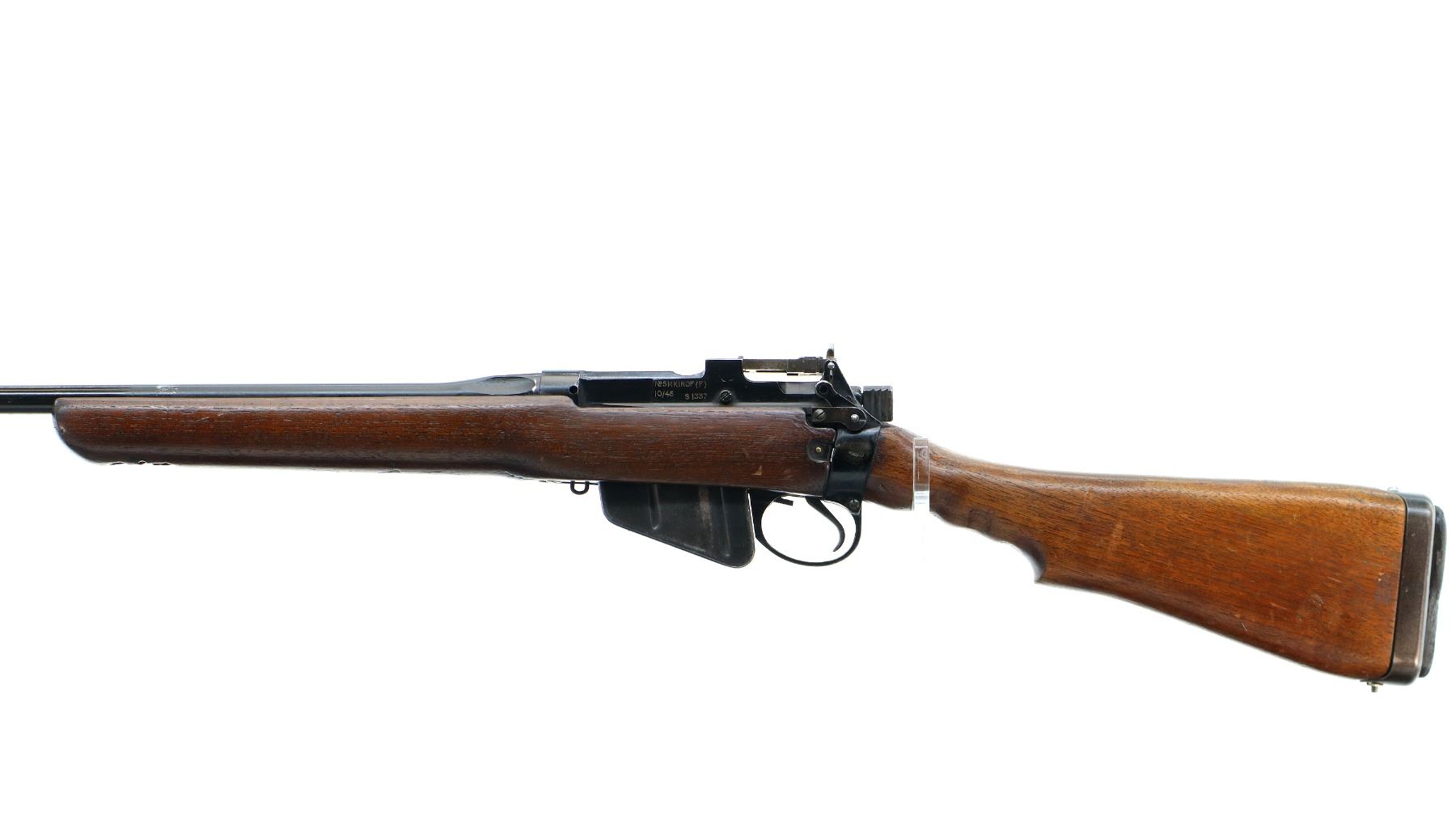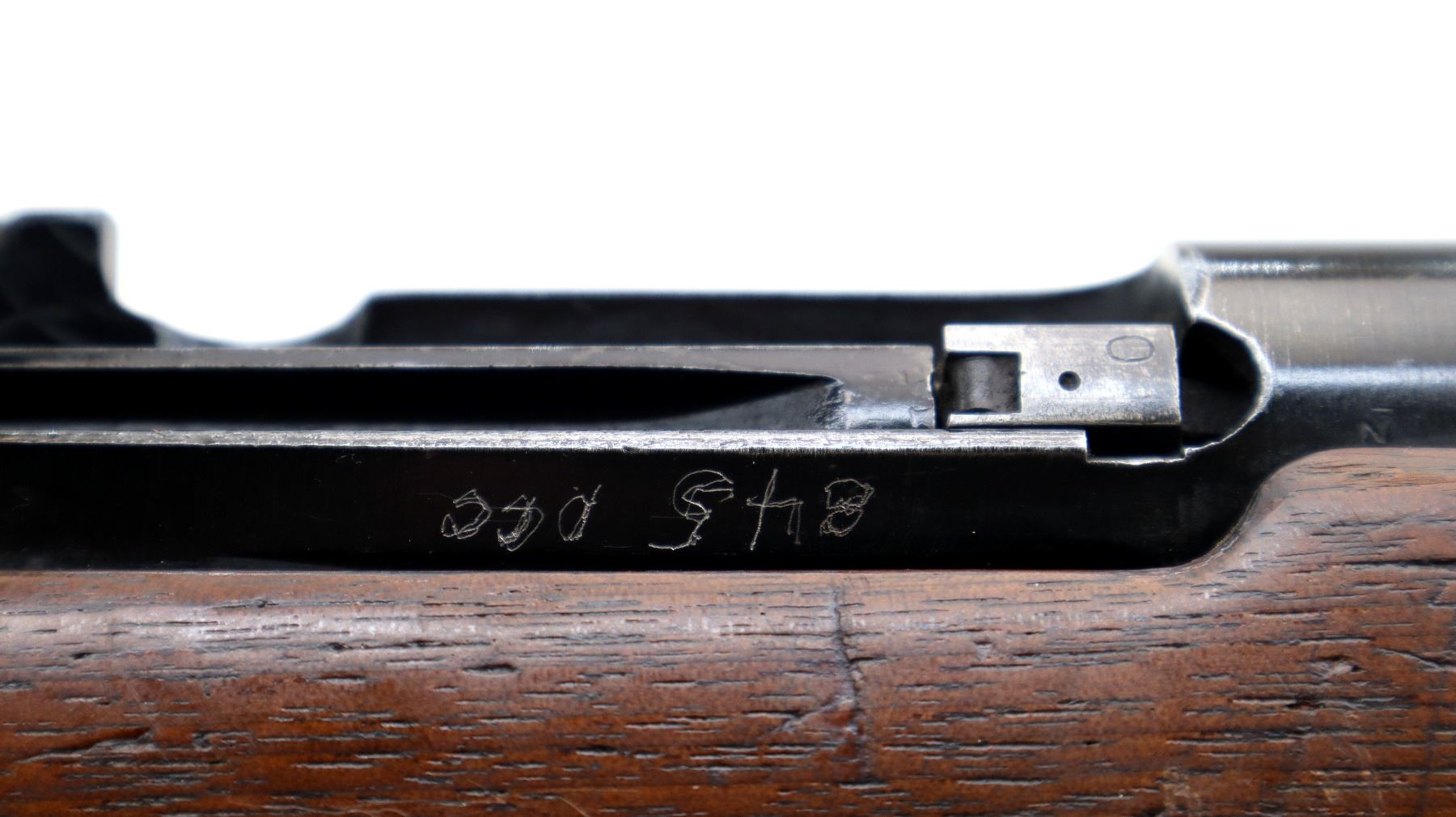 Main Description: Manufactured by Fazakerley 10/45, bolt matches magazine does not. Blade front sight with ears and ramp missing pins, adjustable milled 800 yrd rear peep sight, black painted metal finish. Two piece sporterized wood stocks, forend tip is cracked, modified pistol grip, black rubber recoil pad which is damaged, rear swivel removed mounting screw replaced, missing front swivel holes are present. Flashider and bayonet lug have been removed.