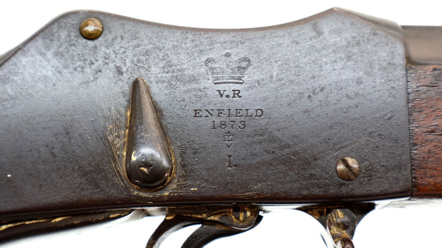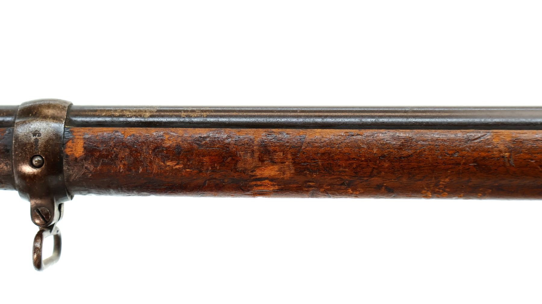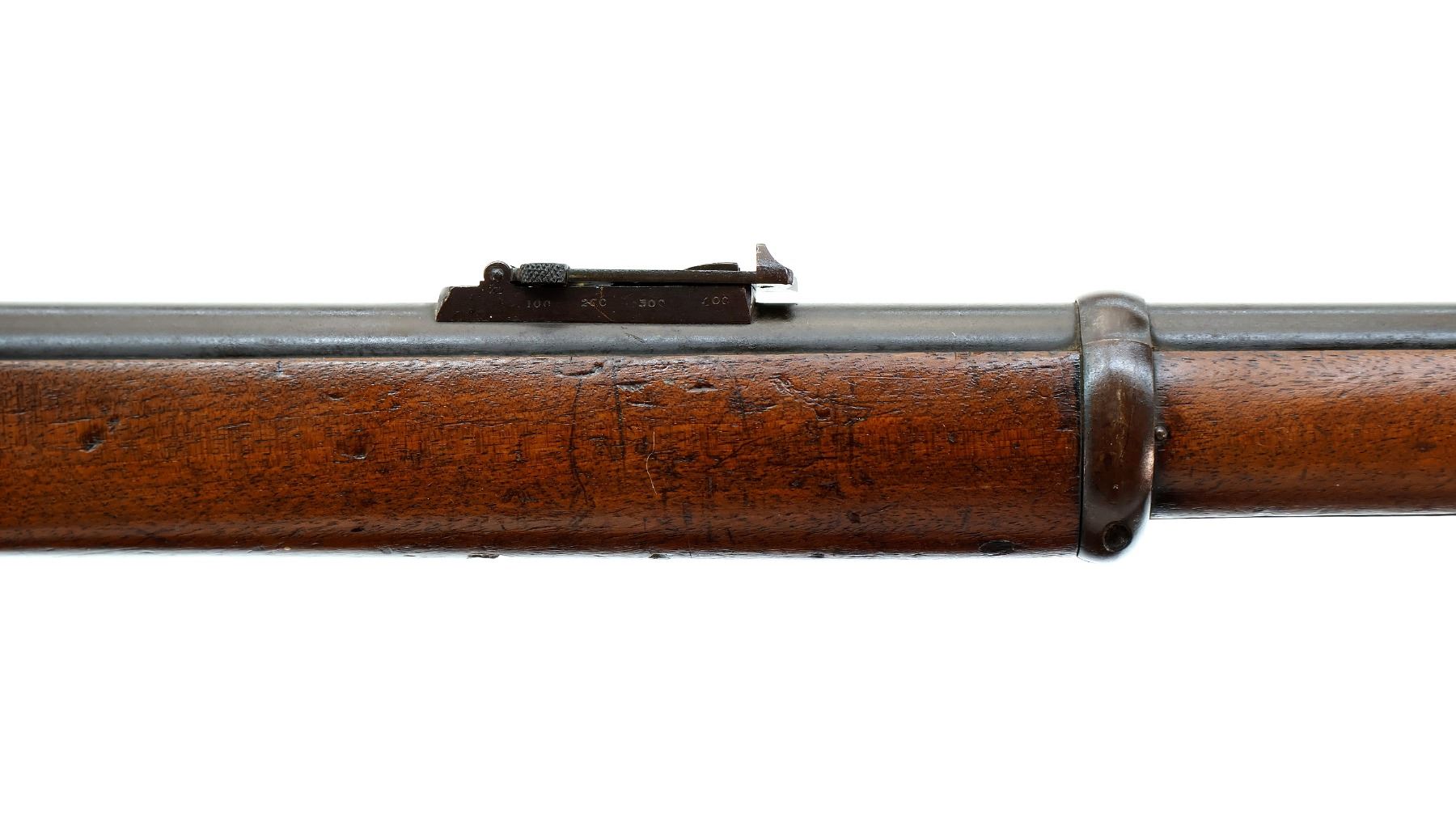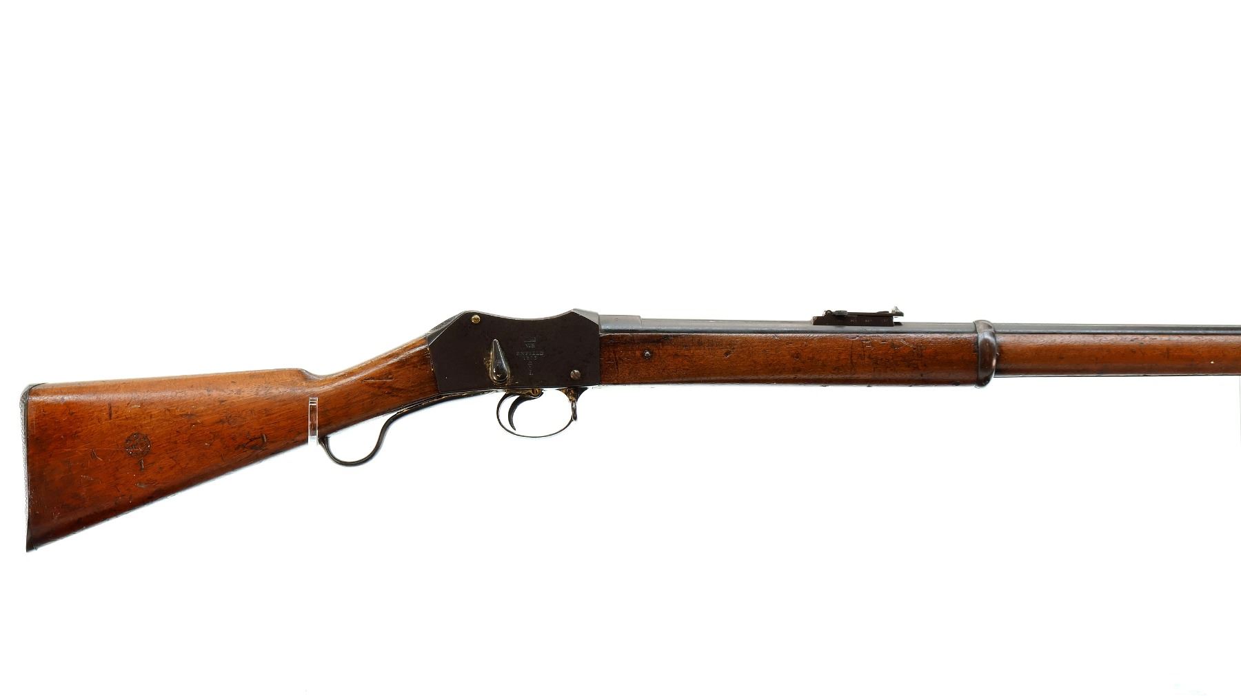 Main Description: Manufactured by Enfield 1873. Blade front sight with ramp, adjustable u notched ladder rear sight, brass breech block hinge pin, large cocking indicator, checkered thumb pad on rear of receiver. Two piece full military wood stocks, forearm has single pin at the rear, straight grip stamped 65 9, checkered steel butt plate, short lever, roundel on right side of stock, missing butt swivel hole is present, has the trigger guard and front band swivel with bayonet lug, missing the ramrod.