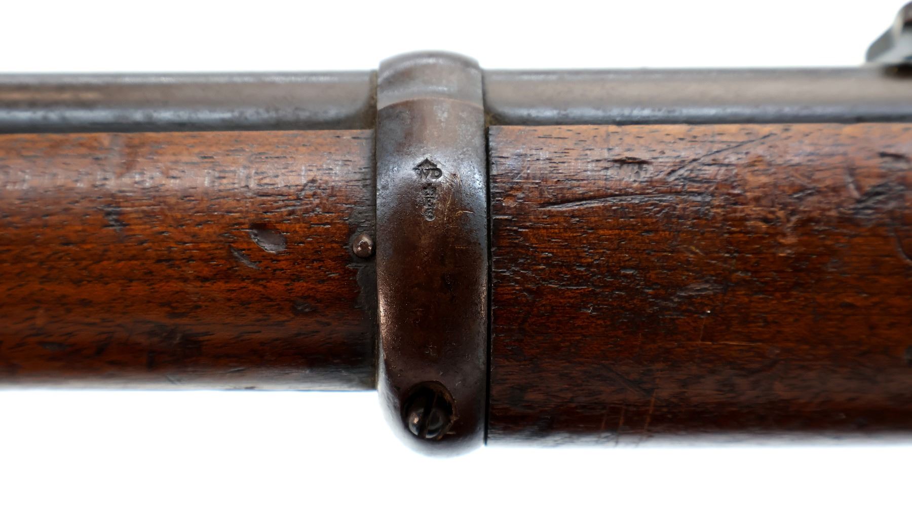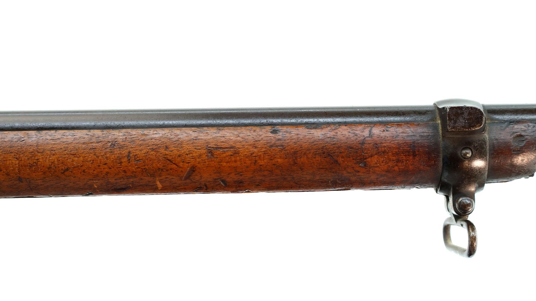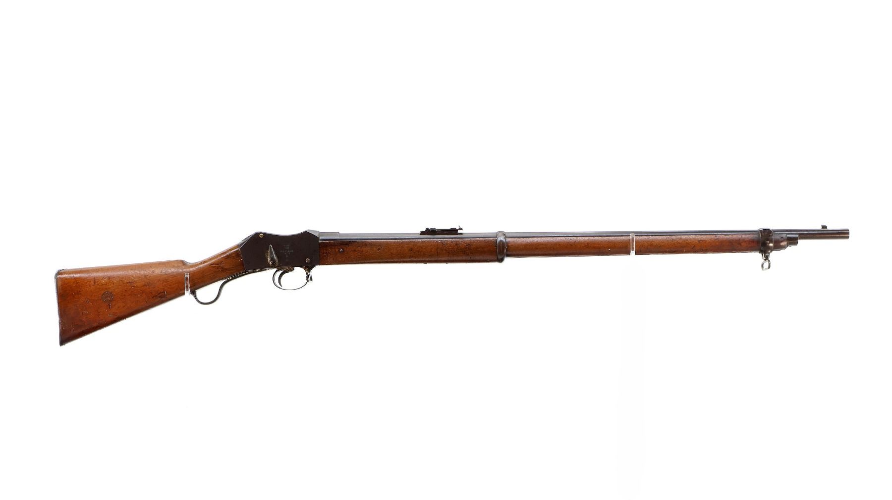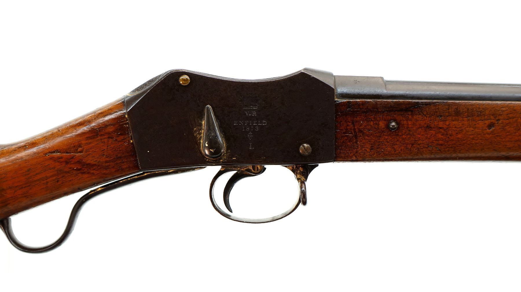 Main Description: Manufactured by Enfield 1873. Blade front sight with ramp, adjustable u notched ladder rear sight, brass breech block hinge pin, large cocking indicator, checkered thumb pad on rear of receiver. Two piece full military wood stocks, forearm has single pin at the rear, straight grip stamped 65 9, checkered steel butt plate, short lever, roundel on right side of stock, missing butt swivel hole is present, has the trigger guard and front band swivel with bayonet lug, missing the ramrod.