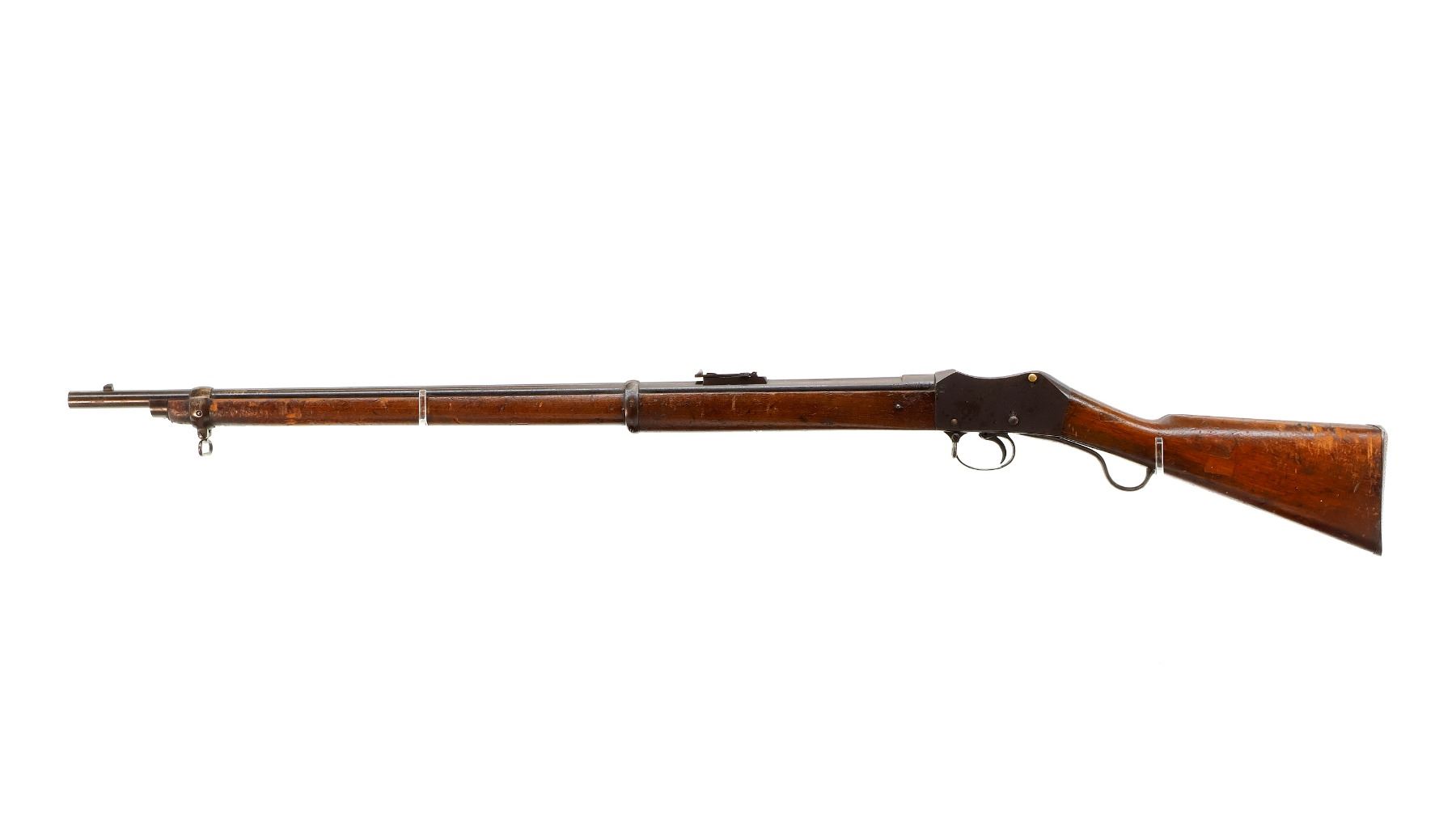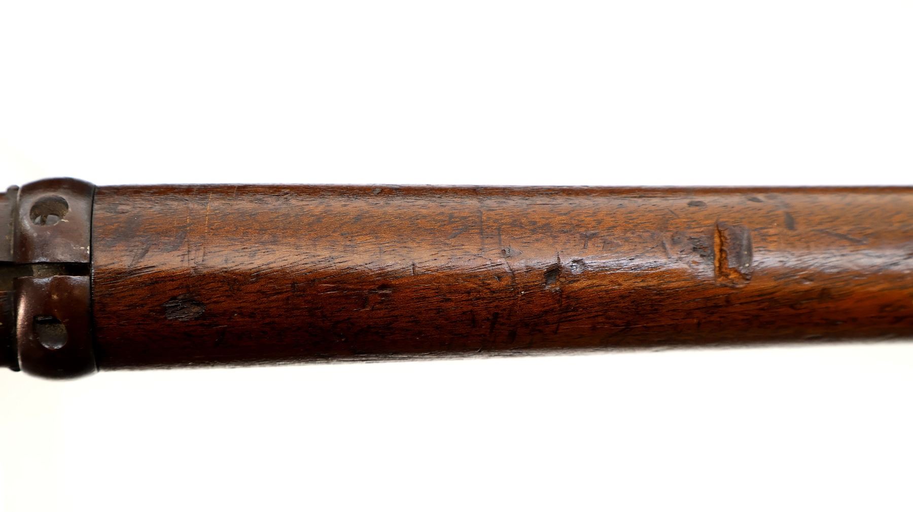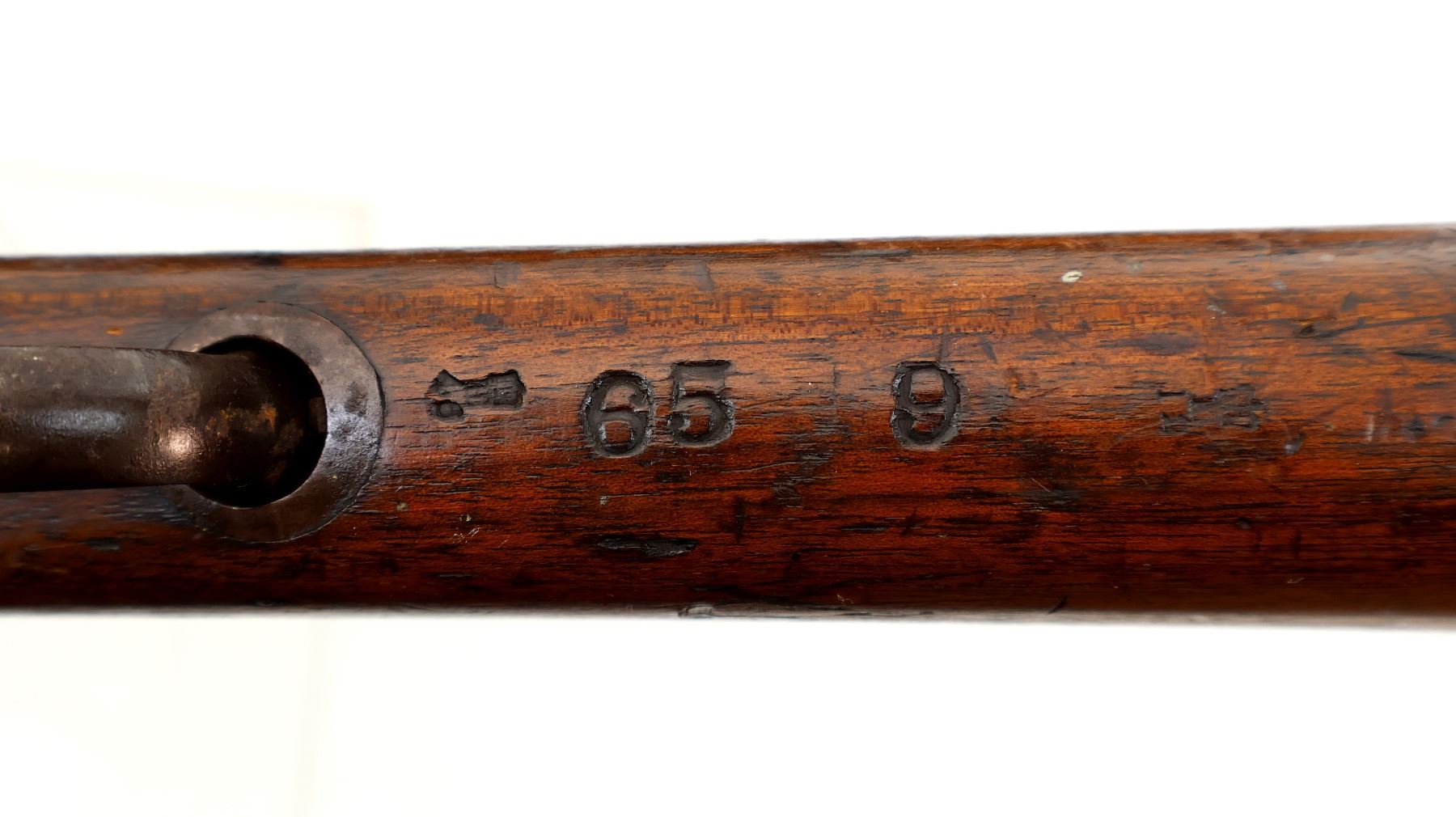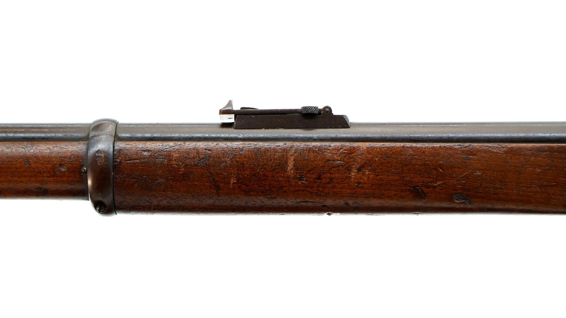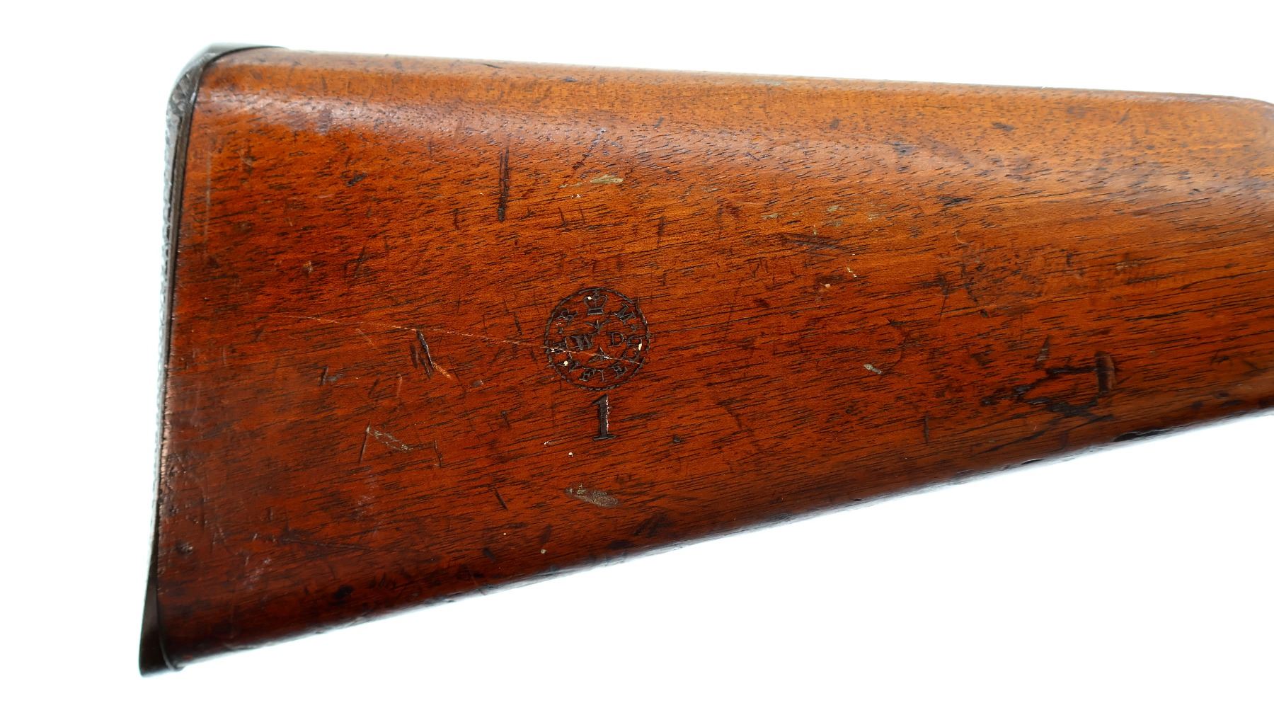 Main Description: Manufactured by Enfield 1873. Blade front sight with ramp, adjustable u notched ladder rear sight, brass breech block hinge pin, large cocking indicator, checkered thumb pad on rear of receiver. Two piece full military wood stocks, forearm has single pin at the rear, straight grip stamped 65 9, checkered steel butt plate, short lever, roundel on right side of stock, missing butt swivel hole is present, has the trigger guard and front band swivel with bayonet lug, missing the ramrod.