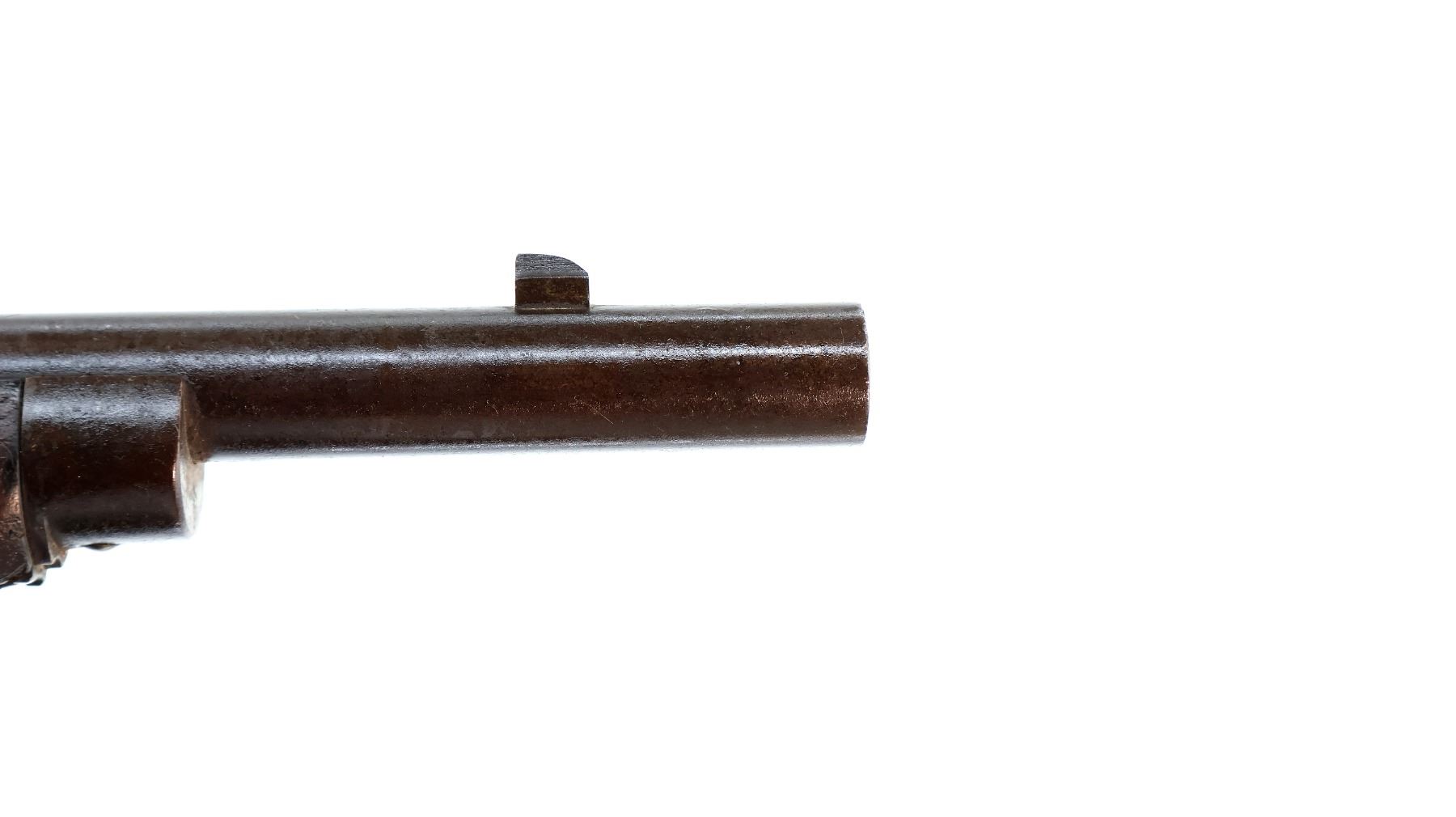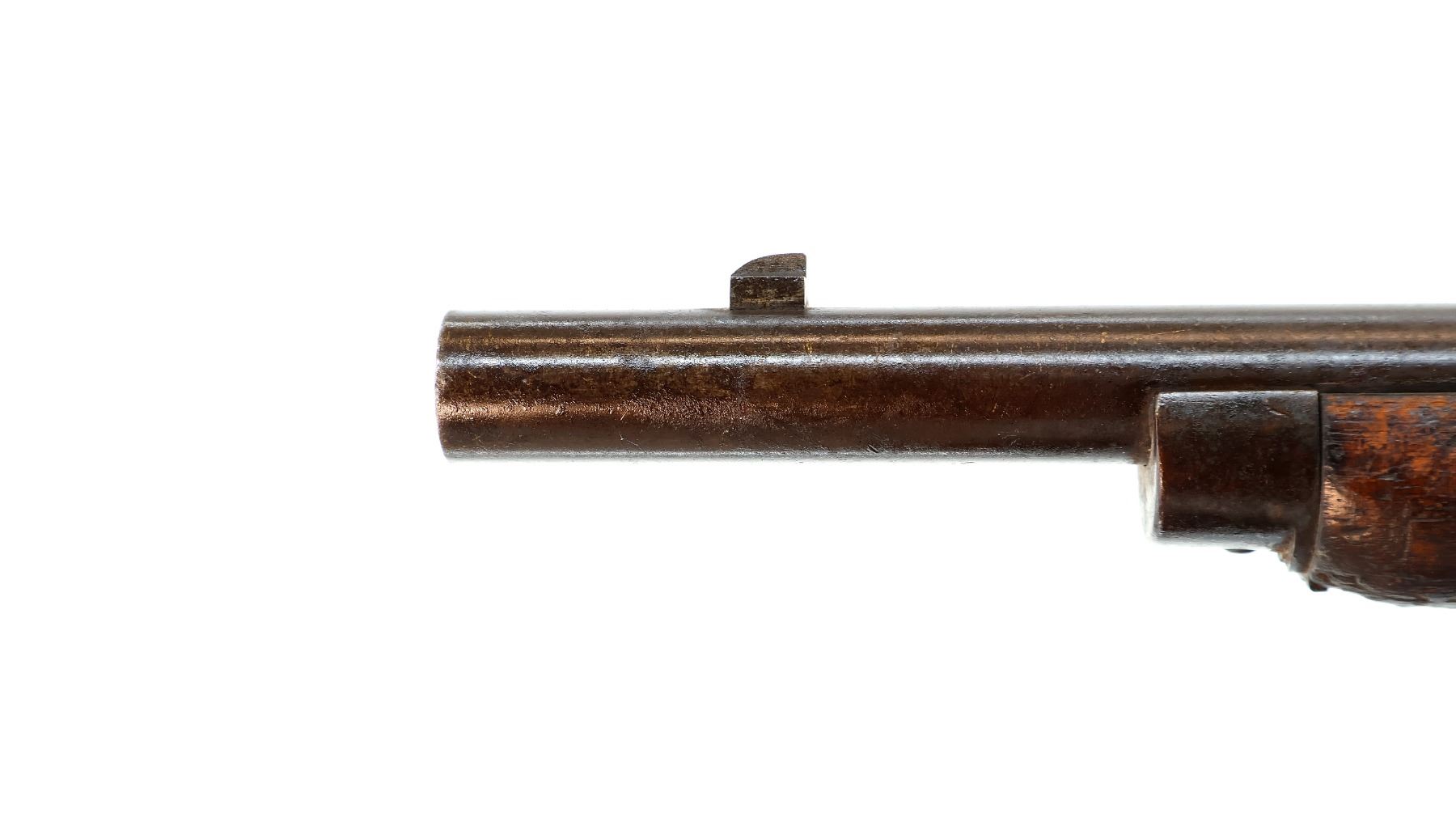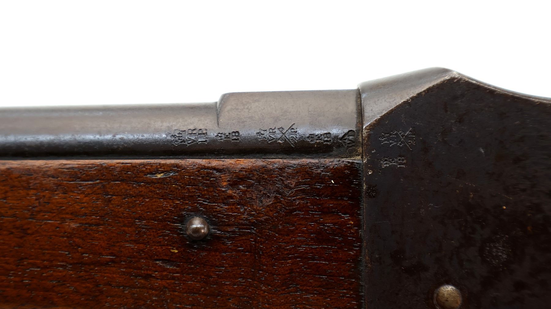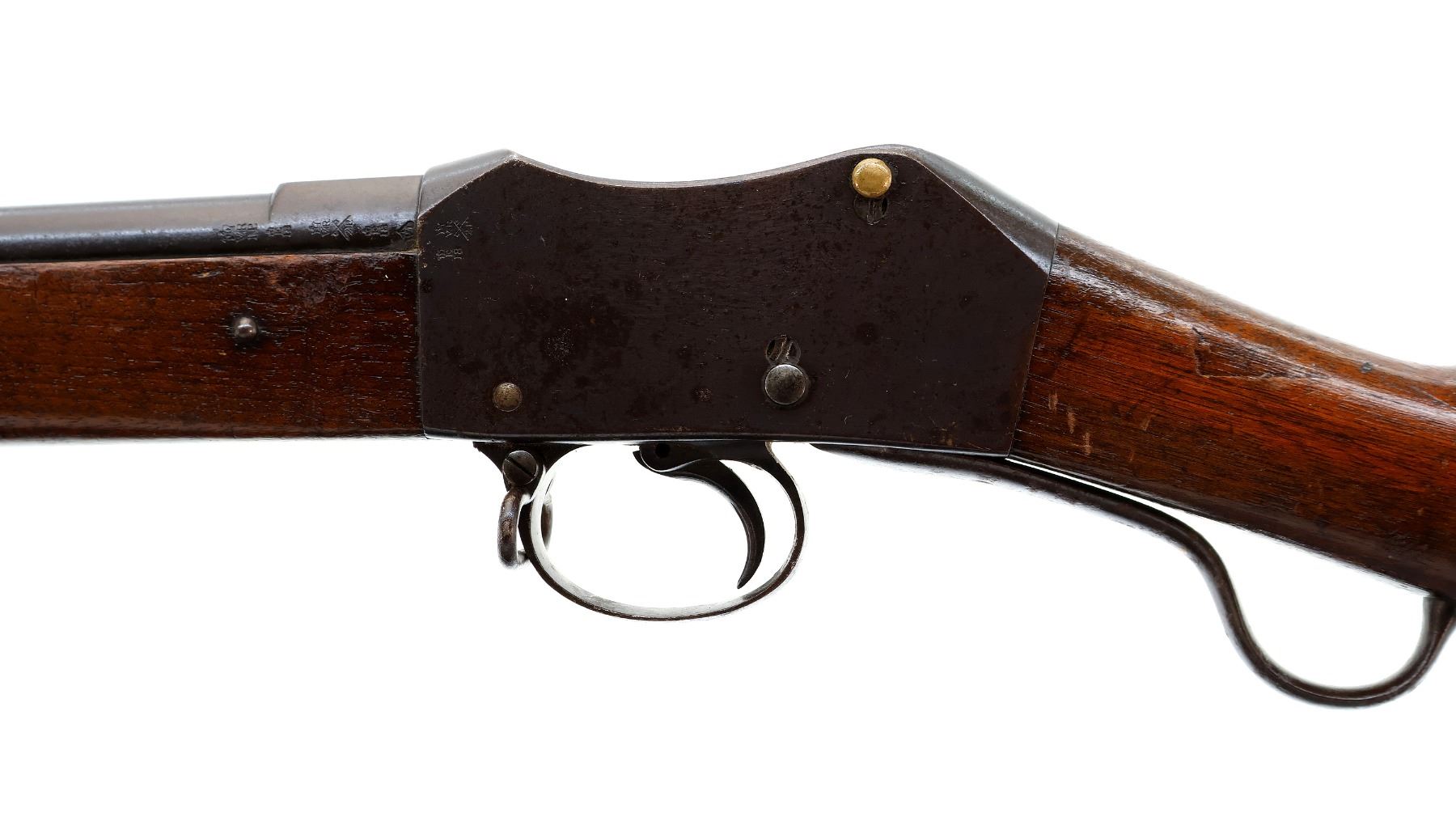 Main Description: Manufactured by Enfield 1873. Blade front sight with ramp, adjustable u notched ladder rear sight, brass breech block hinge pin, large cocking indicator, checkered thumb pad on rear of receiver. Two piece full military wood stocks, forearm has single pin at the rear, straight grip stamped 65 9, checkered steel butt plate, short lever, roundel on right side of stock, missing butt swivel hole is present, has the trigger guard and front band swivel with bayonet lug, missing the ramrod.