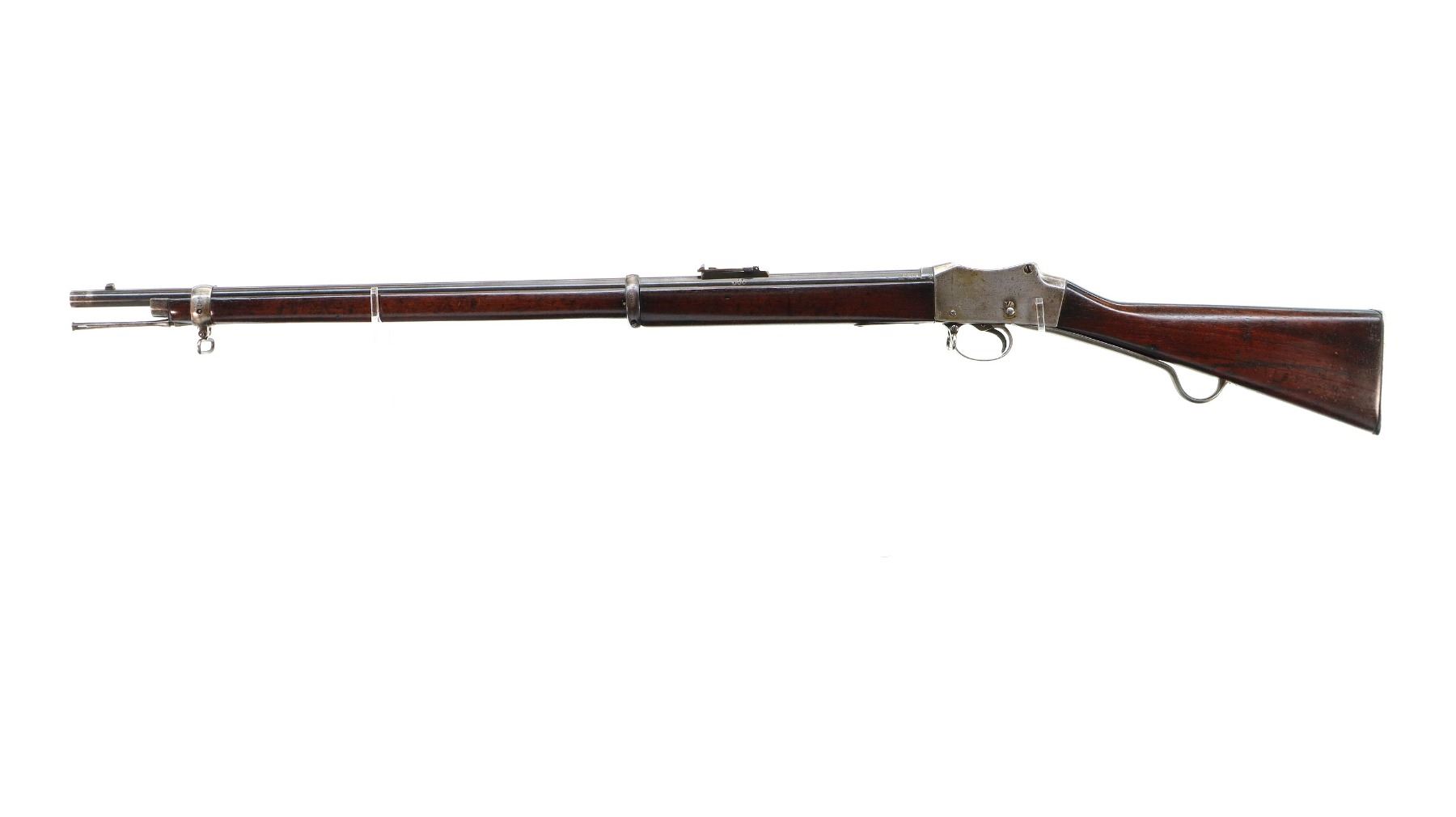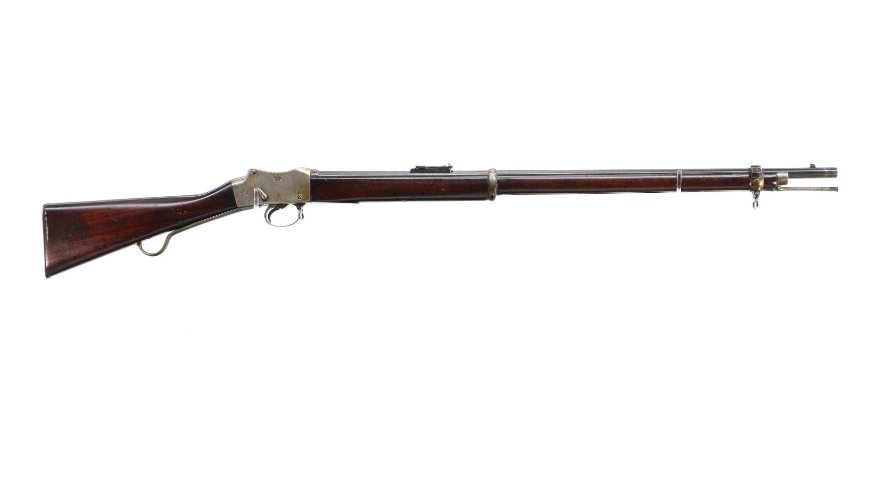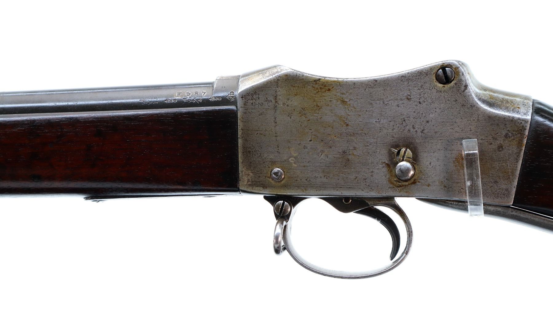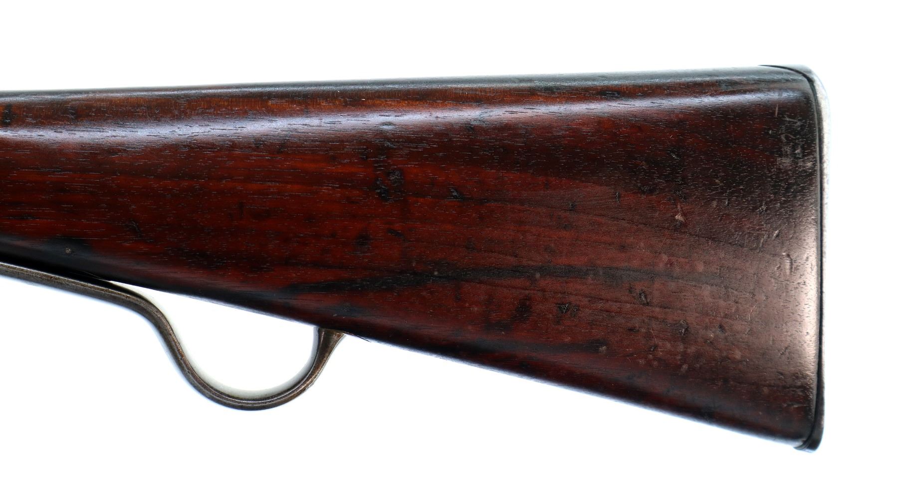 Main Description: Manufactured by Enfield 1887. Blade front sight with ramp, adjustable u notched ladder rear sight, blued finish, small cocking indicator and long lever. Two piece full military wood stocks, straight grip, smooth steel butt plate, various markings on right side of stock, sling swivels, cleaning rod, bayonet lug.