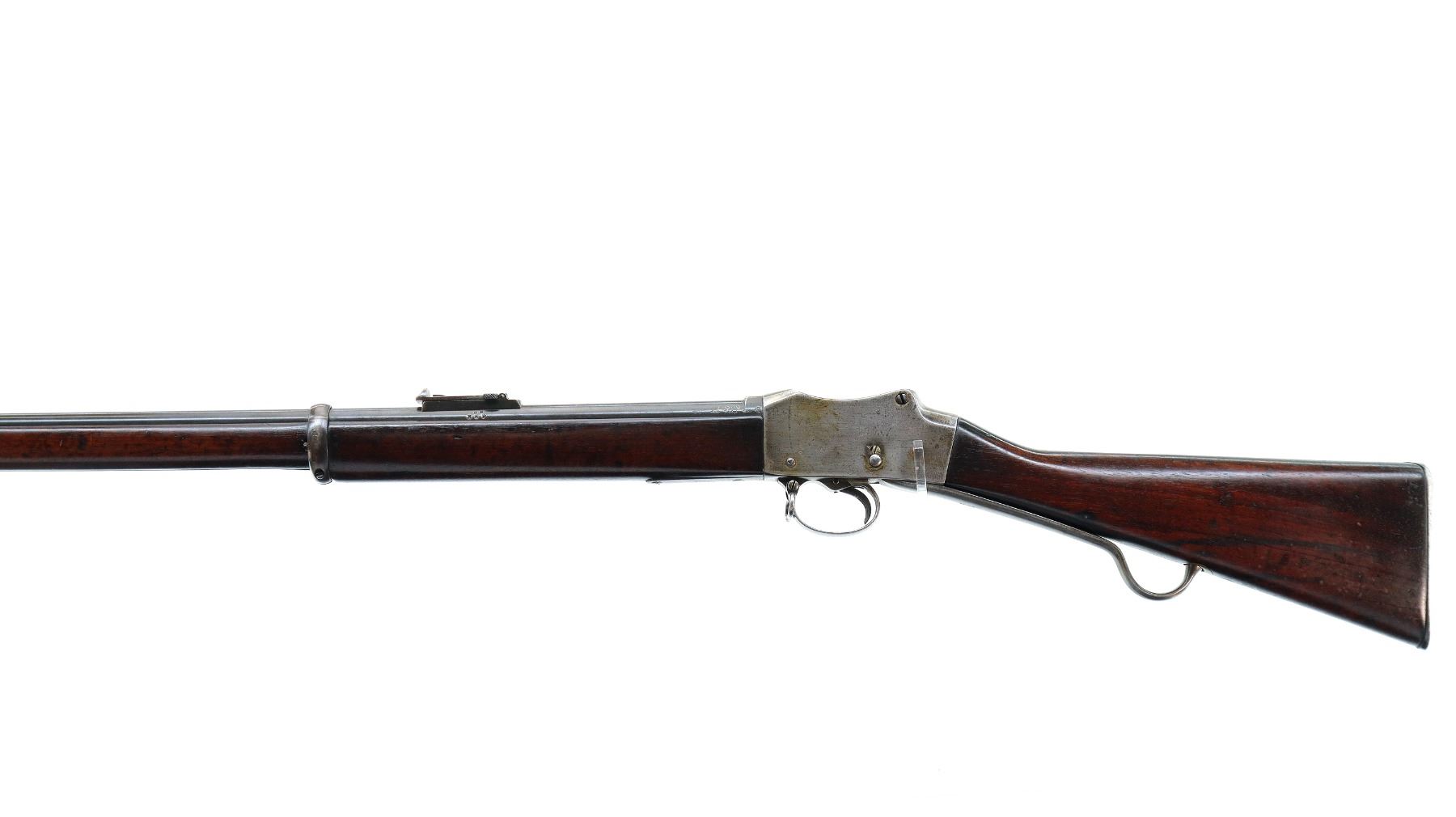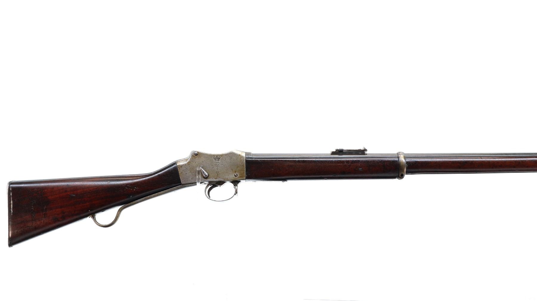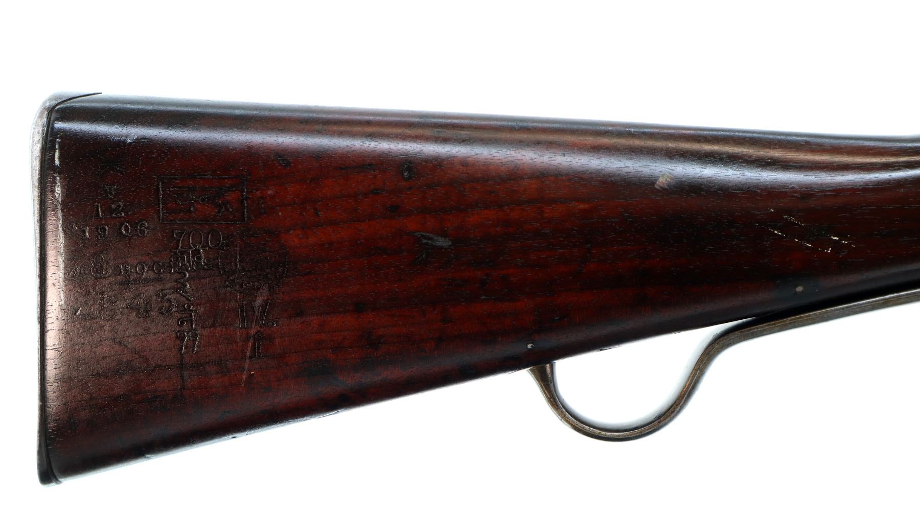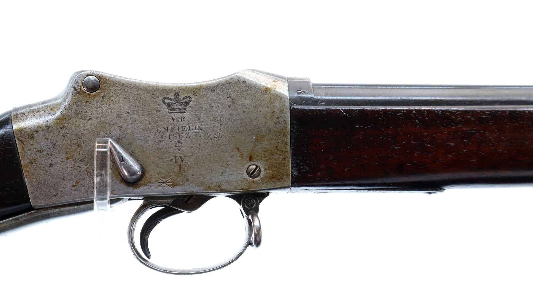 Main Description: Manufactured by Enfield 1887. Blade front sight with ramp, adjustable u notched ladder rear sight, blued finish, small cocking indicator and long lever. Two piece full military wood stocks, straight grip, smooth steel butt plate, various markings on right side of stock, sling swivels, cleaning rod, bayonet lug.