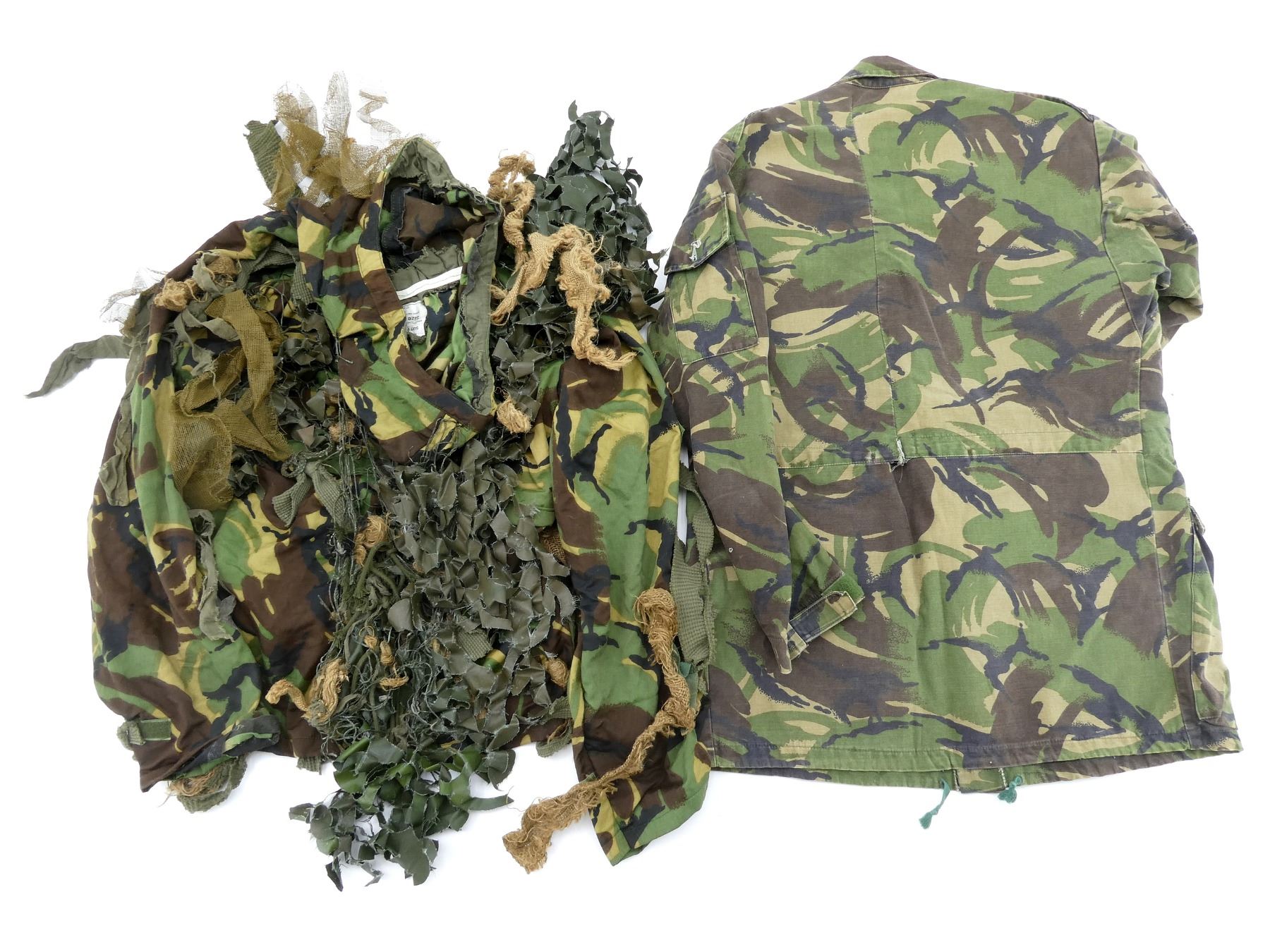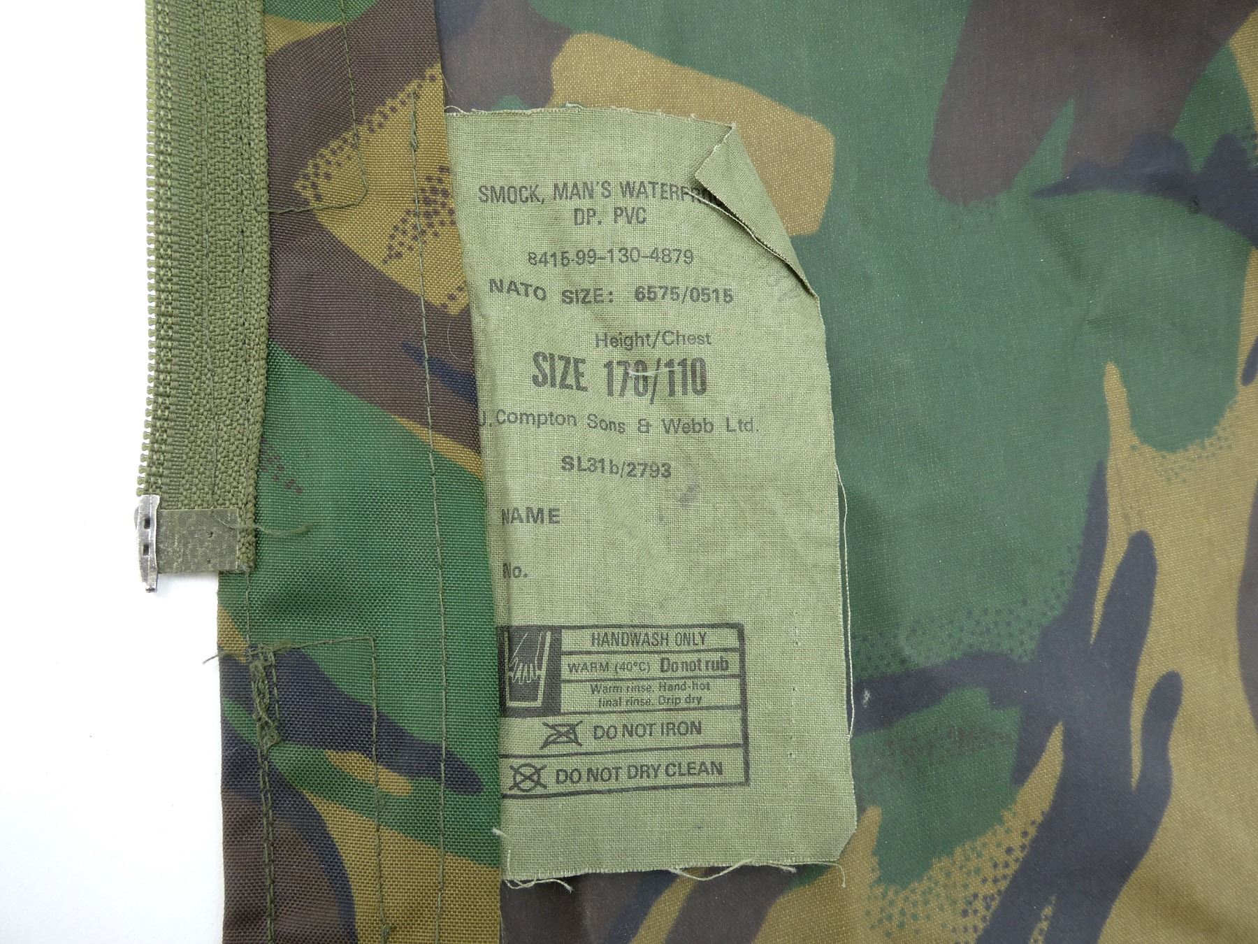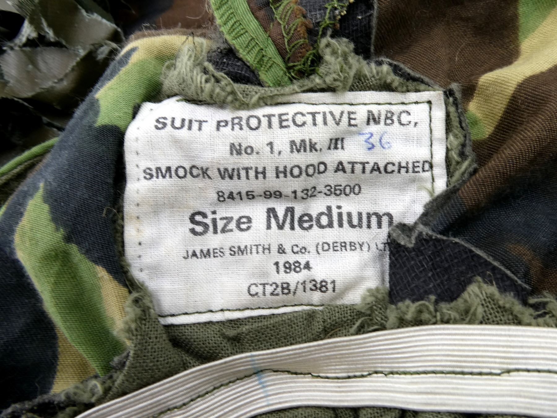 LOT INCLUDES; (1) GREEN CAMO WATERPROOF SMOCK, MARKED: "SMOCK, MAN'S WATERPROOF, DP, PVC, 8415-99-130-4879, HEIGHT/CHEST, 170/110" ETC., BUILT-IN HOOD, ZIPPERED-FRONT (WORKS), (1) DISRUPTIVE PATTERN MATERIAL (DPM) COMBAT SMOCK, NO VISIBLE LABELS / MARKINGS, BUTTON / ZIPPERED-FRONT (WORKS), SHOWS WEAR, SHOULDER WIDTH APPROX. 17" & (1) GREEN CAMO PROTECTIVE NBC SMOCK, MARKED: "SUIT PROTECTIVE NBC, NO.1, MK. III, SMOCK WITH HOOD ATTACHED, 8415-99-132-3500, 1984" ETC., SIZE MEDIUM, ASSORTED NETTING / MESH / BURLAP AFFIXED FOR FURTHER CAMOUFLAGE, SHOWS WEAR / TEAR. SEE PHOTOS.
