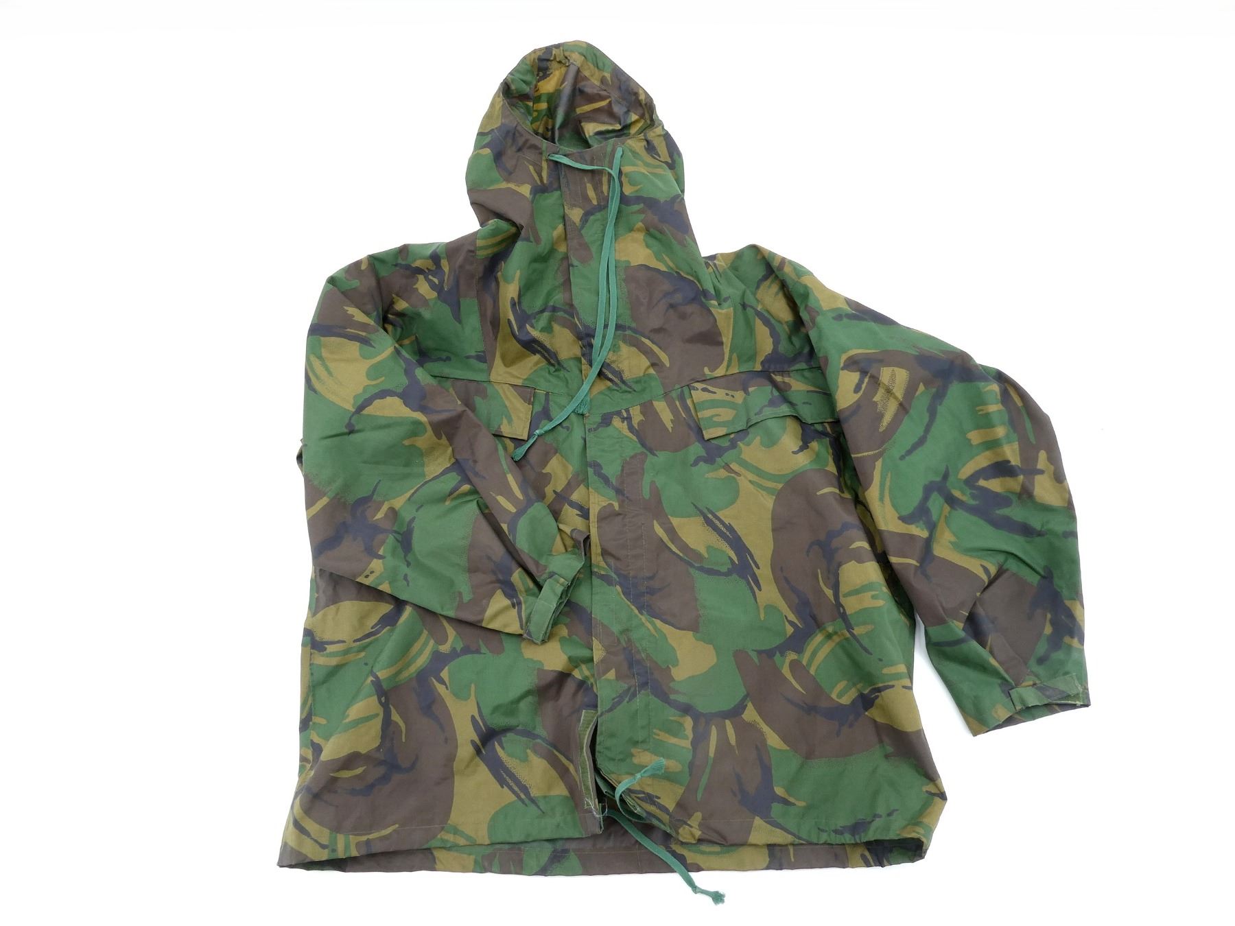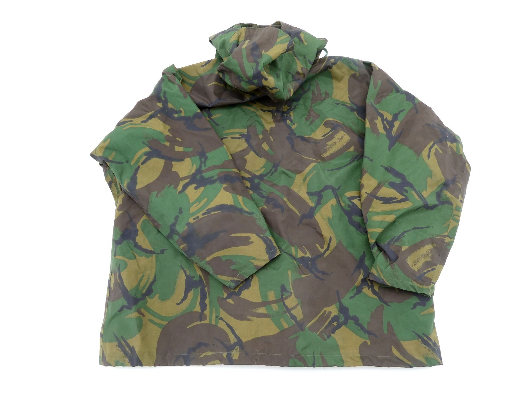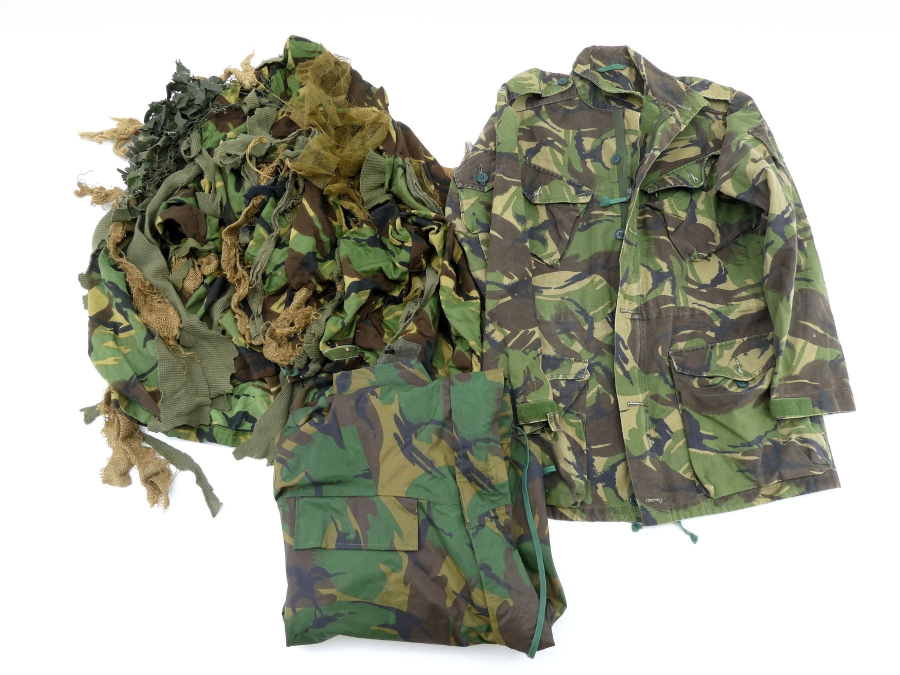 LOT INCLUDES; (1) GREEN CAMO WATERPROOF SMOCK, MARKED: "SMOCK, MAN'S WATERPROOF, DP, PVC, 8415-99-130-4879, HEIGHT/CHEST, 170/110" ETC., BUILT-IN HOOD, ZIPPERED-FRONT (WORKS), (1) DISRUPTIVE PATTERN MATERIAL (DPM) COMBAT SMOCK, NO VISIBLE LABELS / MARKINGS, BUTTON / ZIPPERED-FRONT (WORKS), SHOWS WEAR, SHOULDER WIDTH APPROX. 17" & (1) GREEN CAMO PROTECTIVE NBC SMOCK, MARKED: "SUIT PROTECTIVE NBC, NO.1, MK. III, SMOCK WITH HOOD ATTACHED, 8415-99-132-3500, 1984" ETC., SIZE MEDIUM, ASSORTED NETTING / MESH / BURLAP AFFIXED FOR FURTHER CAMOUFLAGE, SHOWS WEAR / TEAR. SEE PHOTOS.