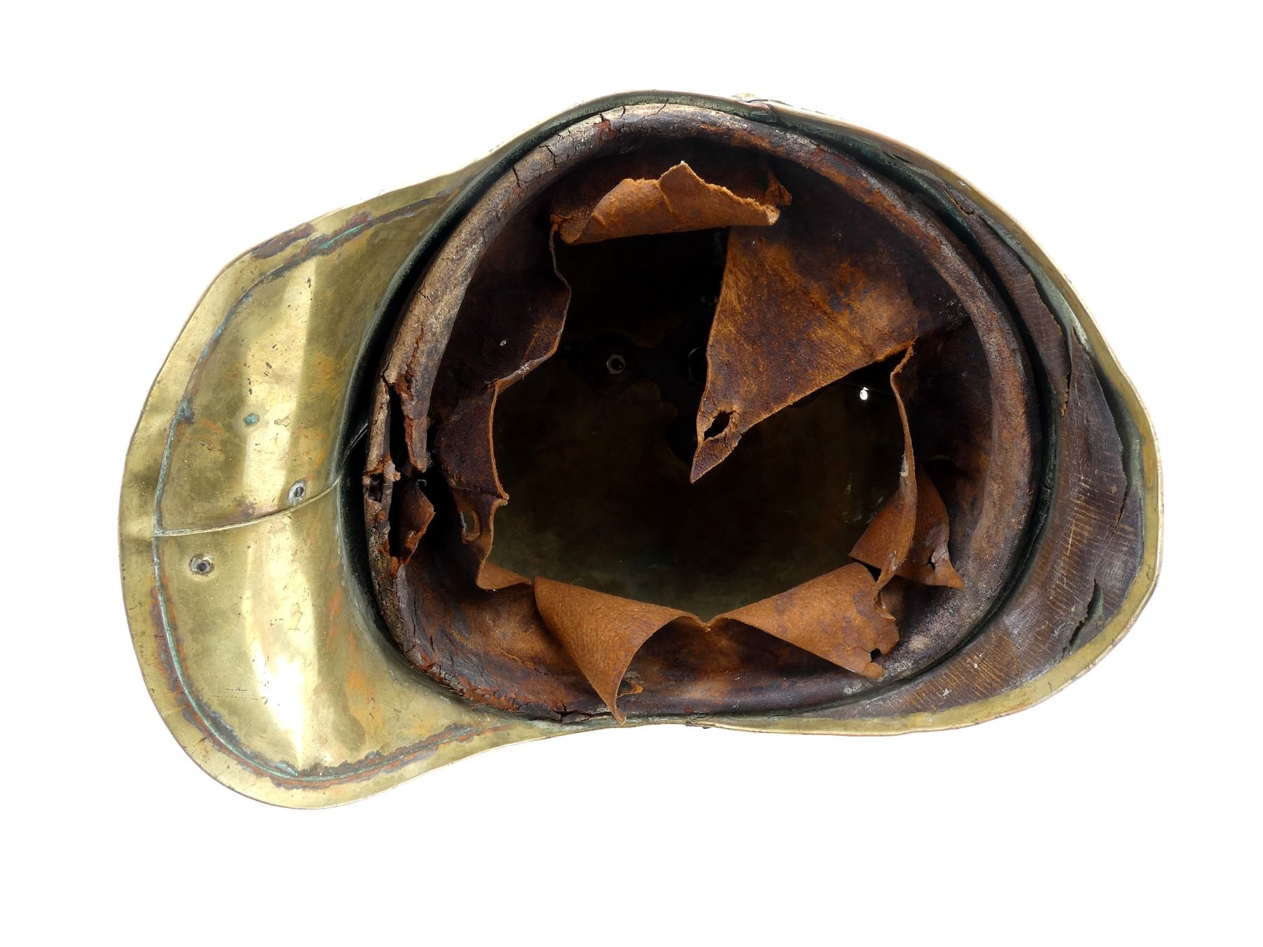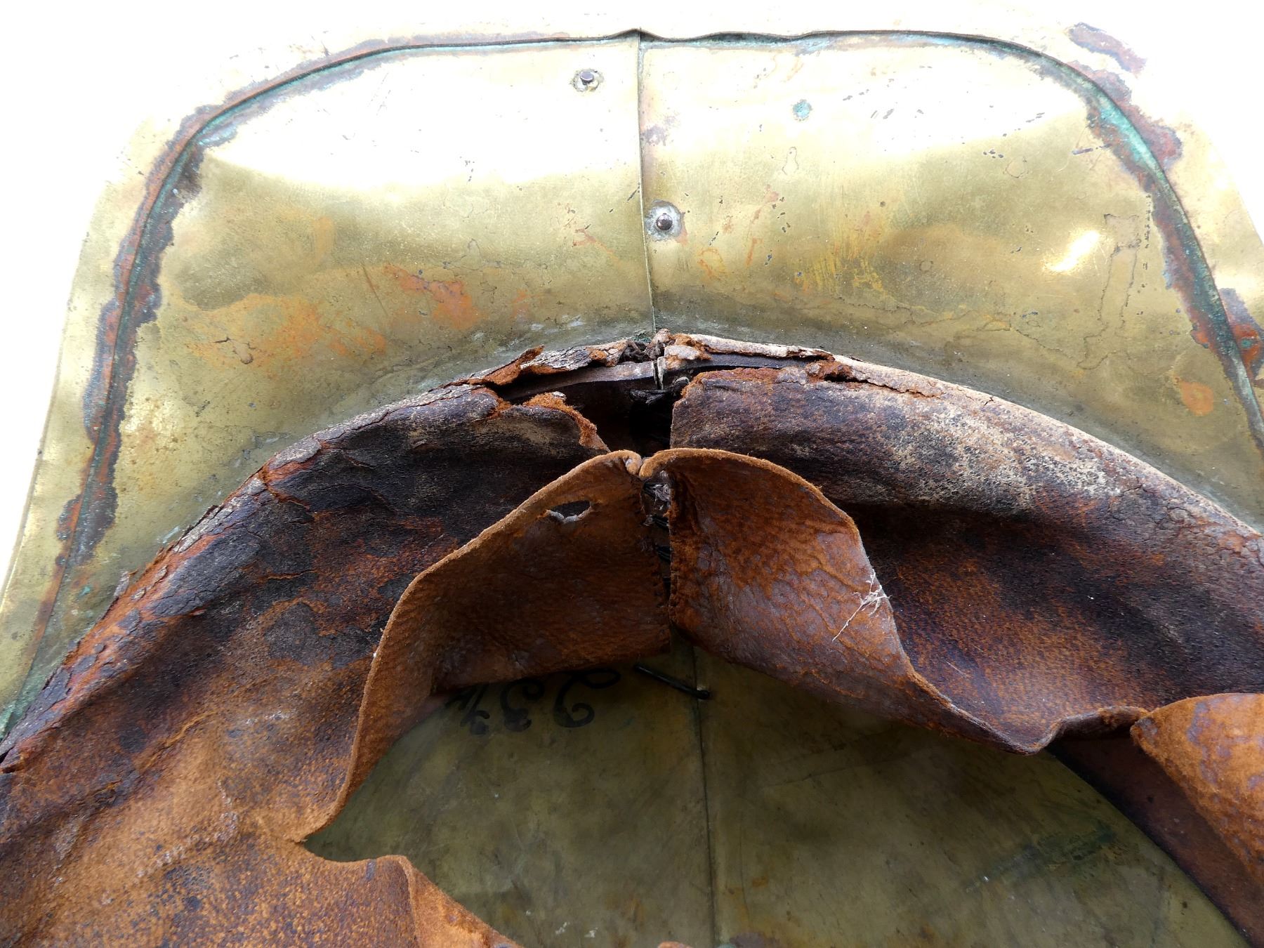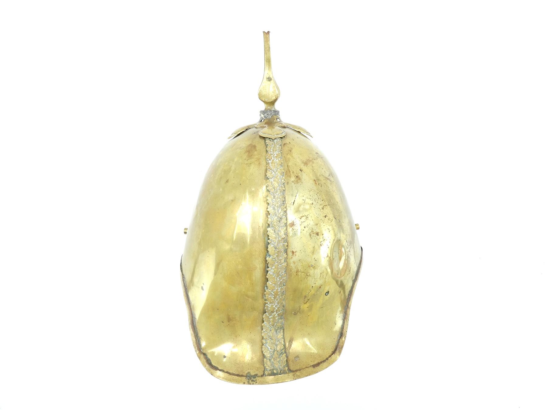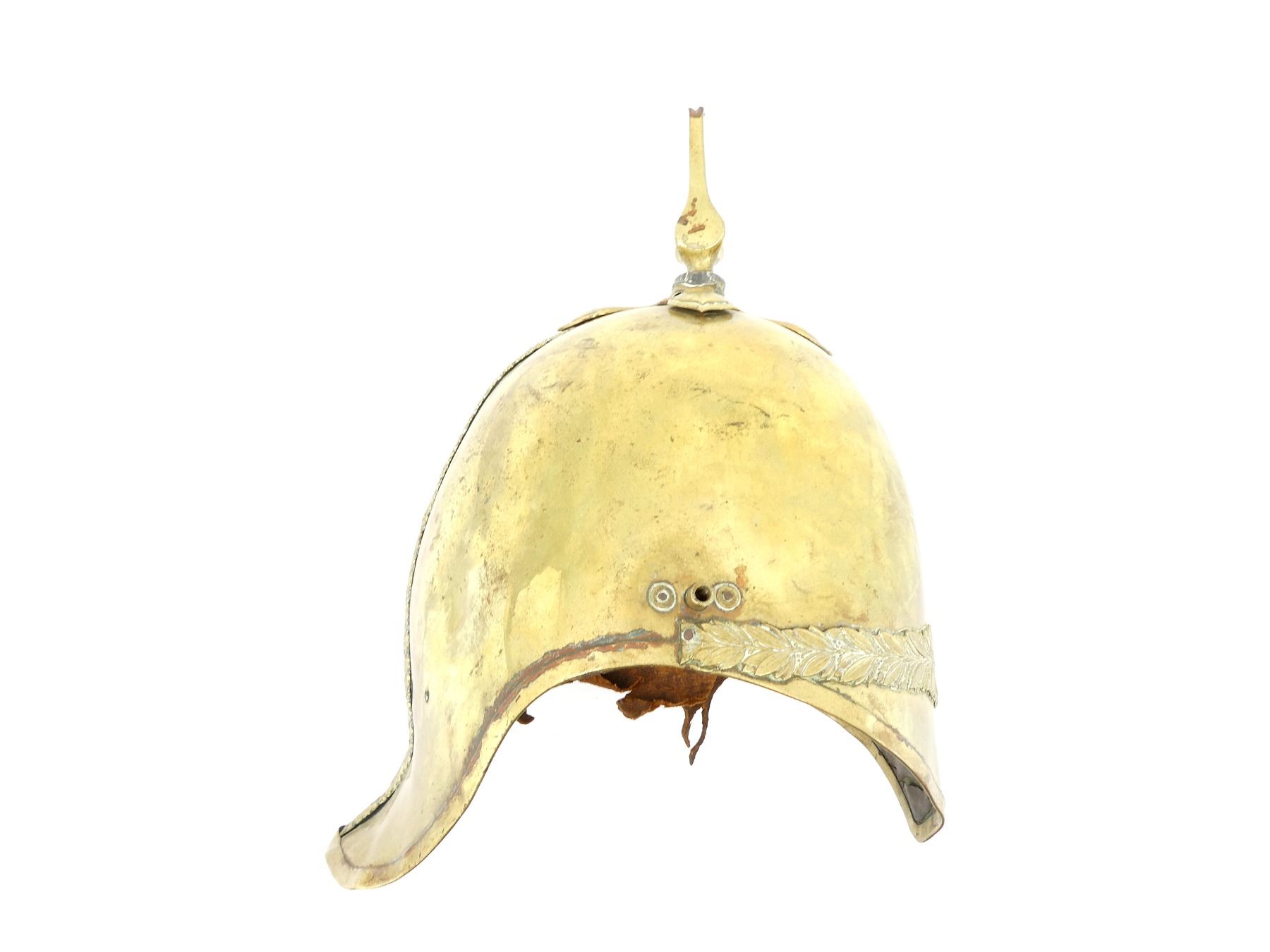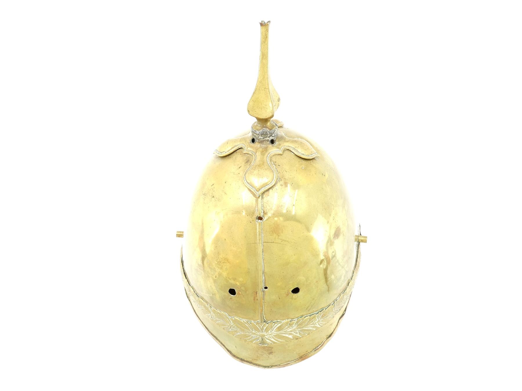 (1) BRASS HELMET WITH FLORAL BRASS TRIM / DETAILING, MISSING CAP BADGE / UNIT CREST, MISSING BRASS FLOWER SHAPED FIXTURES ON THE SIDES WHERE CHIN STRAP ATTACHES, MISSING CHIN STRAP, BRASS SPIKE ON TOP MISSING PLUME, LEATHER LINING / HEAD BAND INSIDE, LEATHER IS PARTIALLY SOFT, NO DRAWSTRING / TIE, SHOWS AGE / WEAR / TEAR. SEE PHOTOS.