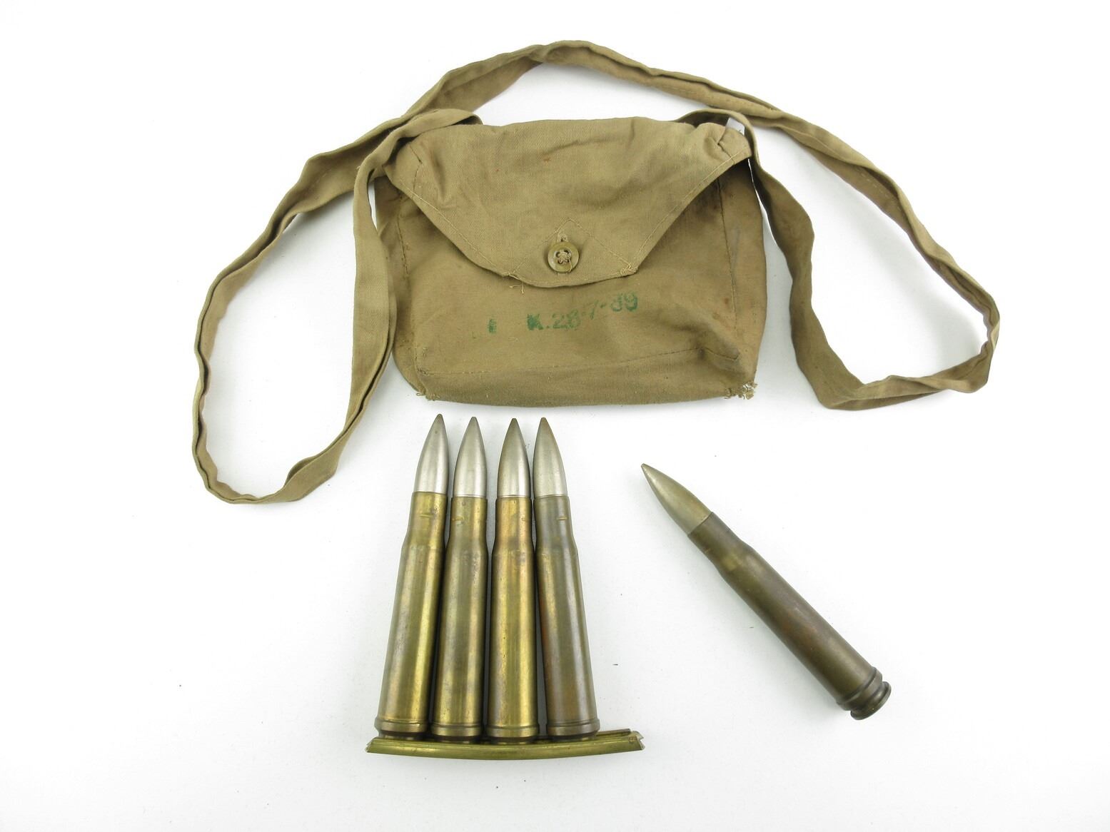 BRITISH MILITARY WWII .55 BOYES ANTI-TANK AMMO LOT. LOT INCLUDES; 5 RNDS, AP, STRIPPER CLIP, (1) BANDOLIER, HEADSTAMPS MARKED K 39 W I, BANDOLIER MARKED K.28-7-39.