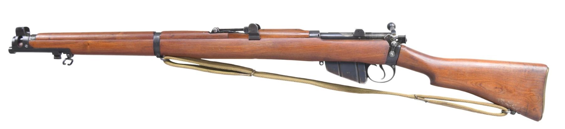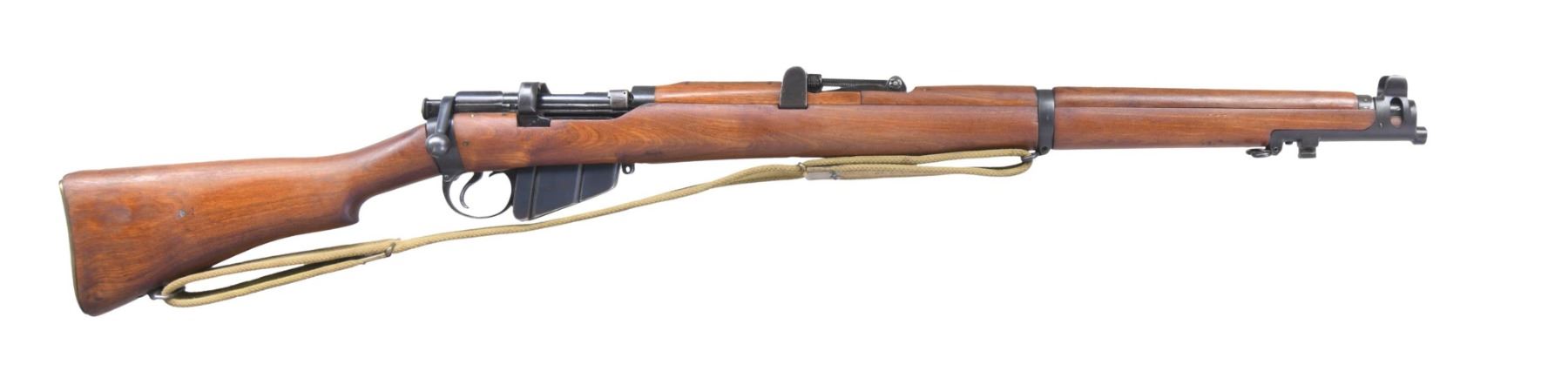 Cal. 22 LR. S# W97944. Bbl. 25 1/2". Blade front sight. Tangent rear sight graduated to 2000m. Matching numbers on receiver & top of bolt handle. Other visible parts appear unnumbered. Standard SMLE MK3 rifle converted to single shot rimfire config with hollowed out mag. Right side of socket has standard BSA 1915 markings with Parker Hale "22 PATT '14 No 2". marking. Left side of socket has "MKIV*" marking. Top of reciever is numbered "595". Arsenal blued finish. Hardwood stock set with bottom mounted sling swivels & 1942 dated canvas sling. MAGS: 1-hollowed out marked "22" on left side. CONDITION: stock set shows a couple armorer reinforcements on rear handguard, a few dings, some white staining & handling marks. Metal retains 92% arsenal rework type blue with a few spots of light oxidation, some edge wear & fading. Action functions properly when hand cycled. Bright near excellent bore. (25-3095/MJC). CURIO. $400-600.