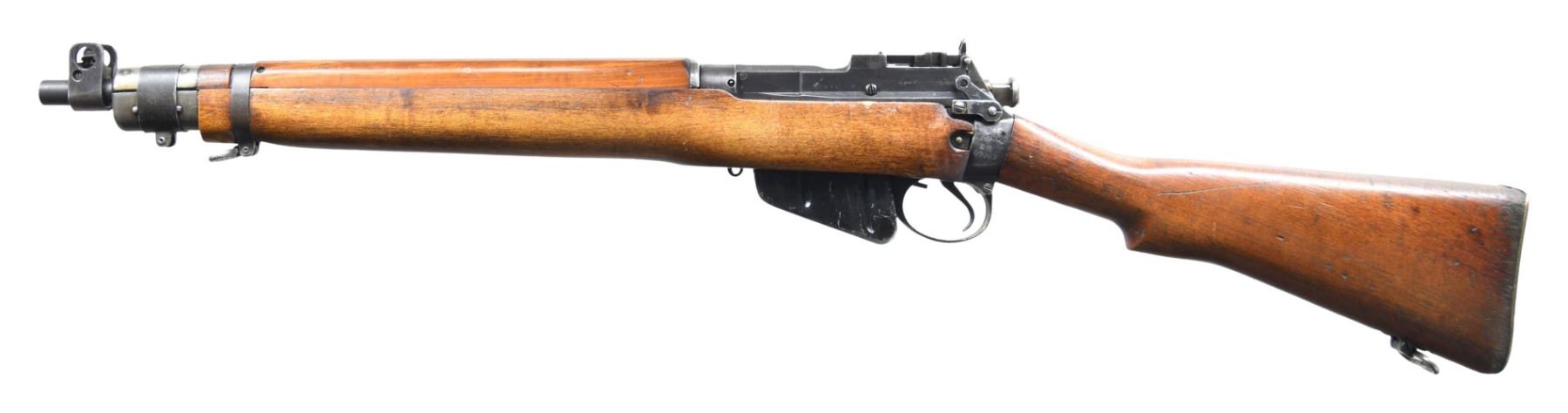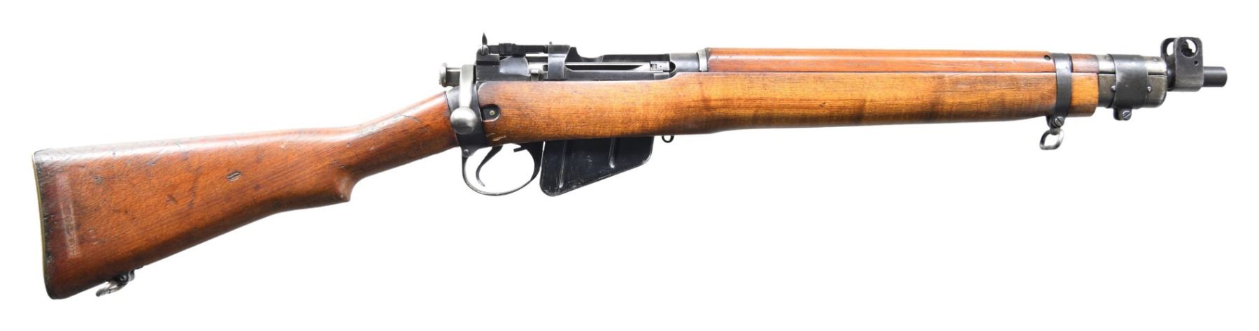 Cal. 303 Brit. S# AR17808. Bbl. 17" shortened. Post front sight with protective ears. Ladder aperture rear sight graduated to 1300yds. Bolt & socket have mismatched numbers. No other visible numbered parts. "Tanker" conversion of a No. 4 Enfield rifle done post-import. Left side of receiver has small CDI import marking. Metal has a mix of blued & Suncorite finishes. Shortened No. 4 stock set with bottom mounted sling swivels. Stock pieces have varying colors. MAGS: 1-10 rd. CONDITION: stock set has added finish with scattered dings, handling marks & scratches. Metal shows scattered thinning, fading, flaking, edge wear & light oxidation. Action functions properly when hand cycled. Very good bright bore. (25-2154/MJC). MODERN. $500-700.