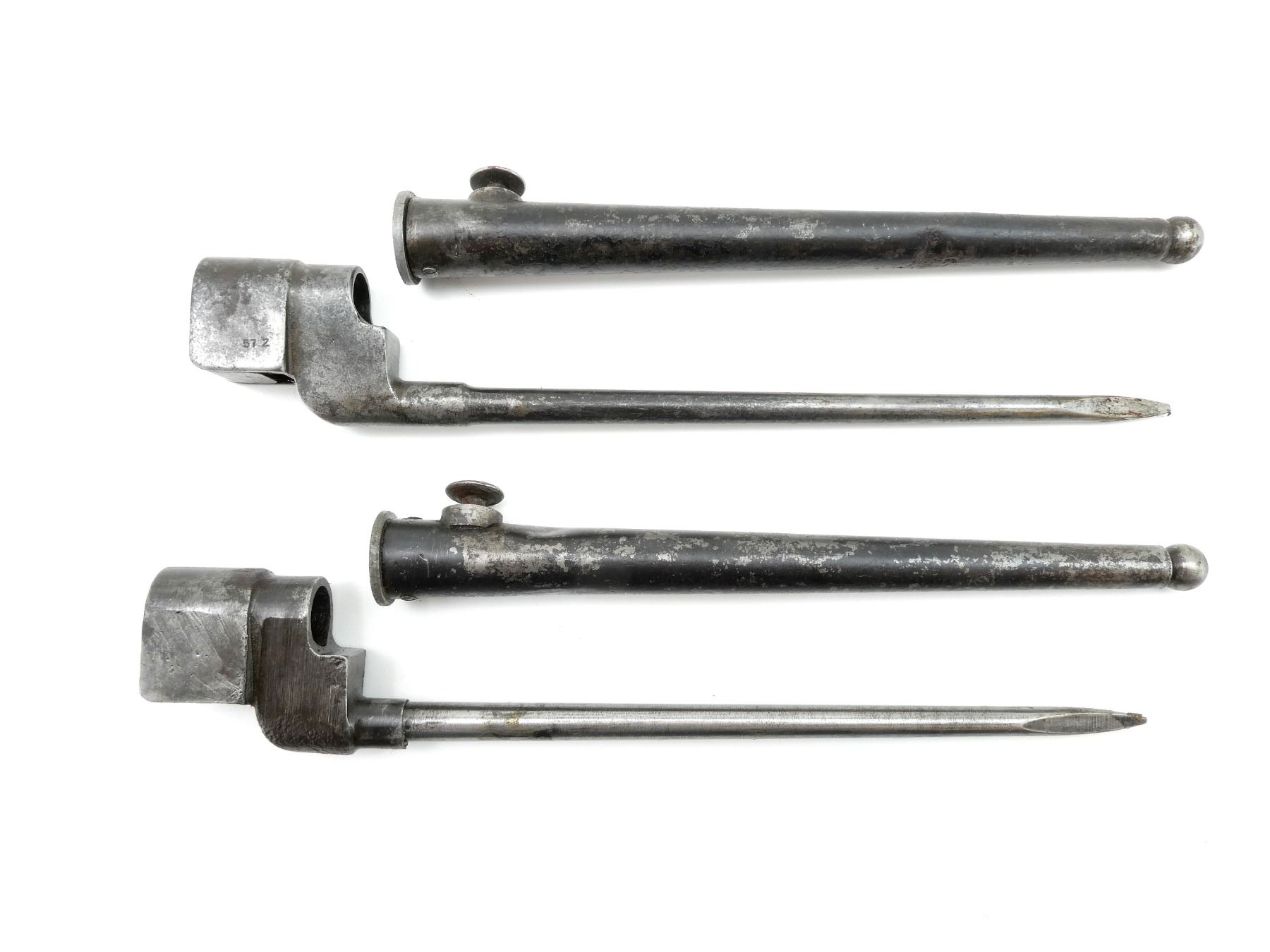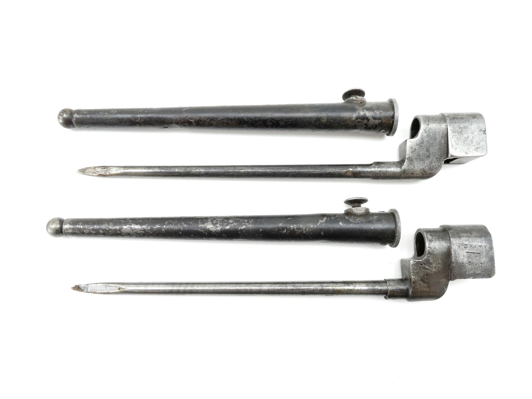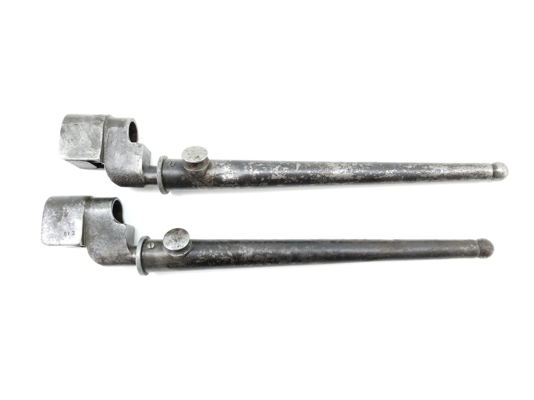 LOT INCLUDES; (1) NO.4 MKII SPIKE BAYONET, FITS LEE ENFIELD NO.4 MKI & MKII SERIES RIFLES, CATCH RELEASE IS STUCK, SOCKET MARKED: "G" CROWN "R" OVER "NO4 MK II, SM", "SM, 42", "57 Z", METAL MKI SCABBARD, THROAT MARKED: "1", BALL TIP MARKED WITH BROAD ARROW, BLADE APPROX. 8", OVERALL LENGTH APPROX. 10" & (1) NO.4 MKII* SPIKE BAYONET, FITS LEE ENFIELD NO.4 MKI & MKII SERIES RIFLES, SOCKET MARKED: "L.ENG", "?376" IN RECTANGLE, "NO4 MKII*", BROAD ARROW, "8", METAL MKI SCABBARD, THROAT MARKED: "NO4 MKI", BROAD ARROW, "V", BLADE APPROX. 8 1/8" & OVERALL LENGTH APPROX. 10". SEE PHOTOS.