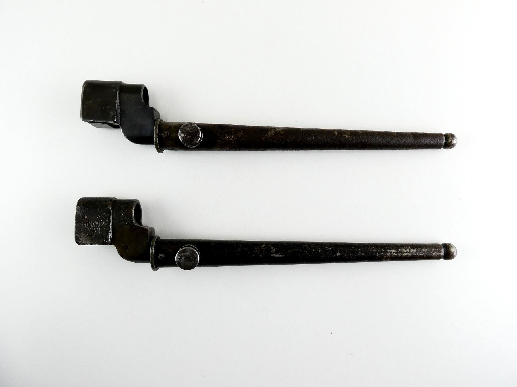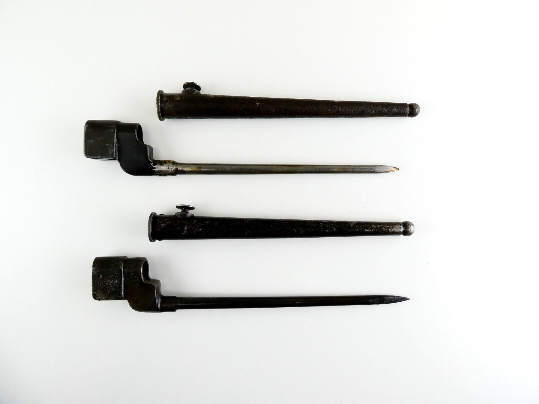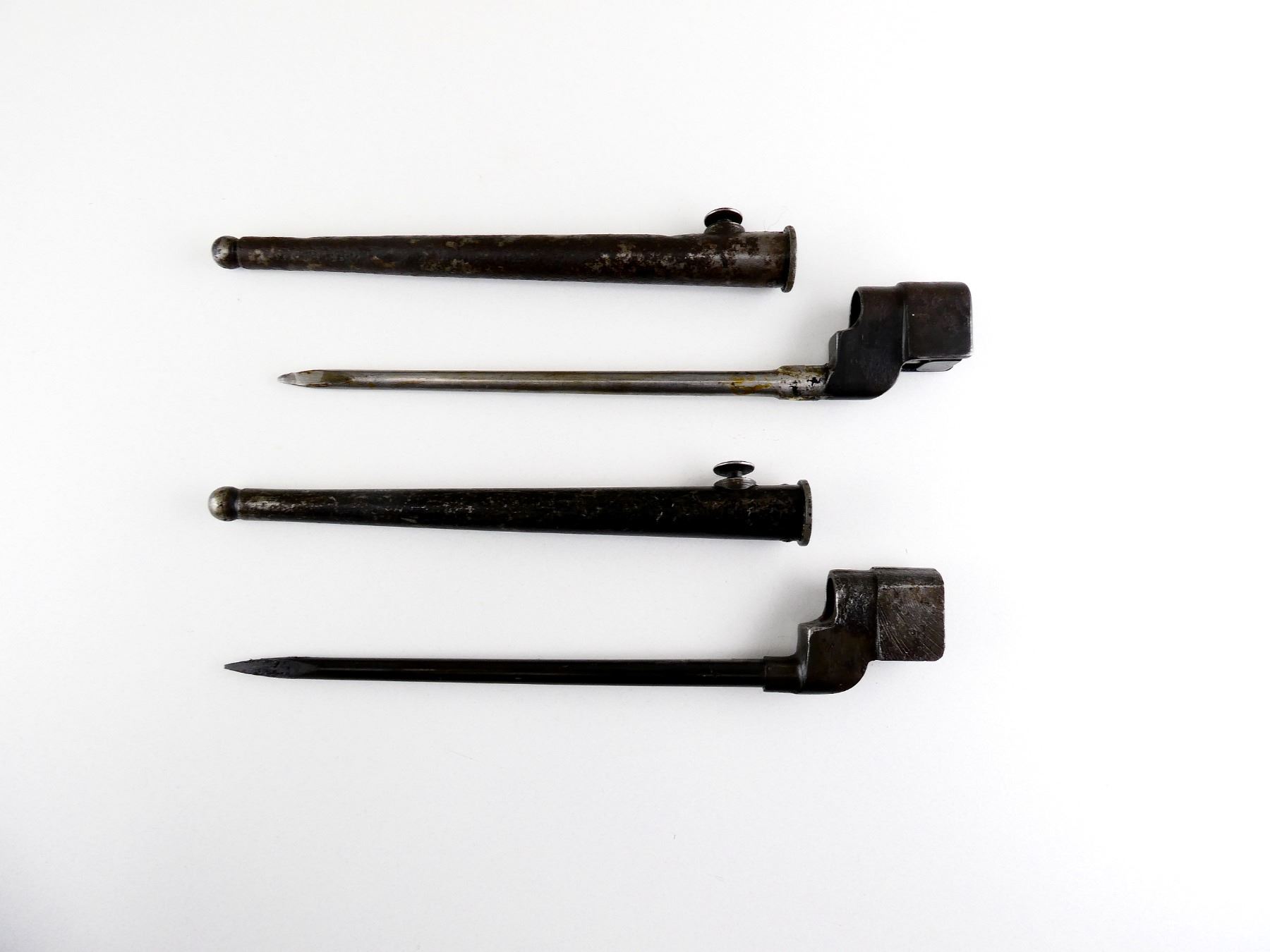 LOT INCLUDES; (1) NO.4 MKII SPIKE BAYONET, FITS LEE ENFIELD NO.4 MKI & MKII SERIES RIFLES, SOCKET MARKED: "G" CROWN "?" OVER "??4 MK II", "SM, 42", "?7 Z", METAL MKI SCABBARD, THROAT MARKED: "NO4 MKI. S.286, V" WITH BROAD ARROW, BLADE APPROX. 8", OVERALL LENGTH APPROX. 9 7/8" & (1) NO.4 MKII* SPIKE BAYONET, FITS LEE ENFIELD NO.4 MKI & MKII SERIES RIFLES, CATCH RELEASE IS STUCK, SOCKET MARKED: "T.R.M. ?, J.W.(S) LTD", FAINT BROAD ARROW, "?S & S LTD", METAL MKI SCABBARD, BALL TIP MARKED WITH BROAD ARROW, BLADE APPROX. 8" & OVERALL LENGTH APPROX. 10". SEE PHOTOS.