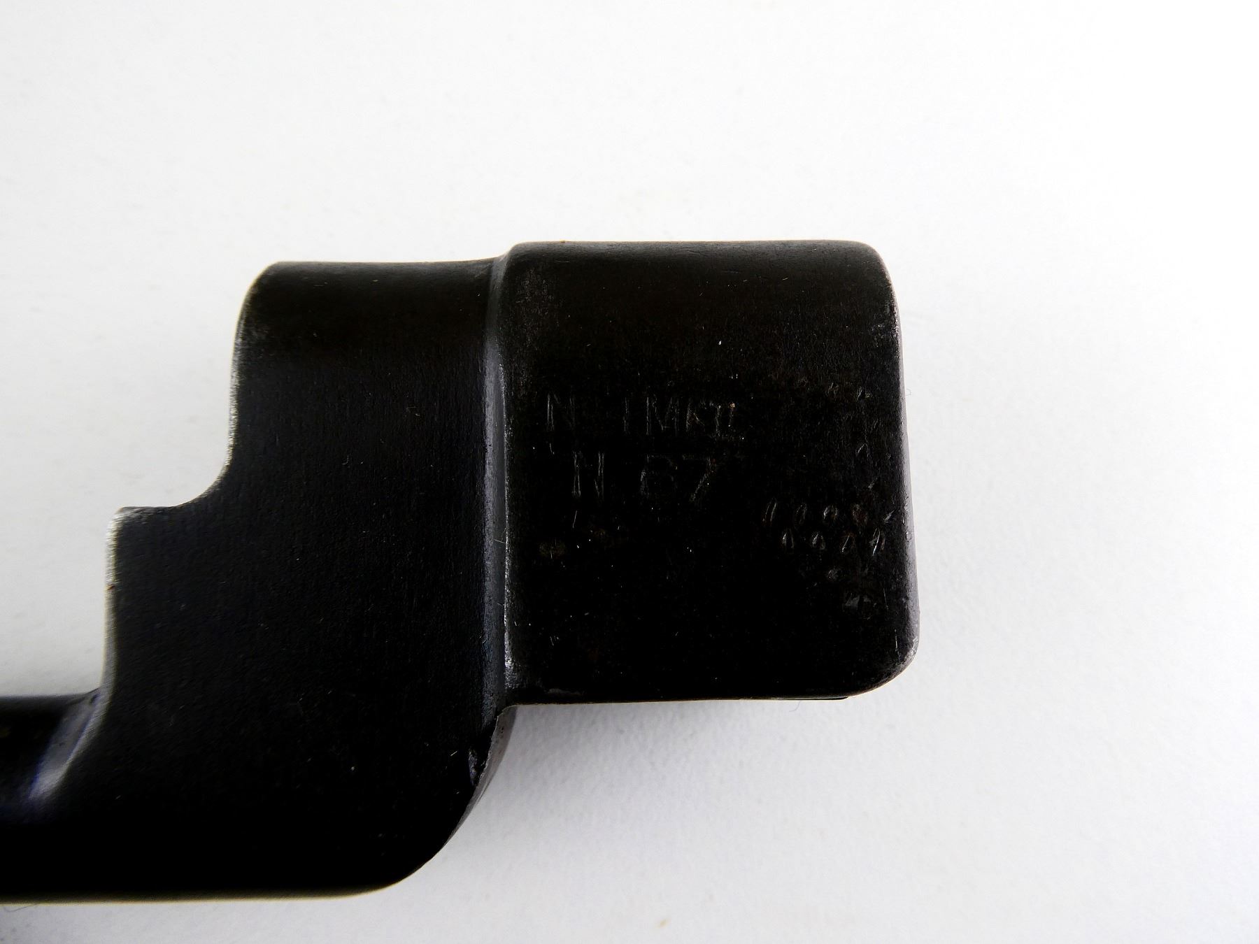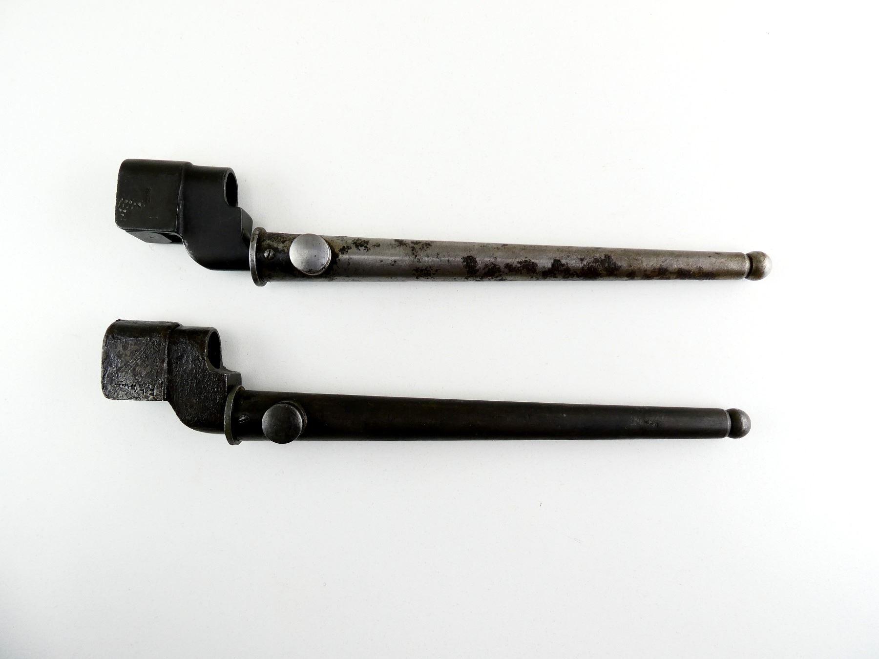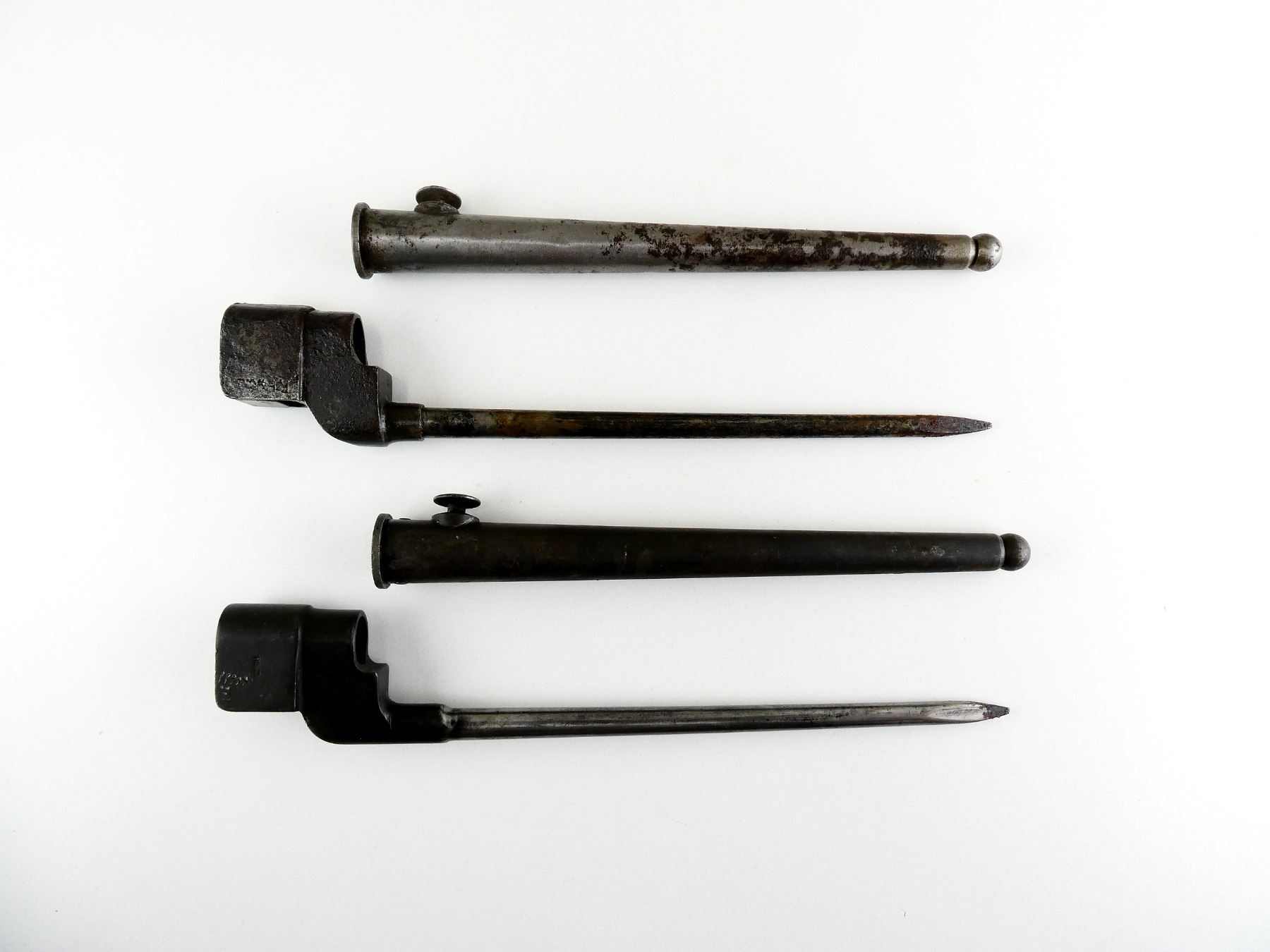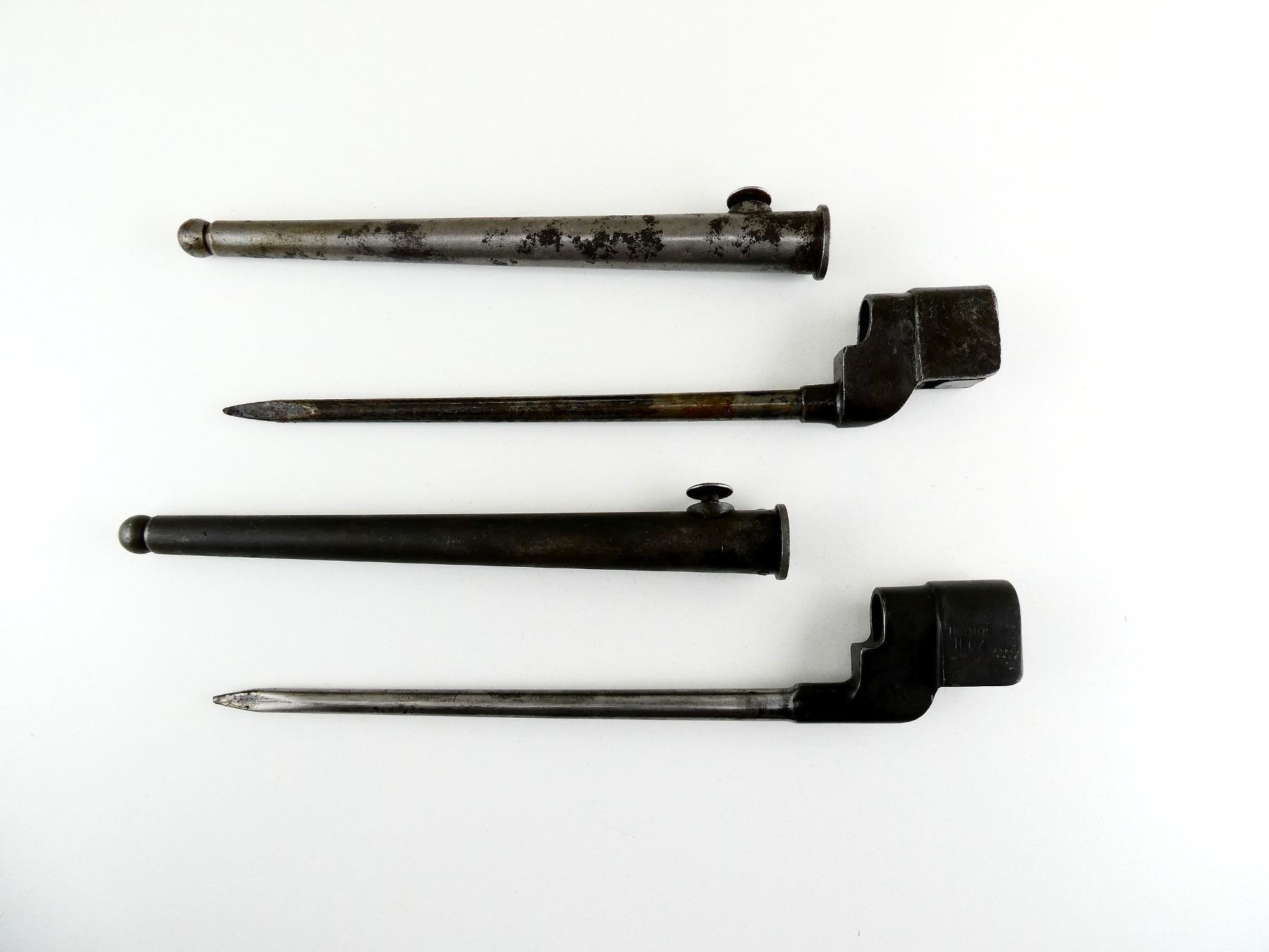 LOT INCLUDES; (1) NO.4 MKII SPIKE BAYONET, FITS LEE ENFIELD NO.4 MKI & MKII SERIES RIFLES, CATCH RELEASE IS STUCK, SOCKET MARKED: "NO4 MKII, N 67", "S", "85.Z.", BROAD ARROW, METAL MKI SCABBARD, NO VISIBLE MARKINGS, BLADE APPROX. 8", OVERALL LENGTH APPROX. 10" & (1) NO.4 MKII* SPIKE BAYONET, FITS LEE ENFIELD NO.4 MKI & MKII SERIES RIFLES, CATCH RELEASE IS STUCK, SOCKET MARKED: "F.F.&?.L??", "N5?" IN CIRCLE, VARIOUS OTHER FAINT PROOF MARKS, METAL MKI SCABBARD, THROAT MARKED: "NO. 4 MK1", BLADE APPROX. 8" & OVERALL LENGTH APPROX. 9 7/8". SEE PHOTOS.