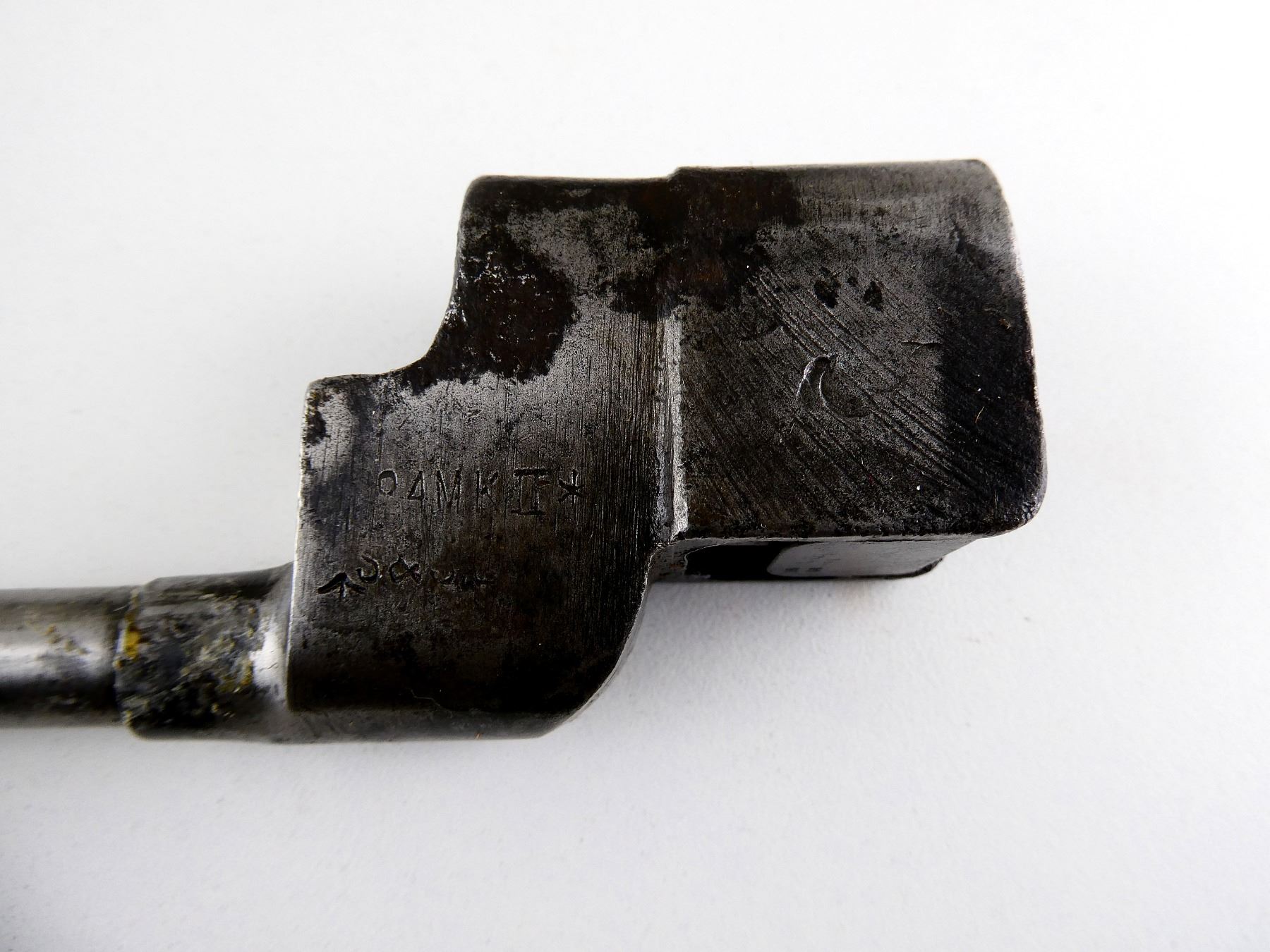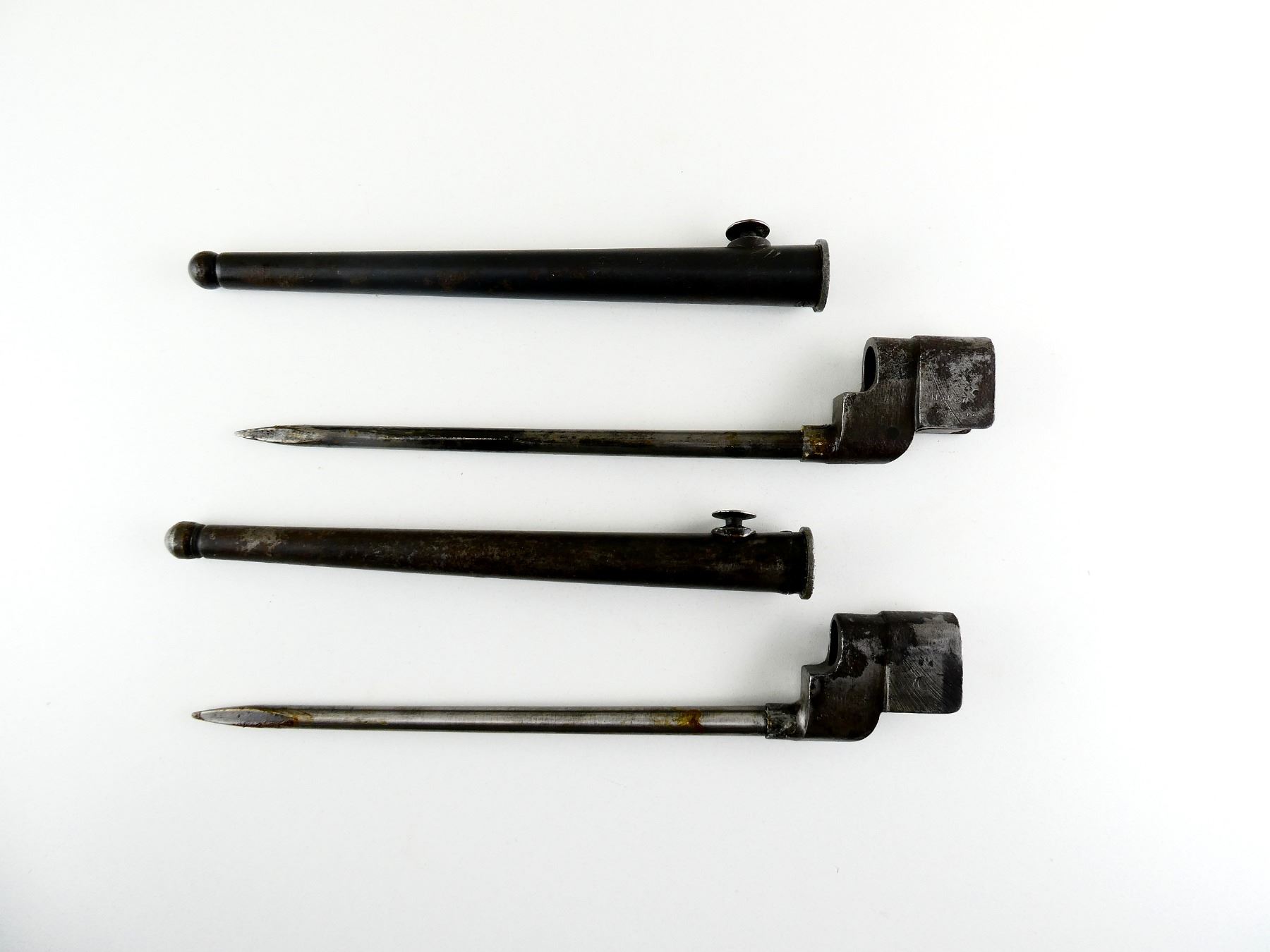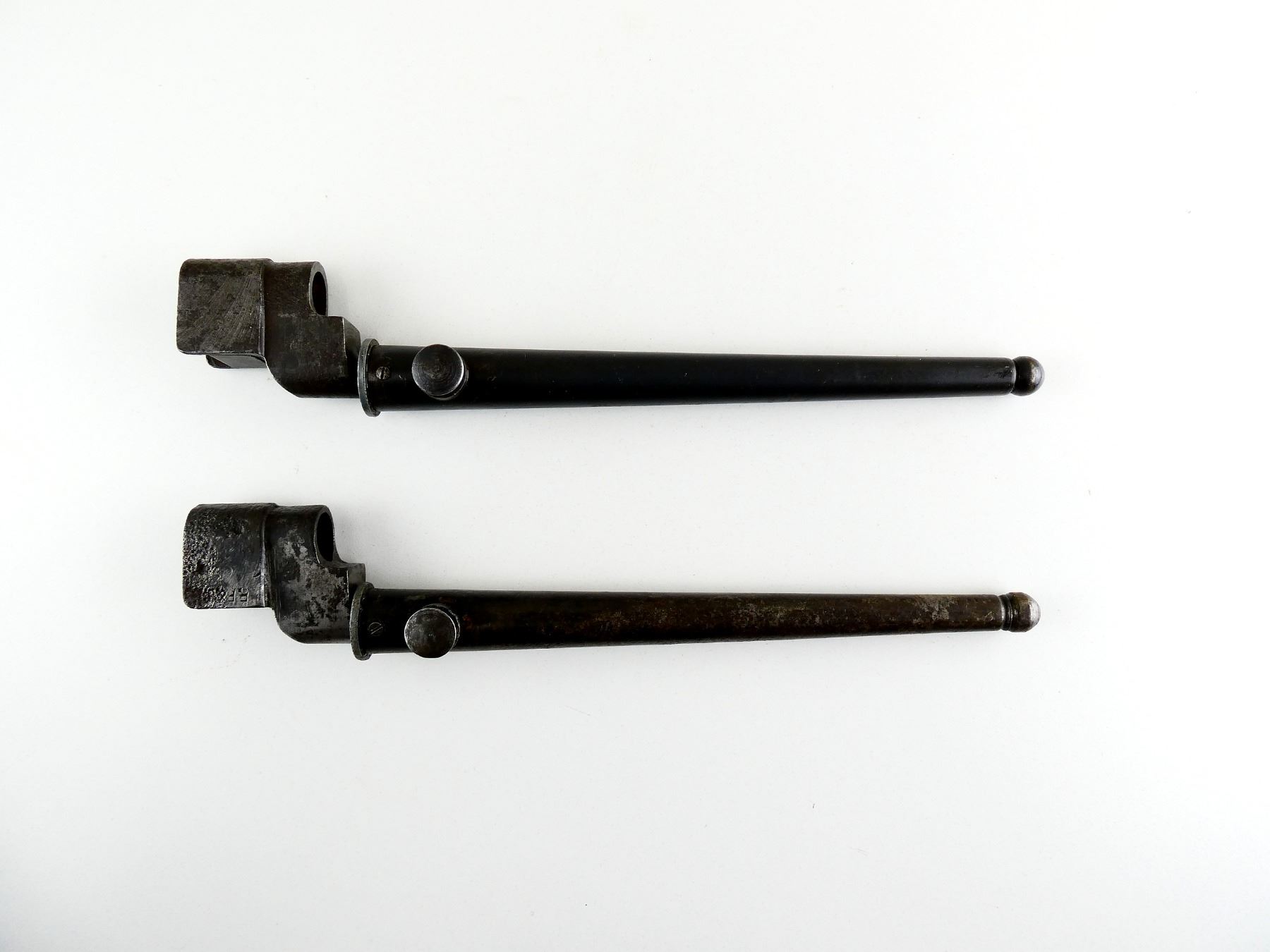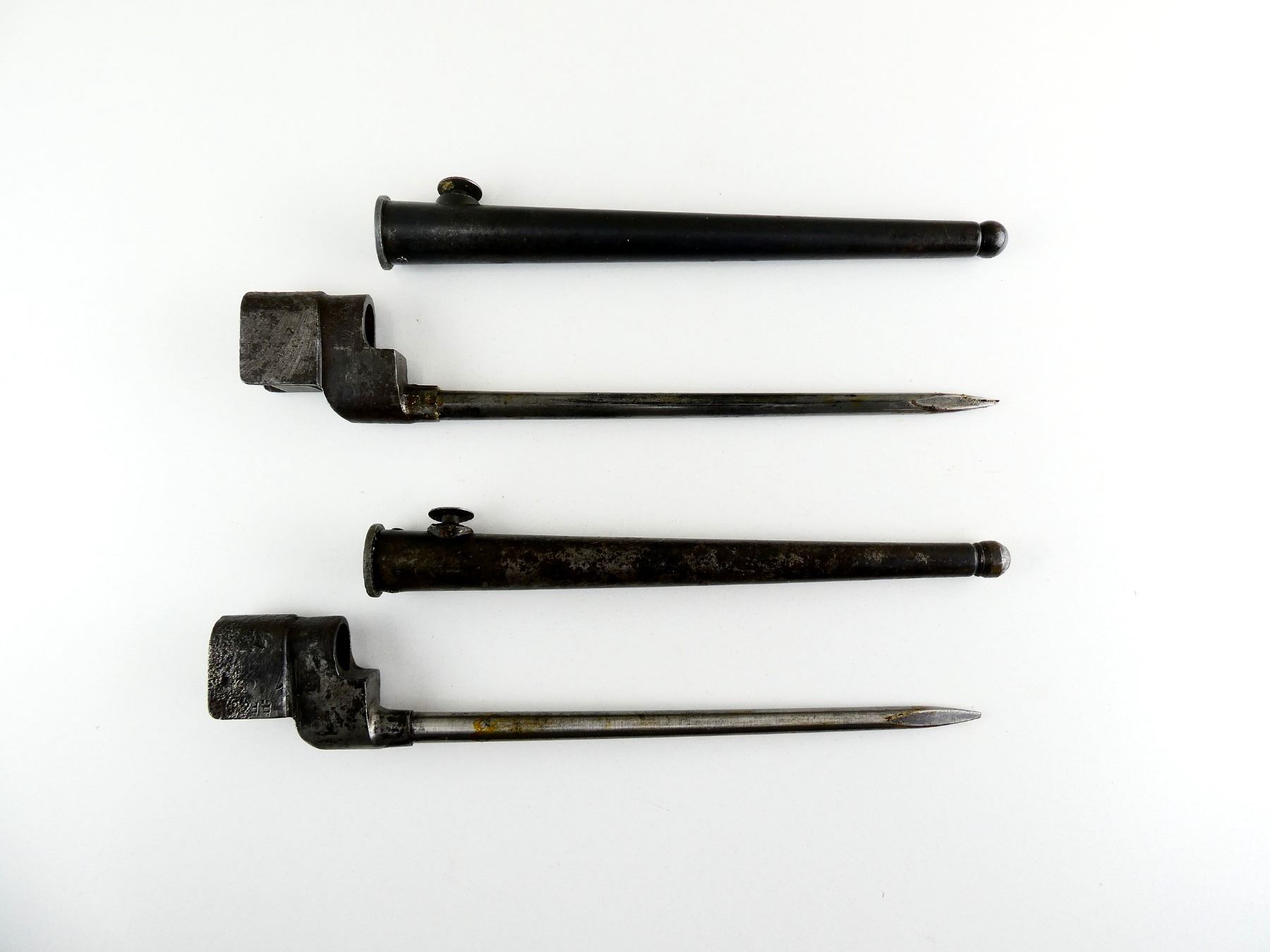 LOT INCLUDES; (1) NO.4 MKII* SPIKE BAYONET, FITS LEE ENFIELD NO.4 MKI & MKII SERIES RIFLES, SOCKET MARKED: "?O4MK II*, ?S&S.???", BROAD ARROW, "SM, 41", "F.F&????", METAL MKI SCABBARD, THROAT MARKED: "NO4 MKI", BROAD ARROW, "SSP, 1942", BLADE APPROX. 8", OVERALL LENGTH APPROX. 10" & (1) NO.4 MKII* SPIKE BAYONET, FITS LEE ENFIELD NO.4 MKI & MKII SERIES RIFLES, CATCH RELEASE IS STUCK, SOCKET MARKED: "NO4MKII*, P.S&S.LTD", BROAD ARROW, FAINT "T.R.M.1", METAL MKI SCABBARD, THROAT FAINTLY MARKED: "NO4MKI", BLADE APPROX. 8" & OVERALL LENGTH APPROX. 9 7/8". SEE PHOTOS.