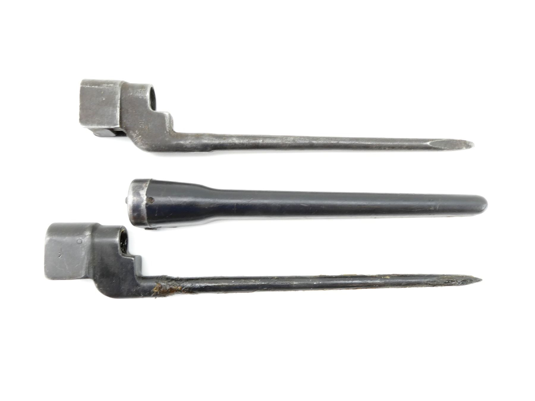 LOT INCLUDES: (2) NO.4 MKII SPIKE BAYONETS, FITS LEE ENFIELD NO.4 MKI & MKII SERIES RIFLES, ONE MARKED: "NO4MK II, N67", "N67", BROAD ARROW, OTHER MARKED: "NO. 4 MK II" WITH FAINT PROOF MARK, ONE WITH U.S. M5 SCABBARD, MISSING WEB FROG, OTHER HAS NO SCABBARD, SCABBARD MARKED: "11, VP (VICTORY PLASTICS)", BLADES APPROX. 7.5" / 8 1/8" & OALS APPROX. 9.5" / 10 1/8". SEE PHOTOS.