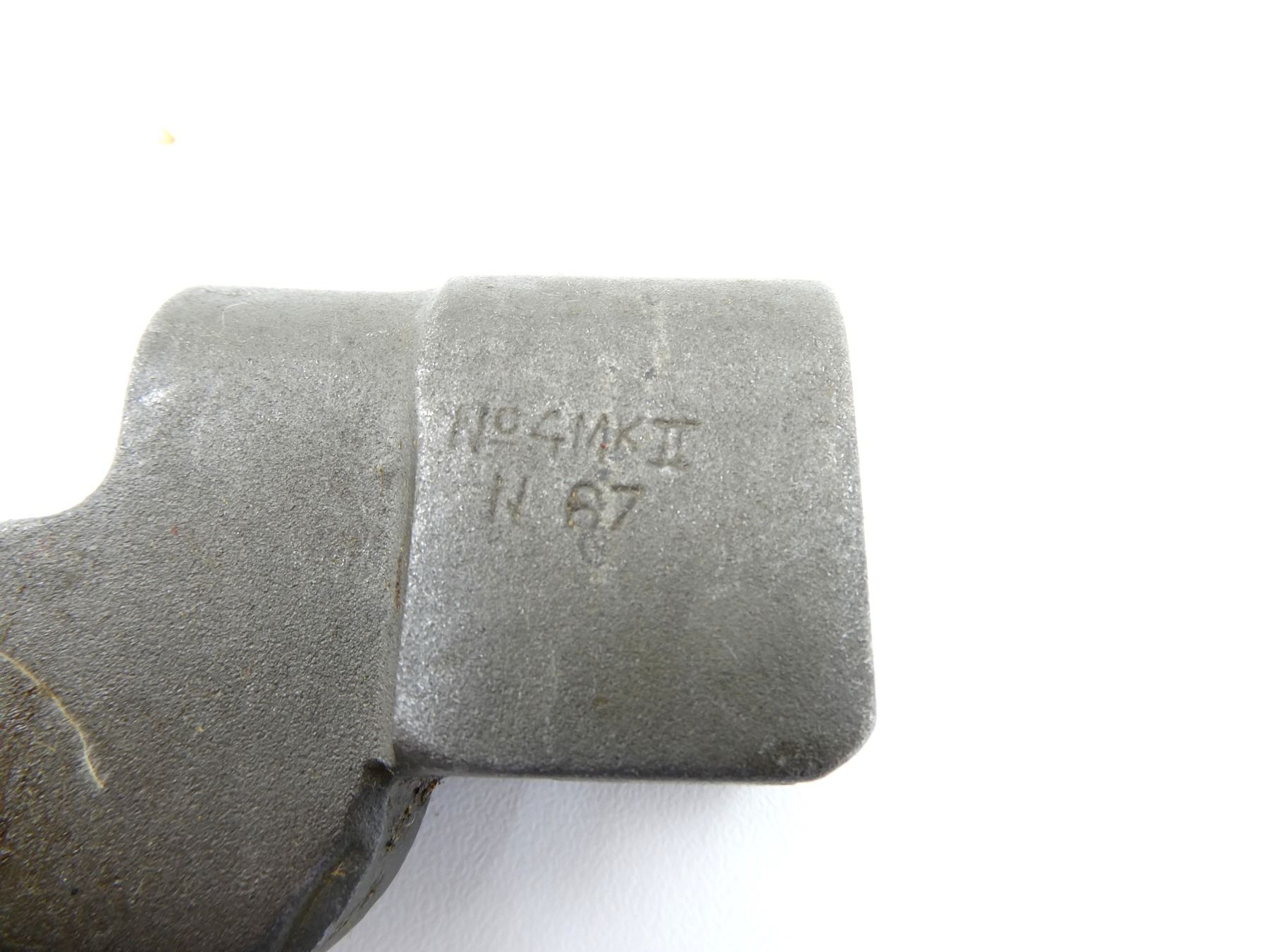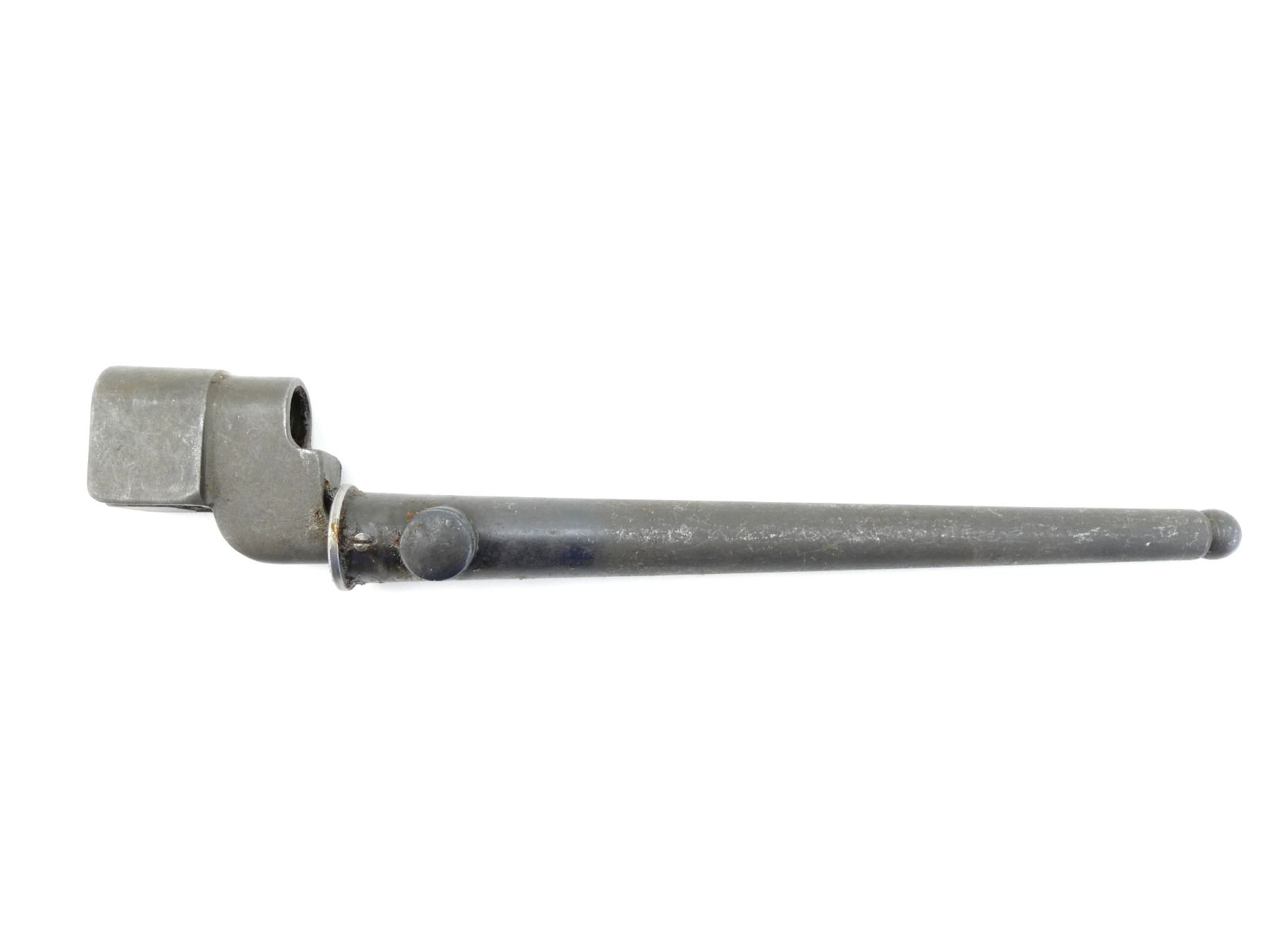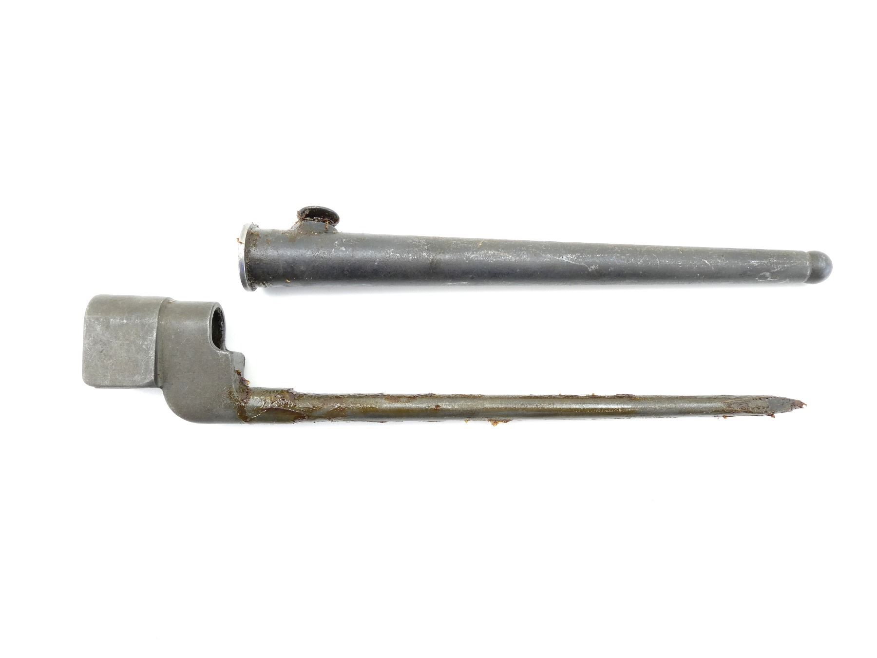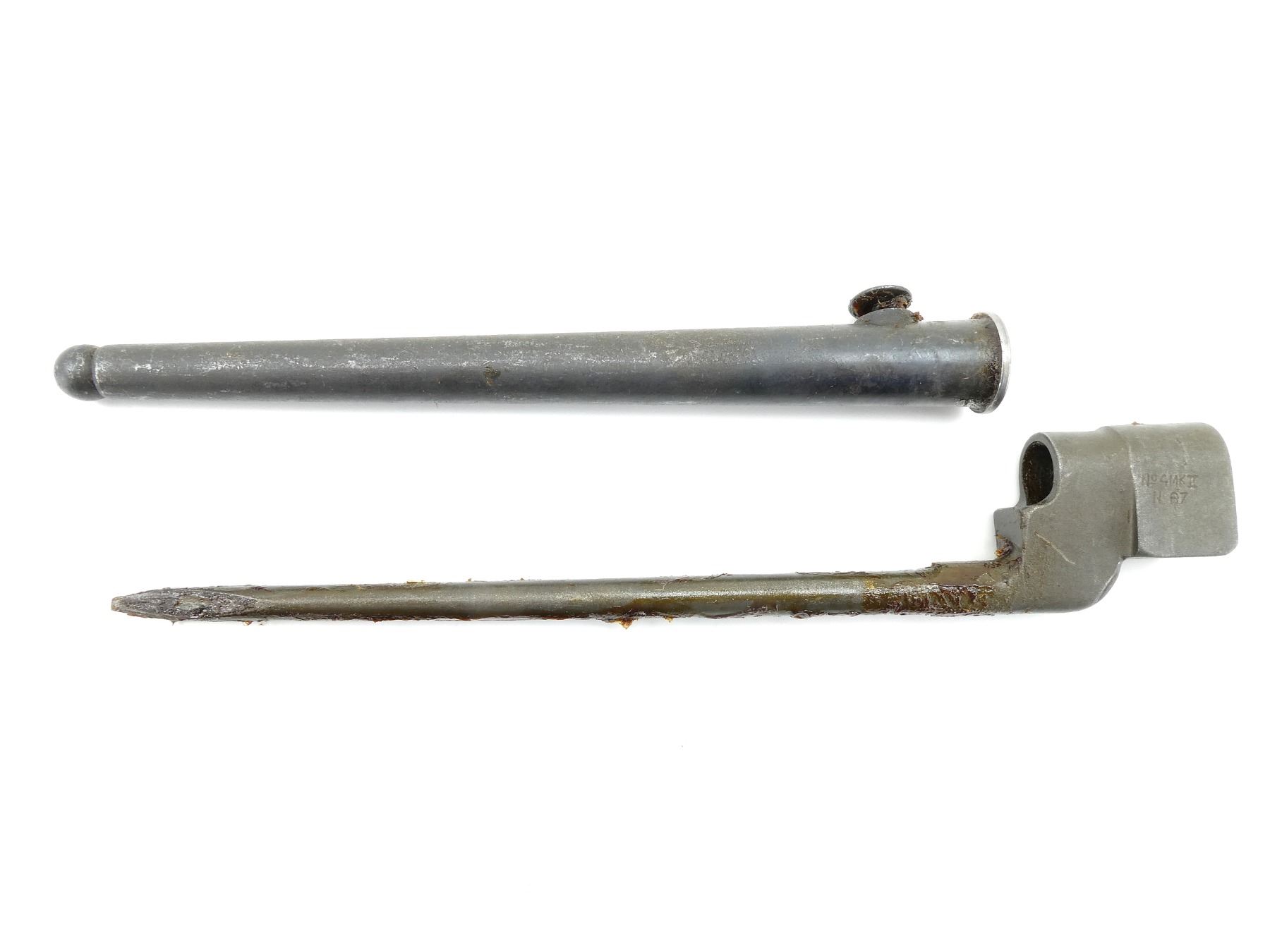 (1) FITS LEE ENFIELD NO.4 MKI & MKII SERIES RIFLES, SOCKET MARKED: "NO4MKII, N 67", METAL MKI SCABBARD, THROAT MARKED: "NO.4 MK 1", BLADE APPROX. 8" & OVERALL LENGTH APPROX. 9 7/8". SEE PHOTOS.
