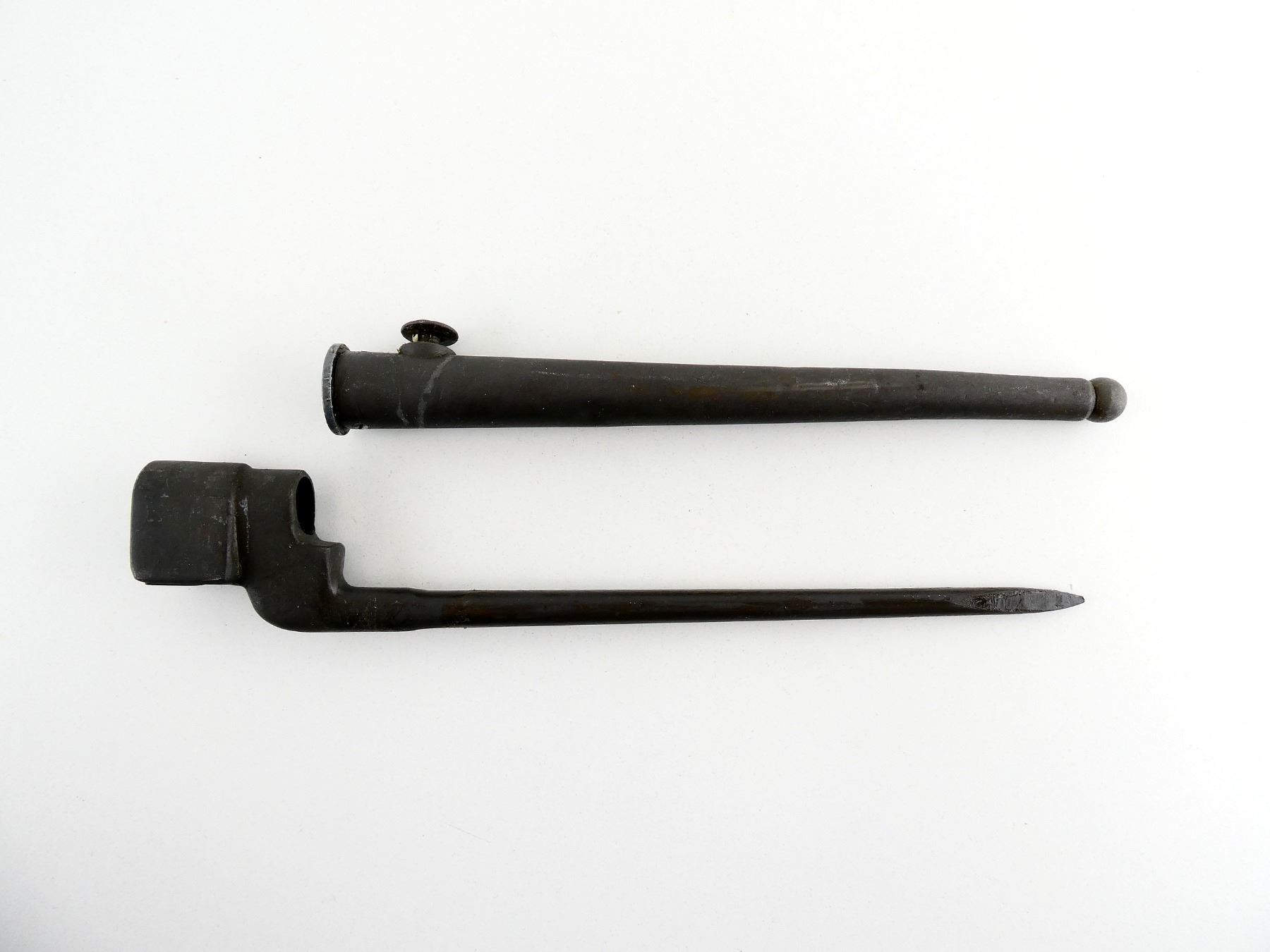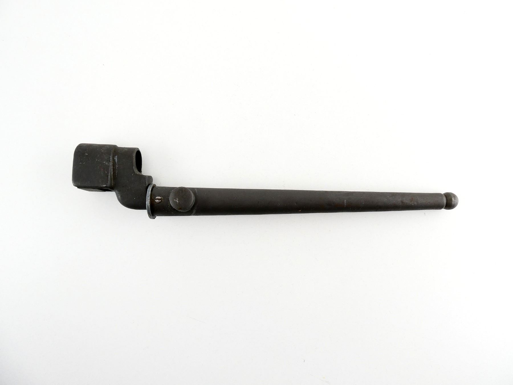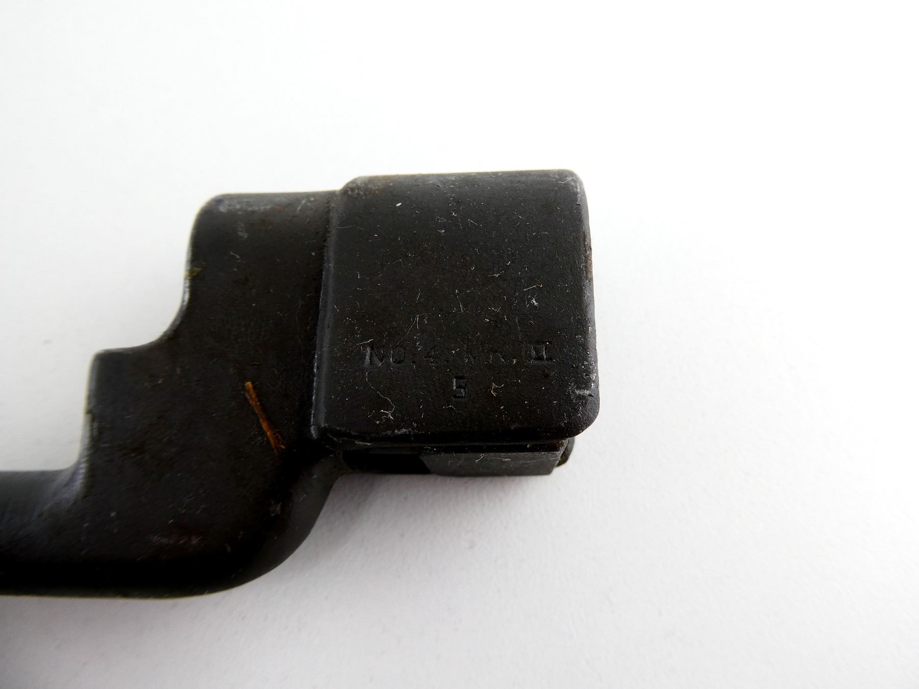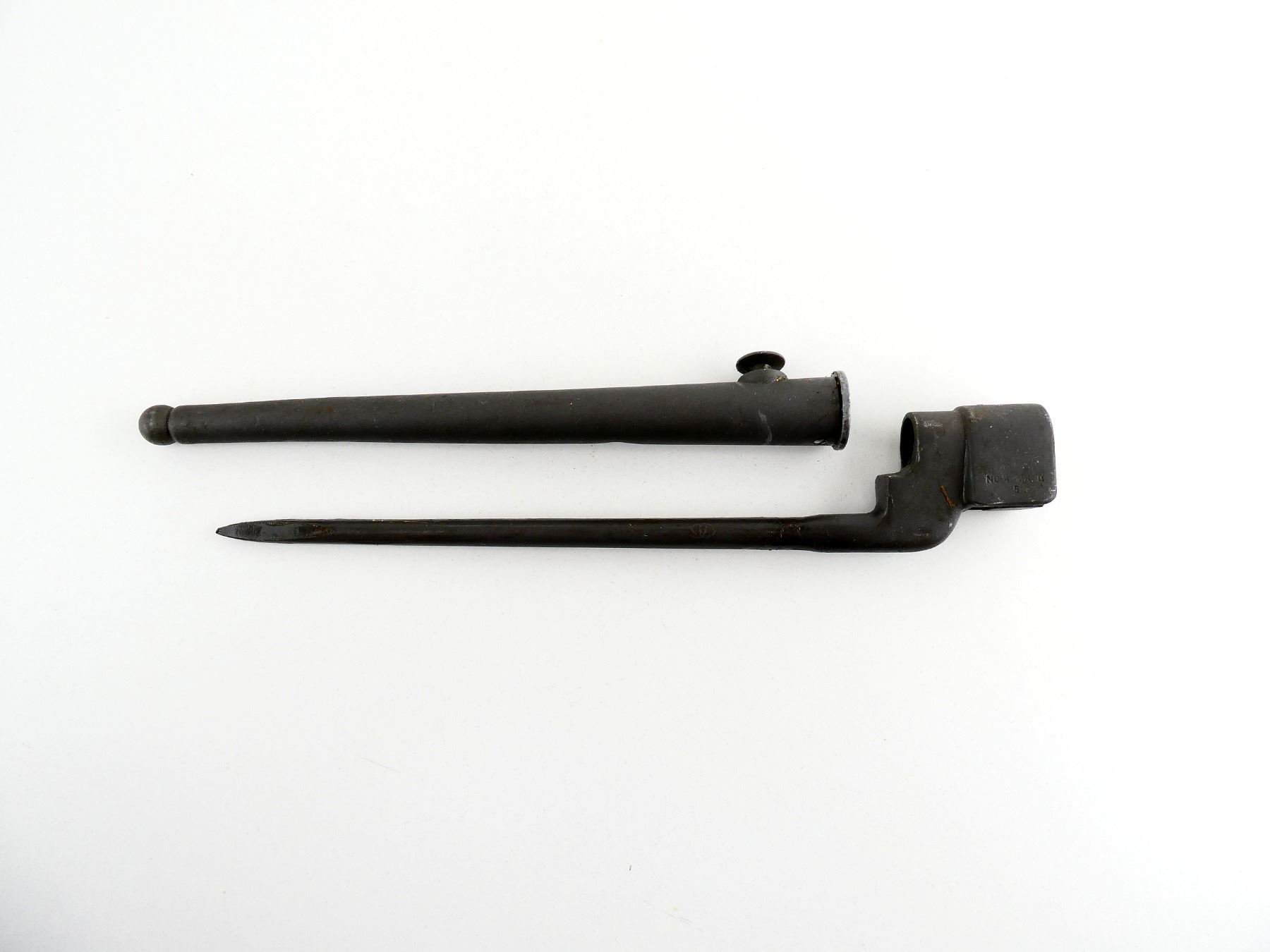(1) FITS LEE ENFIELD NO.4 MKI & MKII SERIES RIFLES, SOCKET MARKED: "NO.4. MK II, S", METAL MKI SCABBARD, THROAT FAINTLY MARKED: "NO.4 MK 1", BLADE APPROX. 7 7/8" & OVERALL LENGTH APPROX. 9 7/8". SEE PHOTOS.