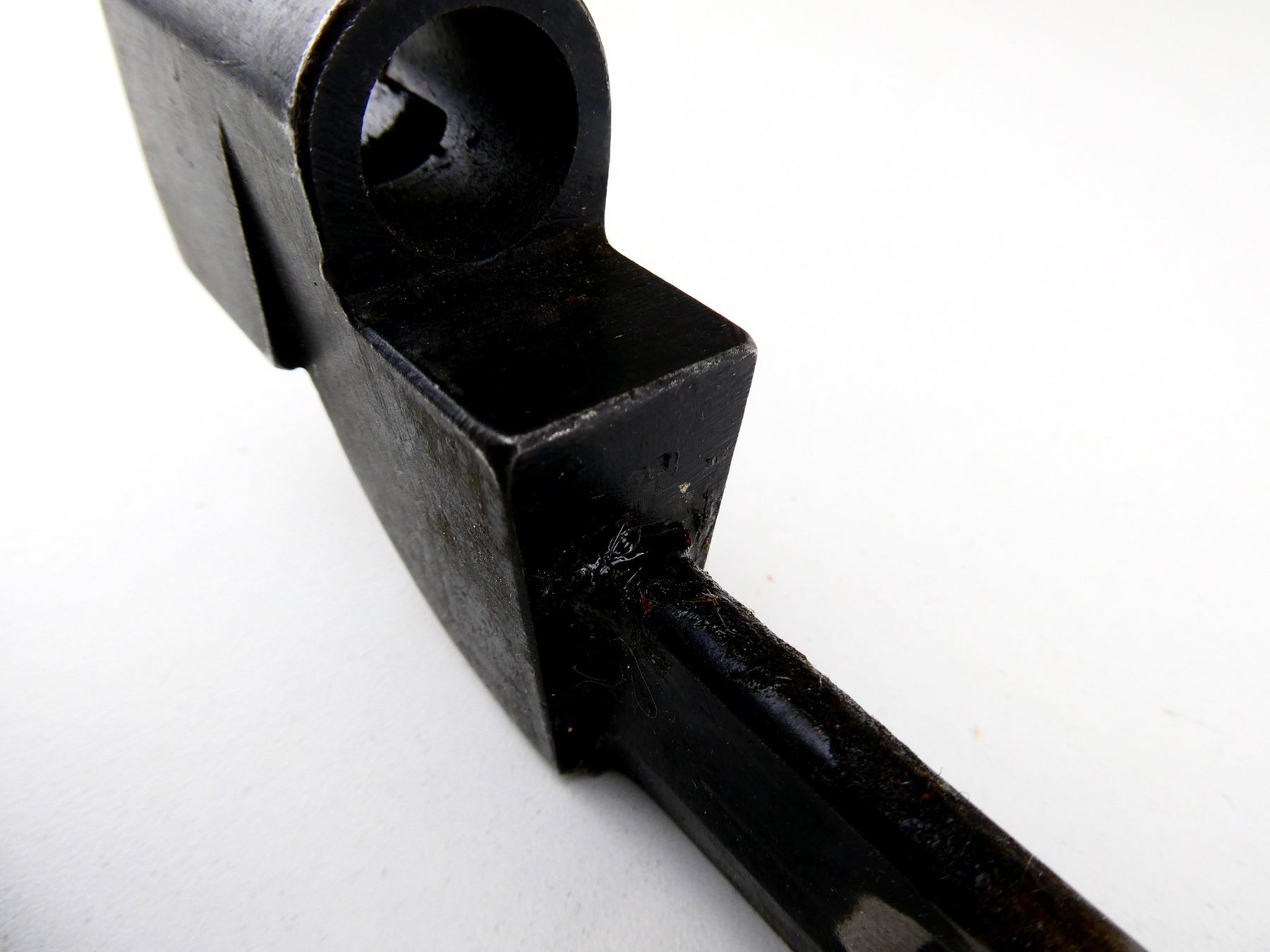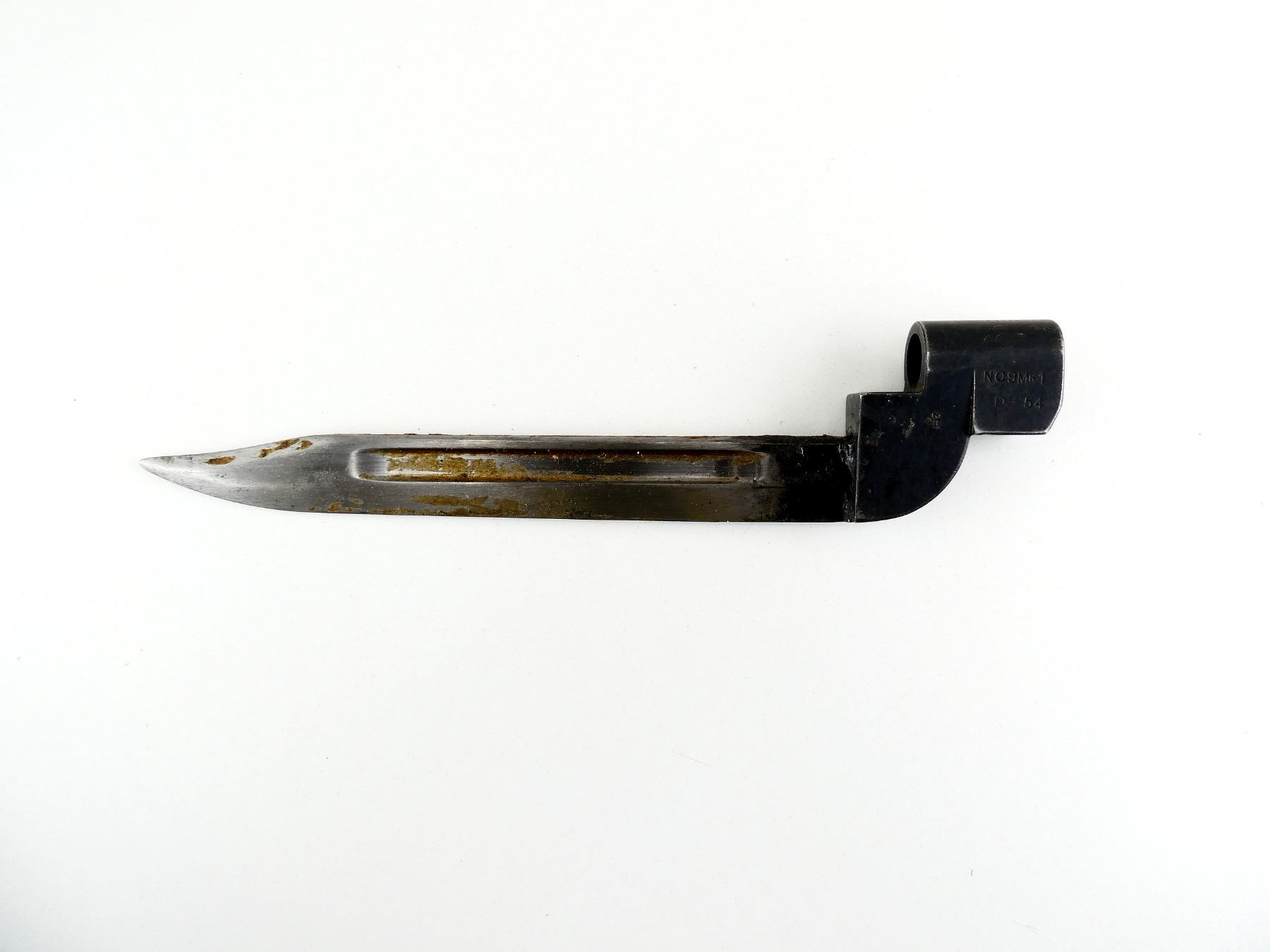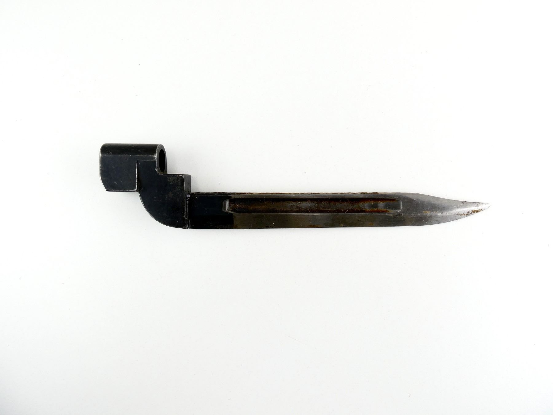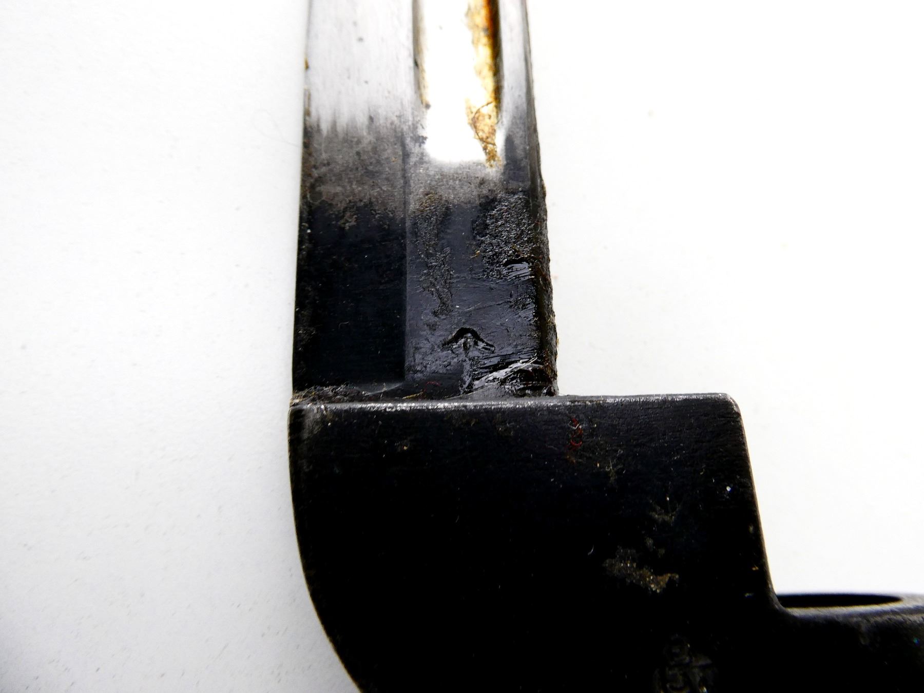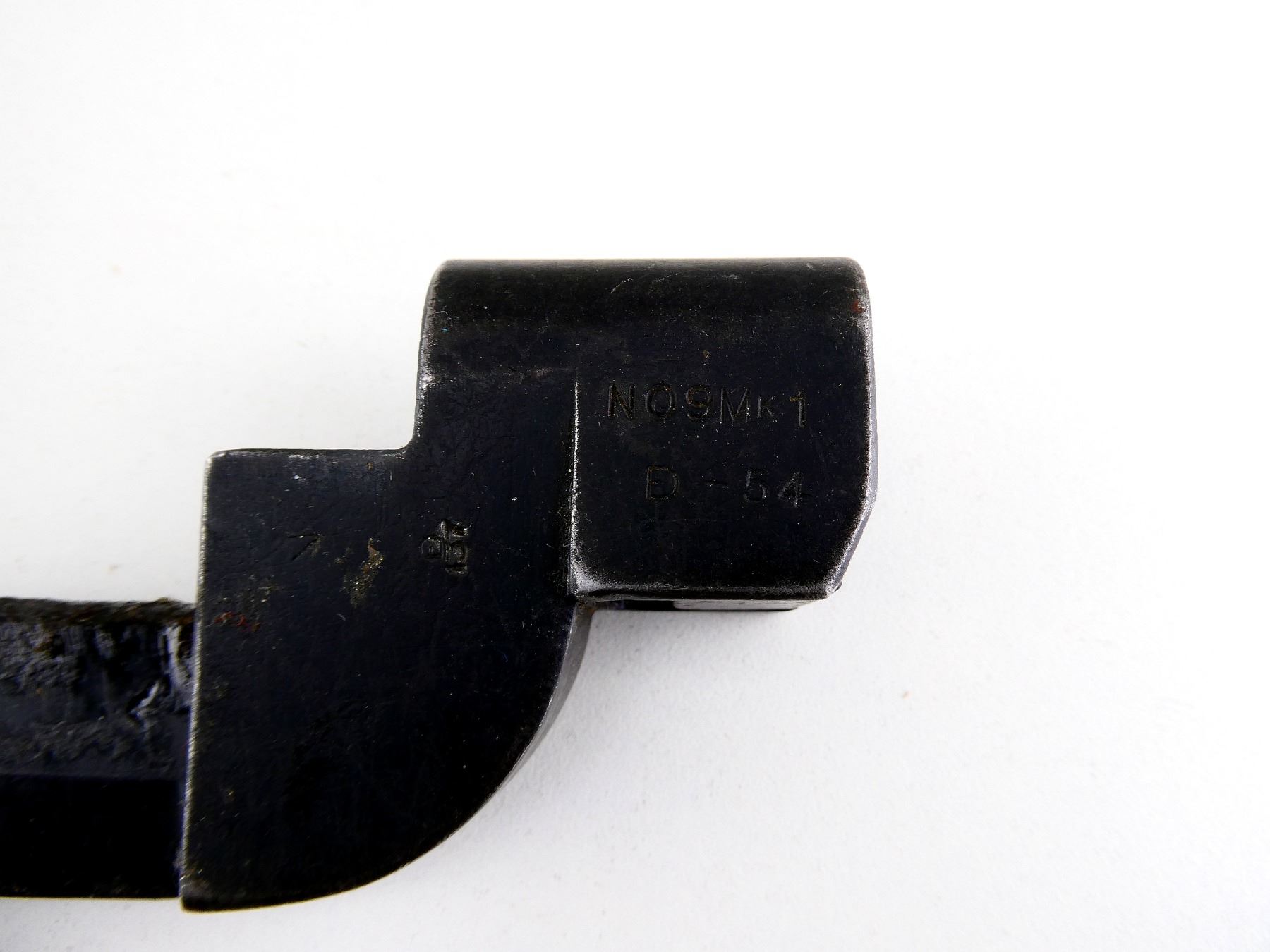 (1) FITS LEE ENFIELD NO.4 RIFLES, BLADE MARKED WITH BROAD ARROW, SOCKET MARKED: "NO9MK1" OVER "ED-54", BROAD ARROW, "ED" OVER "137", CATCH RELEASE MARKED: "ED", BROAD ARROW, "ED", "10?", NO SCABBARD, BLADE APPROX. 8" & OVERALL LENGTH APPROX. 10 1/8". SEE PHOTOS.