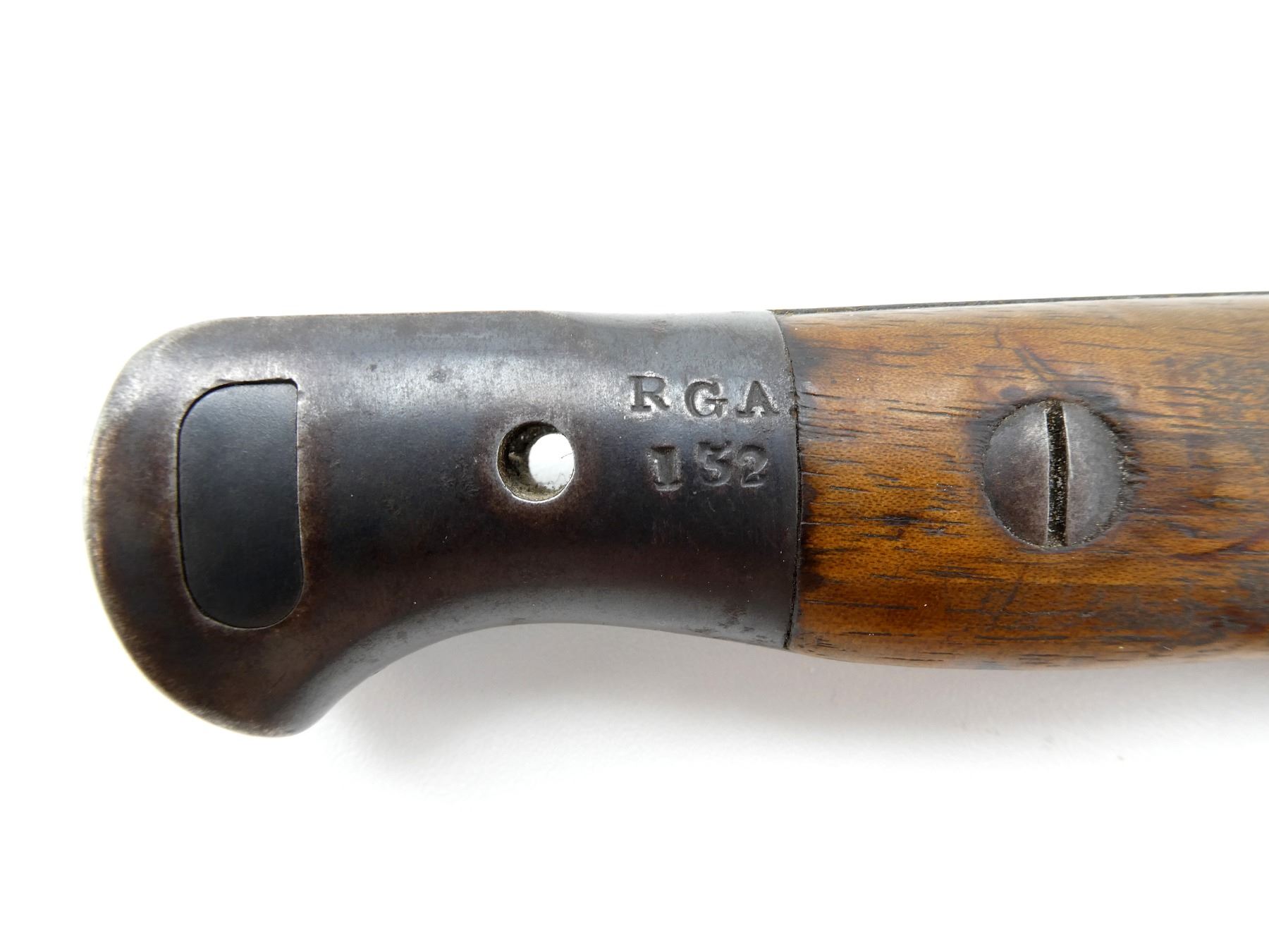 (1) FITS .303 CALIBER SHORT MAGAZINE LEE-ENFIELD NO.1 MKIII (SMLE) RIFLES, RICASSO MARKED: CROWN OVER "ER", OVER "1903" OVER "71, '05" WITH VARIOUS OTHER PROOF MARKS, OTHER-SIDE MARKED: BROAD ARROW OVER CROWN OVER "S" OVER "42" OVER "X (BEND TEST)" OVER "SANDERSON.SHEFFIE??", CROWN OVER "??", "?9", BLADE SPINE MARKED: "S" OVER "28" OVER CROWN OVER "S" OVER "42", 2-PIECE WOOD GRIPS, CHIPS IN WOOD GRIPS, METAL POMMEL MARKED: "RGA" OVER "132" (POSSIBLY ROYAL GARRISON ARTILLERY), BLACK LEATHER & METAL SCABBARD, LEATHER FAINTLY MARKED WITH CROWN PROOF MARK, " '96", THROAT MARKED: "7.69?" CROSSED OUT, "19", UNDER STUD MARKED: "14" OVER "H", OTHER-SIDE MARKED: "IL", METAL TIP END MARKED: CROWN OVER "14" OVER "H", BLADE APPROX. 12" & OVERALL LENGTH APPROX. 16.75". SEE PHOTOS.