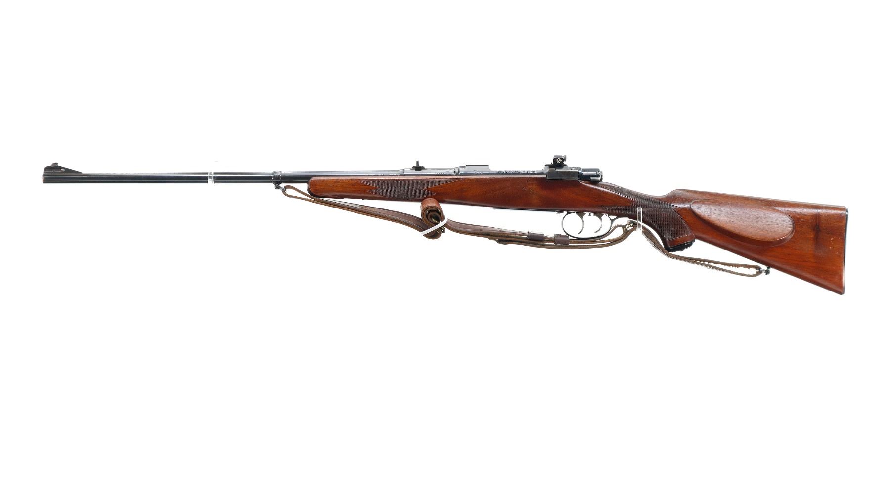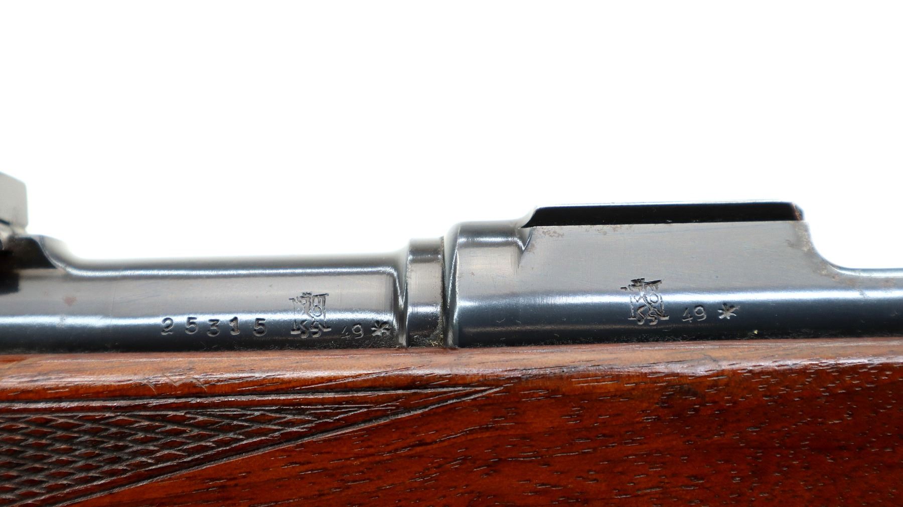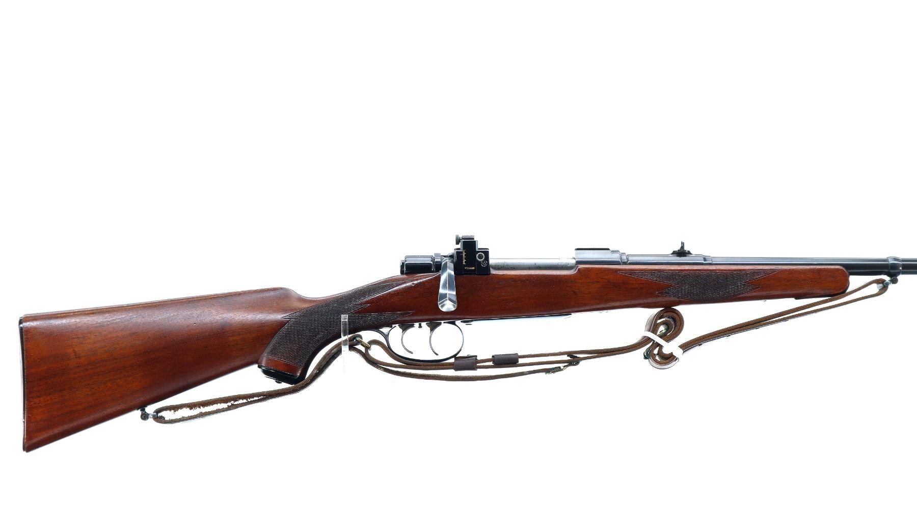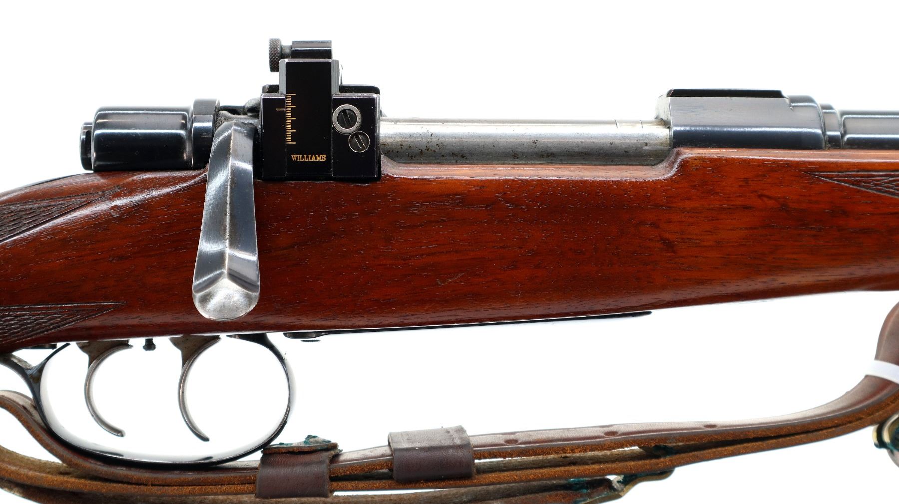 Main Description: Dated 1949. Blade front sight with ramp, adjustable u notched rear sight with one fixed and one folding leaf, polish blued finish, receiver has integral scope bases right side drilled and tapped with adjustable Williams peep sight installed, butter knife bolt handle, double set triggers. One piece wood stock, checkered forearm and pistol grip cracked behind receiver, European cheek rest, checkered black polymer butt plate, grip cap, sling swivels with brown leather sling.