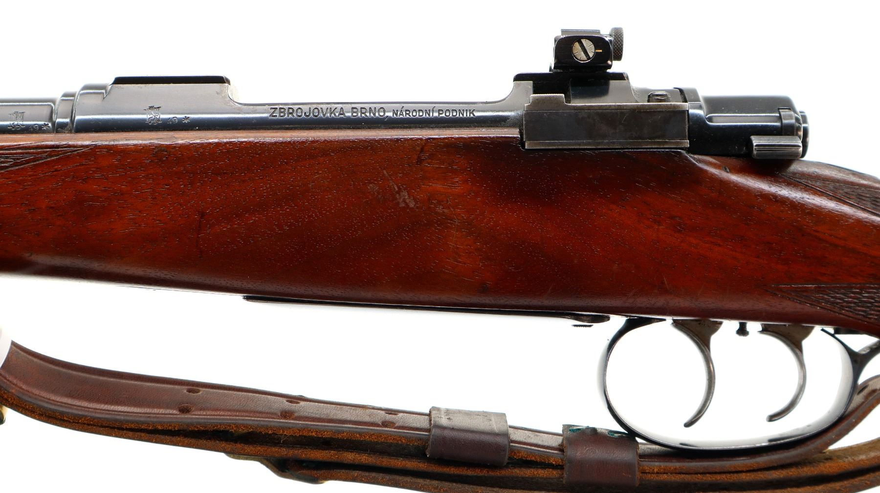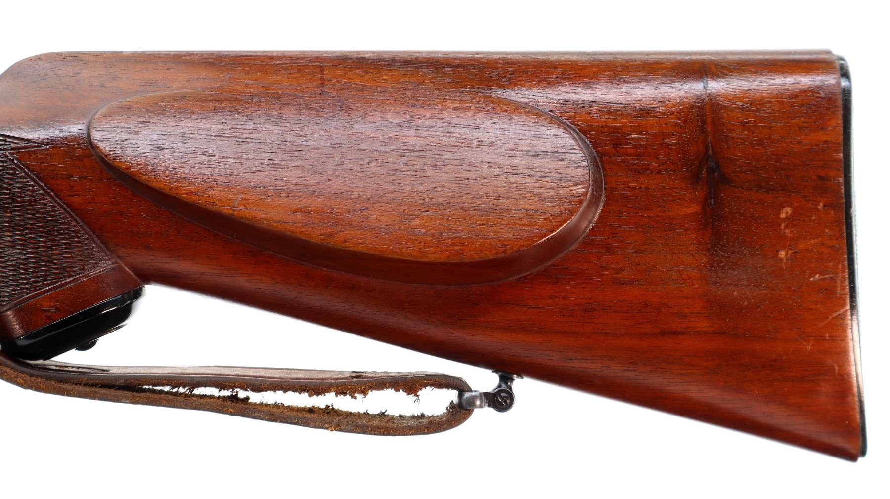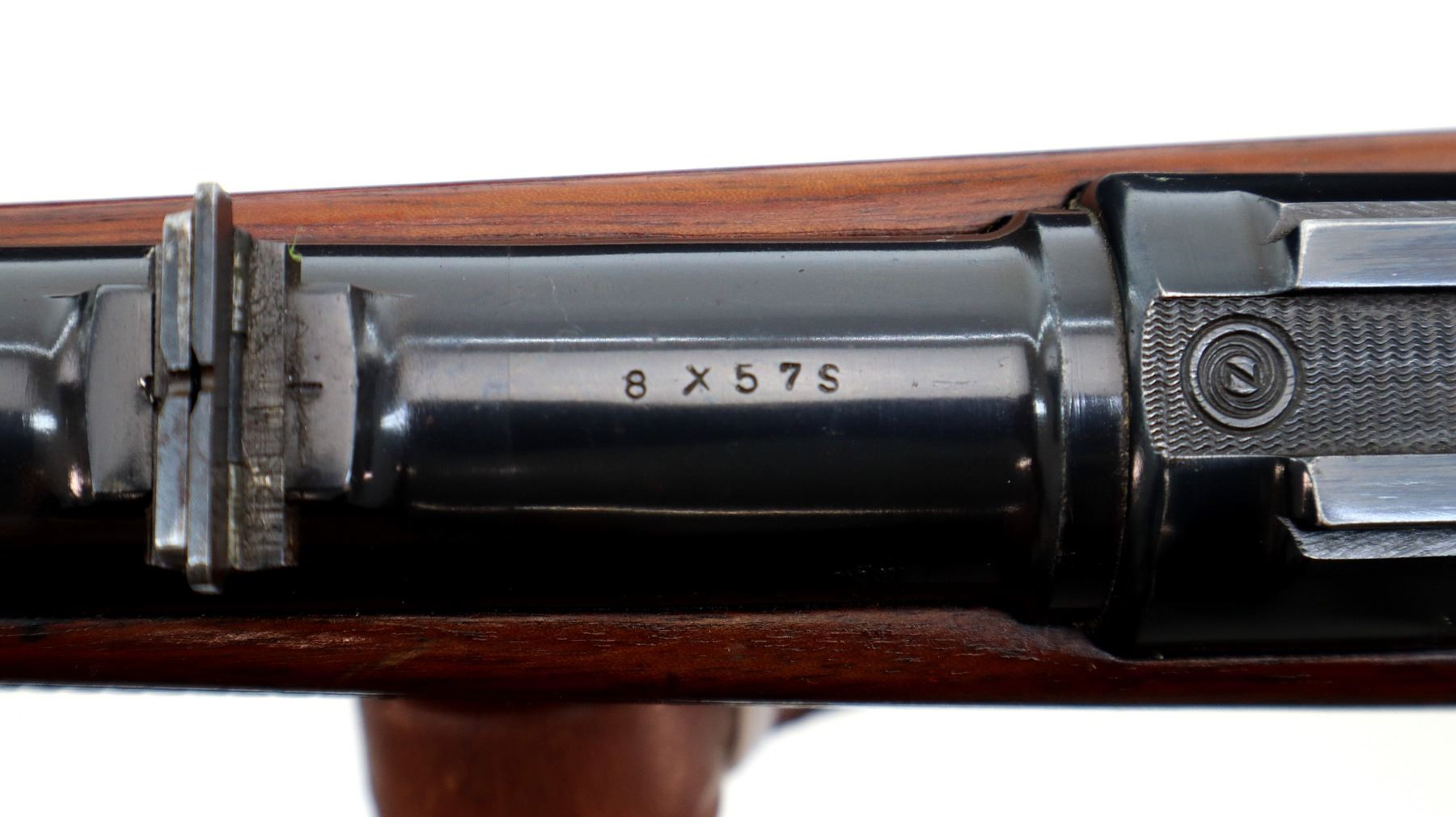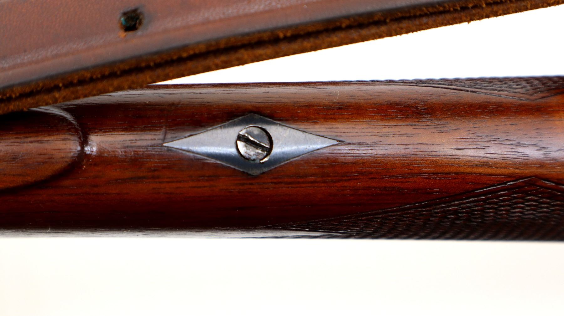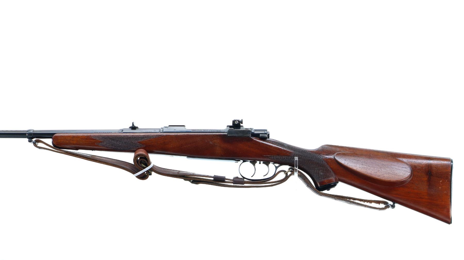 Main Description: Dated 1949. Blade front sight with ramp, adjustable u notched rear sight with one fixed and one folding leaf, polish blued finish, receiver has integral scope bases right side drilled and tapped with adjustable Williams peep sight installed, butter knife bolt handle, double set triggers. One piece wood stock, checkered forearm and pistol grip cracked behind receiver, European cheek rest, checkered black polymer butt plate, grip cap, sling swivels with brown leather sling.
