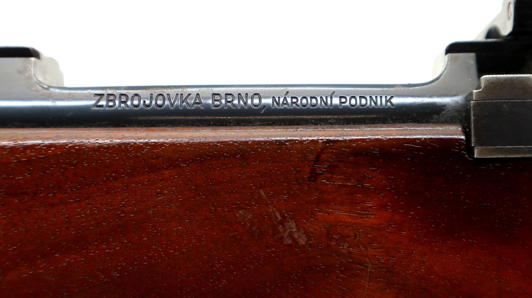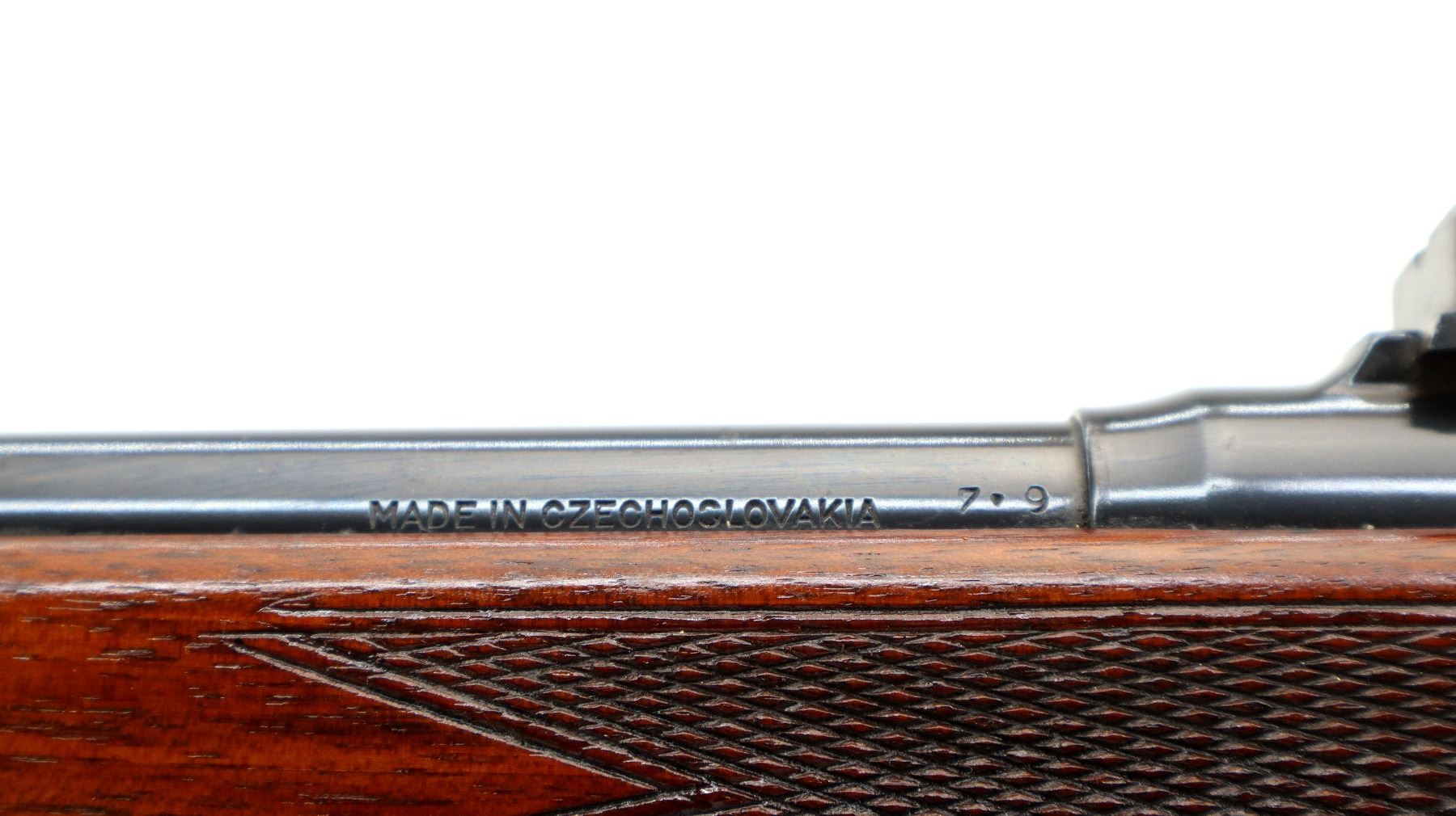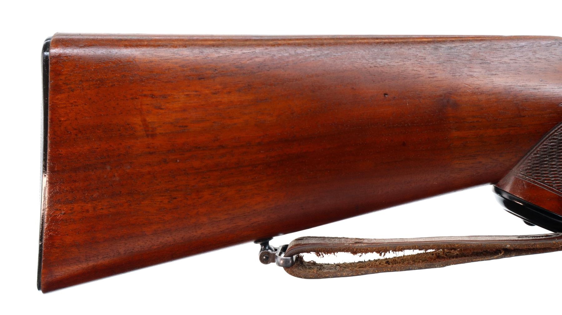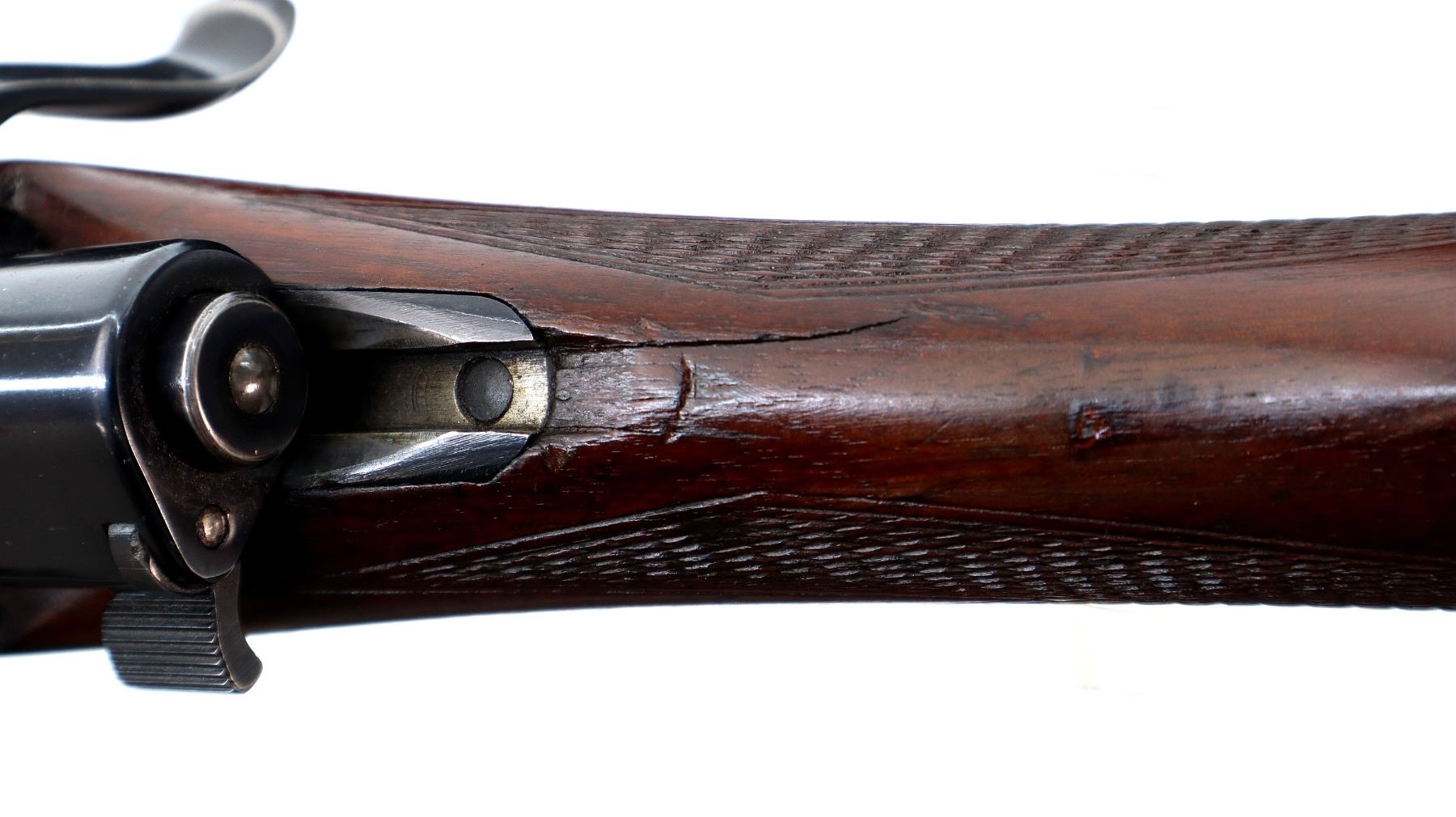 Main Description: Dated 1949. Blade front sight with ramp, adjustable u notched rear sight with one fixed and one folding leaf, polish blued finish, receiver has integral scope bases right side drilled and tapped with adjustable Williams peep sight installed, butter knife bolt handle, double set triggers. One piece wood stock, checkered forearm and pistol grip cracked behind receiver, European cheek rest, checkered black polymer butt plate, grip cap, sling swivels with brown leather sling.