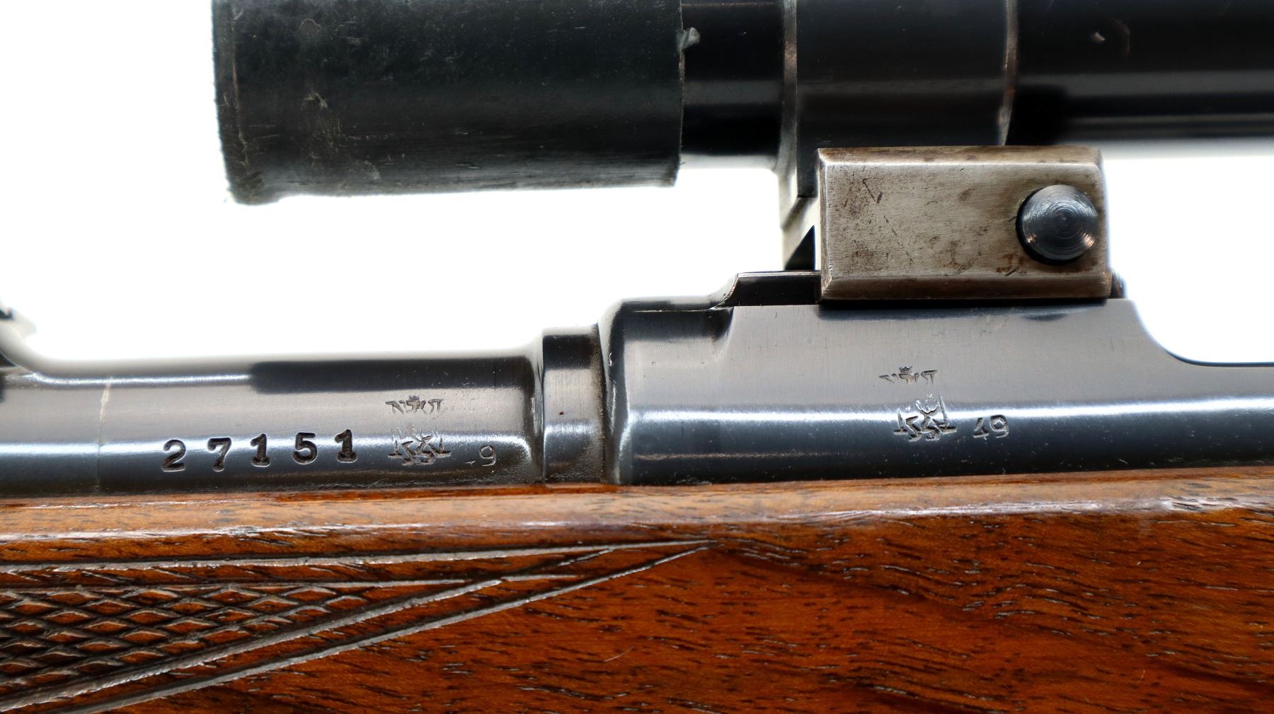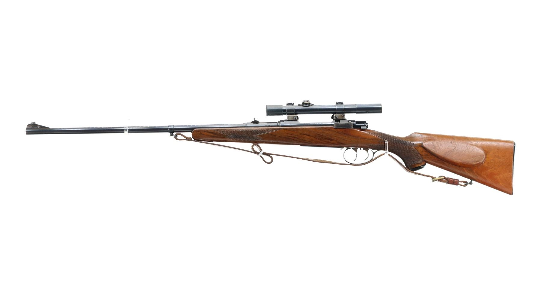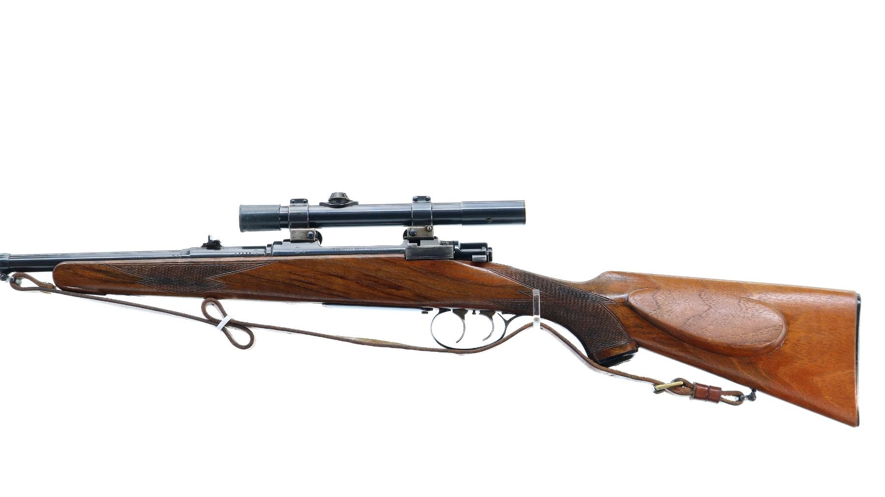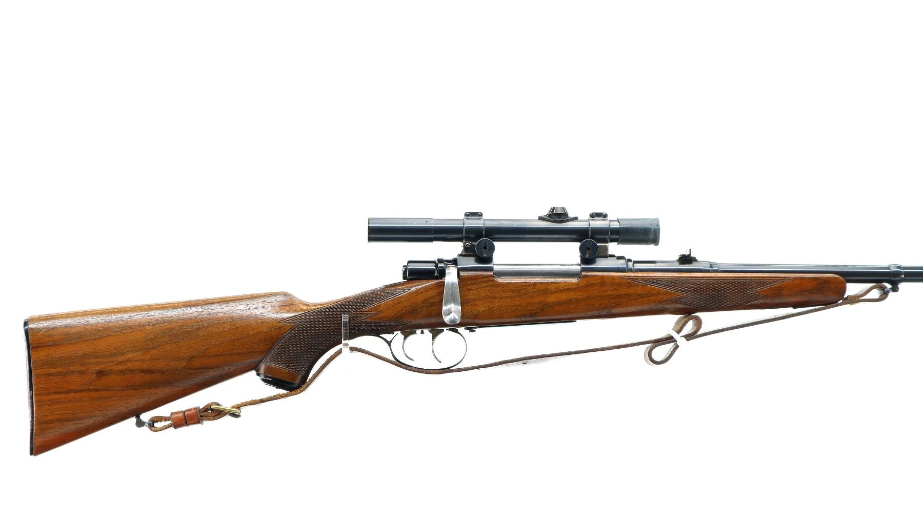 Main Description: Dated 1949. Blade front sight with ramp, adjustable u notched rear sight with one fixed and one folding leaf, polish blued finish, receiver has integral scope bases with Vintage rings and Zeiss fixed power scope numbered 3012130, clear optics with German NO1 reticle, butter knife bolt handle, double set triggers. One piece wood stock, checkered forearm, pistol grip and black polymer butt plate, European cheek rest, grip cap, swivels with brown leather sling.